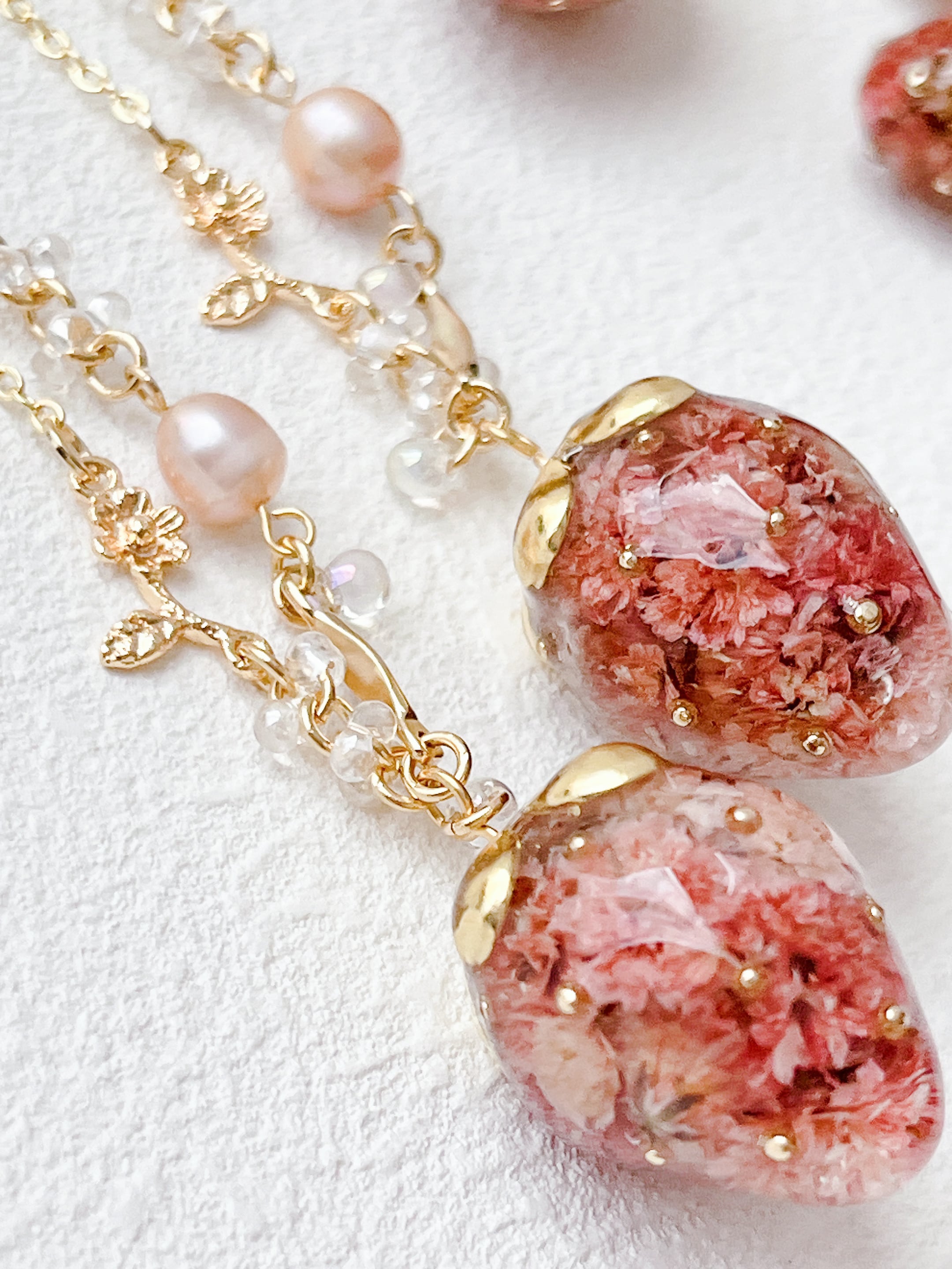 大人気いちごあめをネックレスにしました。 本物のかすみ草がたくさん詰まったころんとしたいちごはイヤーアクセサリーより一回り大きく胸元に来ても目立つようにしました。 繊細なかすみ草をグラデーションになるように封入して大人も身につけやすいいちごのネックレスにしています。 種も一つ一つ手作業で付けて、チェーン部分には淡いピンクの淡水パールやビーズをあしらった拘りの繋ぎ方にしています。 チェーンは金属アレルギー対応のニッケルフリーを使用しています。 size チェーン部分 50cm アジャスター 5cm いちごあめ 約2.5×1.8cm ♡ ••┈┈┈┈┈┈┈┈•• ♡ この度は当店にお越し頂きありがとうございます。 ご購入前に確認事項をお読み頂いてからのご注文をお願い致します。 ピアス、イヤリングは基本的に金属アレルギー対応のサージカルステンレスを使用していますが個人差があるため100%アレルギー反応が出ないと保証は出来ません。ご理解ください。 ひとつひとつ心を込めて制作していますが小さな気泡が残っている場合があります。 本物のお花を使用しているため同じデザインでもお花の形や色味が変わることがあります。 唯一無二の作品としてお楽しみいただけたら嬉しいです。 お使いのモニターによって色の見え方が異なる場合があります。ご了承下さい。 お客様都合の返品交換は致しかねます。 初期不良に関しては商品到着後5日以内にご連絡下さい。 繊細な作品ですので強い衝撃や直射日光下での保存はお控え下さい。 水分や皮脂等は変色やサビの原因となります。使用後は柔らかい布等で拭いてから直射日光を避け、風通しのいい場所での保管をおすすめしております。 発送はクリックポストです。 大きいアクセサリーは送料が異なります。 ご質問等ございましたらご購入前にお気軽にメッセージお願い致します。 ♡ ••┈┈┈┈┈┈┈┈•• ♡