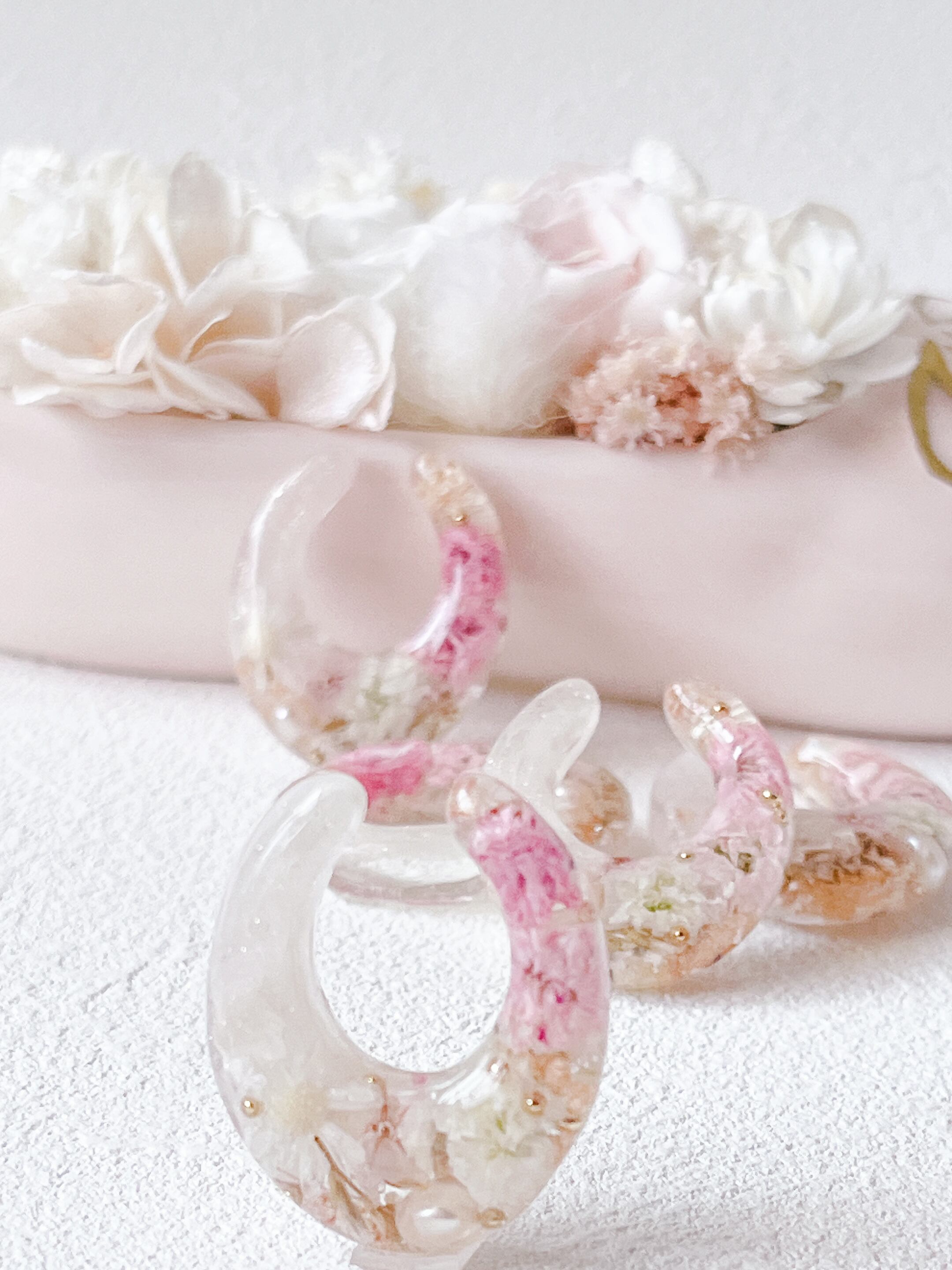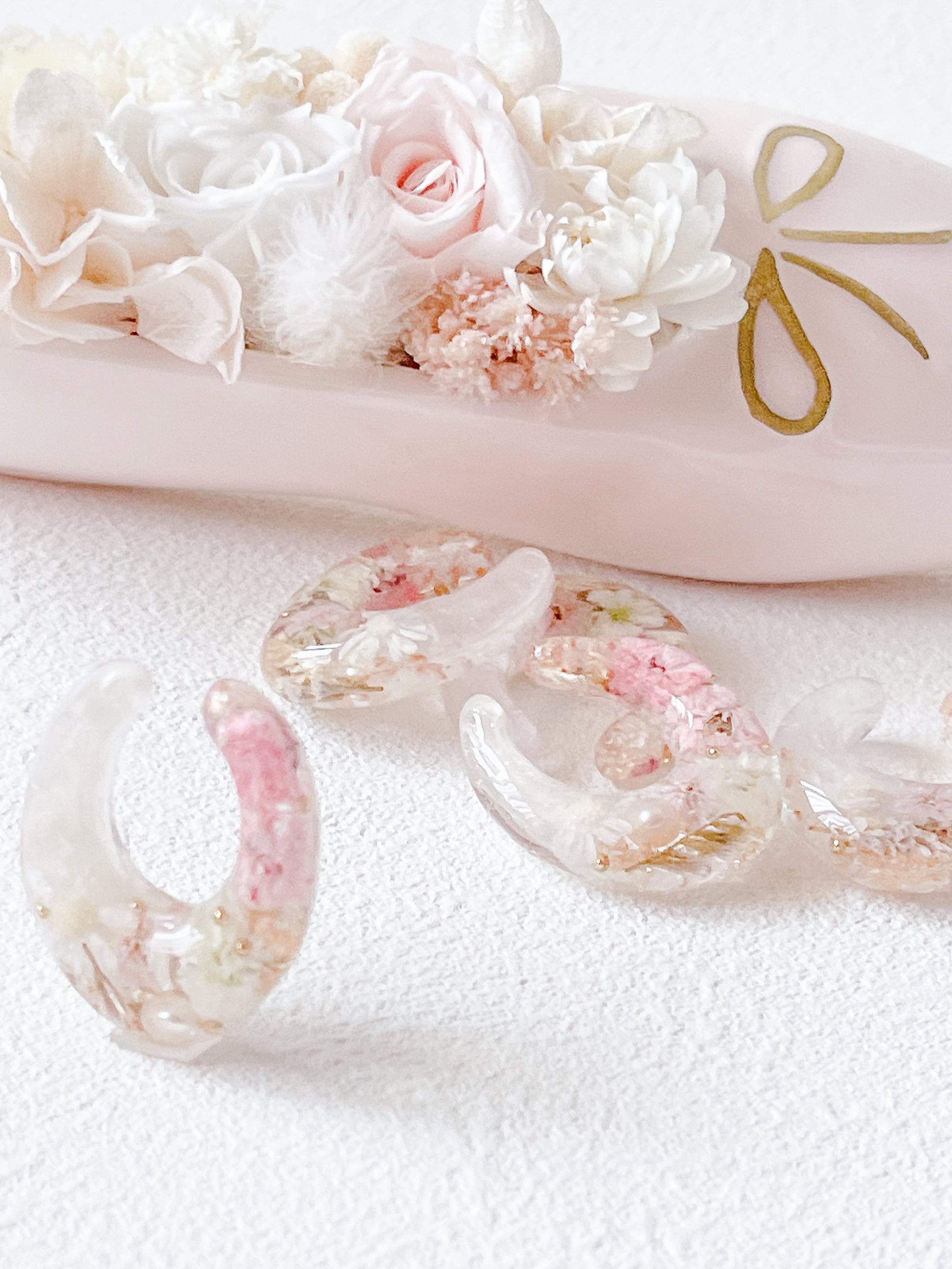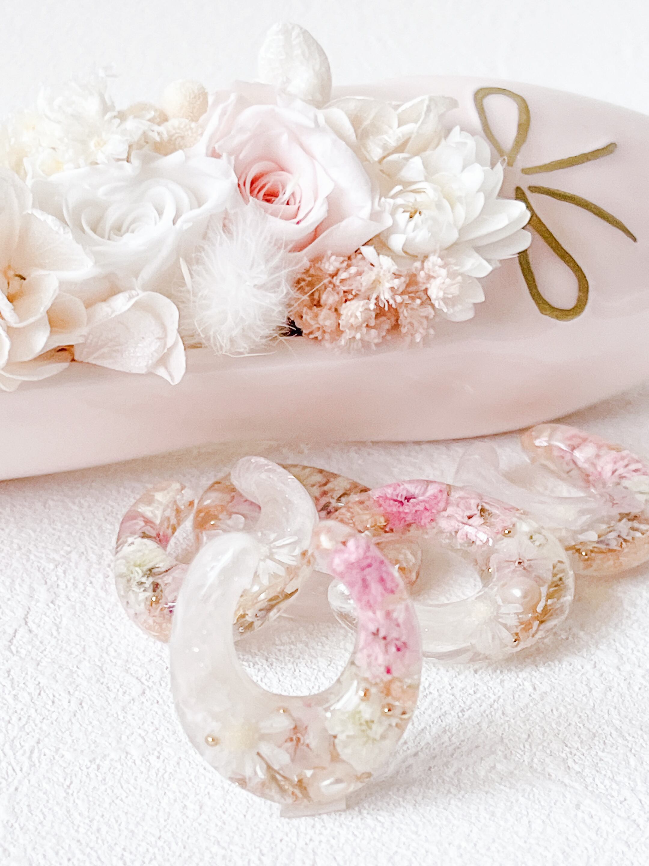 どちらの面から差し込んでもお花が見えるようにと両面ともお花が正面になるように封入しています。淡水パールやブリオンでアクセントと高級感も合わせました。