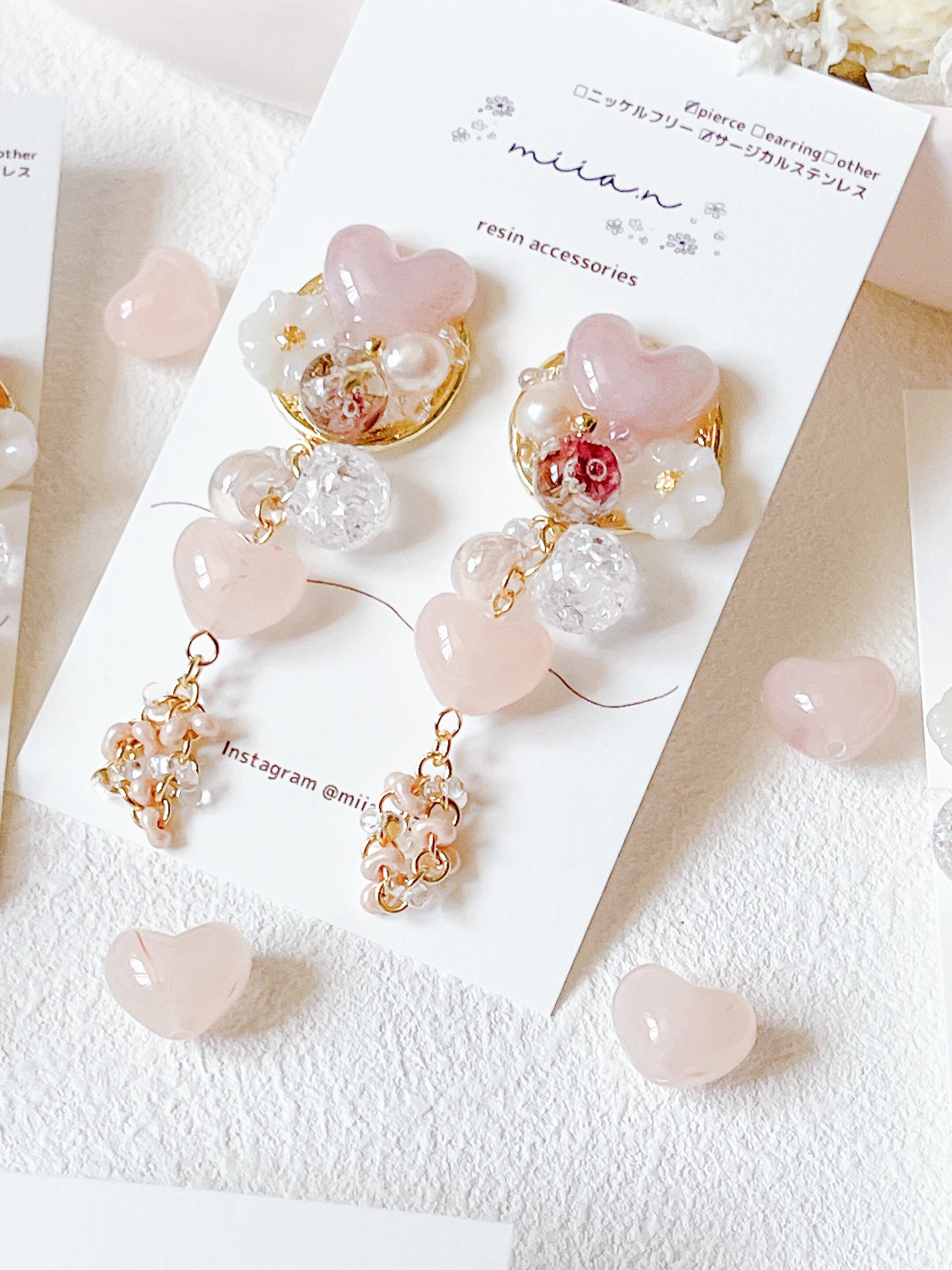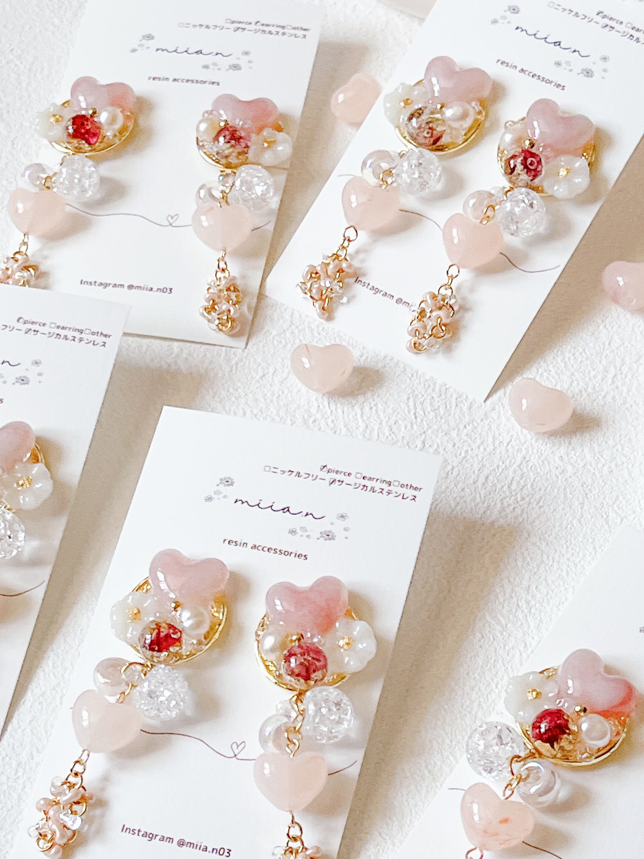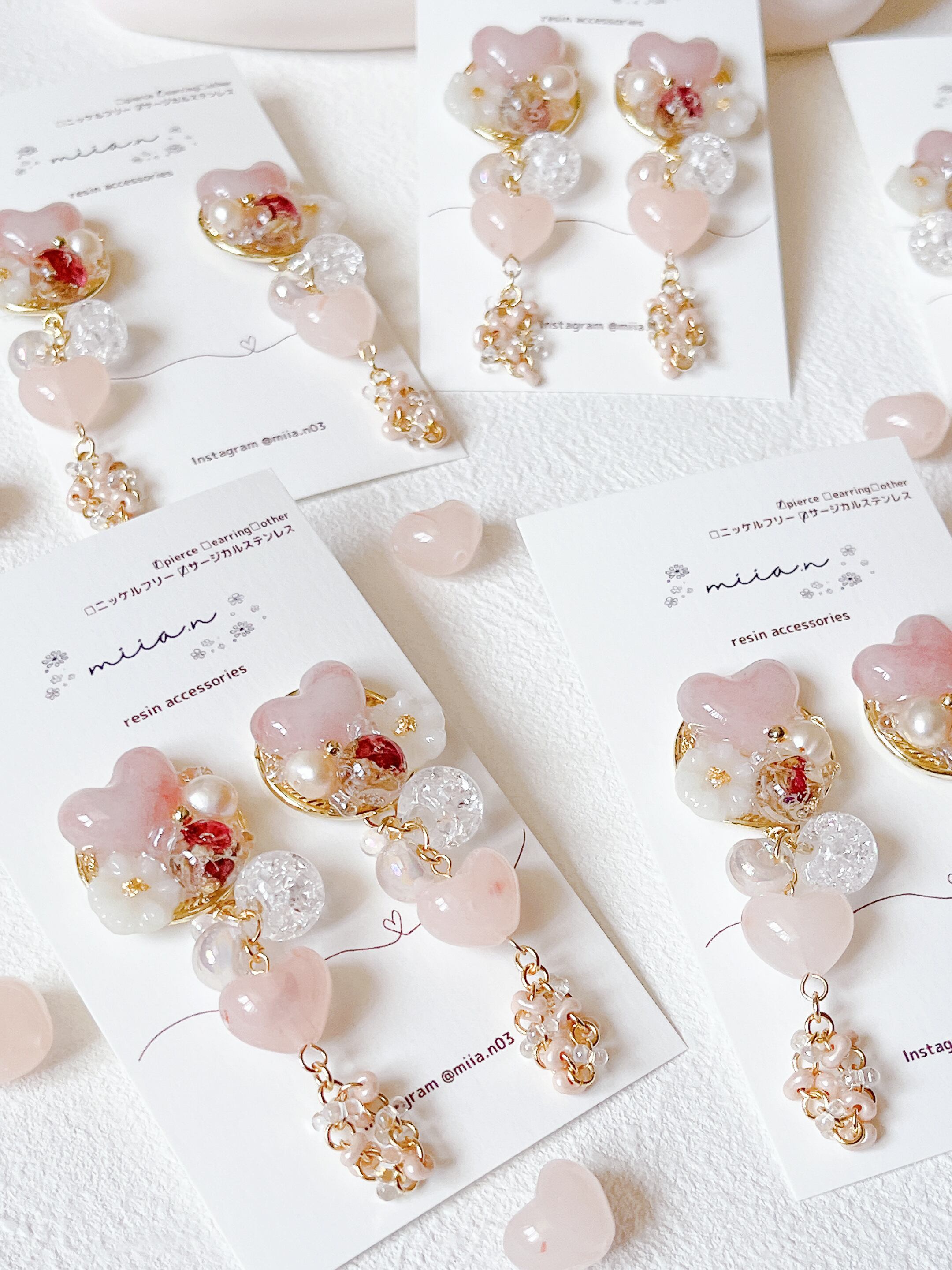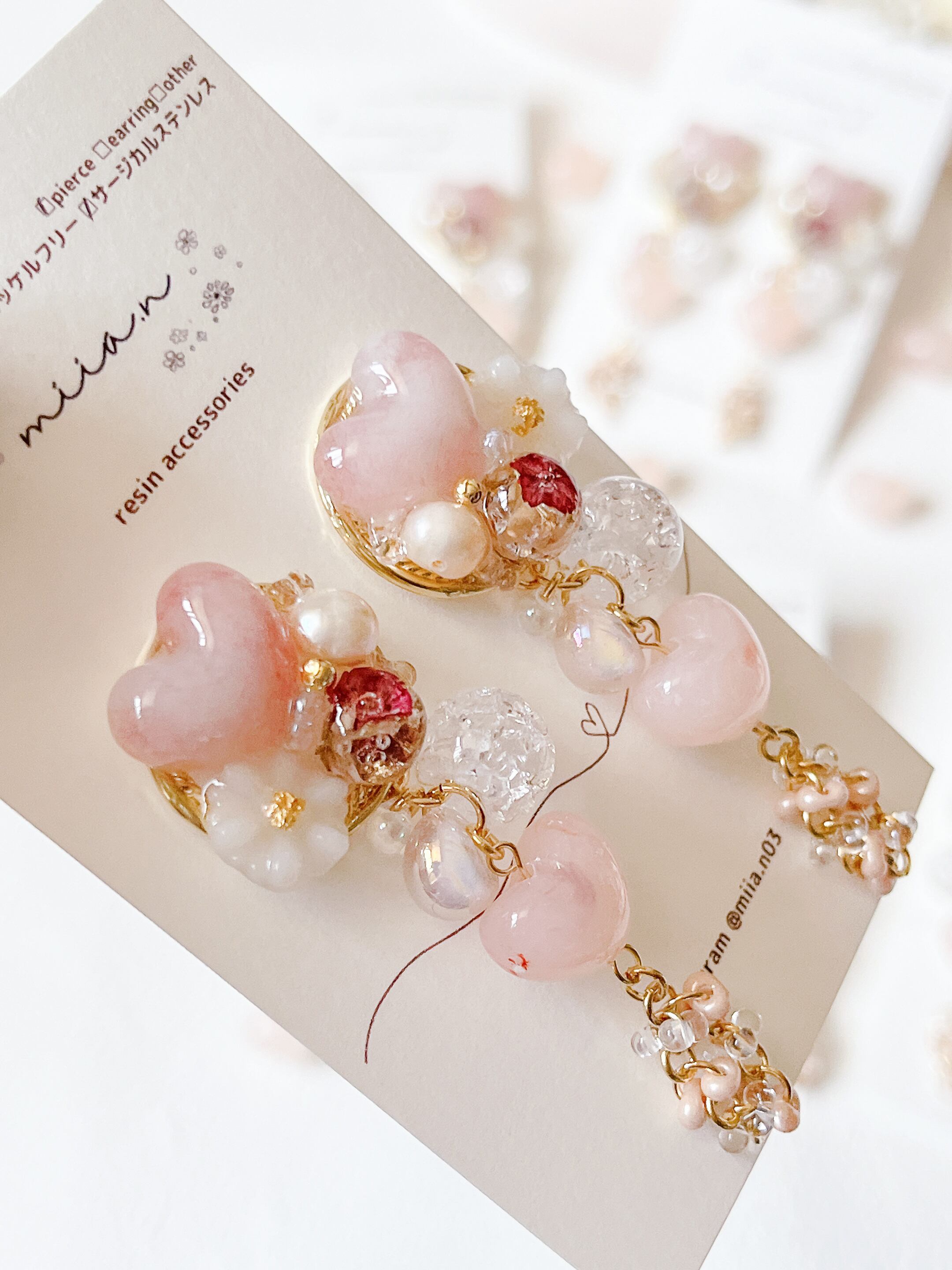 桃の質感を再現したハートレジンとお花、淡水パール、バブルビーズなどを合わせてとろける甘さとしゅわっと弾けるソーダのようなアクセサリー。