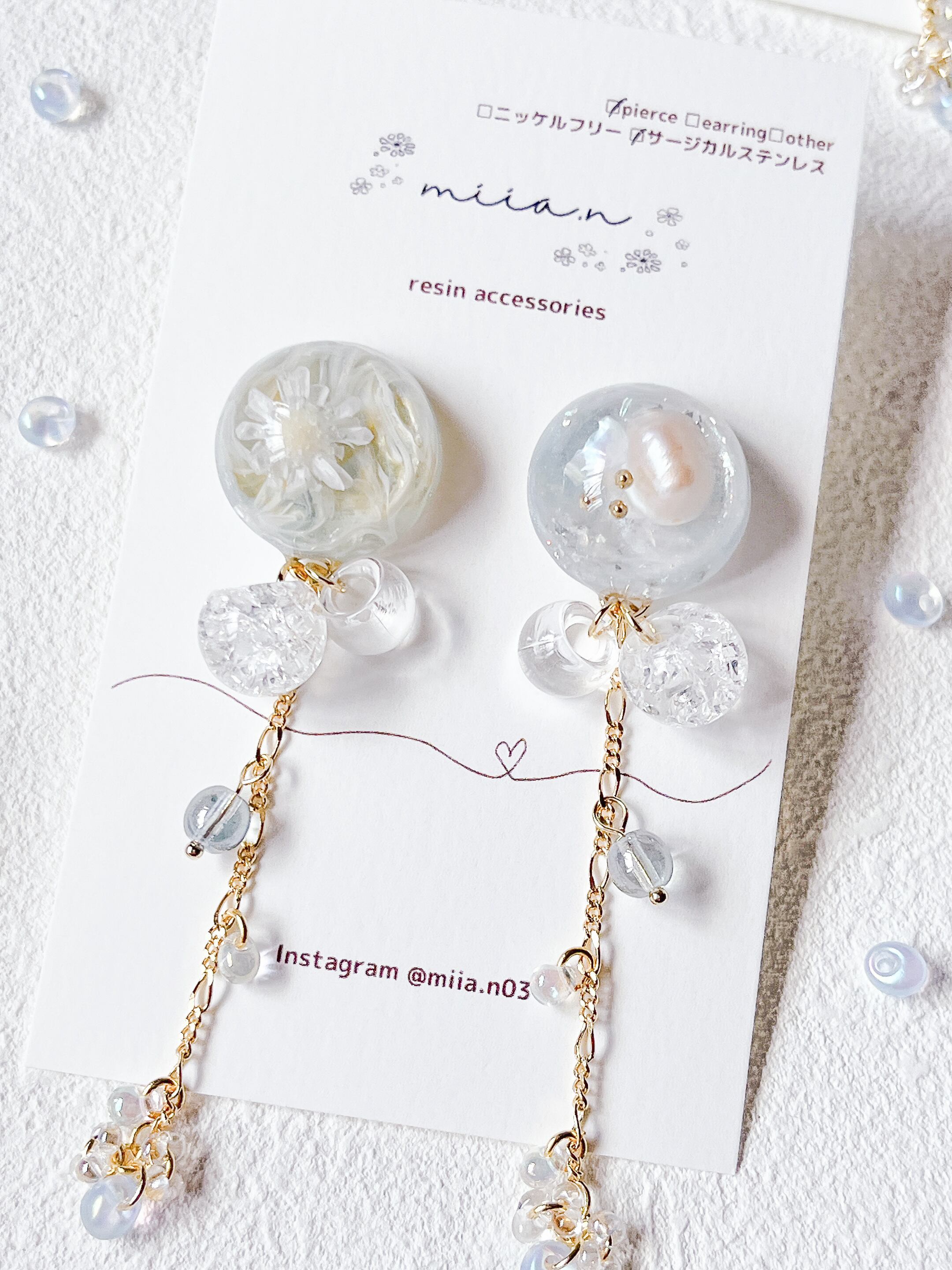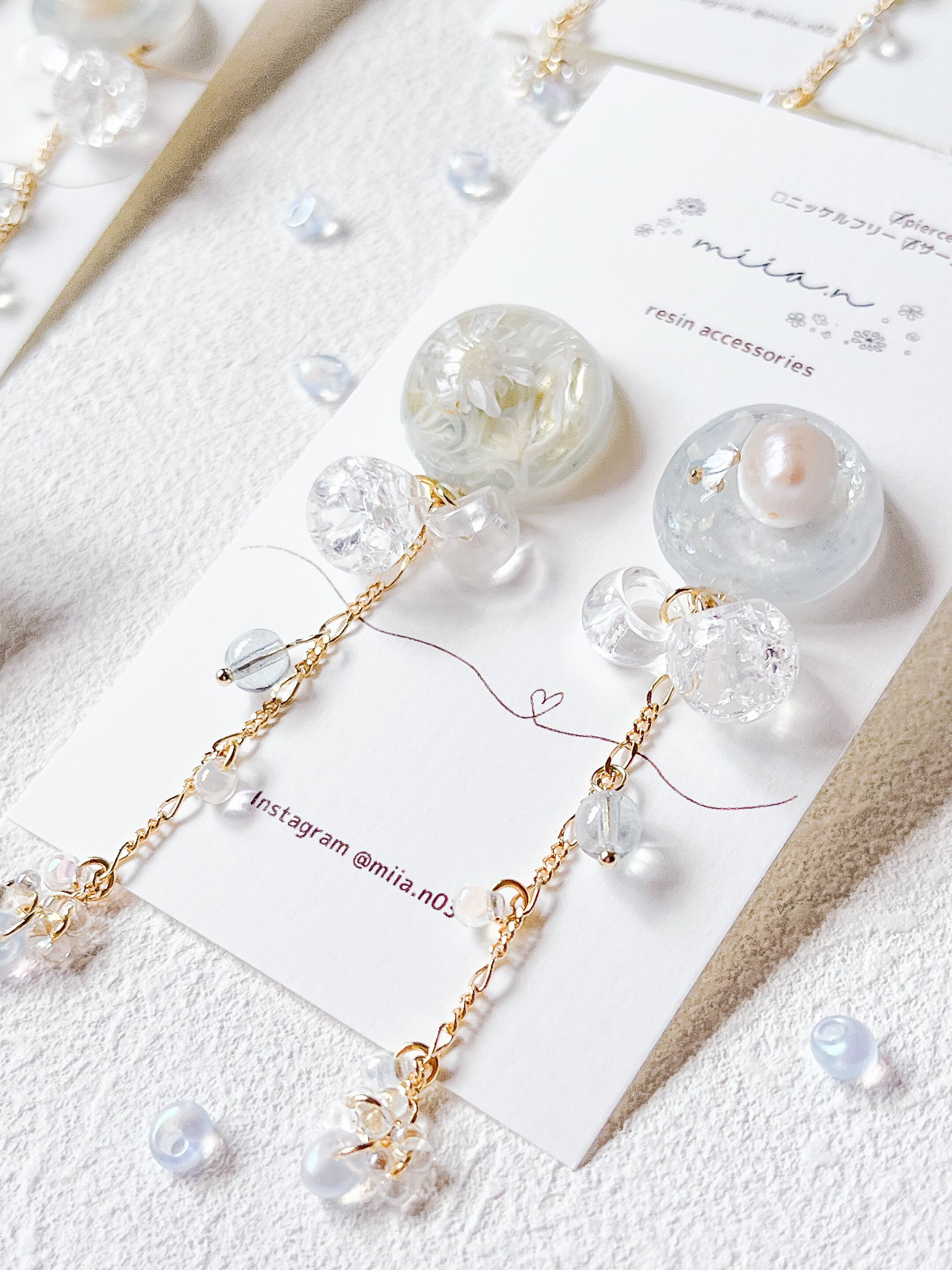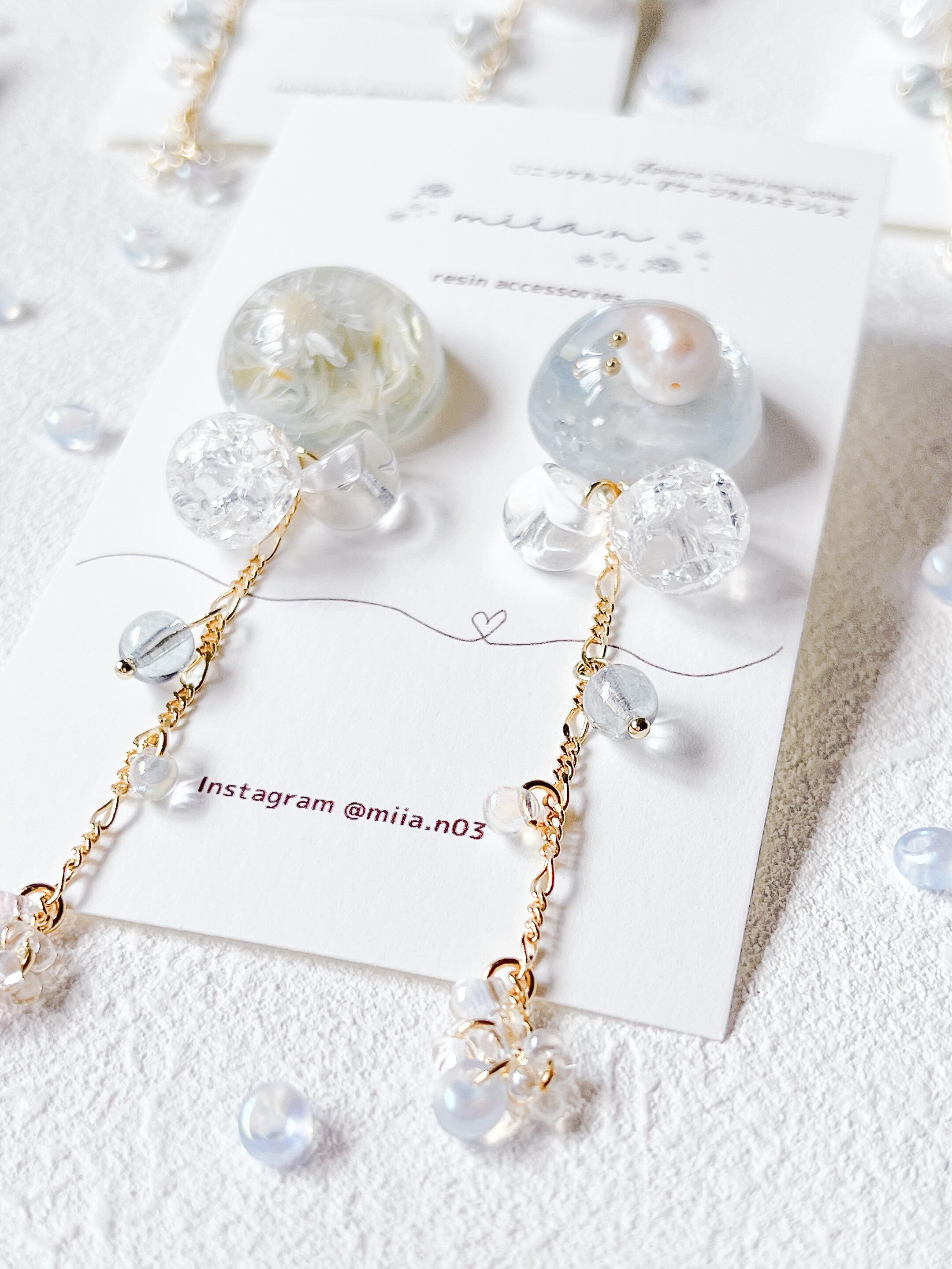 大きめの淡水パールとシェルを封入してホロやインク、シャーベットフレークで貝殻から見える世界を表現しています。