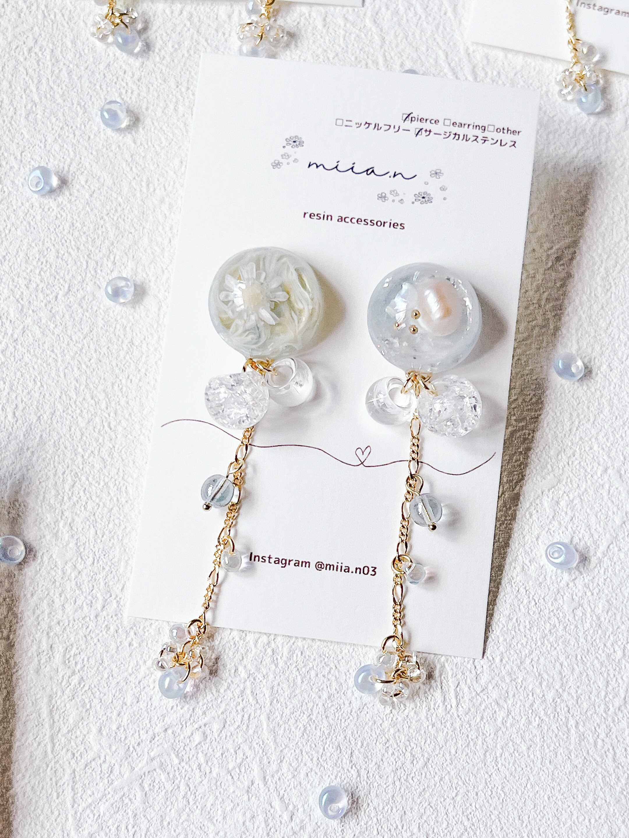 下部分のゆらゆらチャーム部分もブルーグレーやオーロラのビーズを使って涼しげな透明感や雫を表現しました。