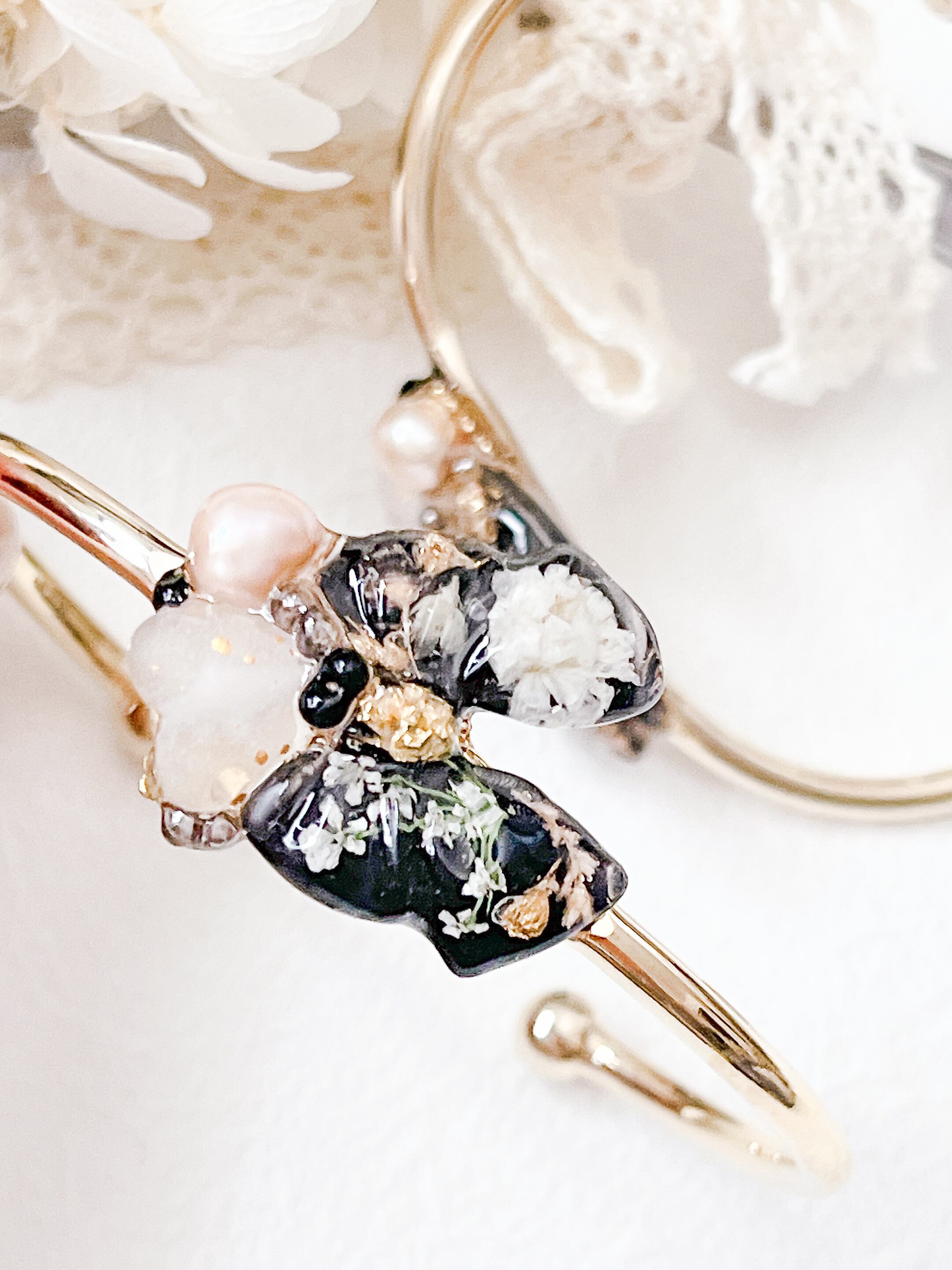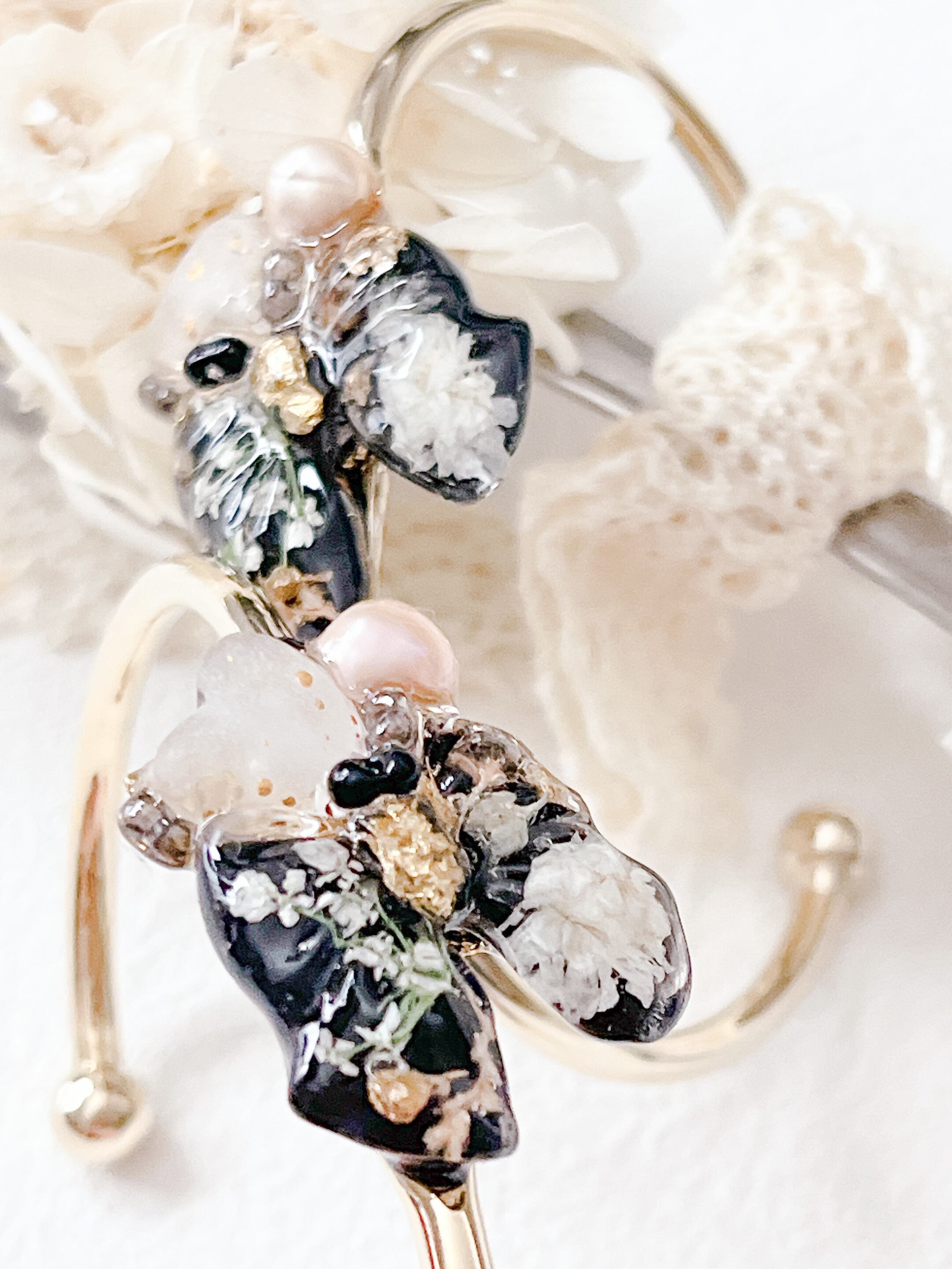 ブラックのリボンと金箔加工入りのマットなハートビーズが目を惹くバングルになっています。