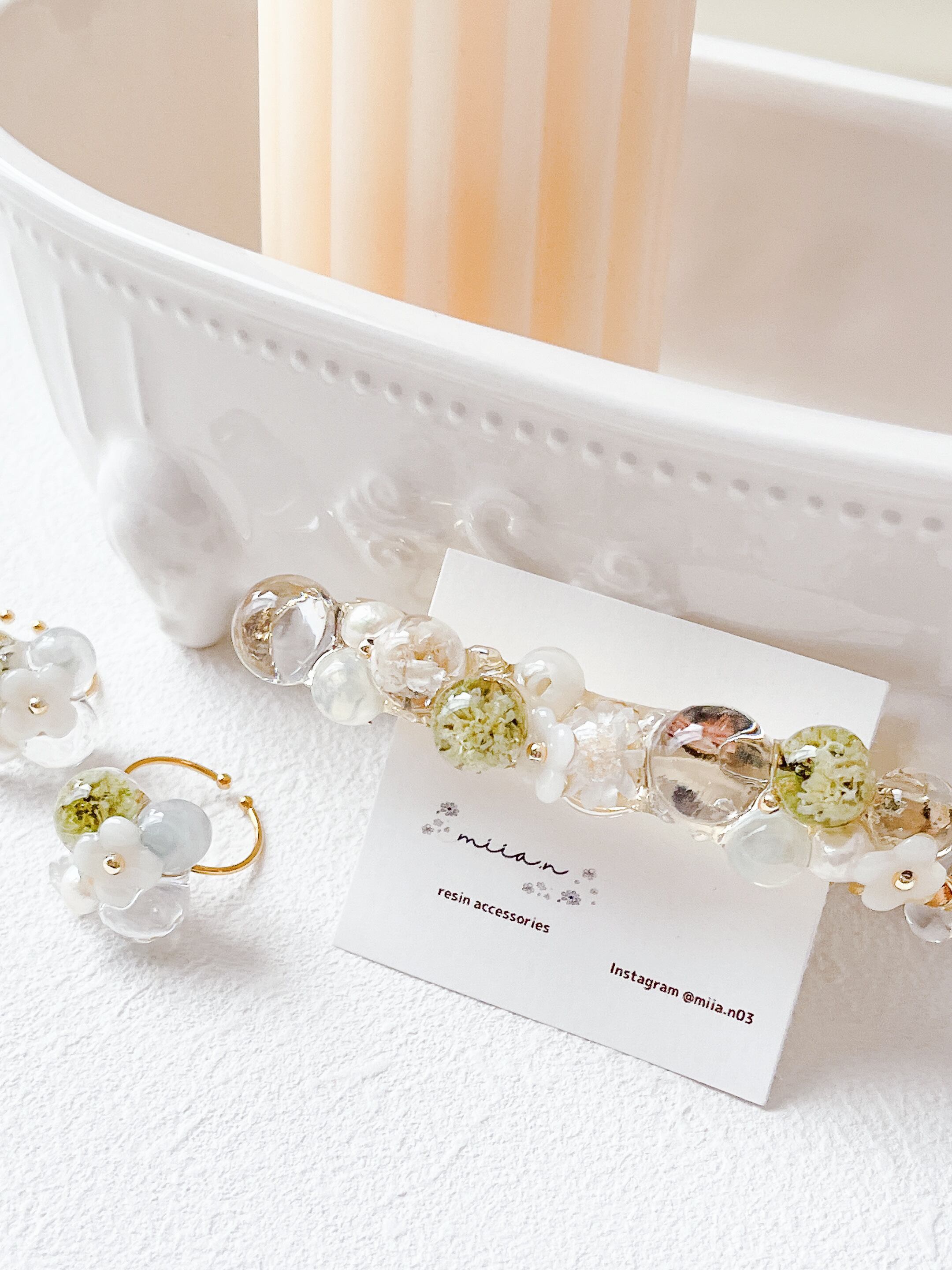 所々に白いお花が載ってたり、サイドにビーズがゆらゆらしているのもかわいいポイントです。
