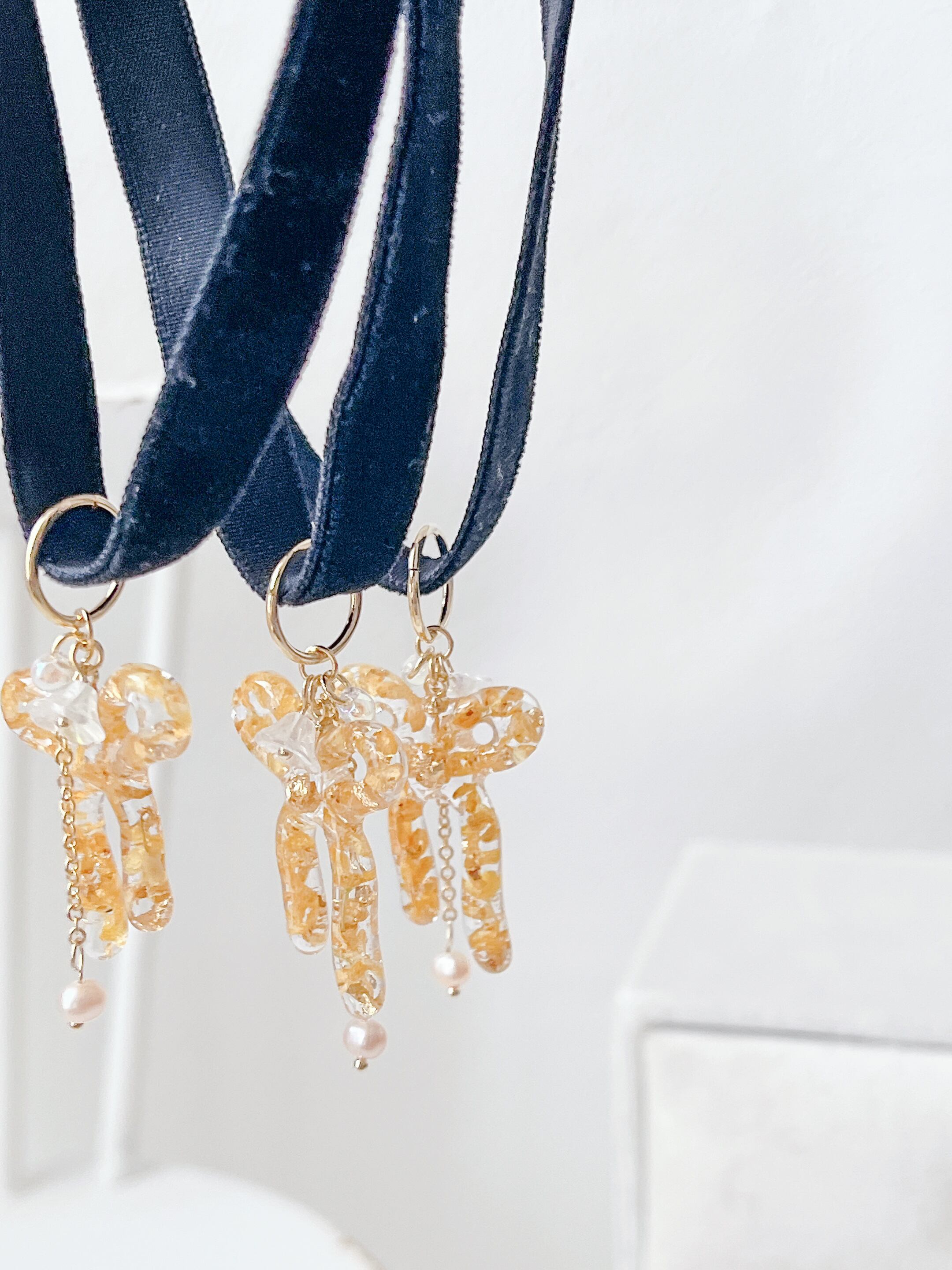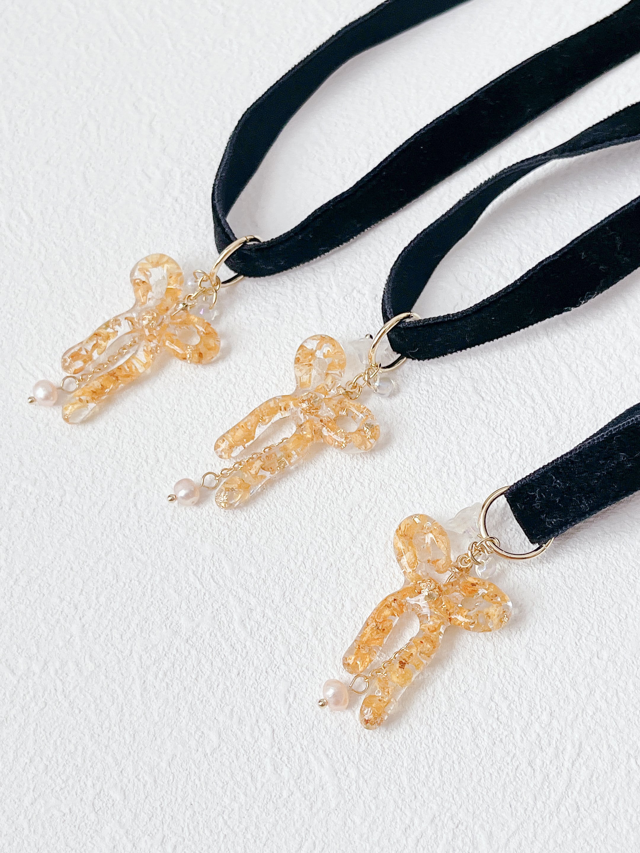 金木犀のお花を沢山詰め込んだレジンのリボンとベロアリボンチョーカーを合わせました。