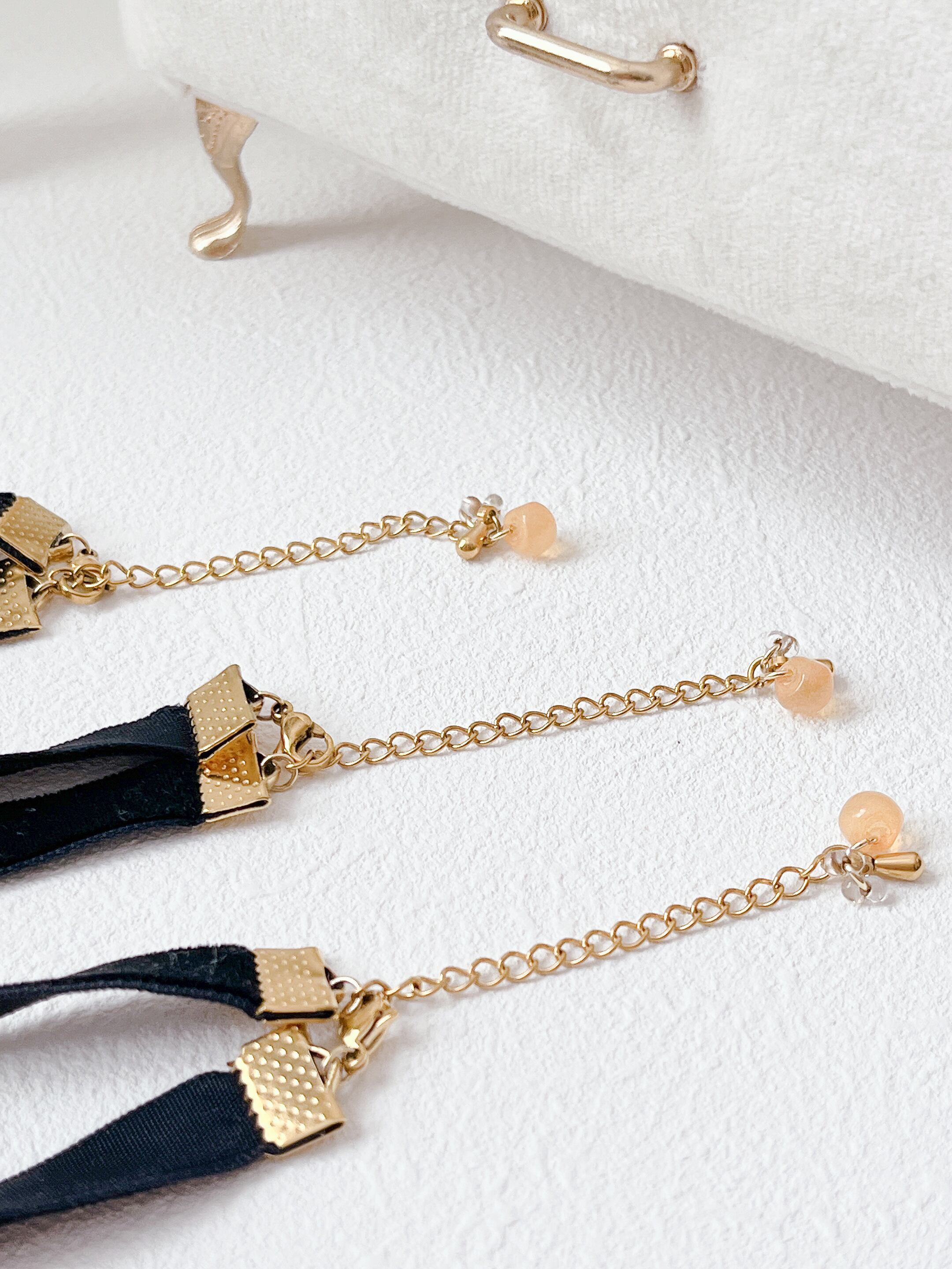 イヤーアクセサリーとお揃いで付けられるようにとビーズも金木犀カラーのものや淡水パールのチェーンなど同じ雰囲気で合わせています。