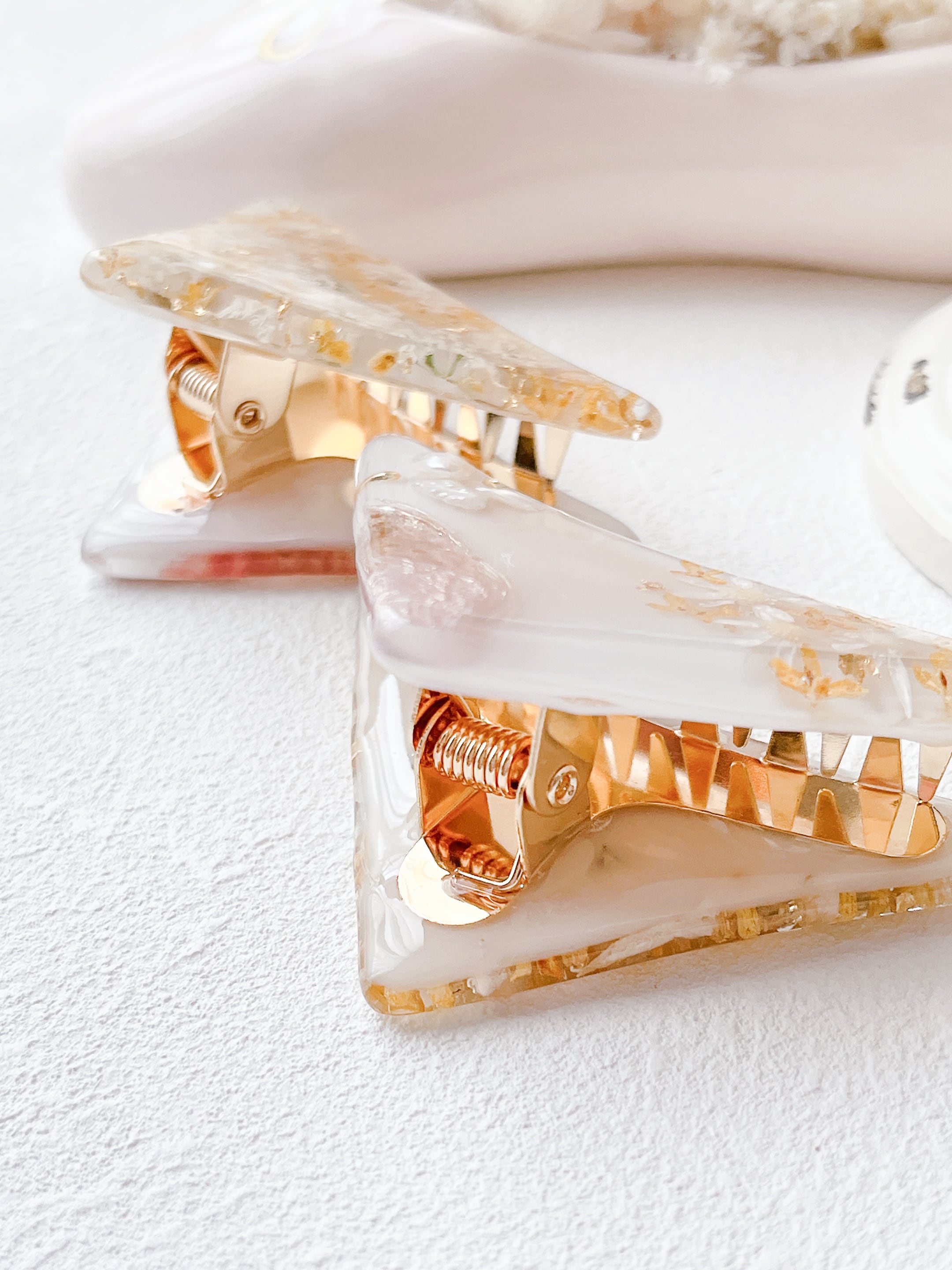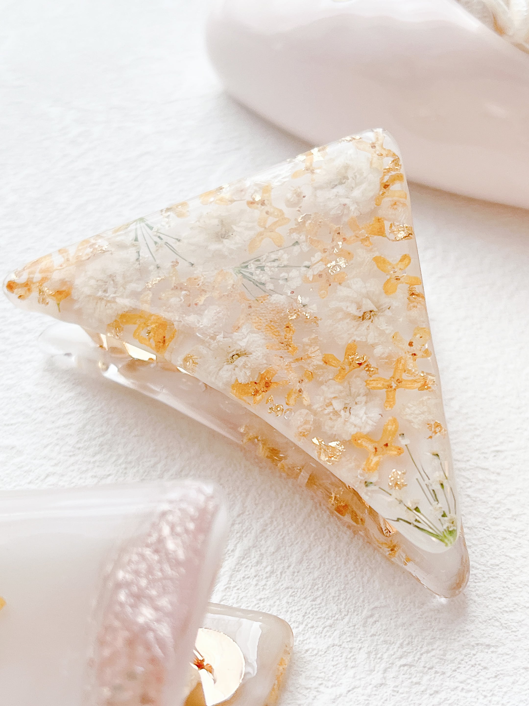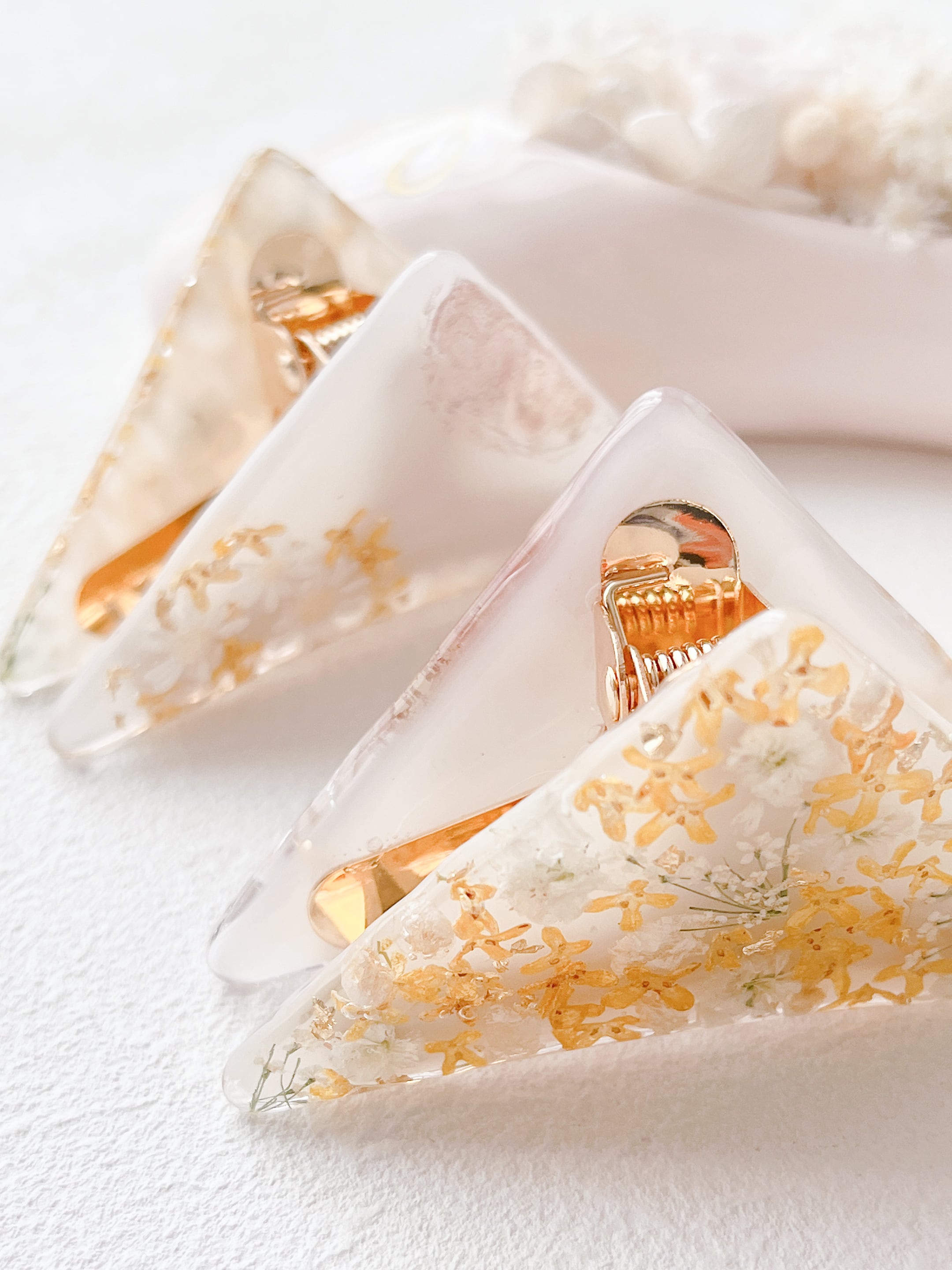 金木犀や数種類のドライフラワーを詰め込んだ面とニュアンスアートと淡水パールを詰め込んだ面の両方をひとつのバンスクリップでお楽しみ頂けます。
