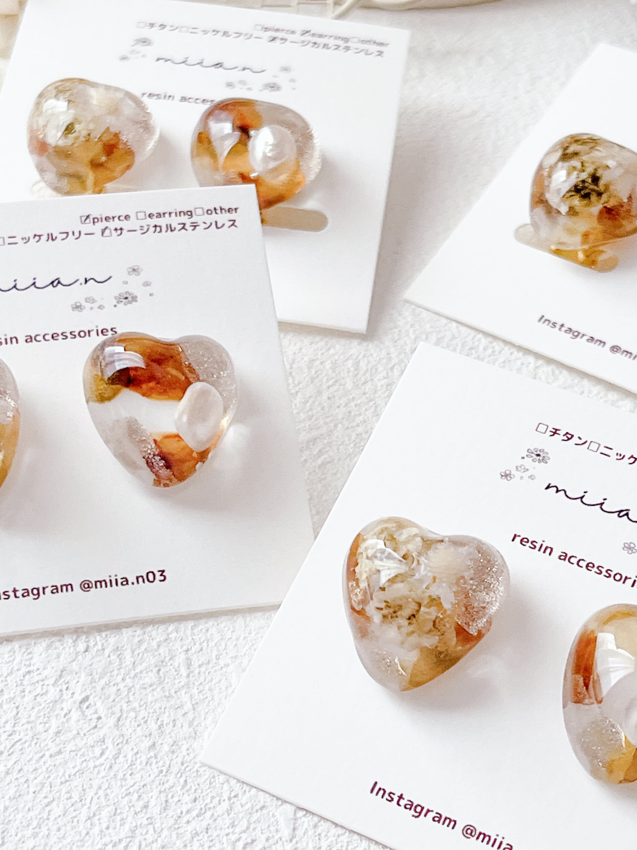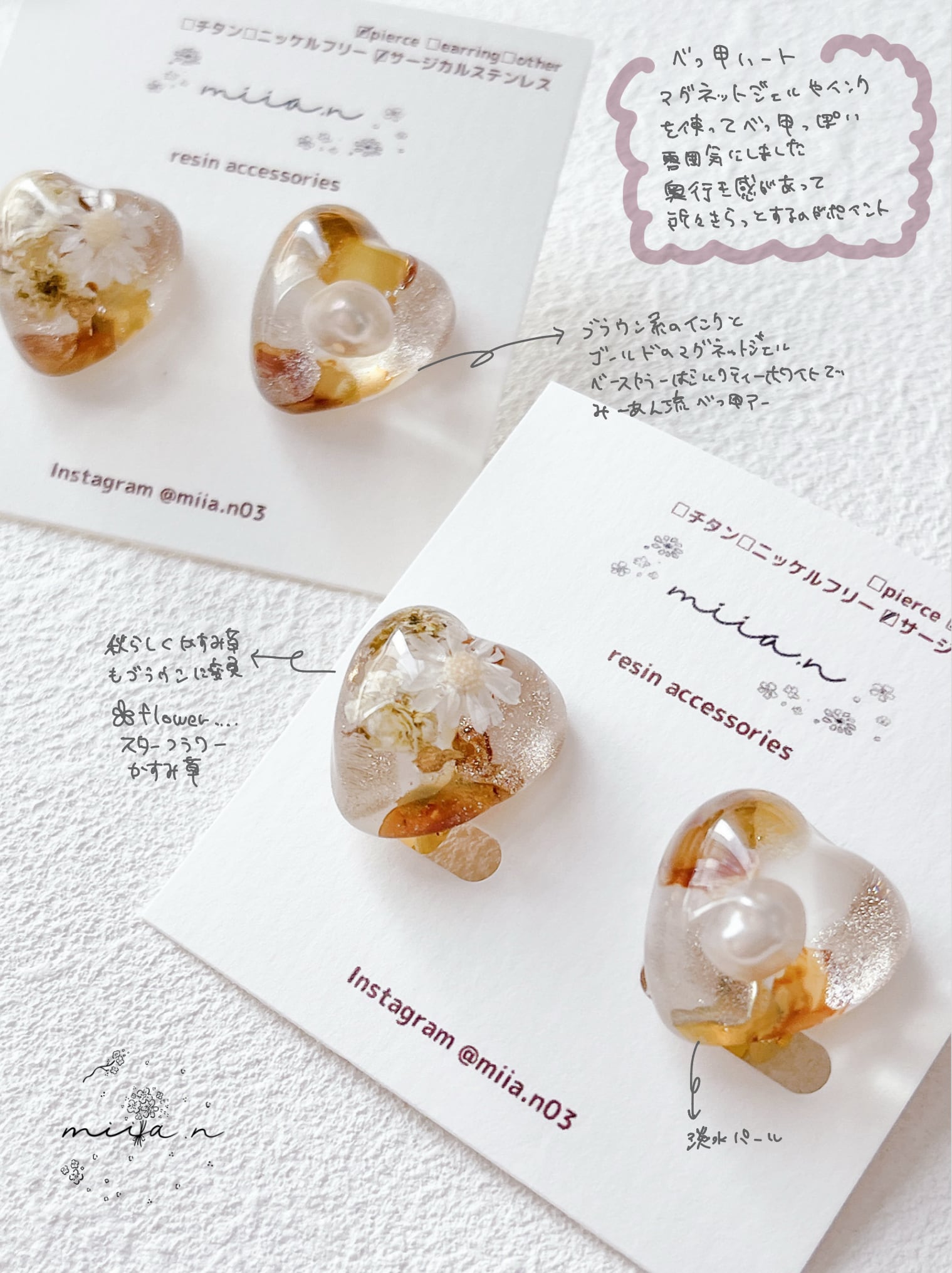 ぷっくりハートなので一粒でも可愛さもありインクアートでみーあん流のニュアンスべっ甲にしたのでデザイン性もあり左右アシンメトリーデザインなのでお花のハートと淡水パールのハートの二つお楽しみ頂けます。