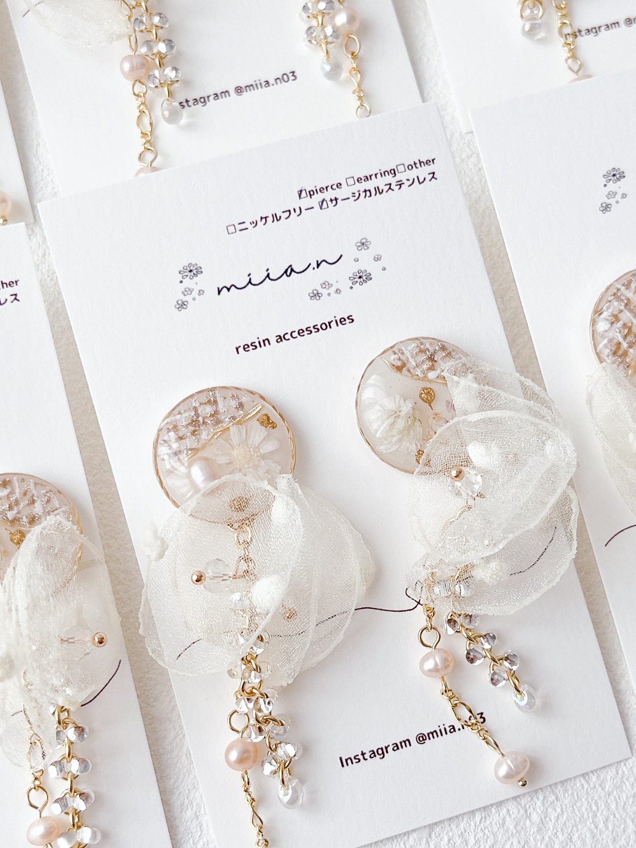 ツイードアートと冬らしいオーガンジーフラワーを掛け合せたふんわり優しい雰囲気のアクセサリー。