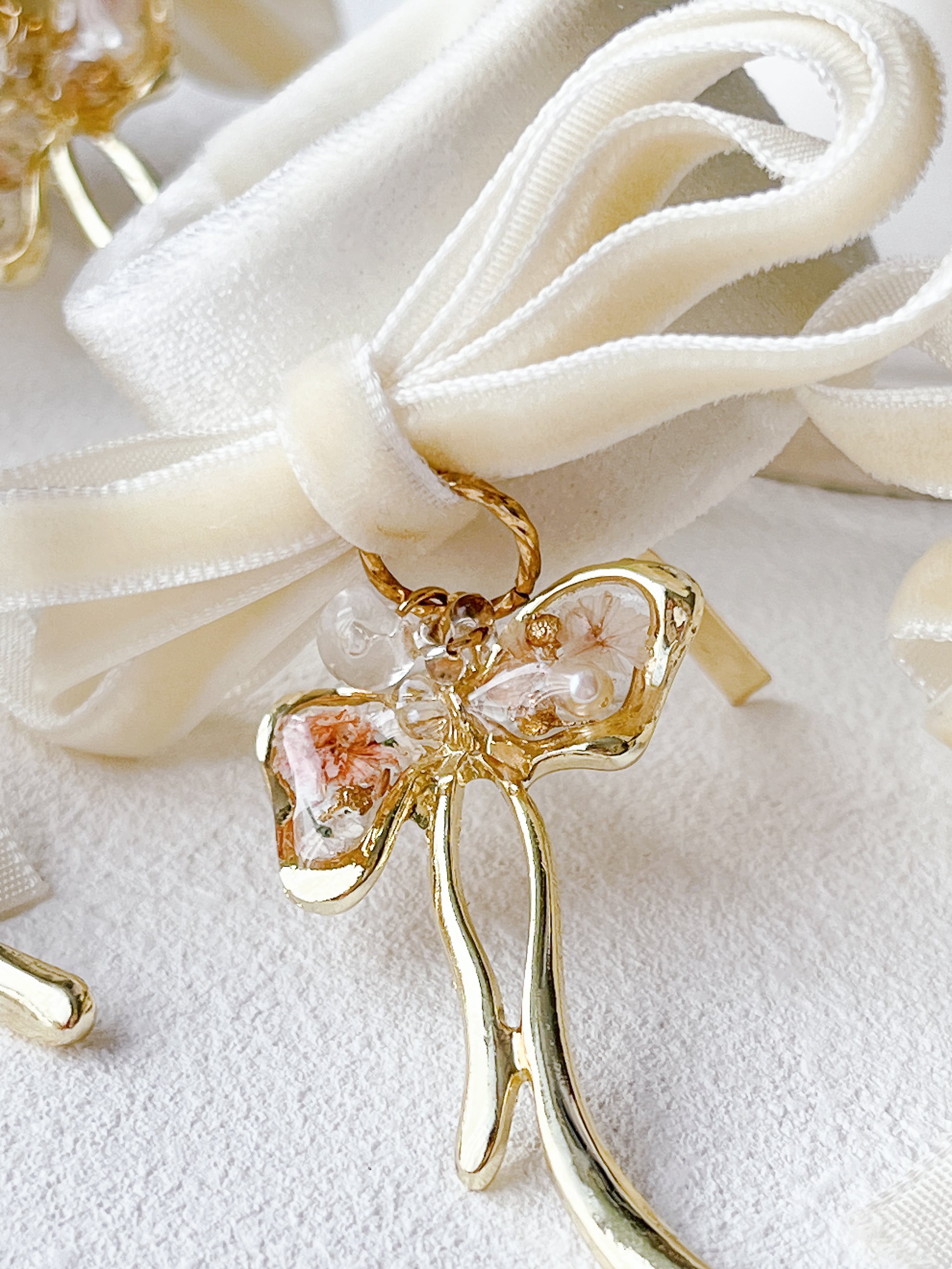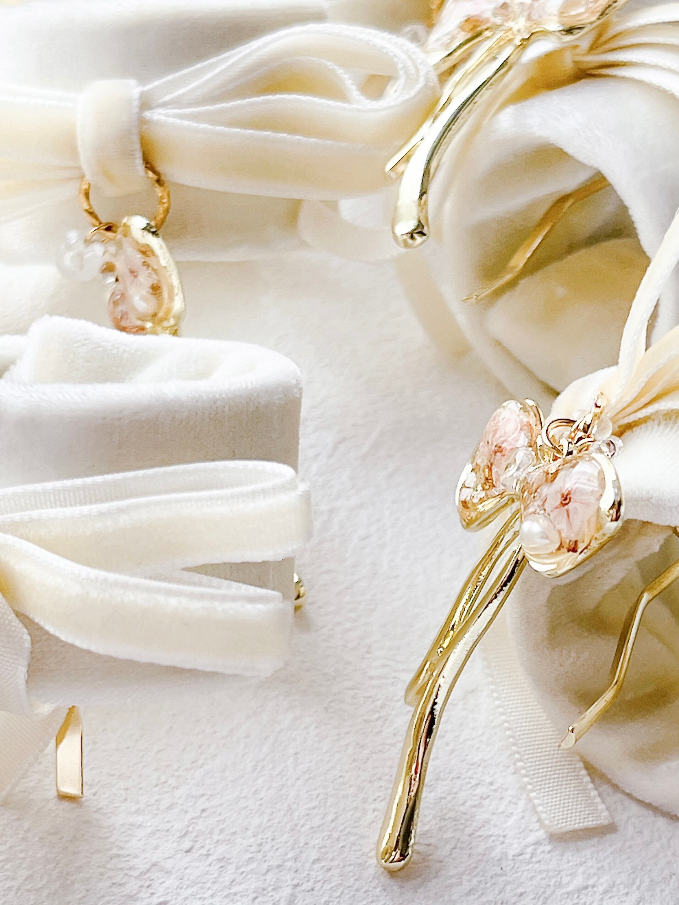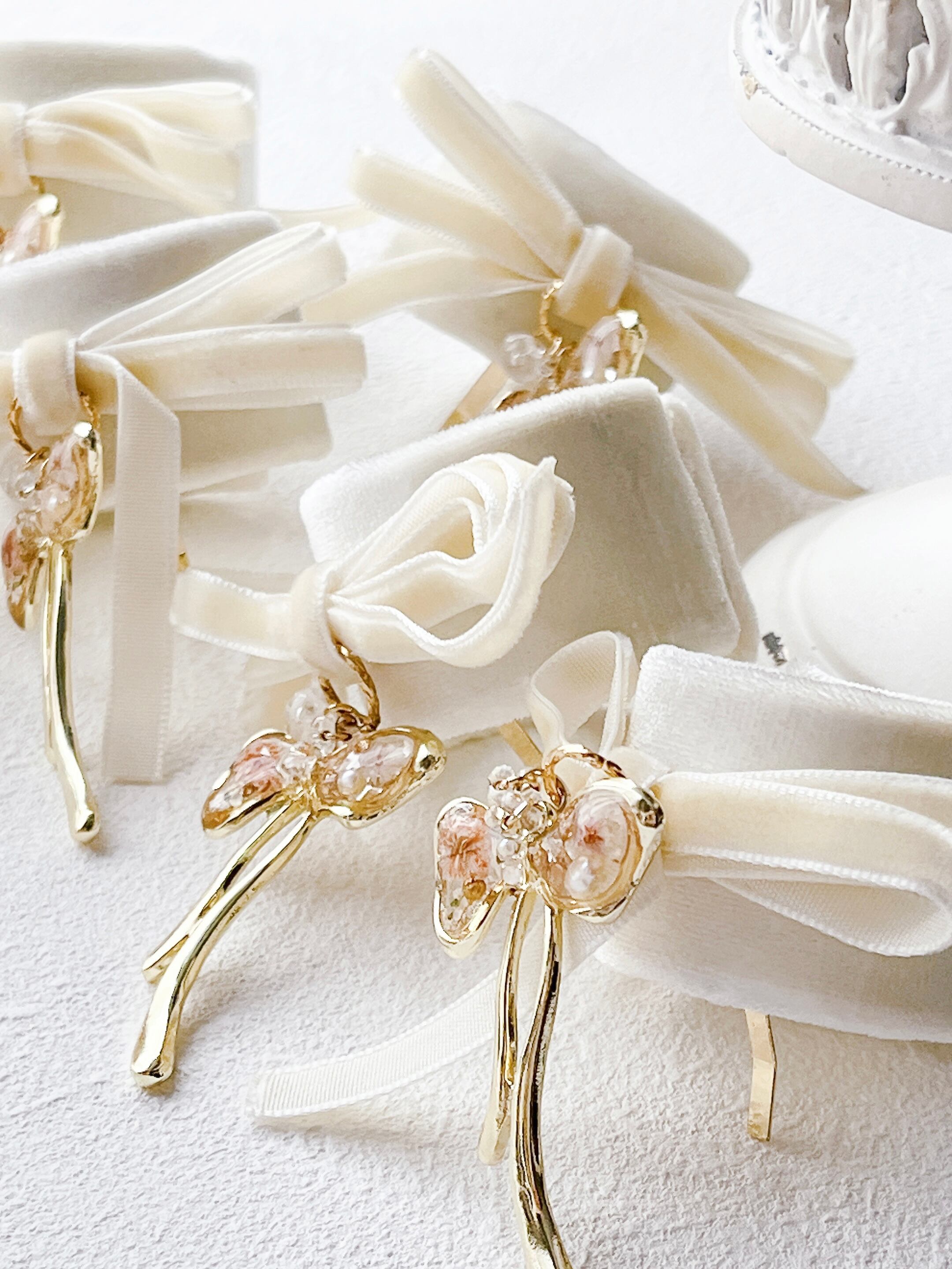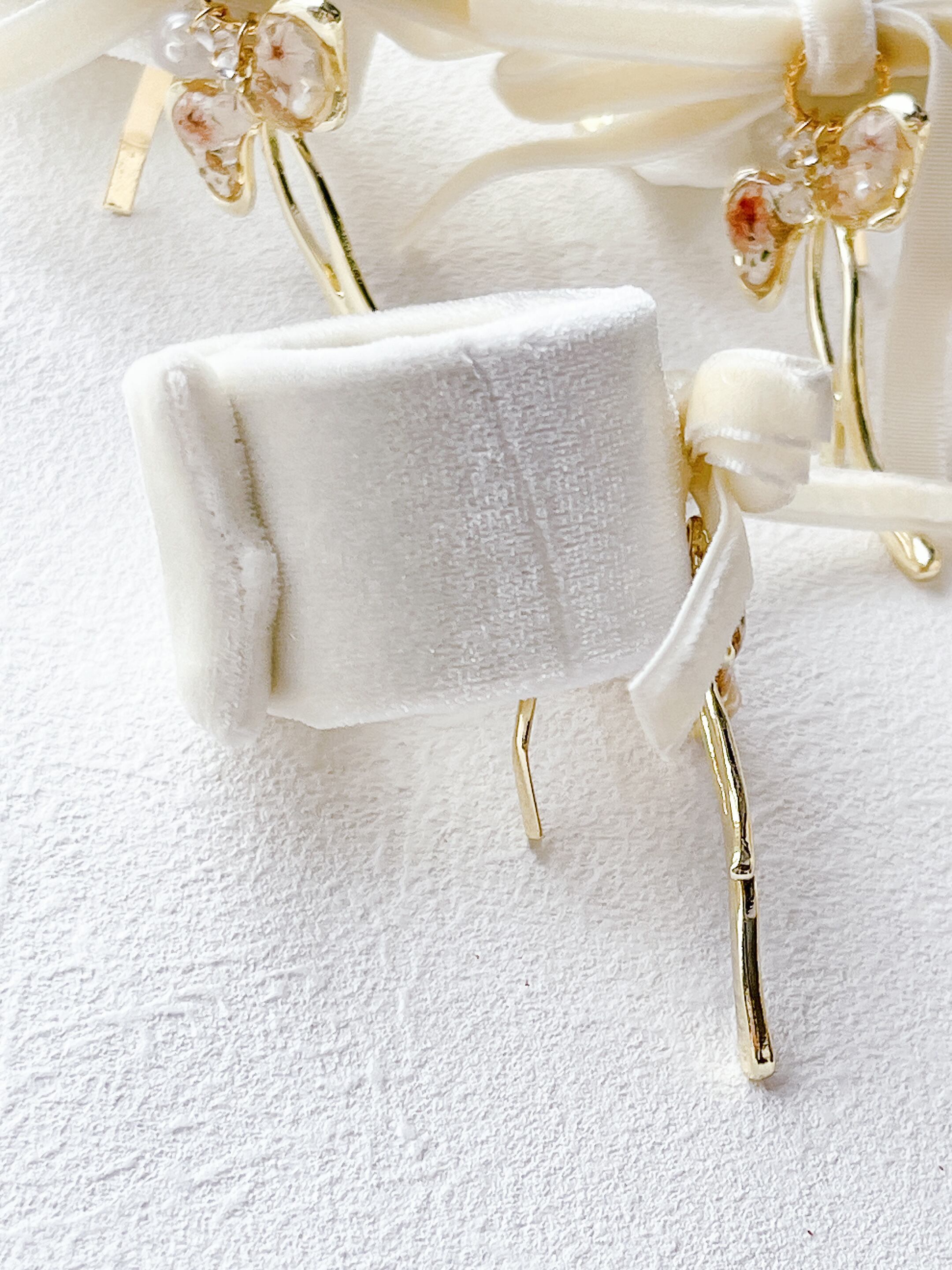 ベロアのリボン生地にリボンのゴールドチャームを揺らしたヘアカフ。