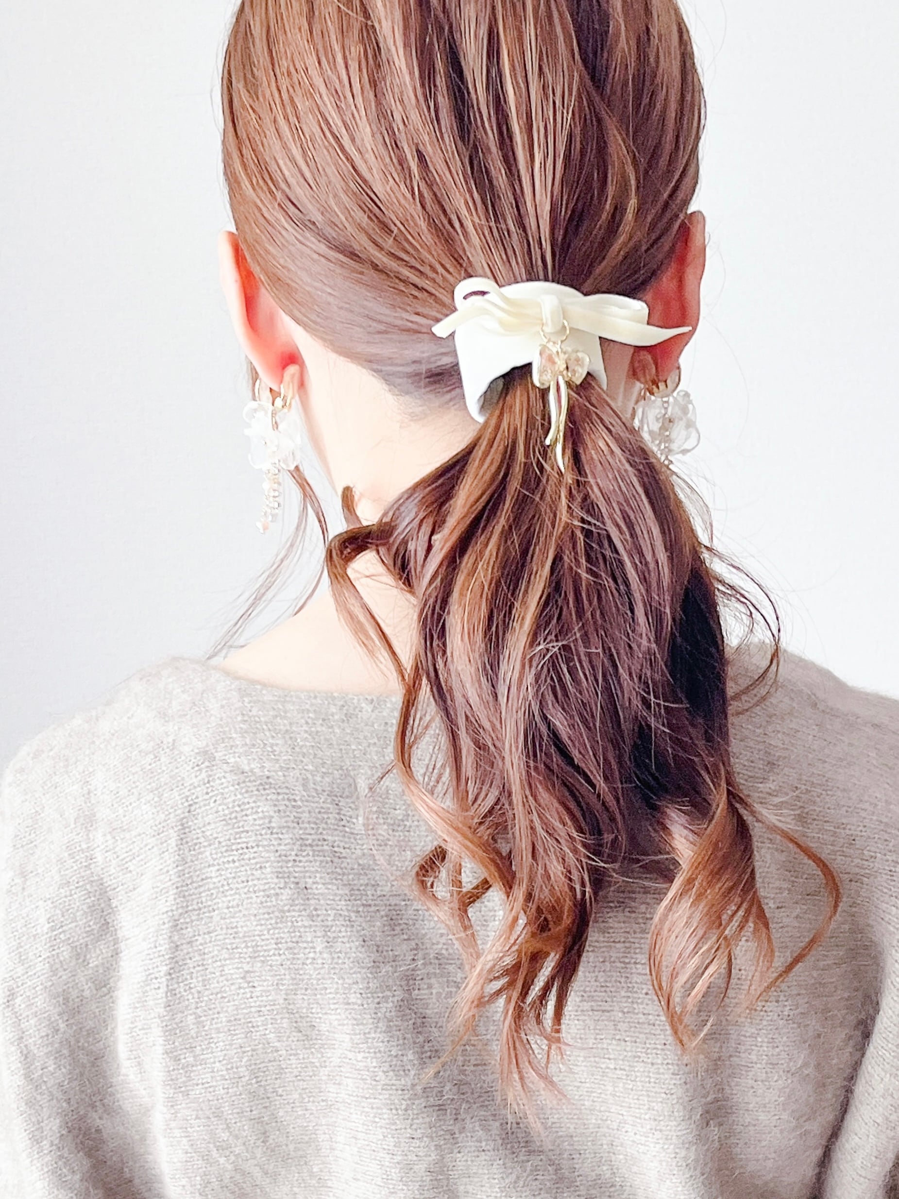 一つ結びにしてゴムに引っ掛けてヘアカフ部分を巻き付けるだけでおしゃれになれるアイテムです。