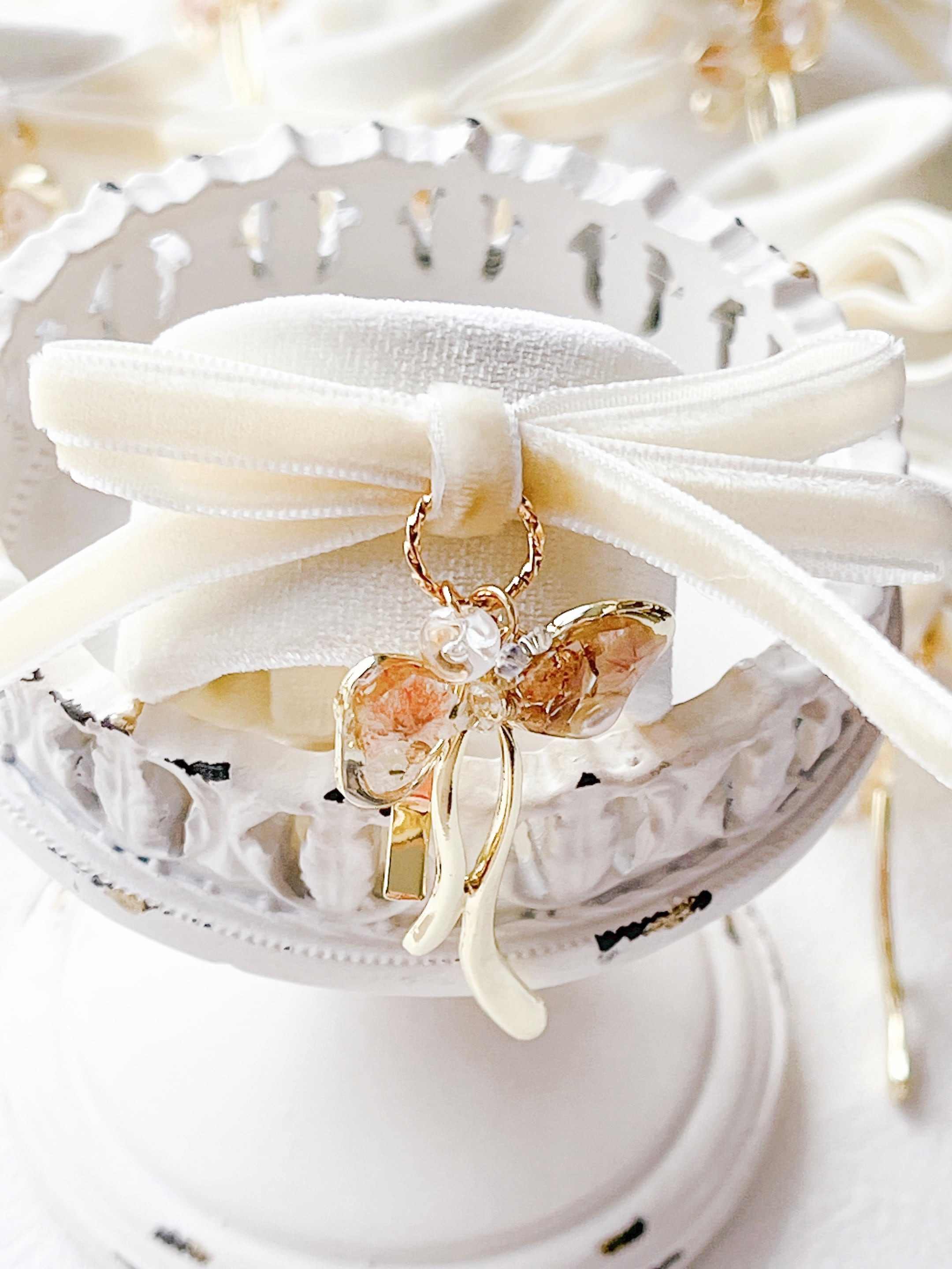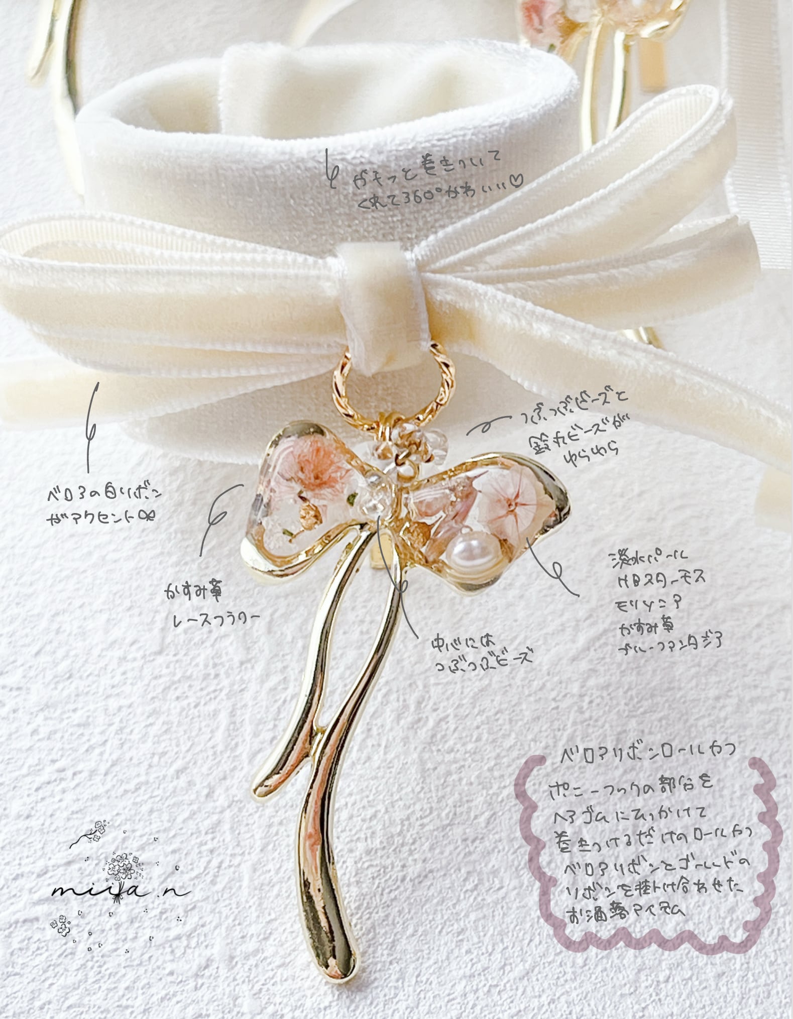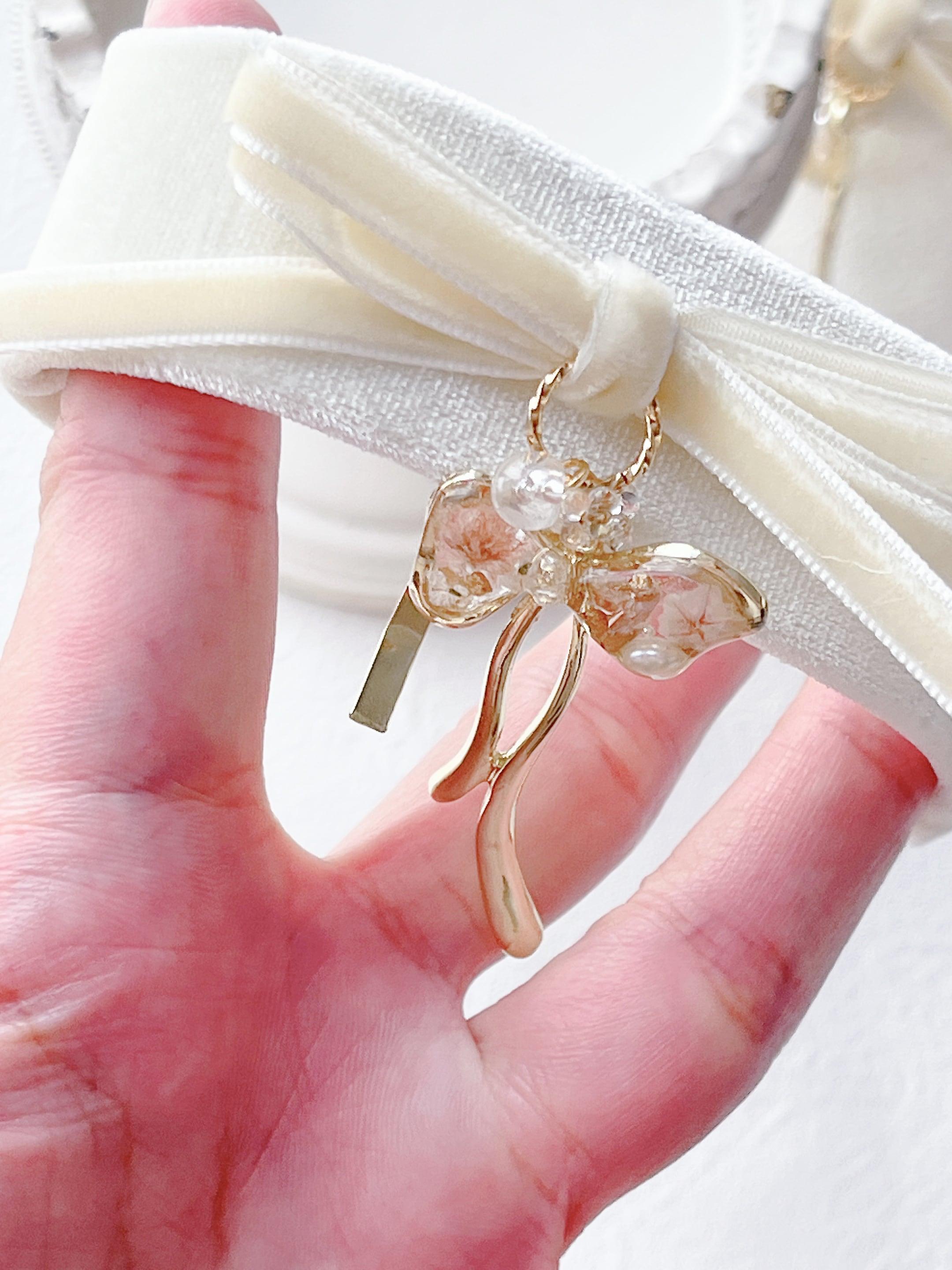 リボンの上にもビーズをあしらっているので動くたびにビーズやレジンのリボンもゆらゆらするのがかわいいポイント。