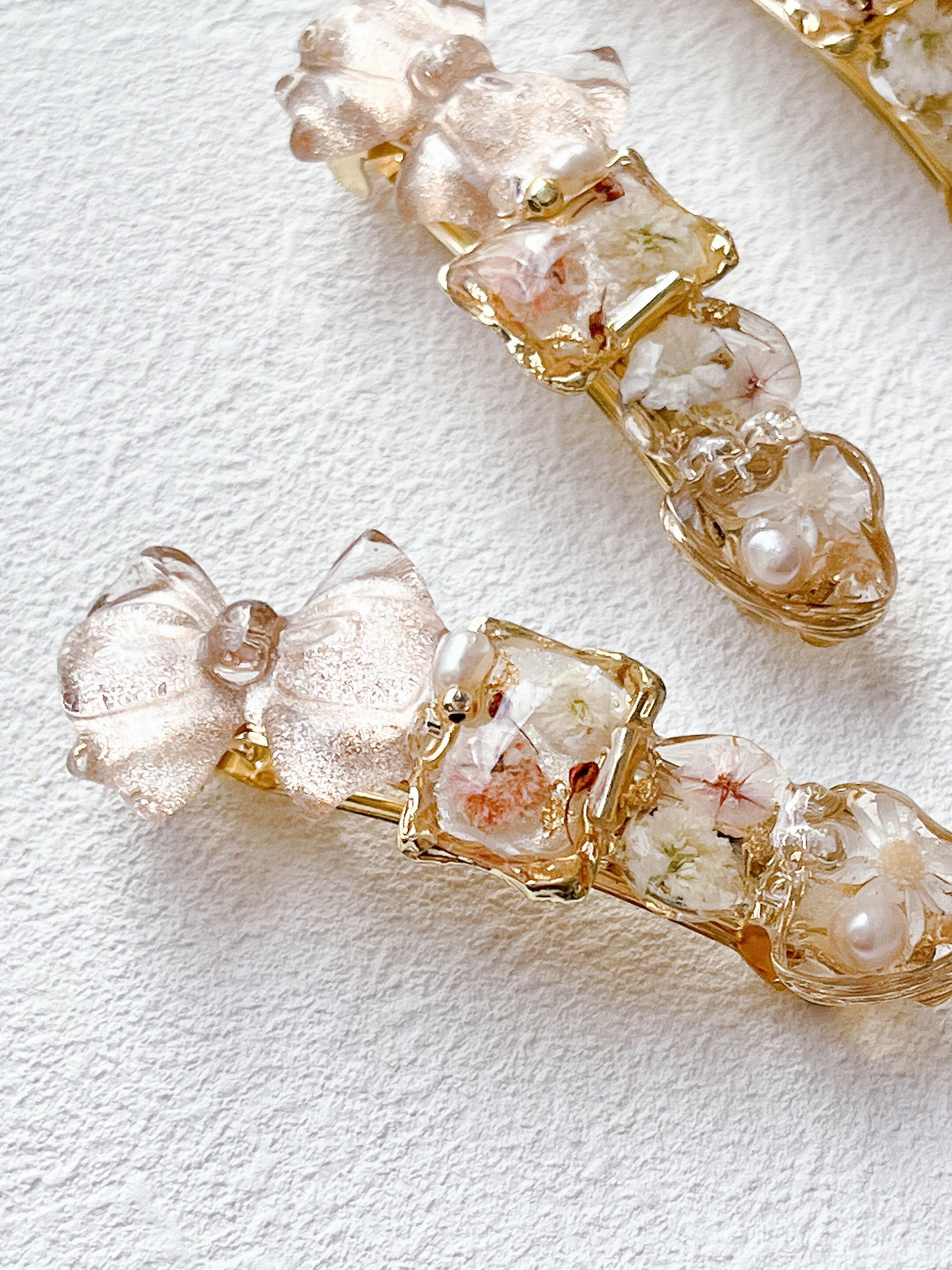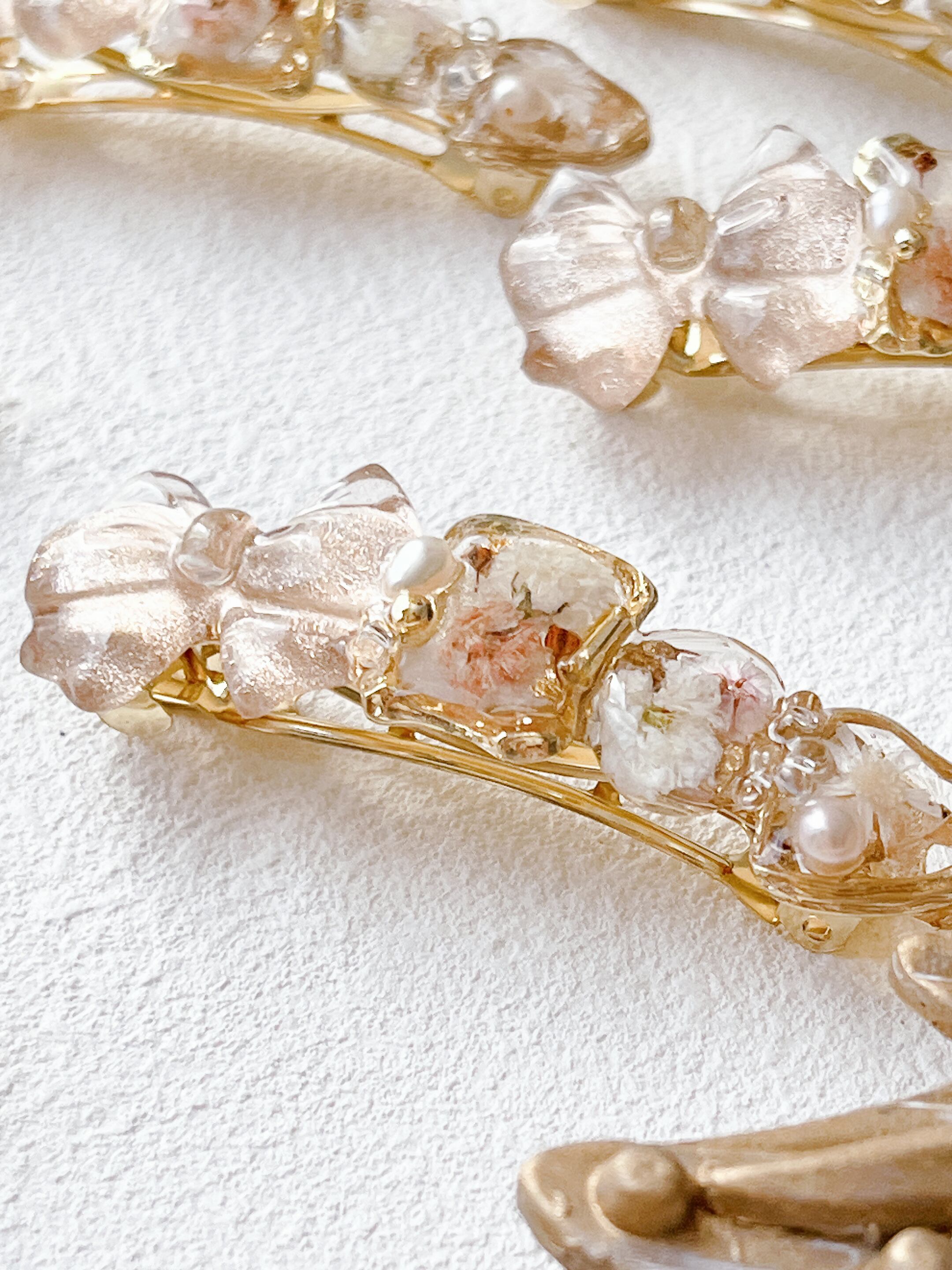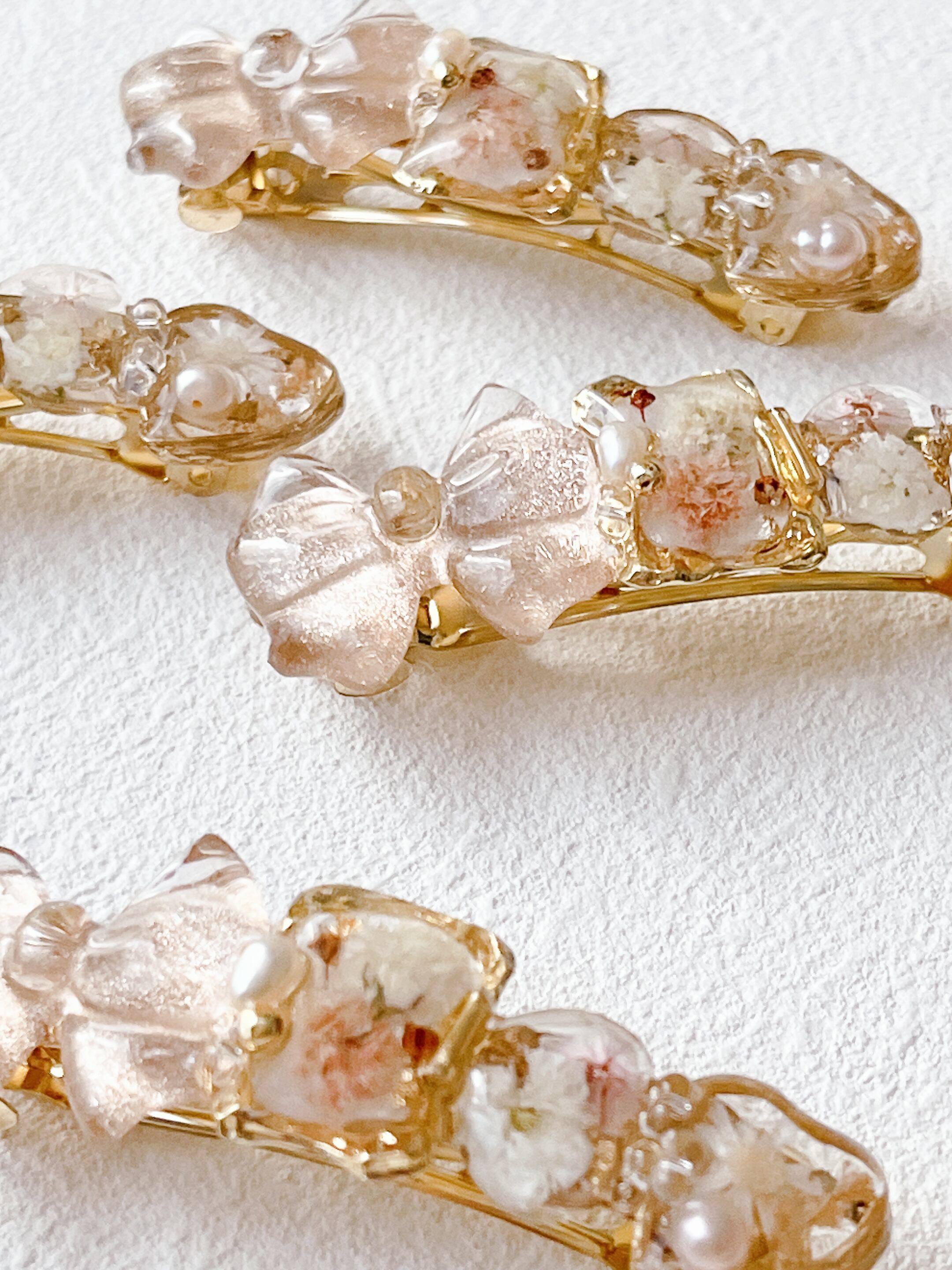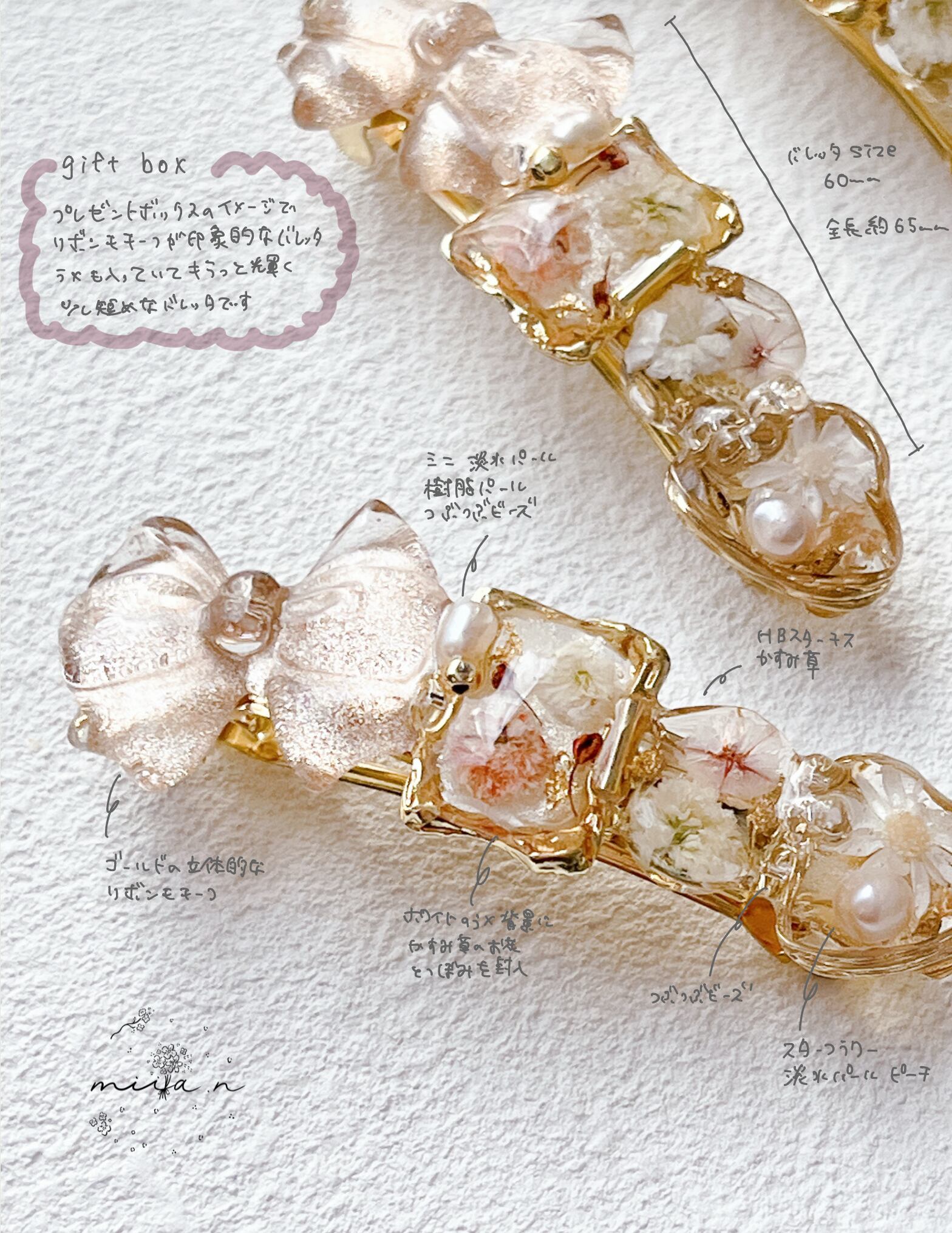 クリスマスのプレゼントボックスをイメージしてふんわり優しい色味のドライフラワーと淡水パールをぎゅっと閉じ込めた少し短めのバレッタです。
