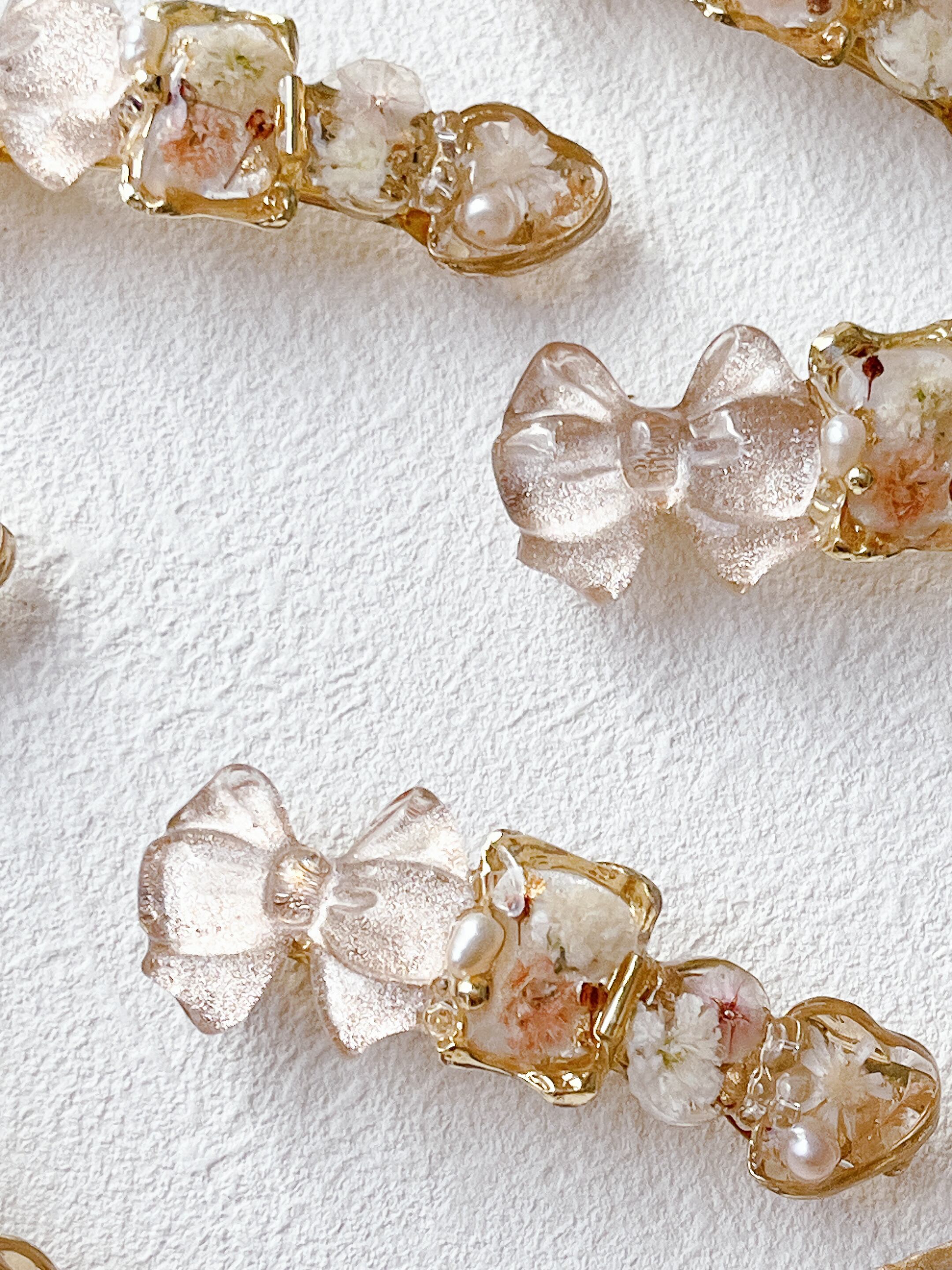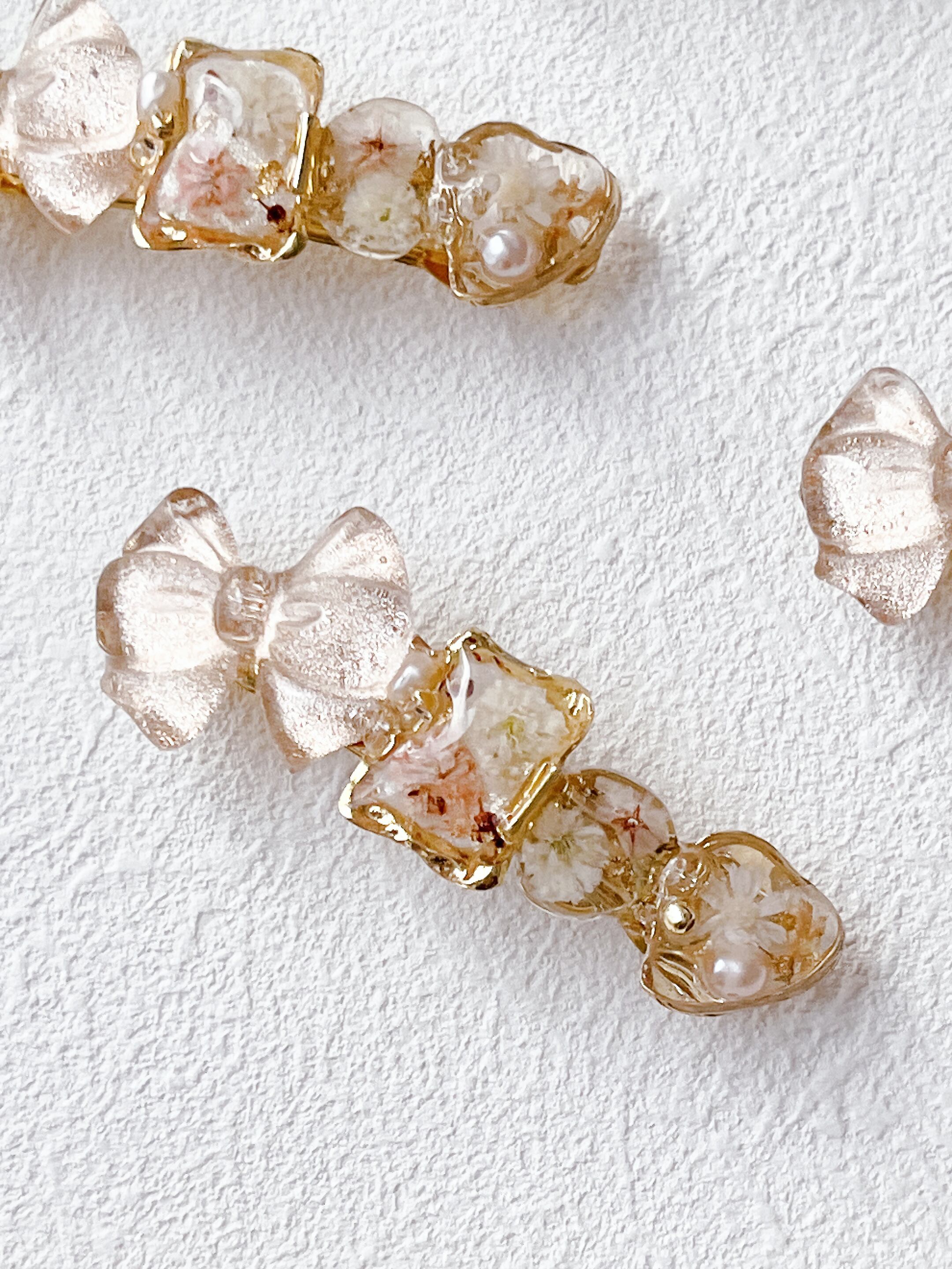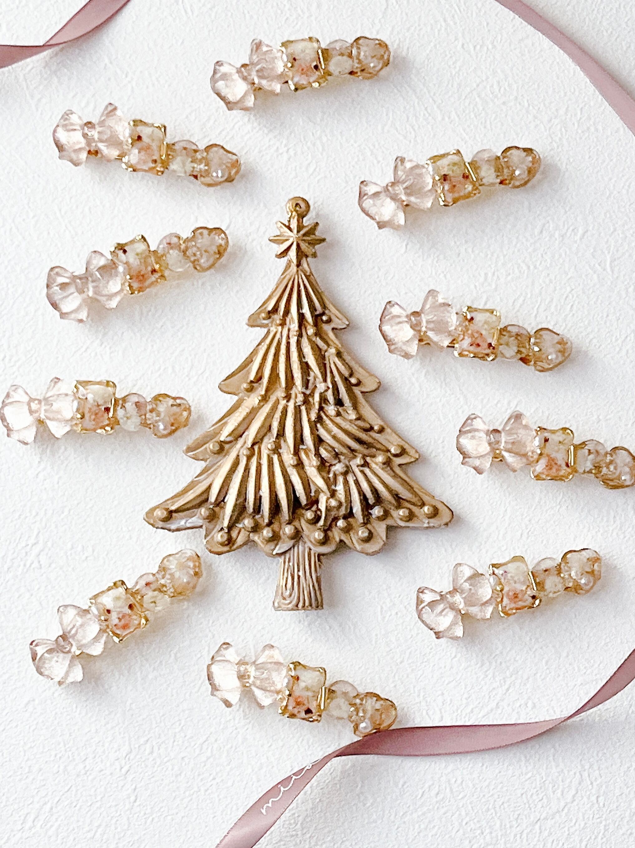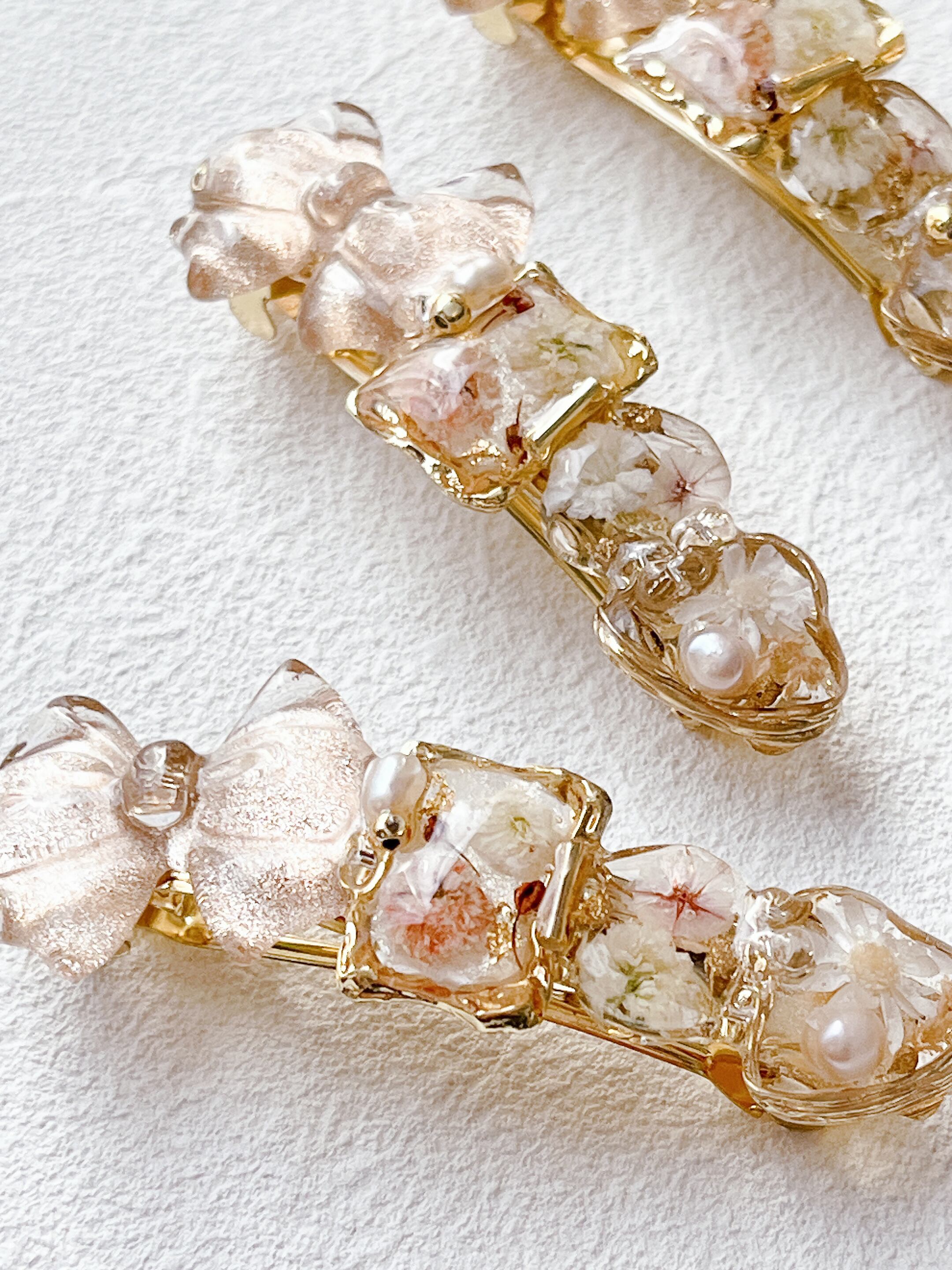 クリスマスのプレゼントボックスをイメージしてふんわり優しい色味のドライフラワーと淡水パールをぎゅっと閉じ込めた少し短めのバレッタです。