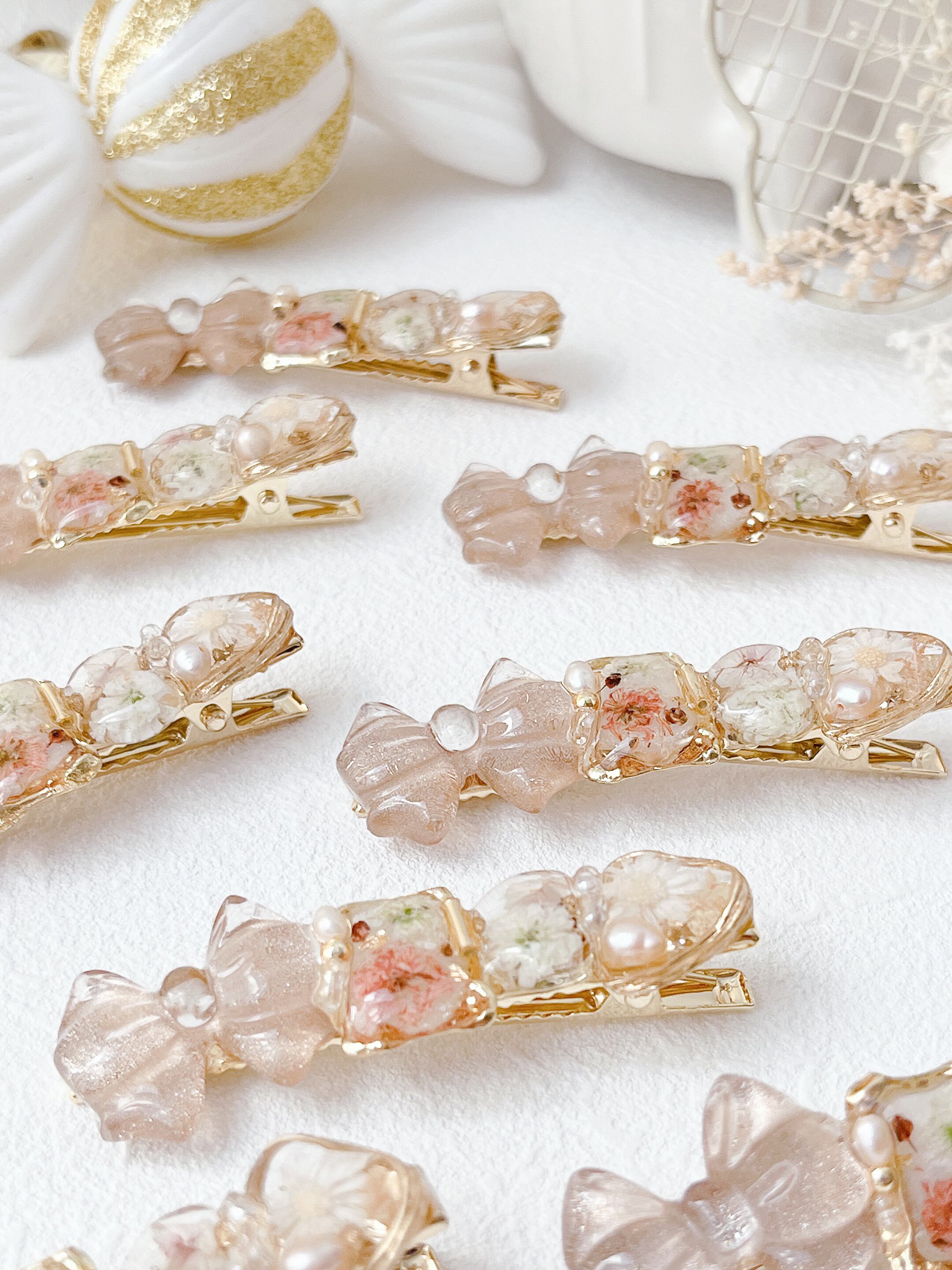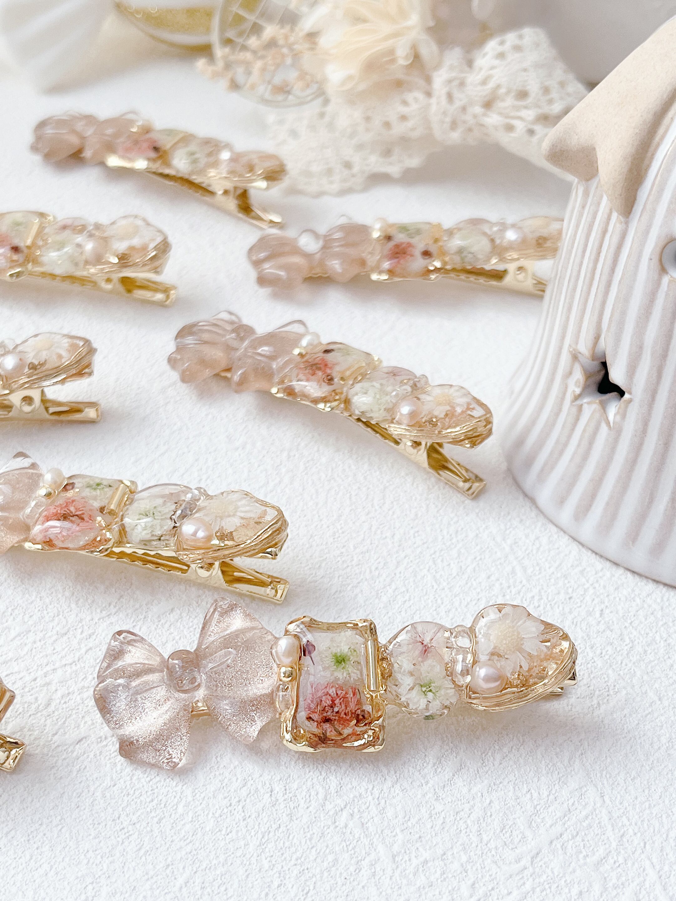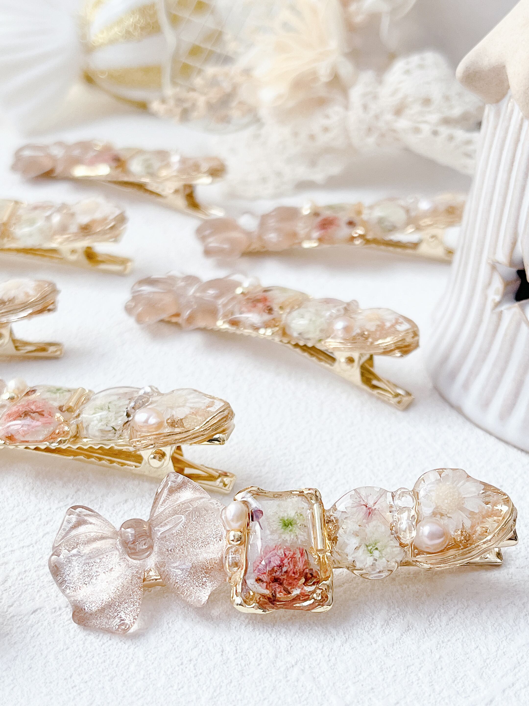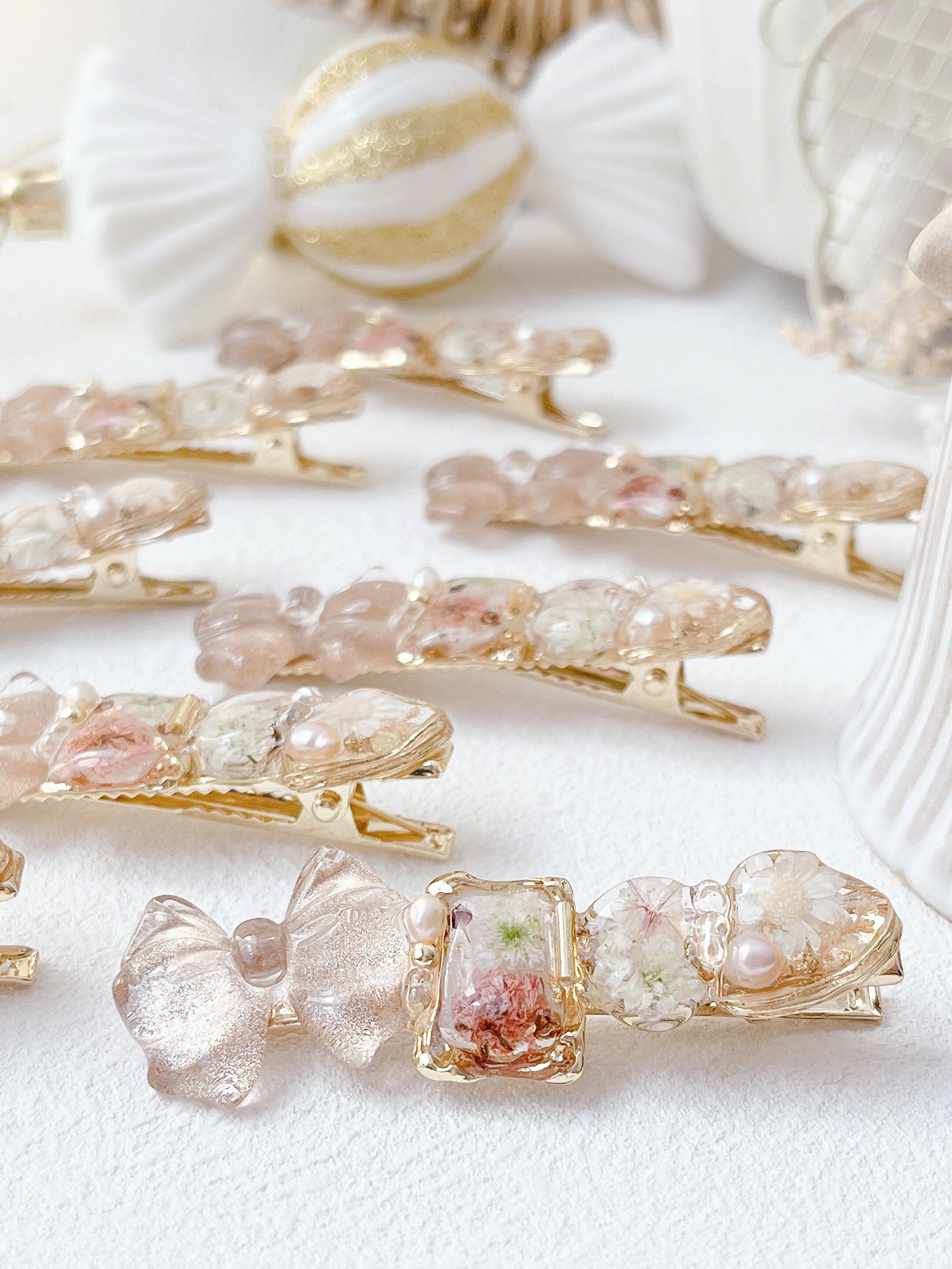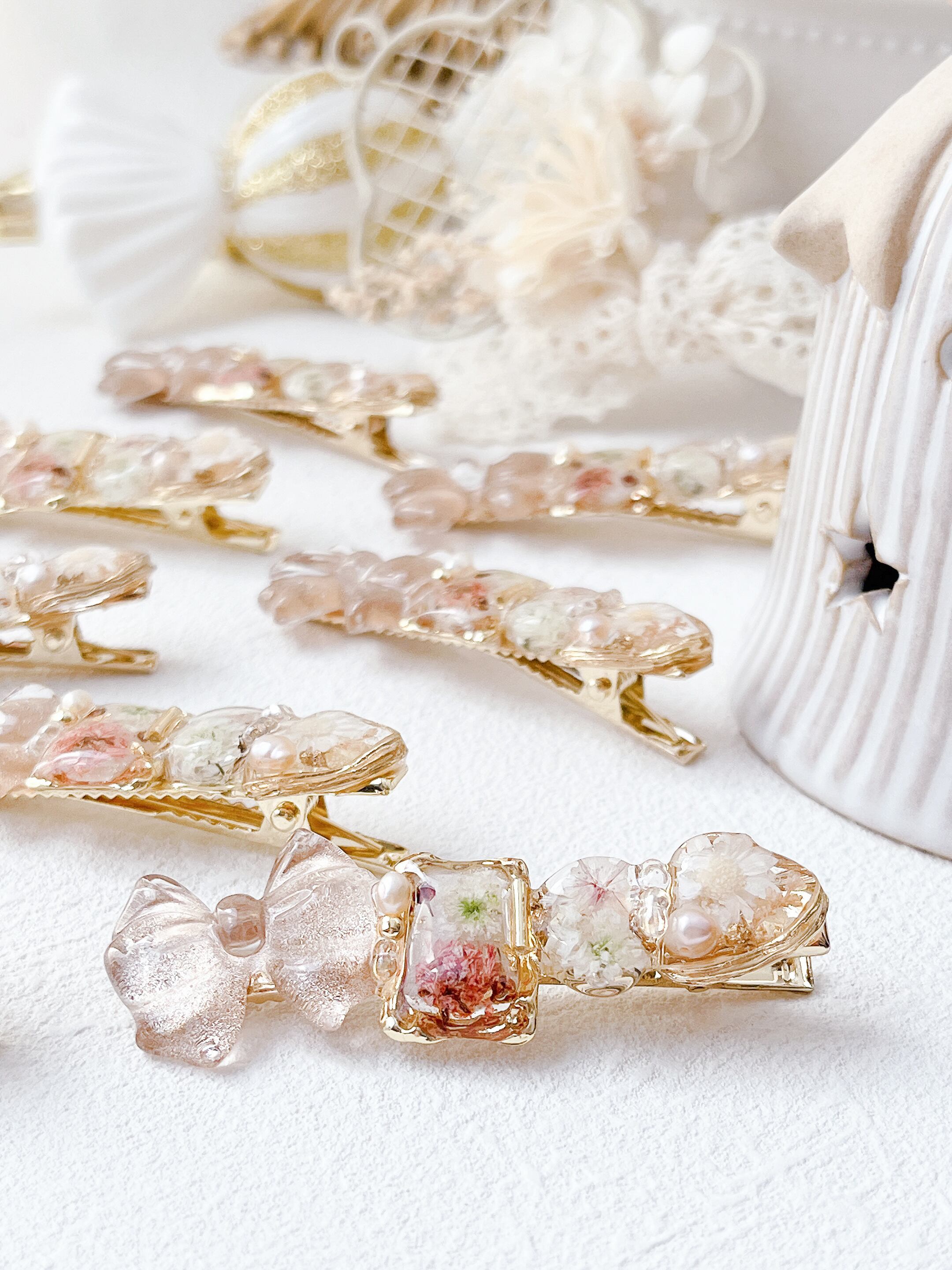クリスマスのプレゼントボックスをイメージしてふんわり優しい色味のドライフラワーと淡水パールをぎゅっと閉じ込めた少し短めのバレッタです。