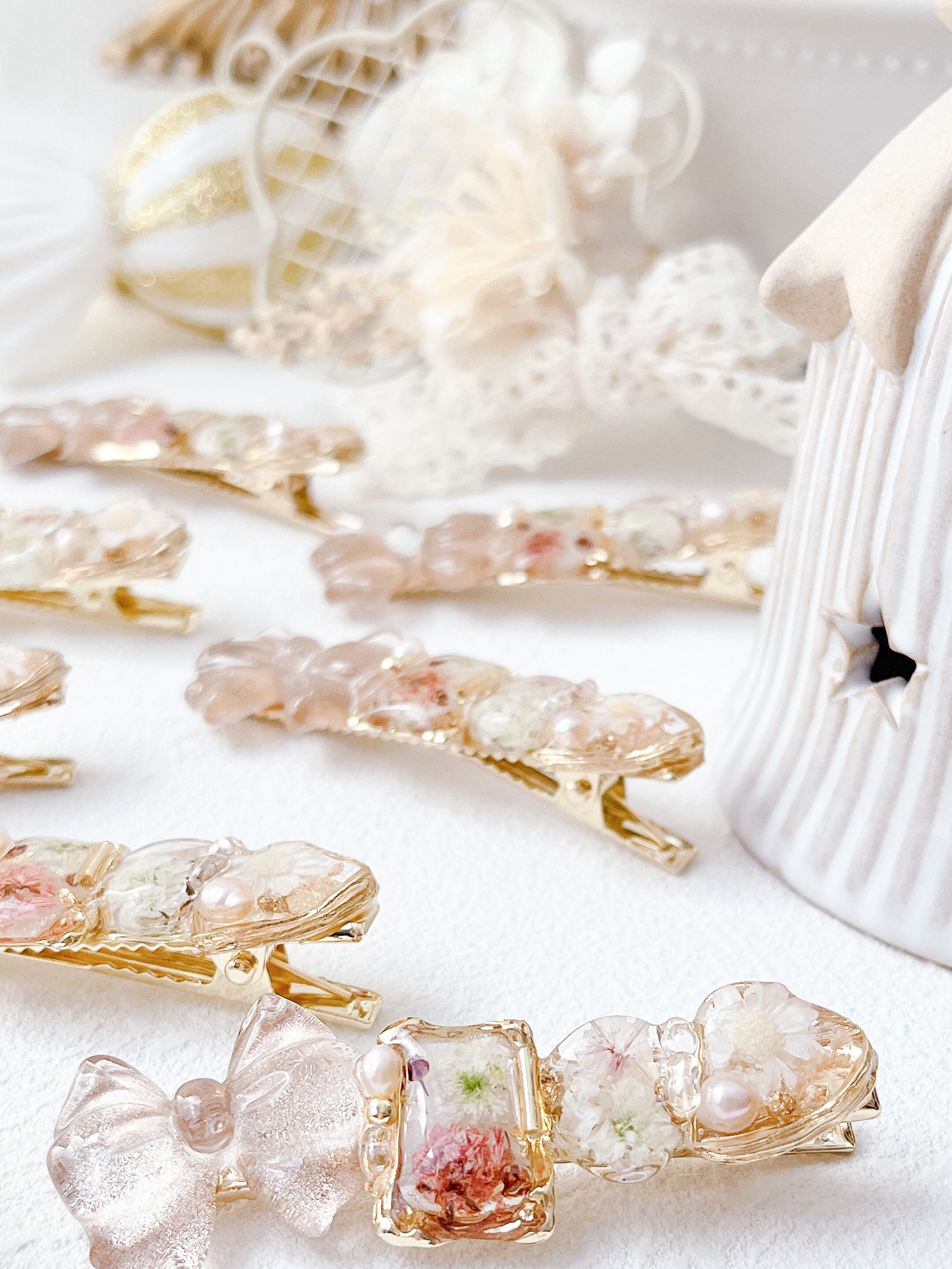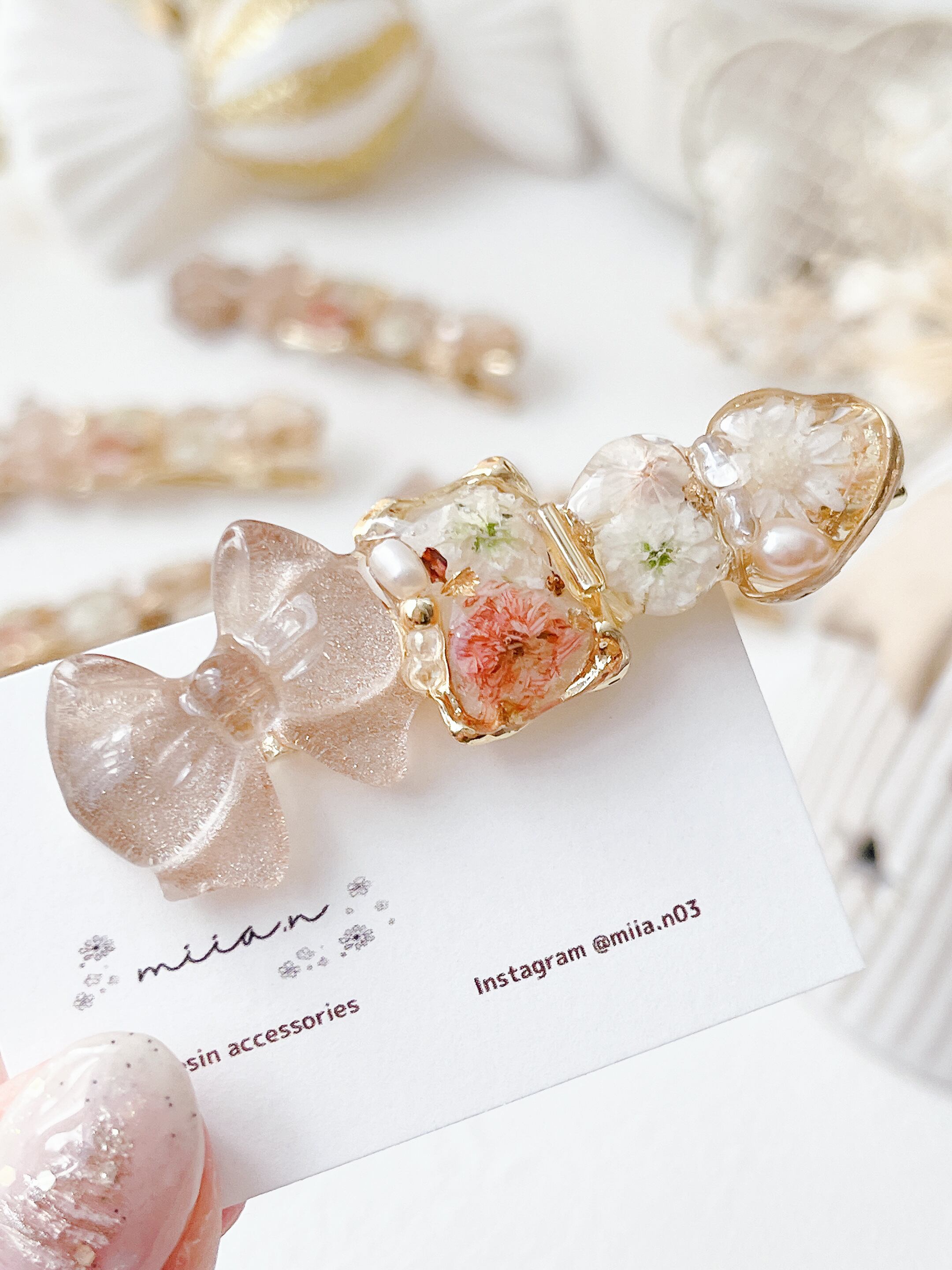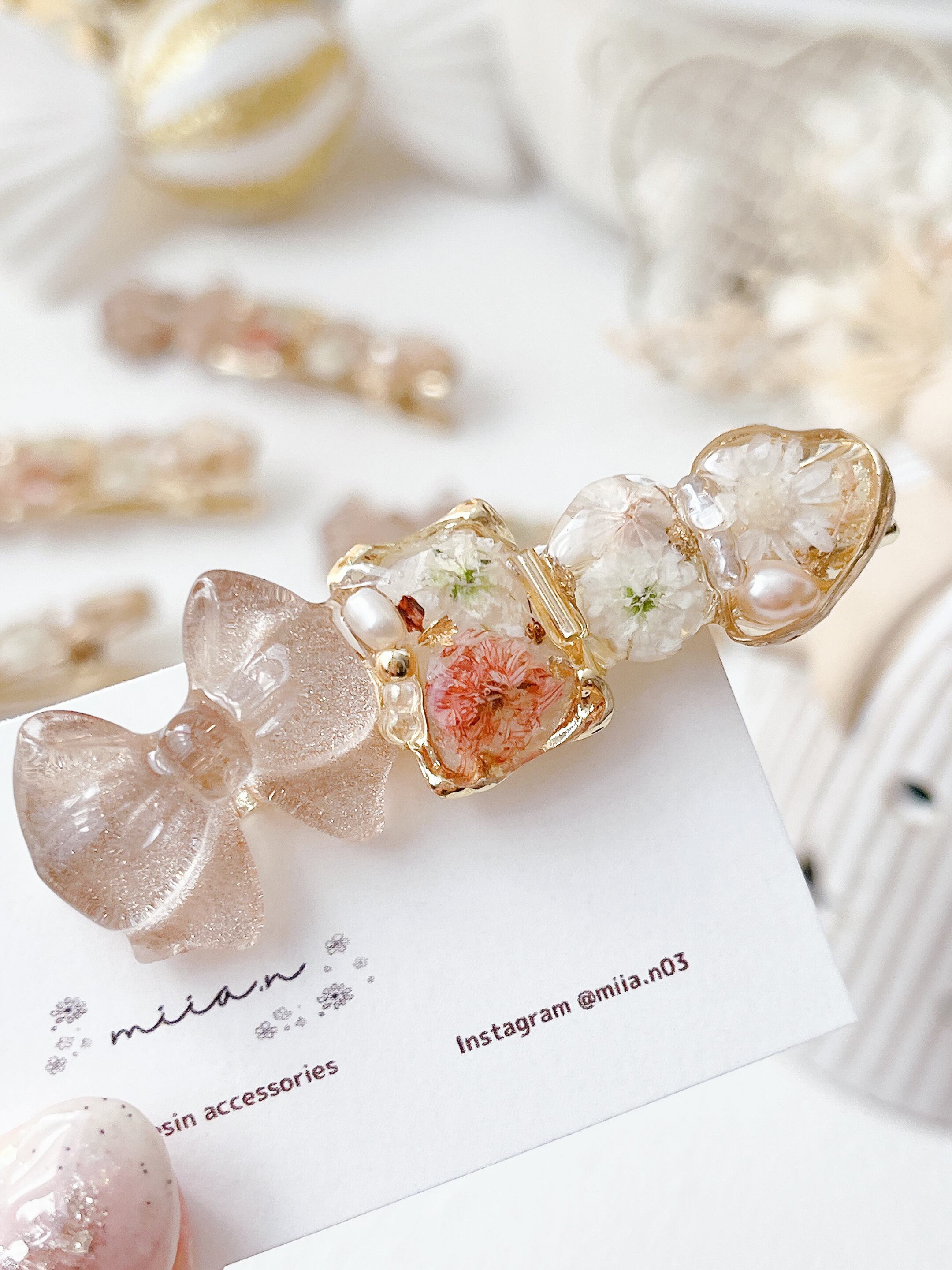 今まで作ってきたバレッタより少し小ぶりなのでがっつり髪を留めるというよりヘアアレンジにプラスアイテムとして添えるのがおすすめ。