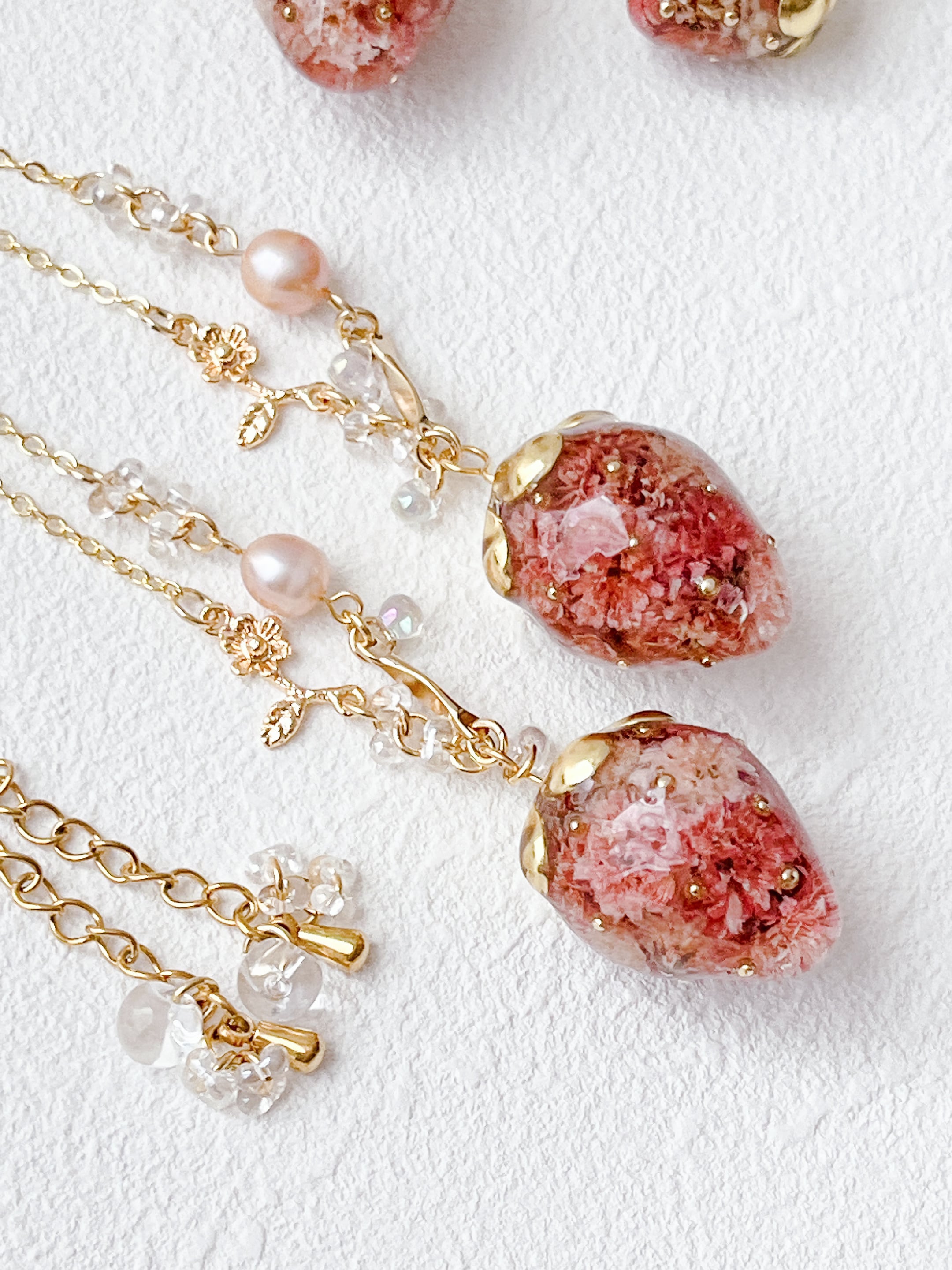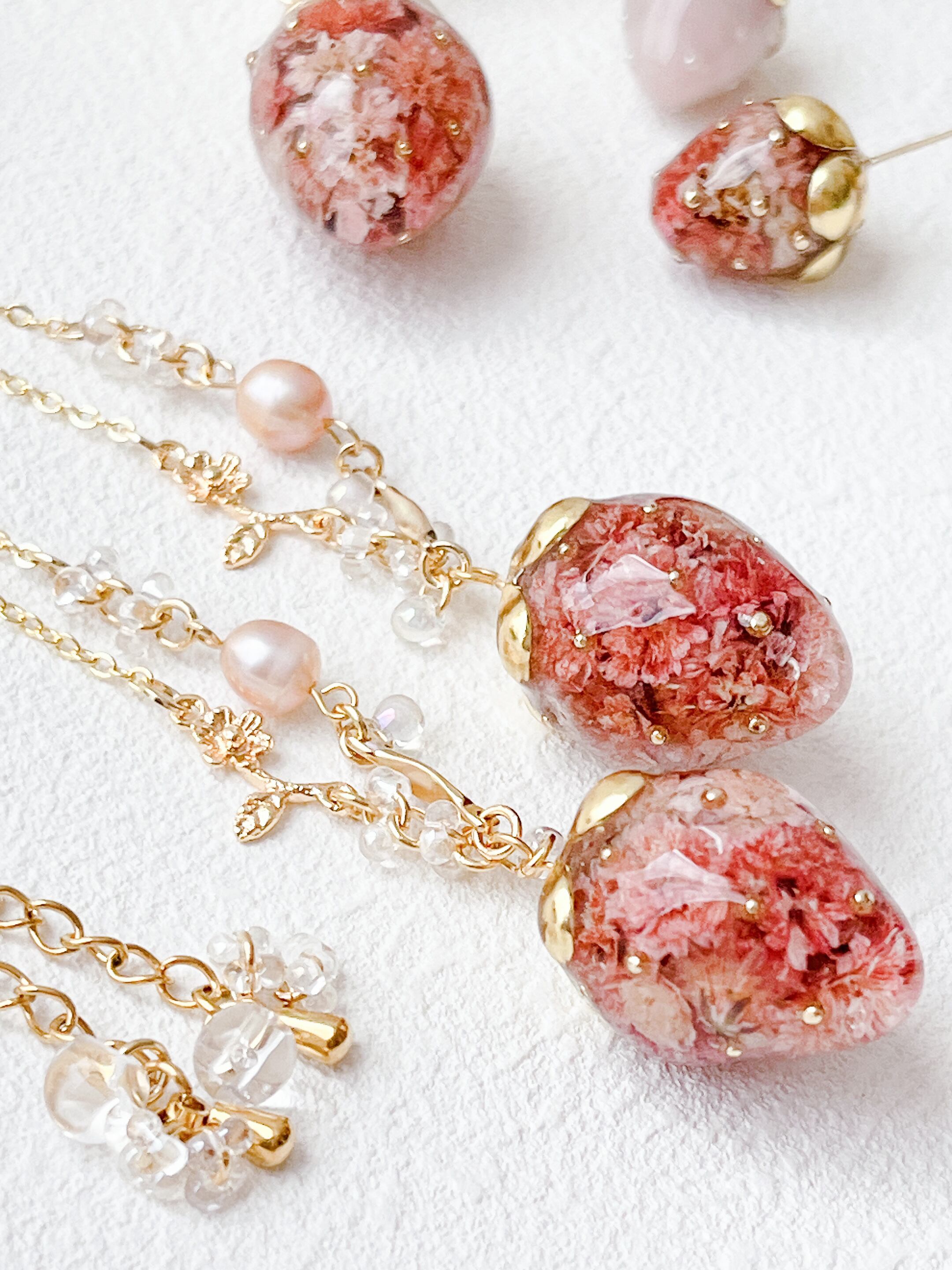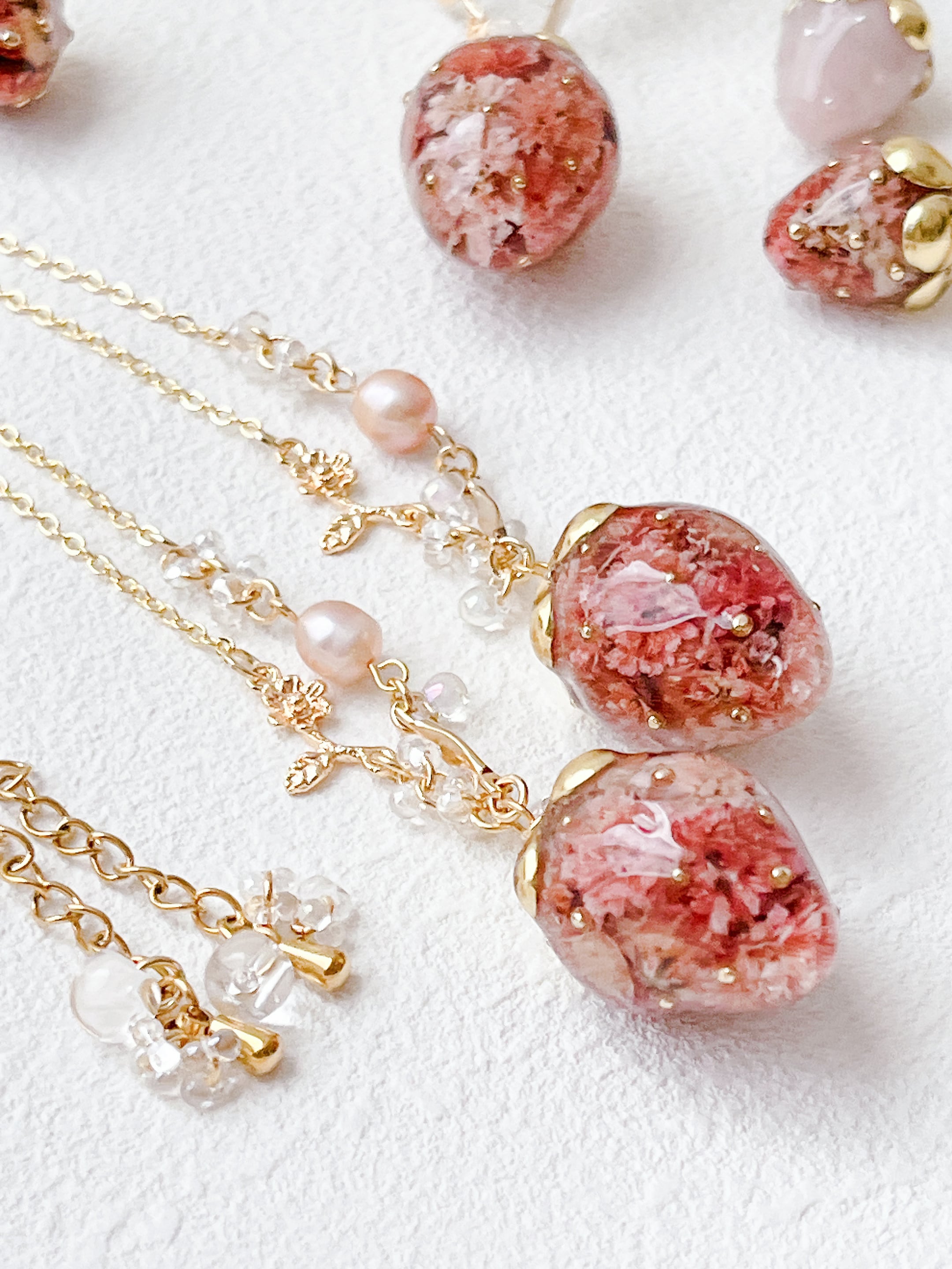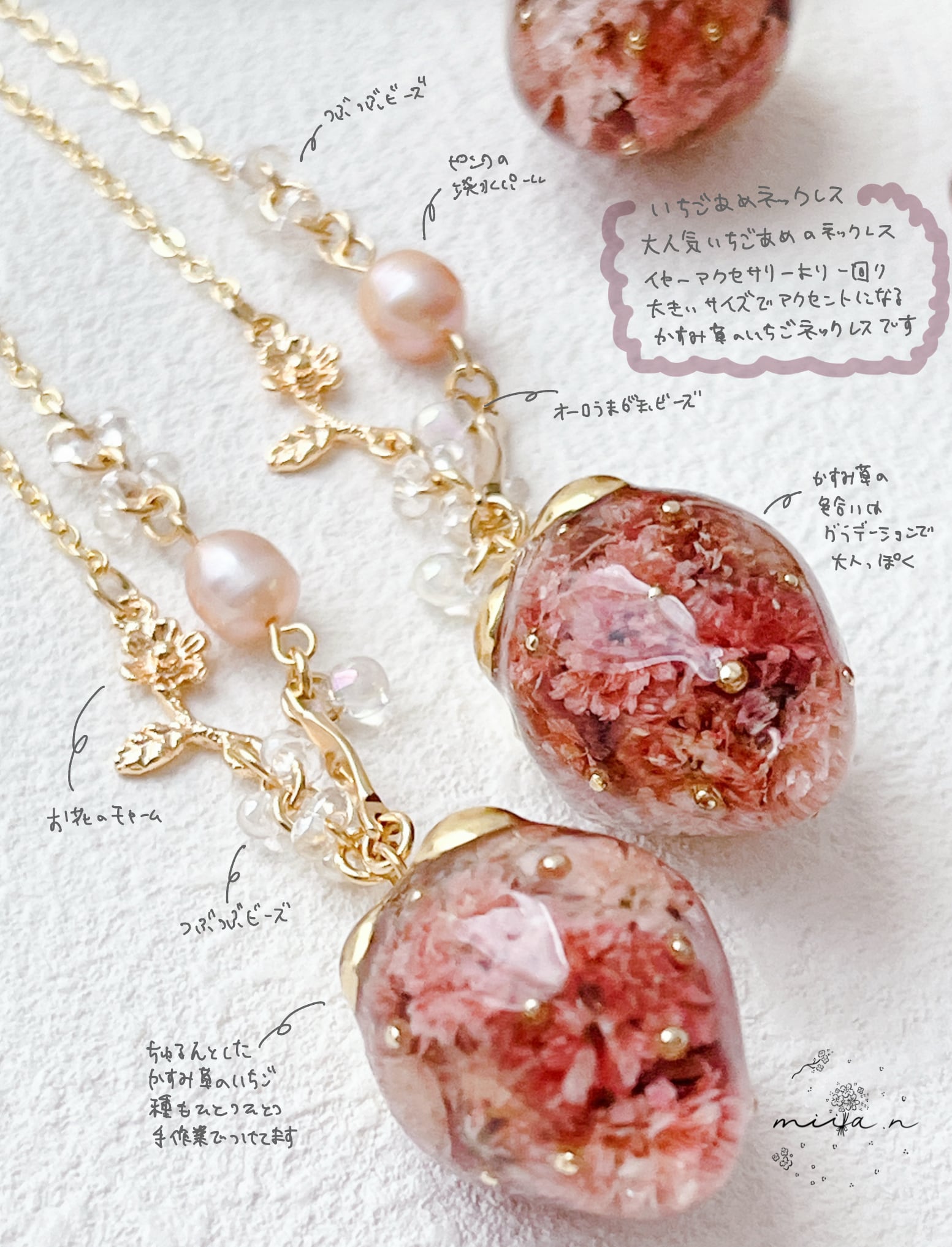繊細なかすみ草をグラデーションになるように封入して大人も身につけやすいいちごのネックレスにしています。