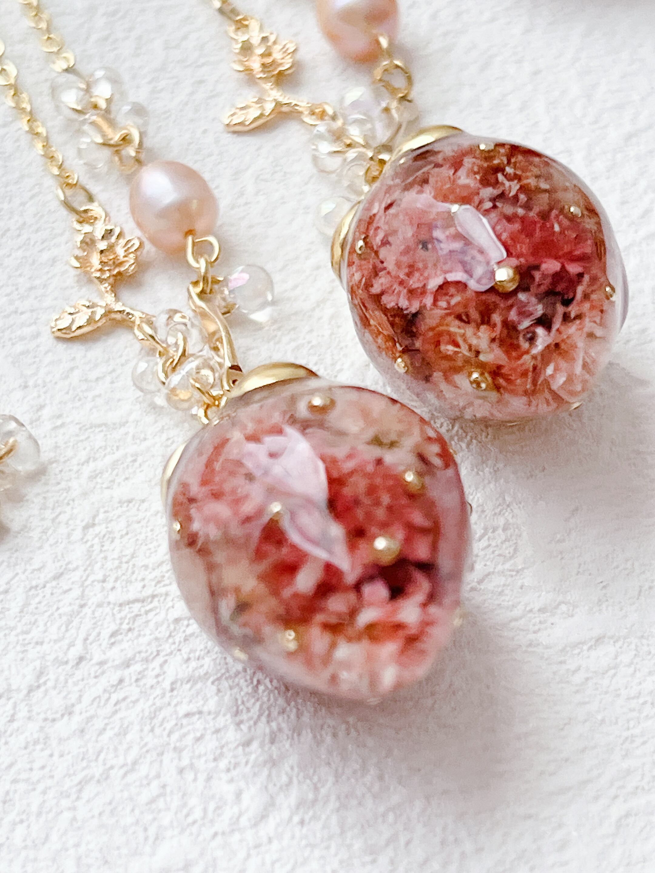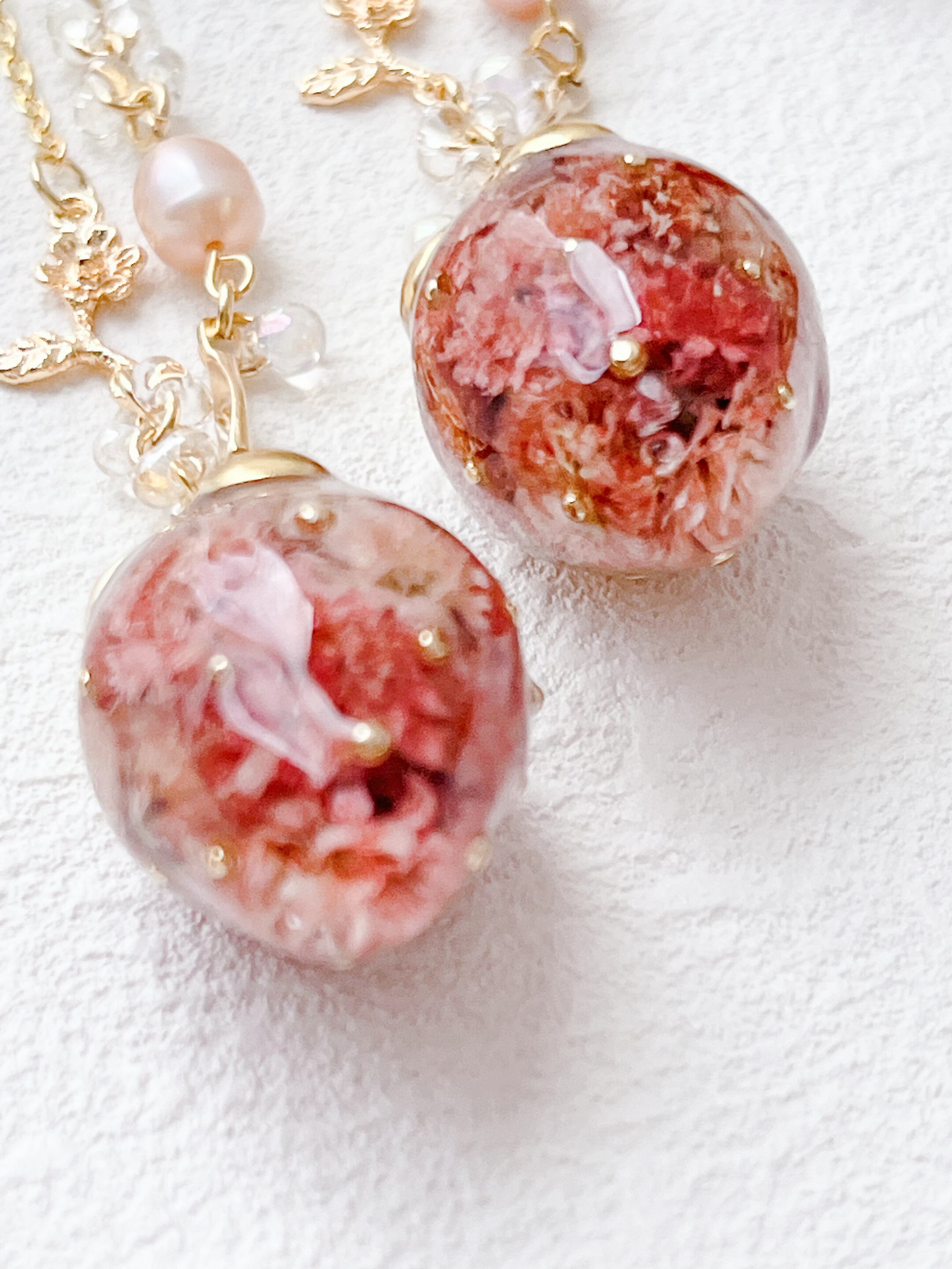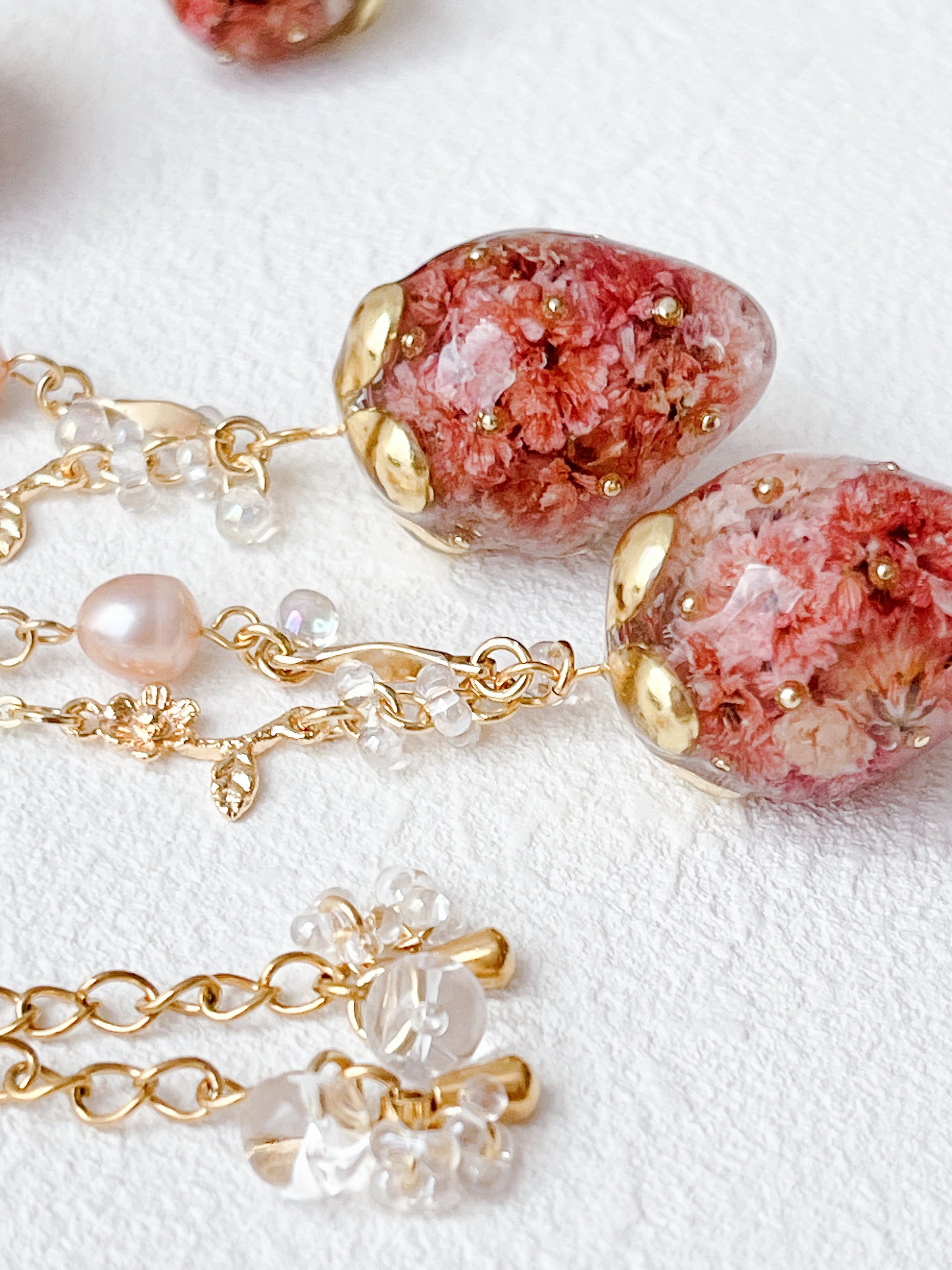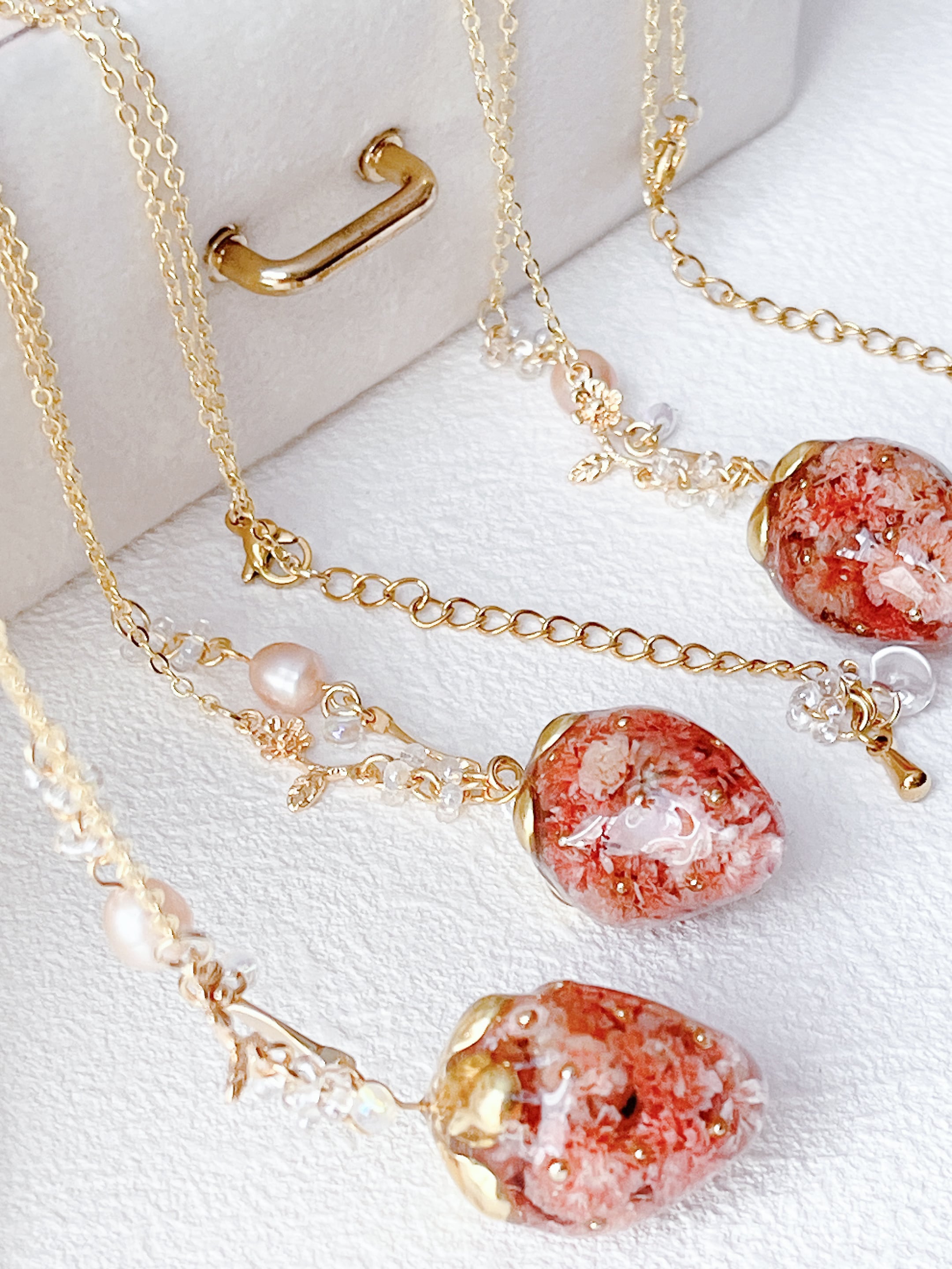 繊細なかすみ草をグラデーションになるように封入して大人も身につけやすいいちごのネックレスにしています。