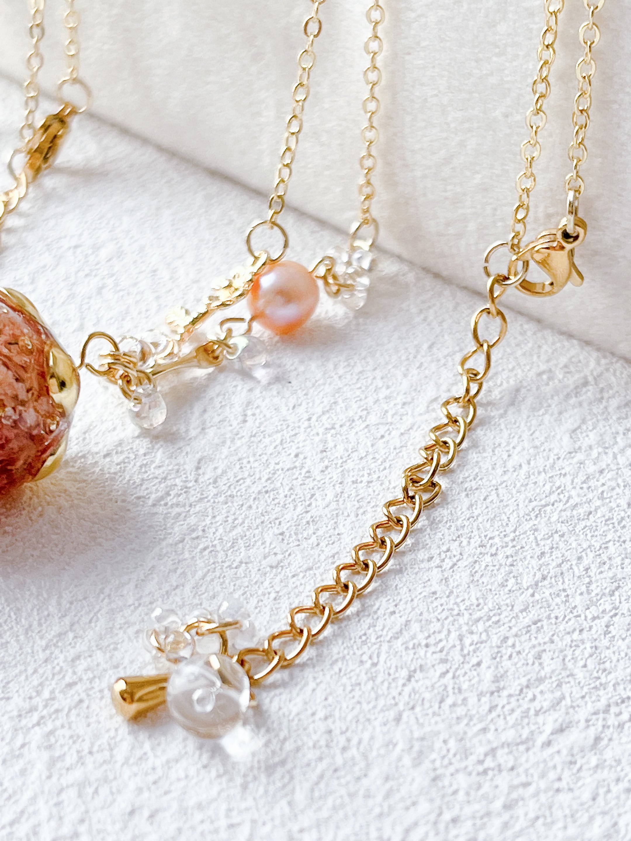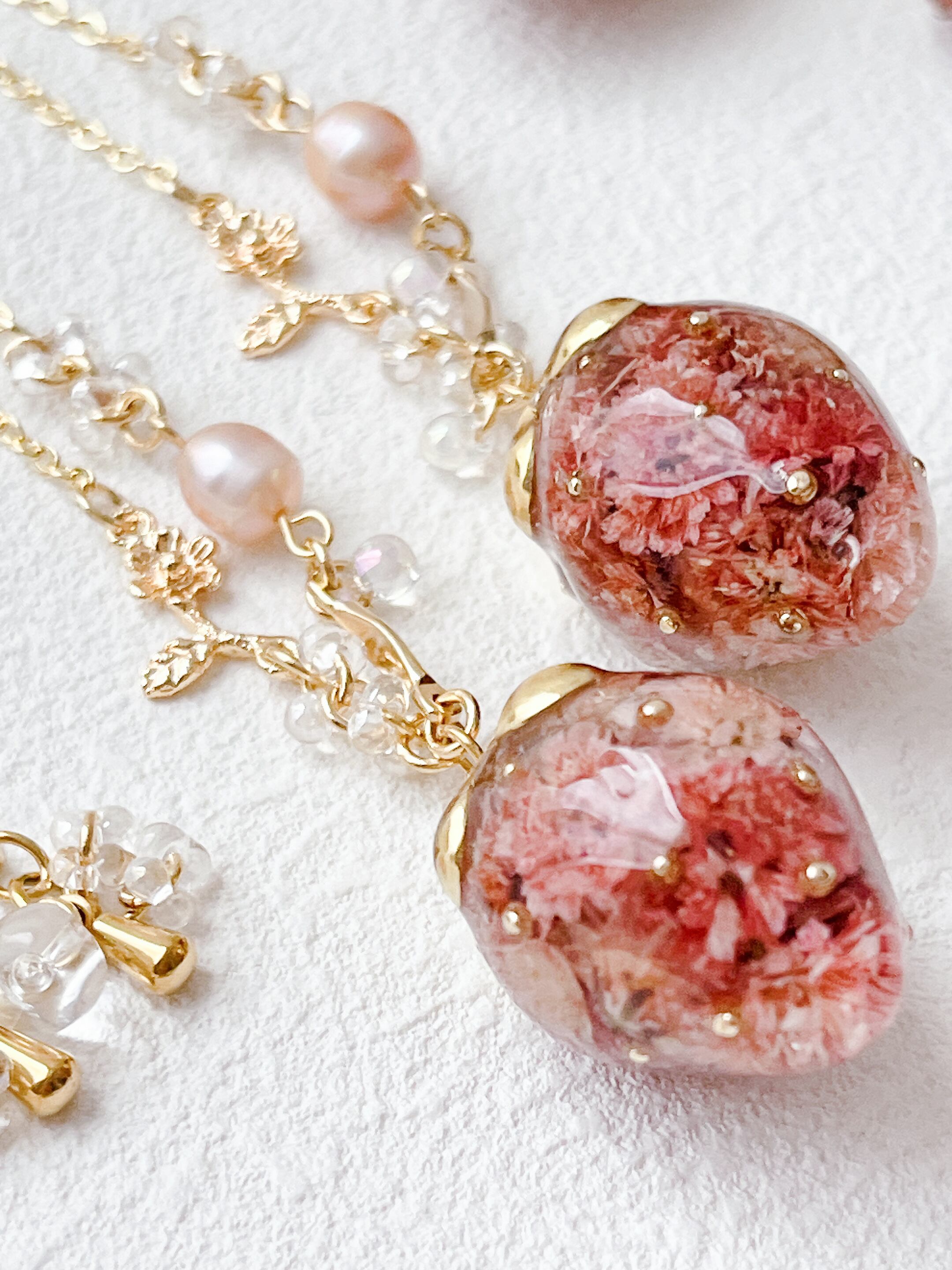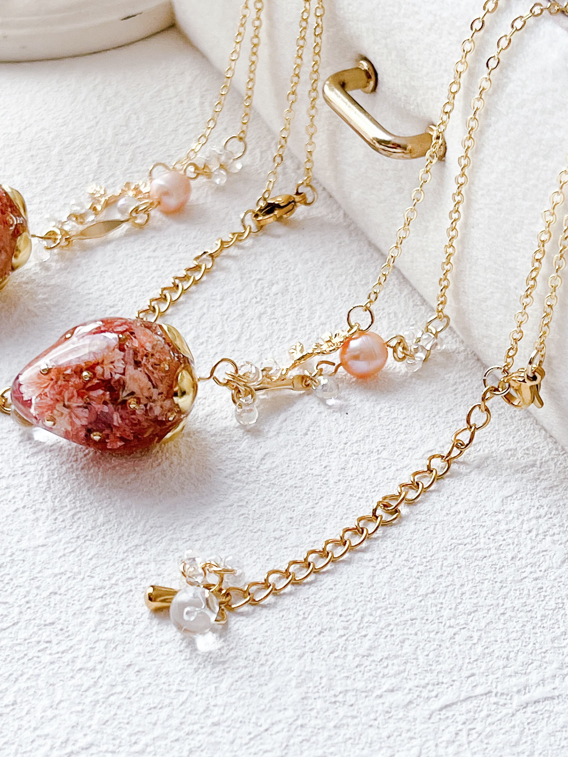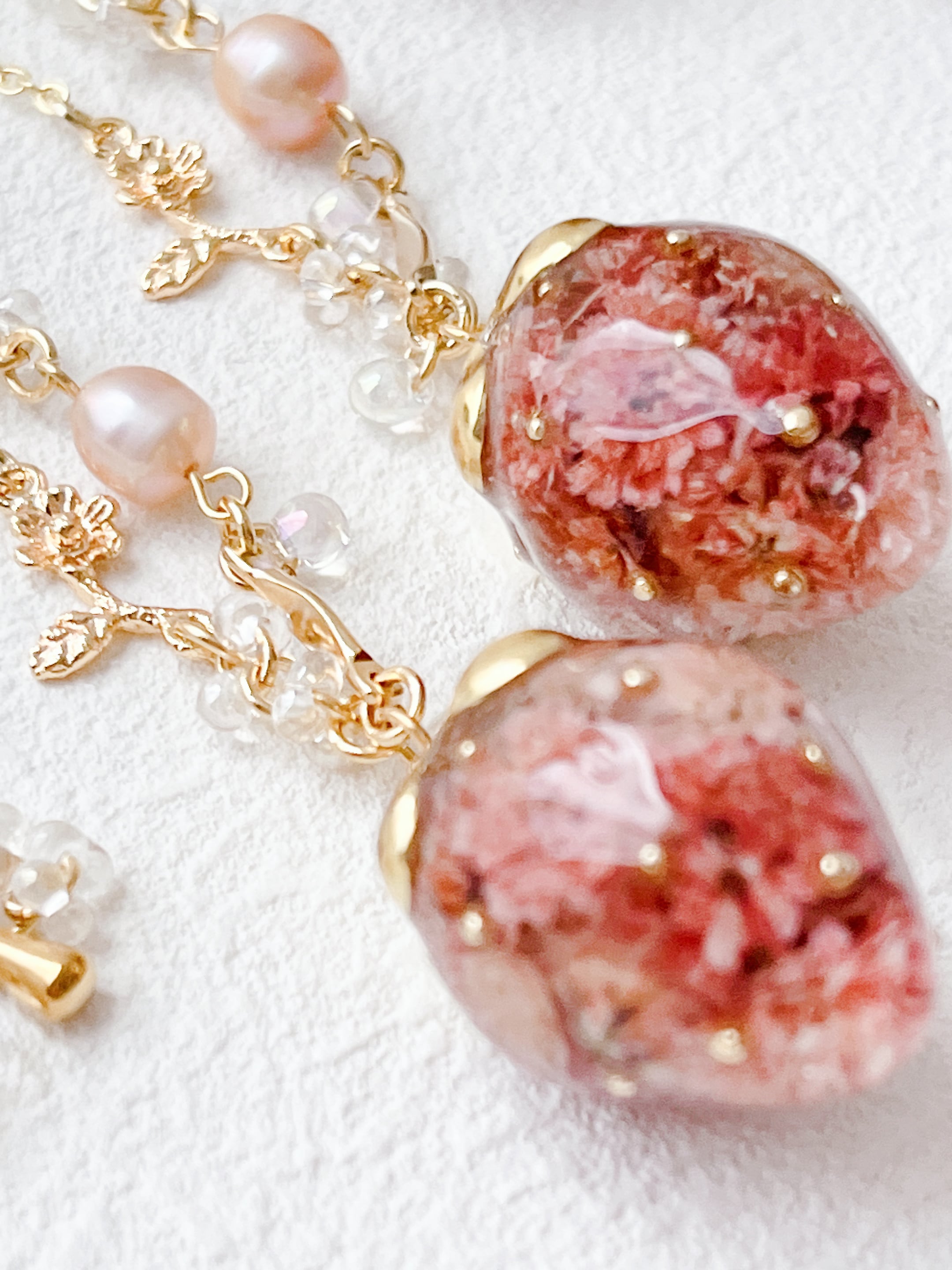 繊細なかすみ草をグラデーションになるように封入して大人も身につけやすいいちごのネックレスにしています。