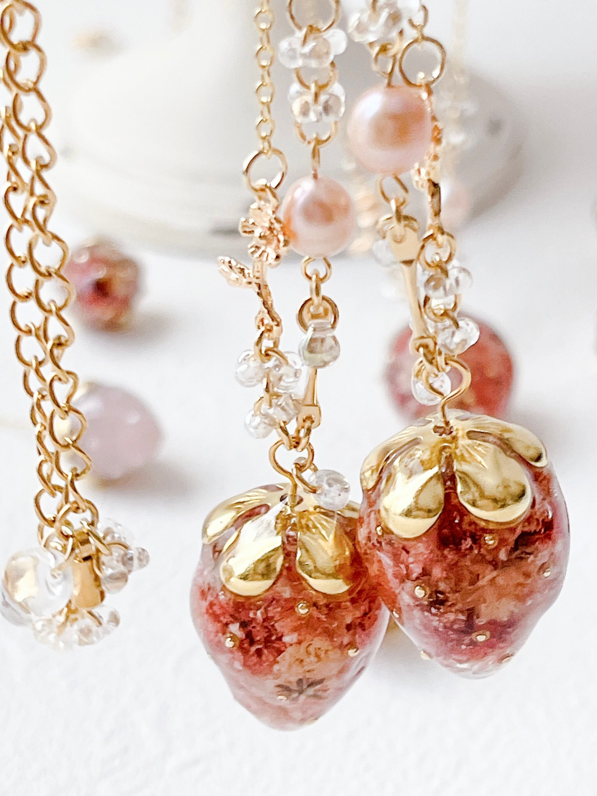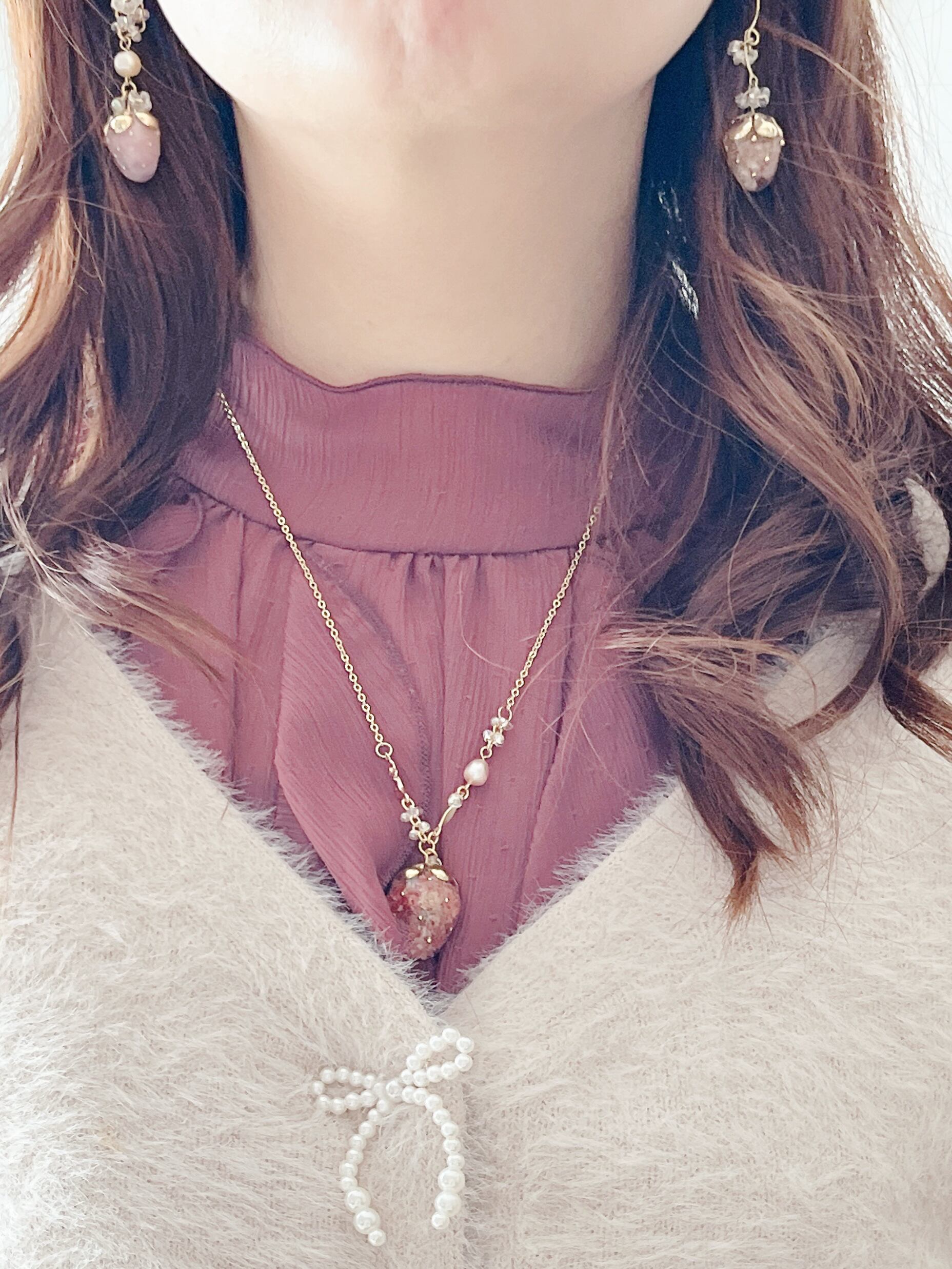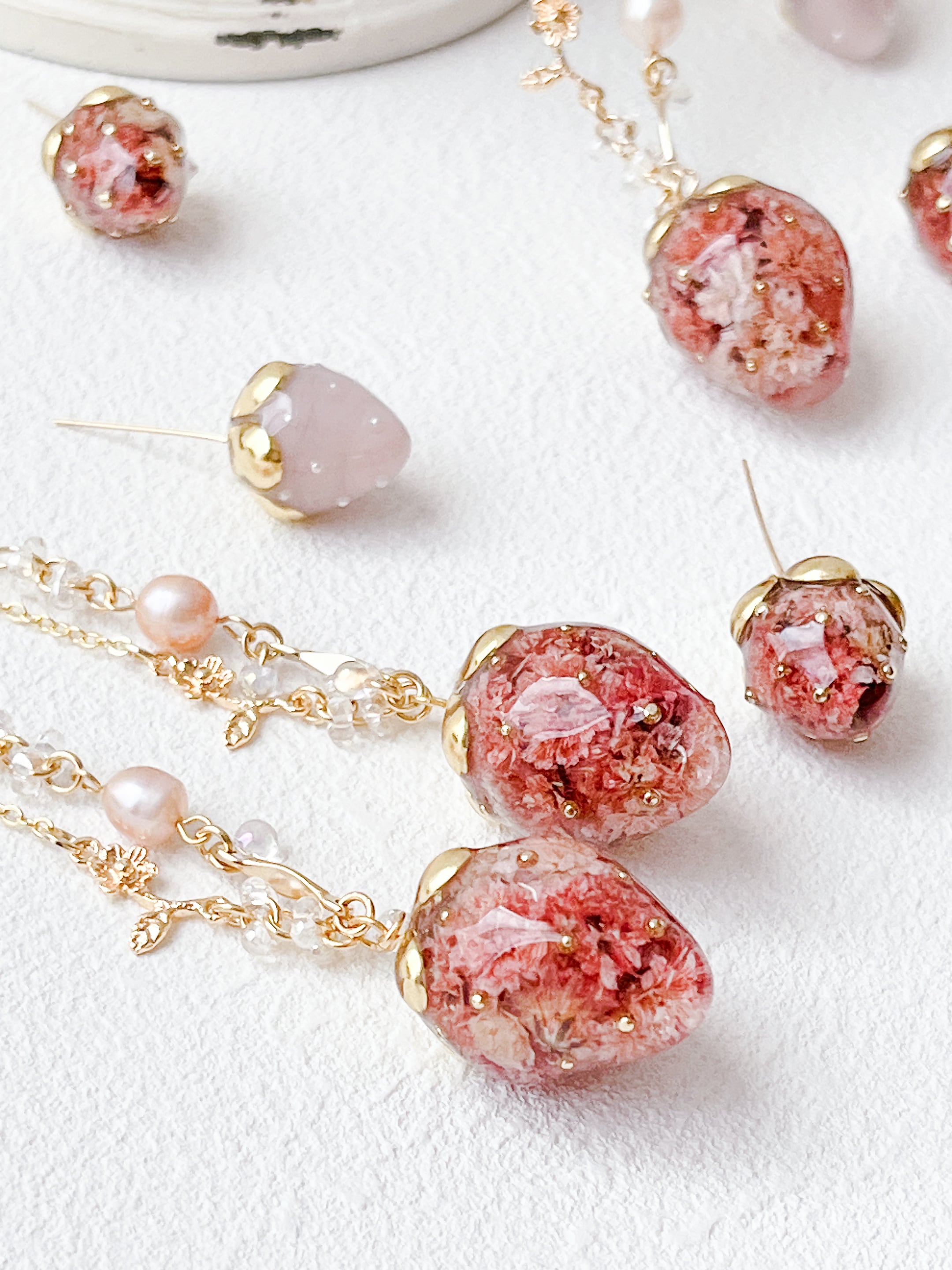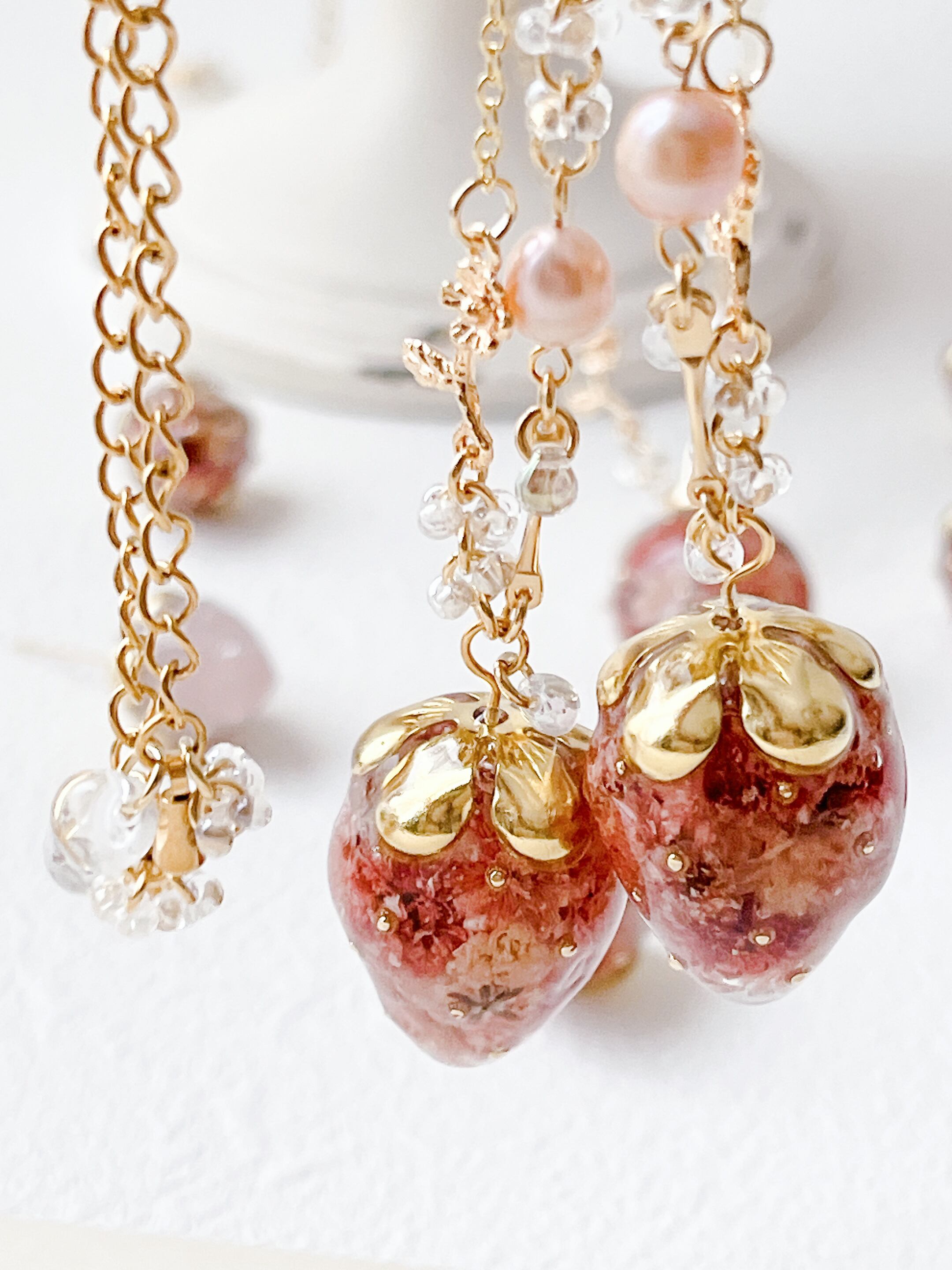 本物のかすみ草がたくさん詰まったころんとしたいちごはイヤーアクセサリーより一回り大きく胸元に来ても目立つようにしました。
