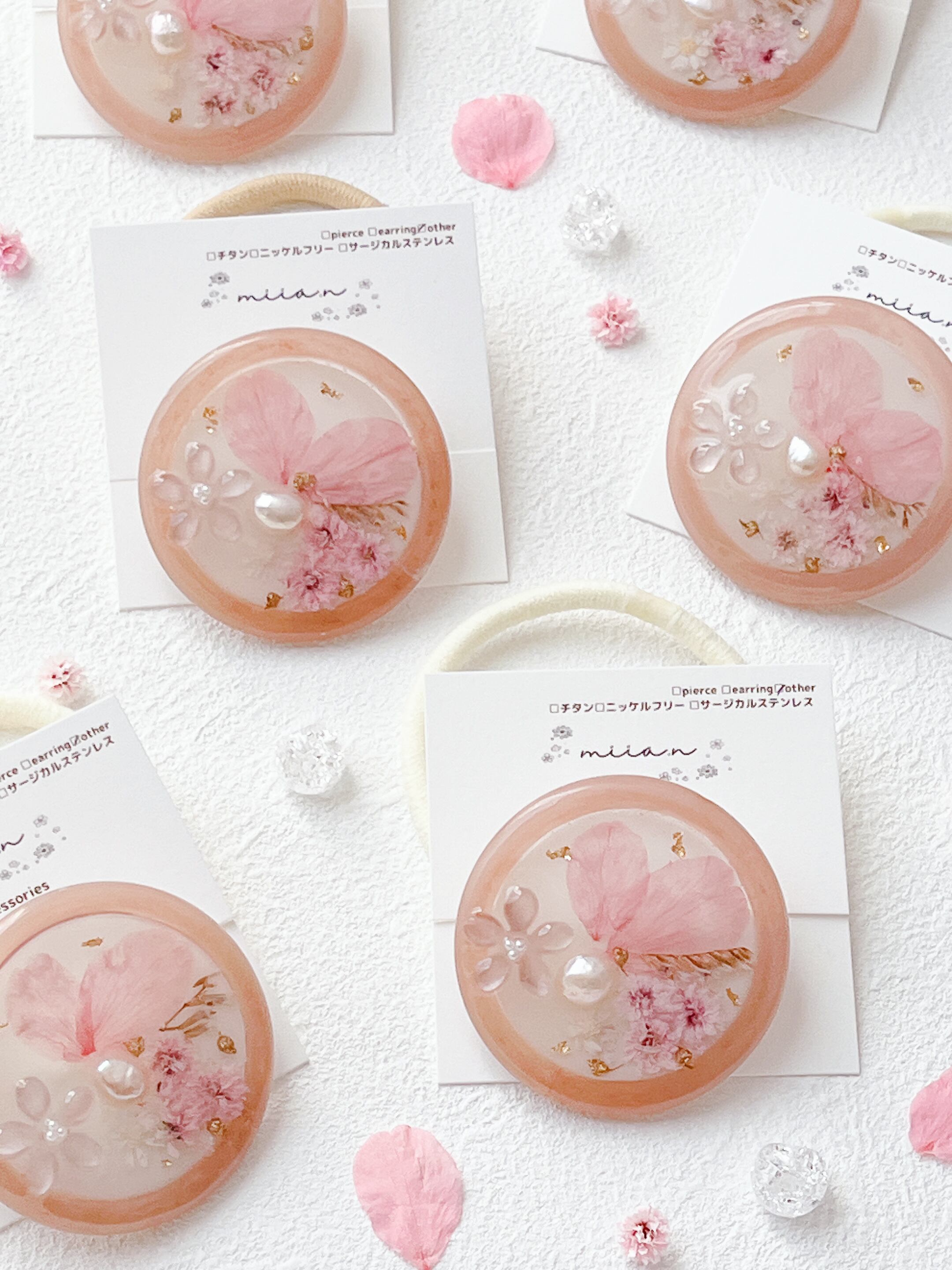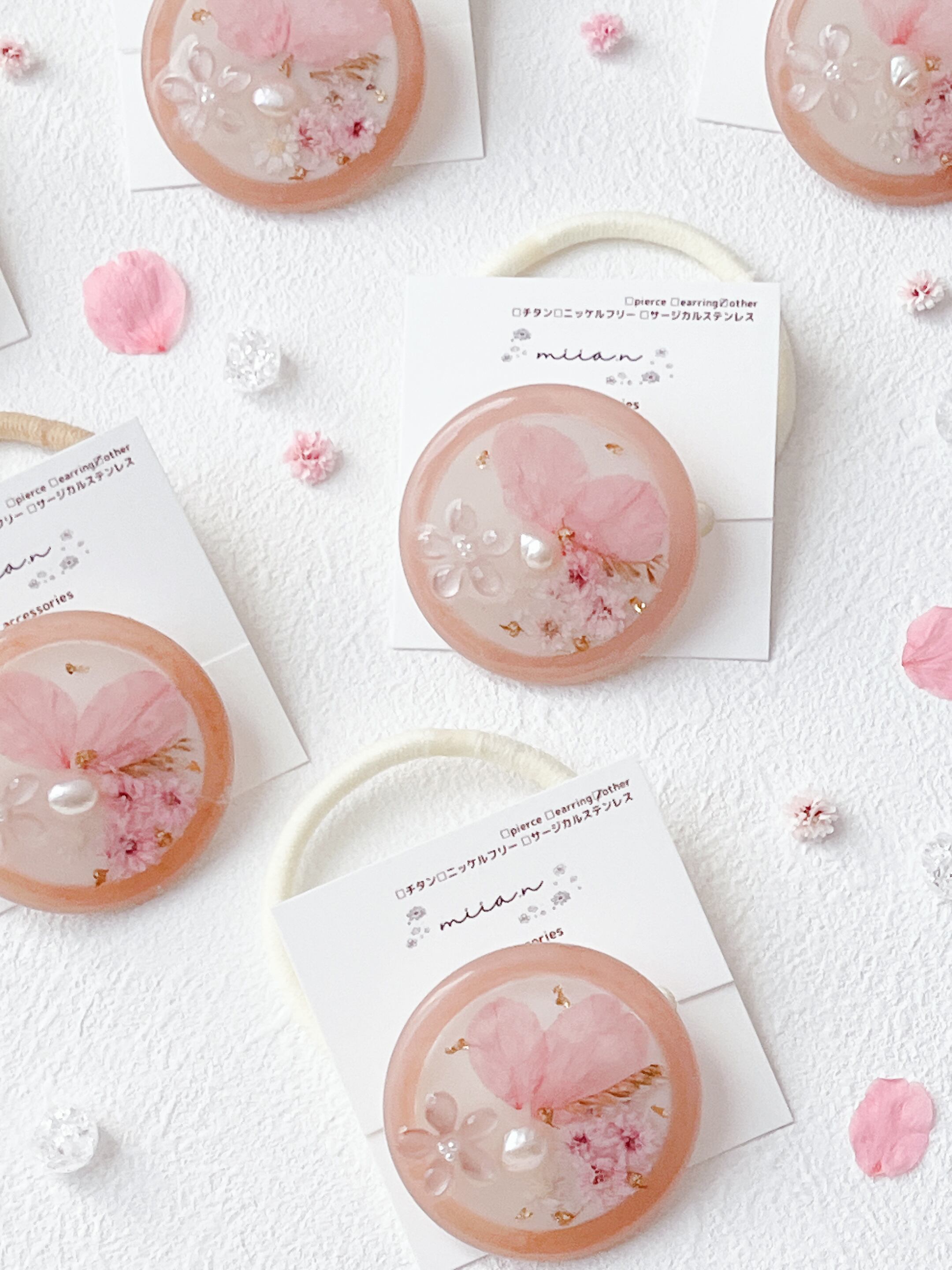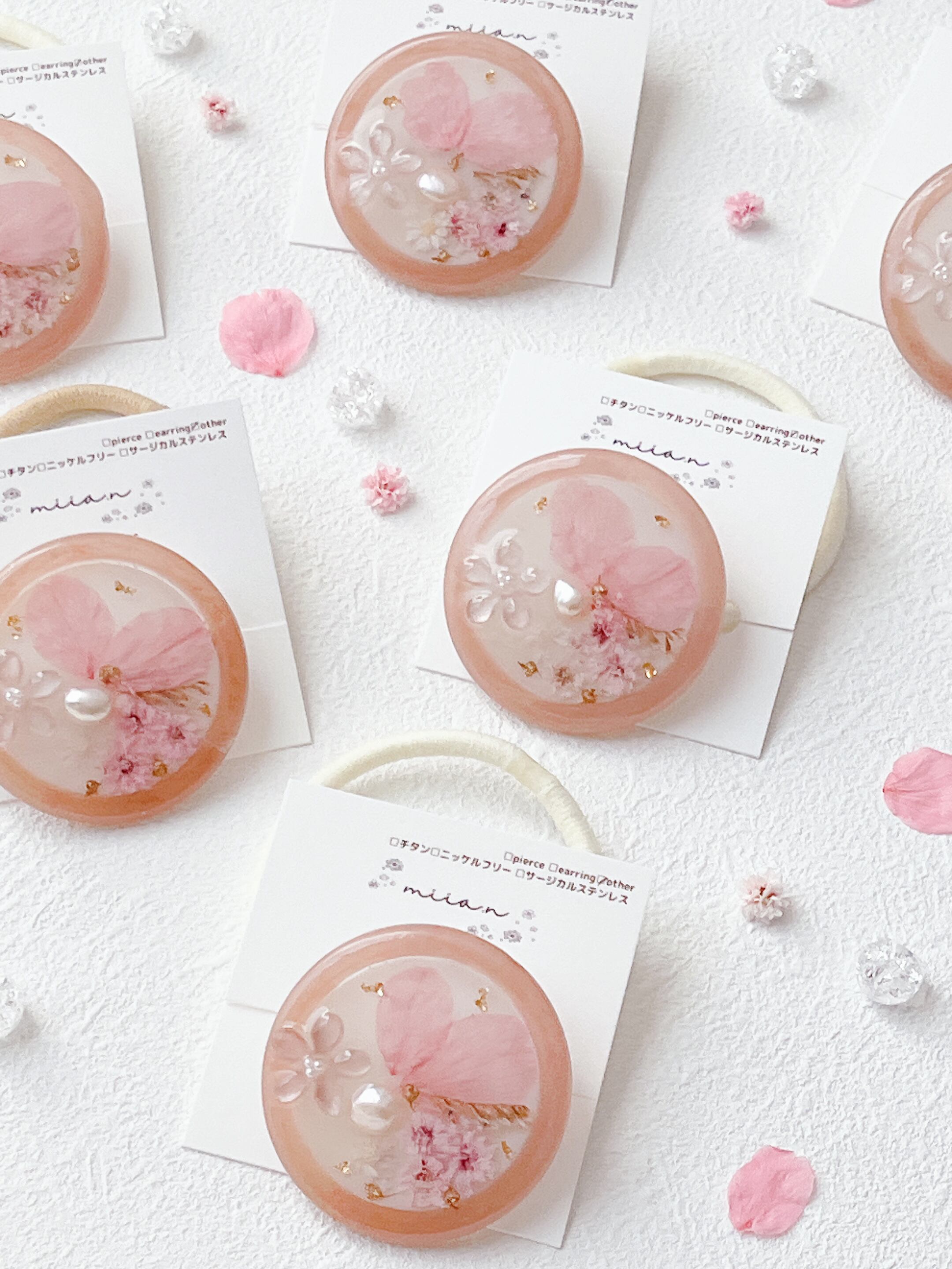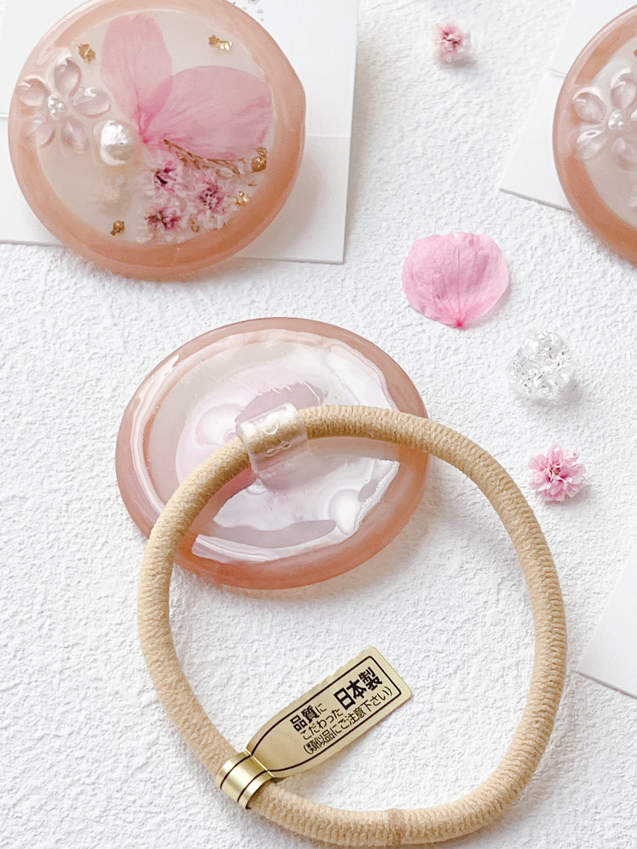 桜のお花だけでなく桜色のかすみ草やほんのり桜色の淡水パールを封入して全体を桜色で統一した桜ラテのようなレジンのヘアゴムです。