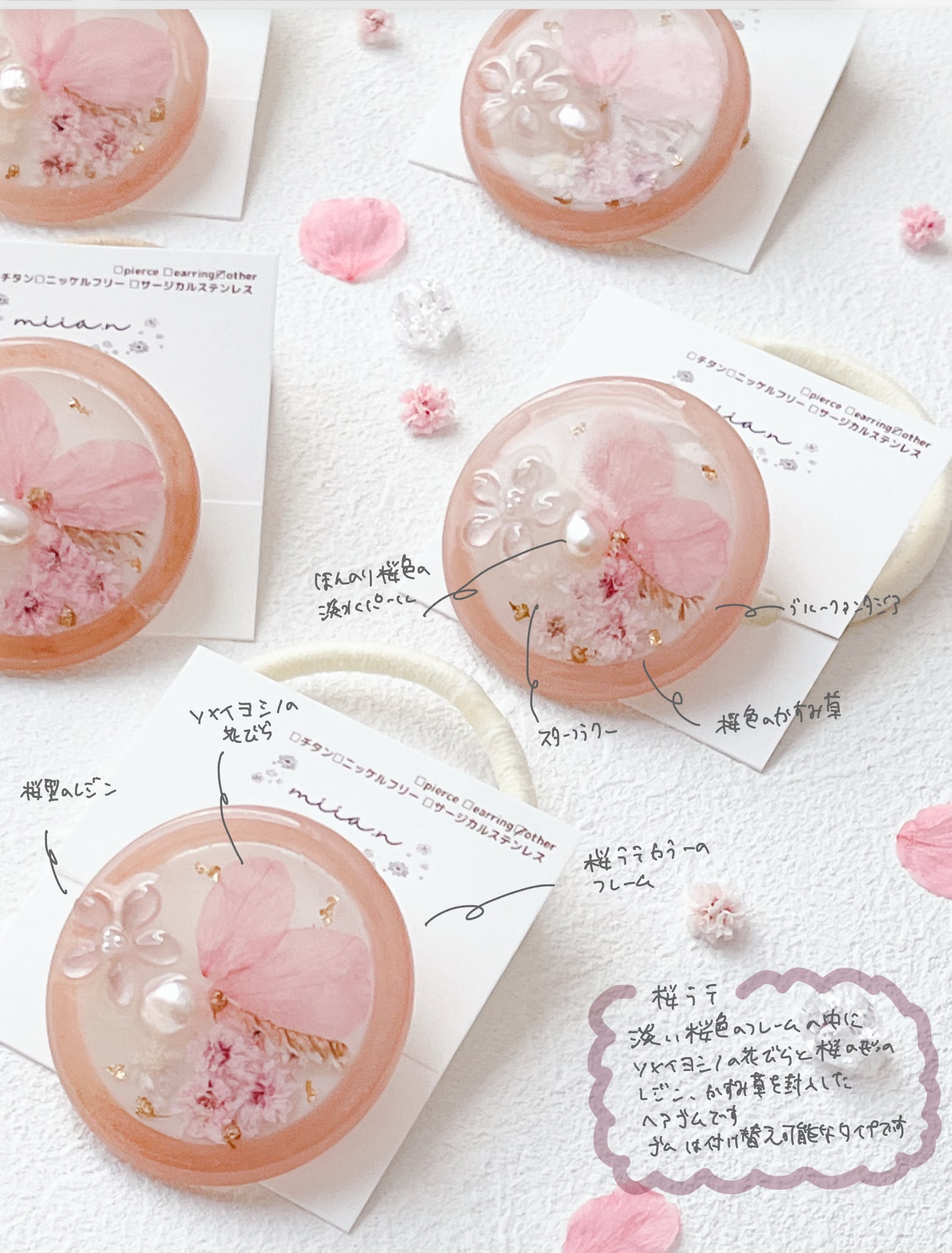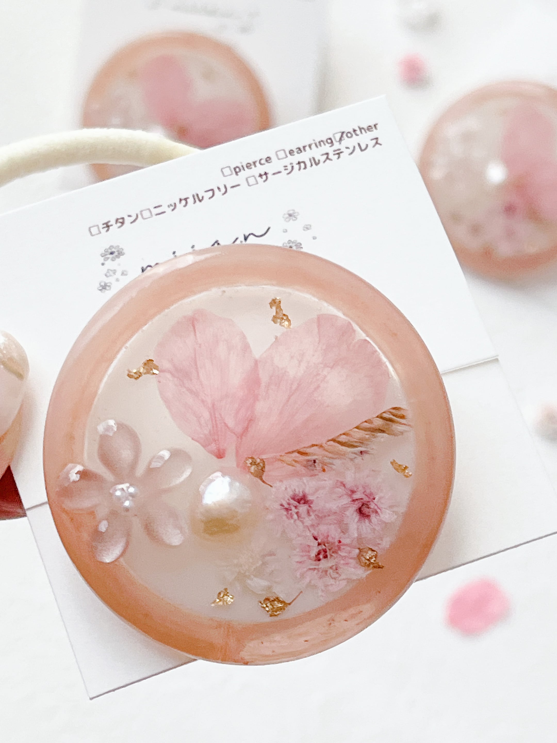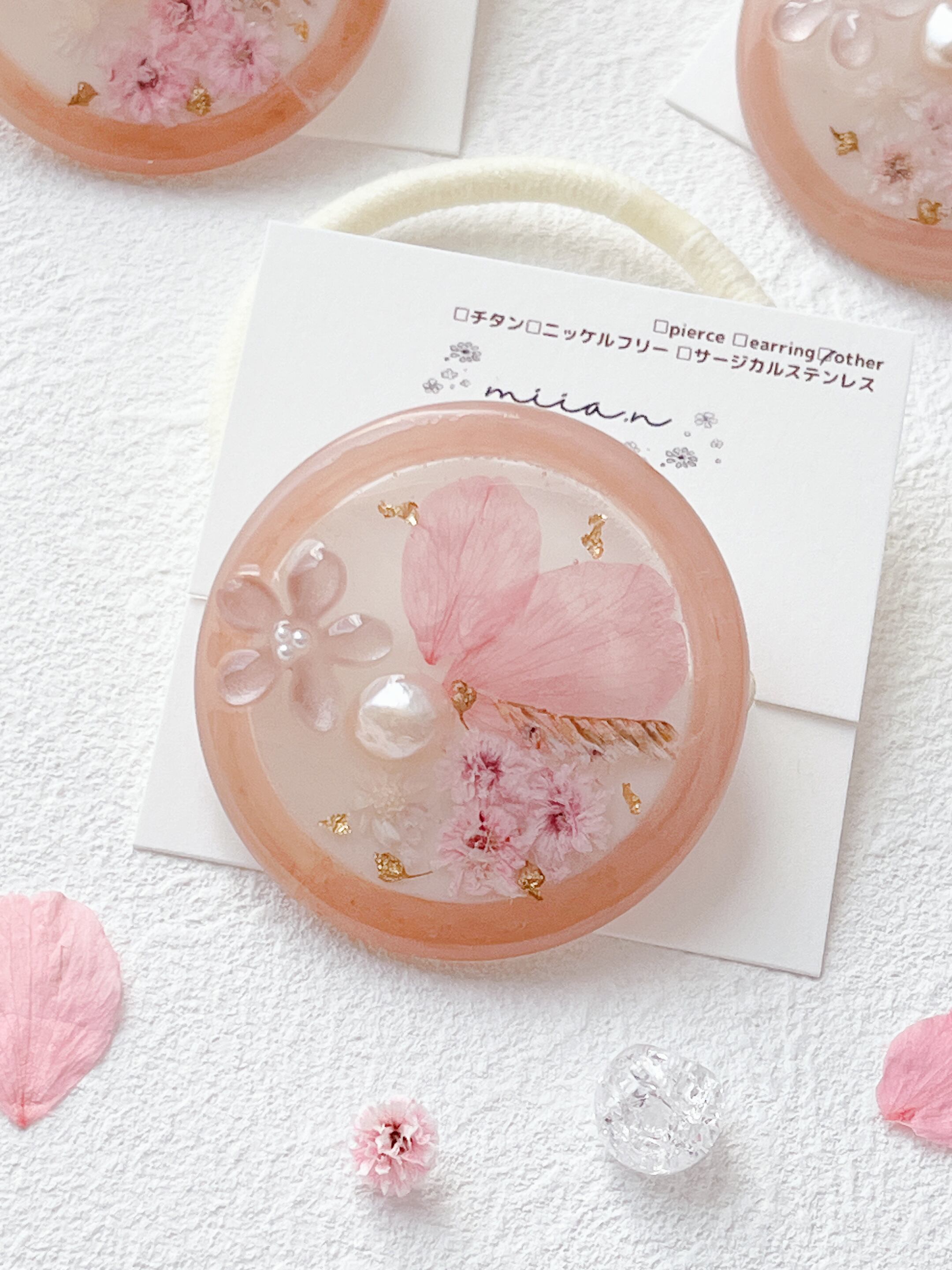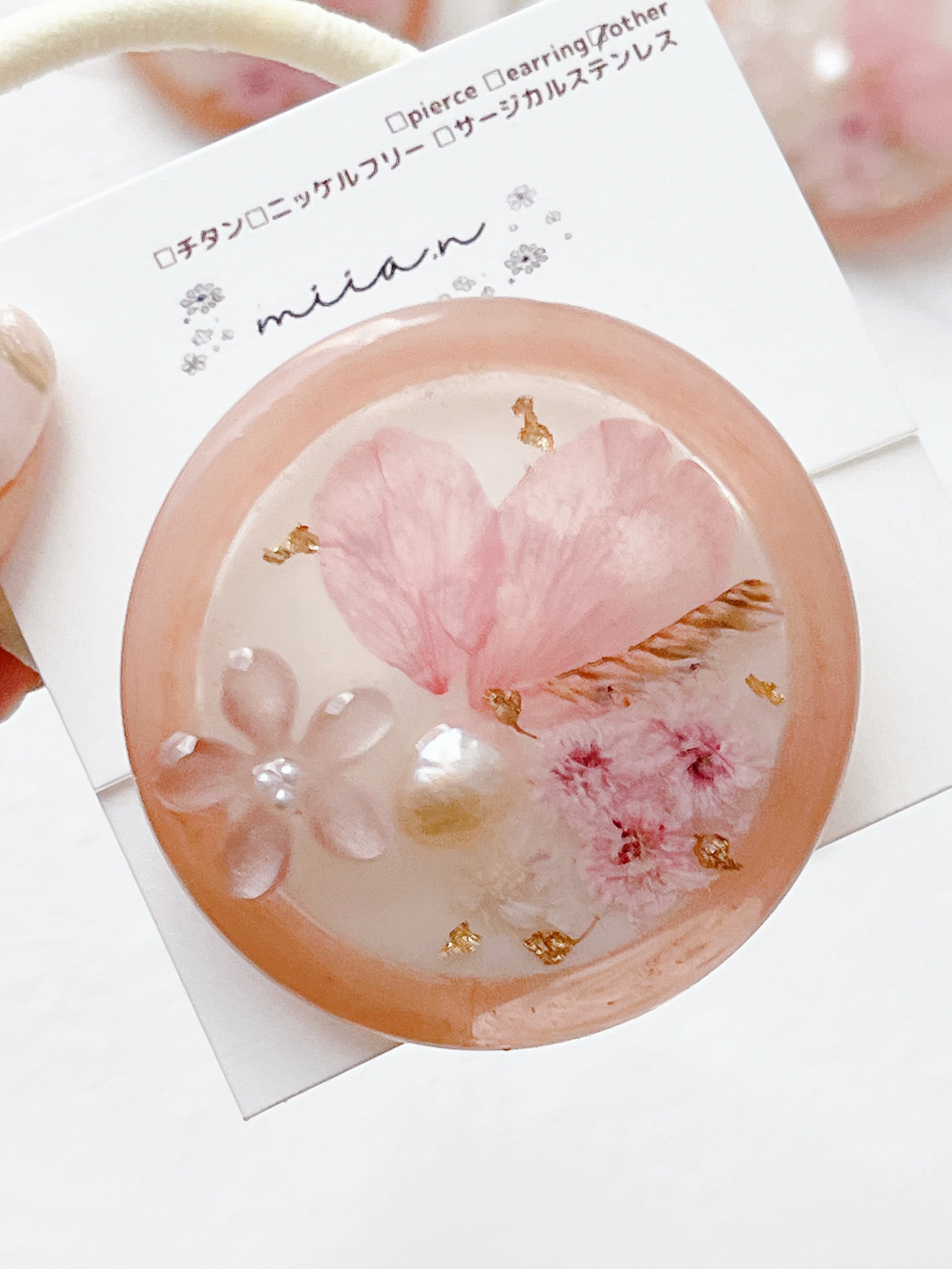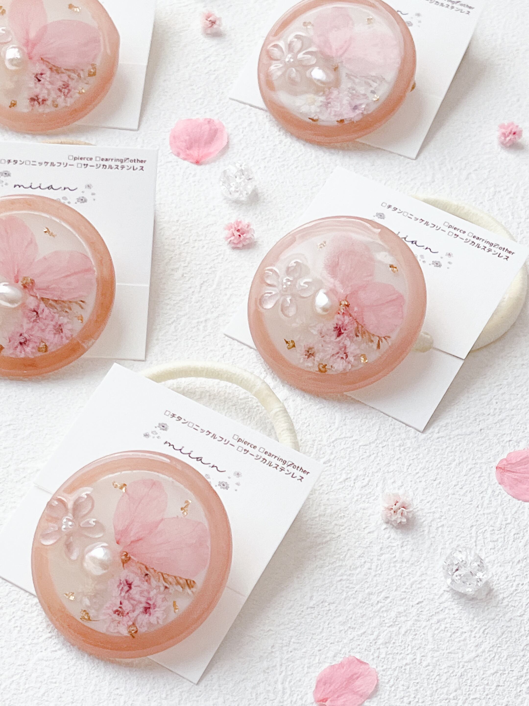 桜のお花だけでなく桜色のかすみ草やほんのり桜色の淡水パールを封入して全体を桜色で統一した桜ラテのようなレジンのヘアゴムです。