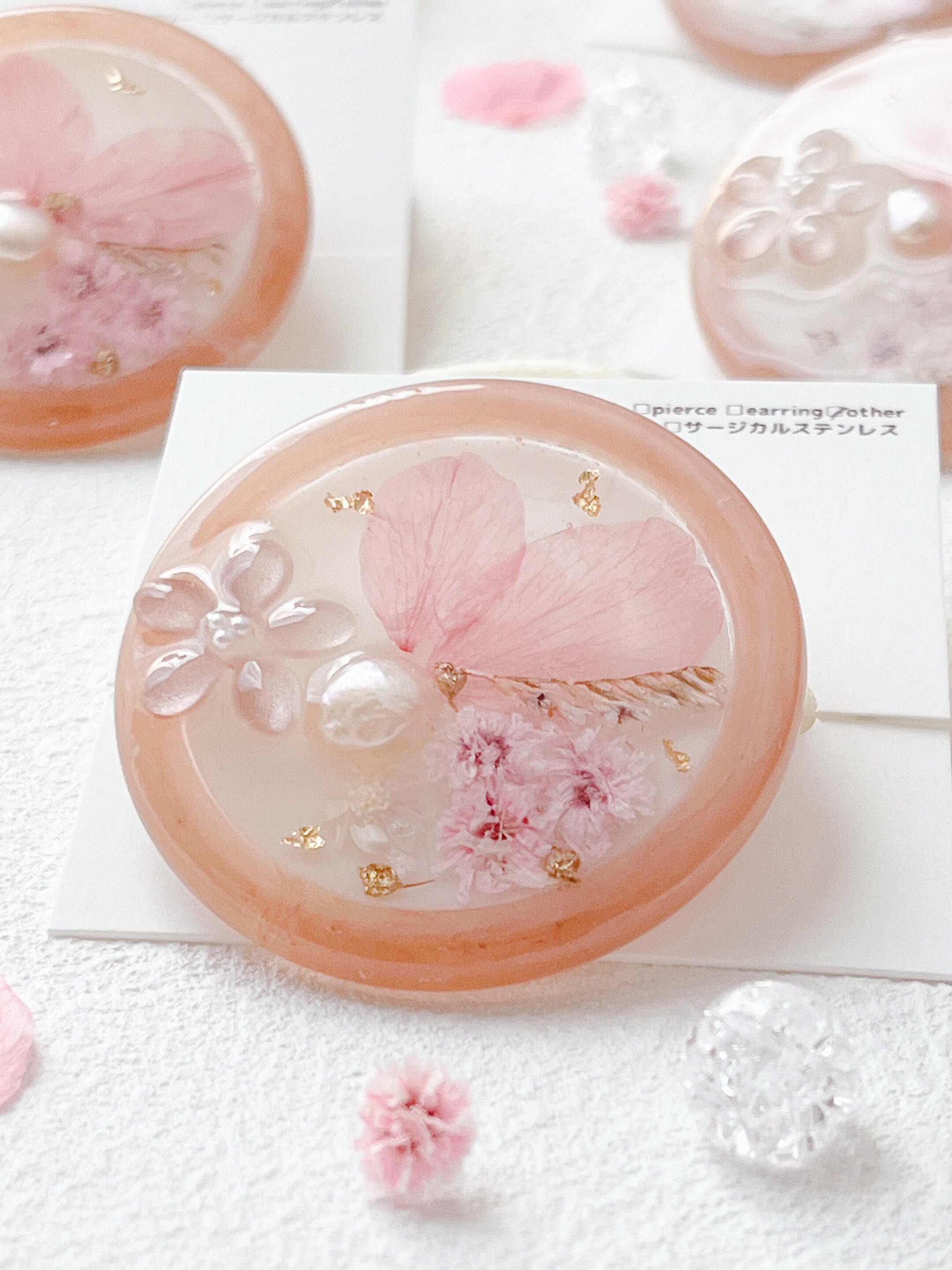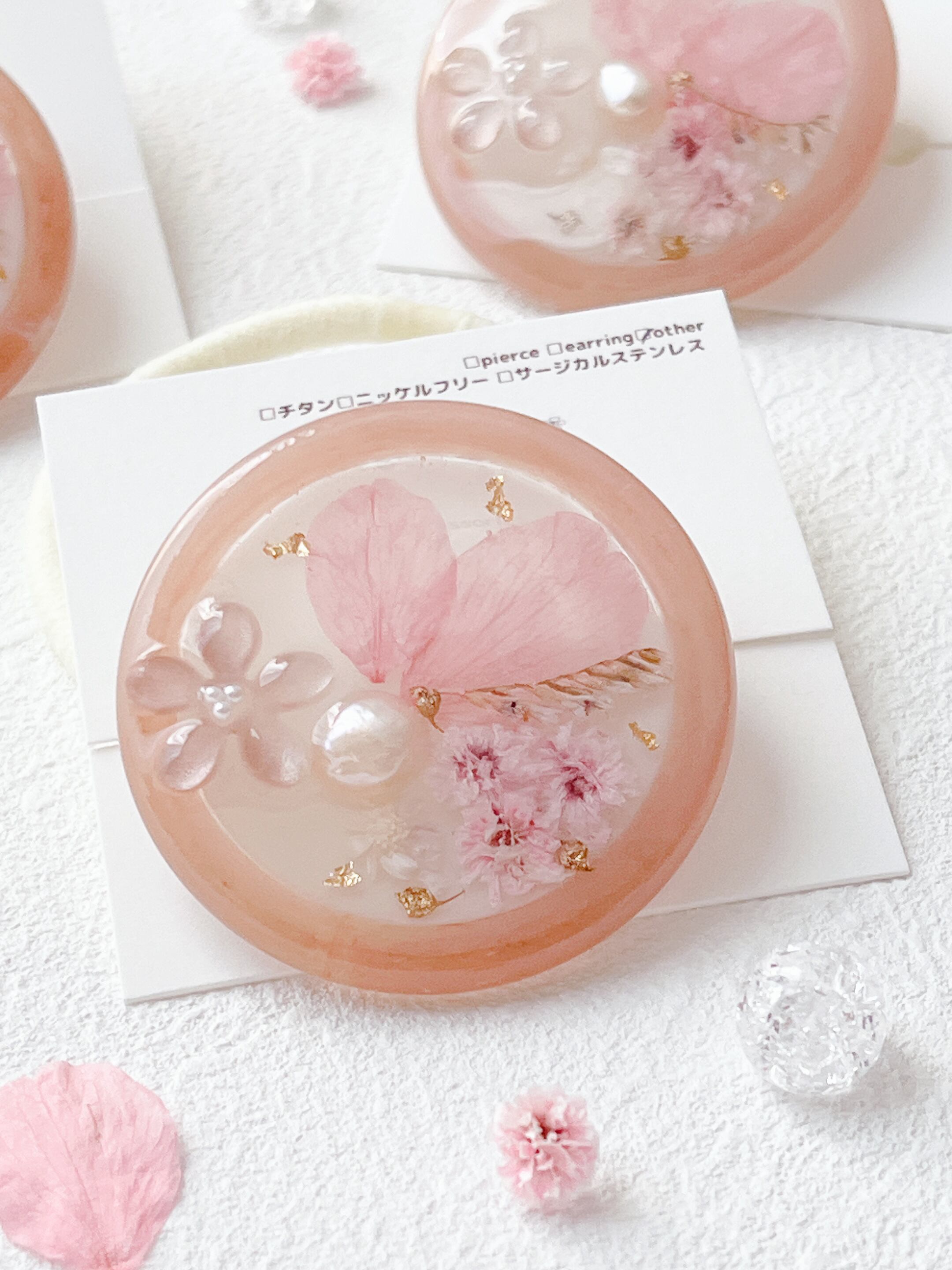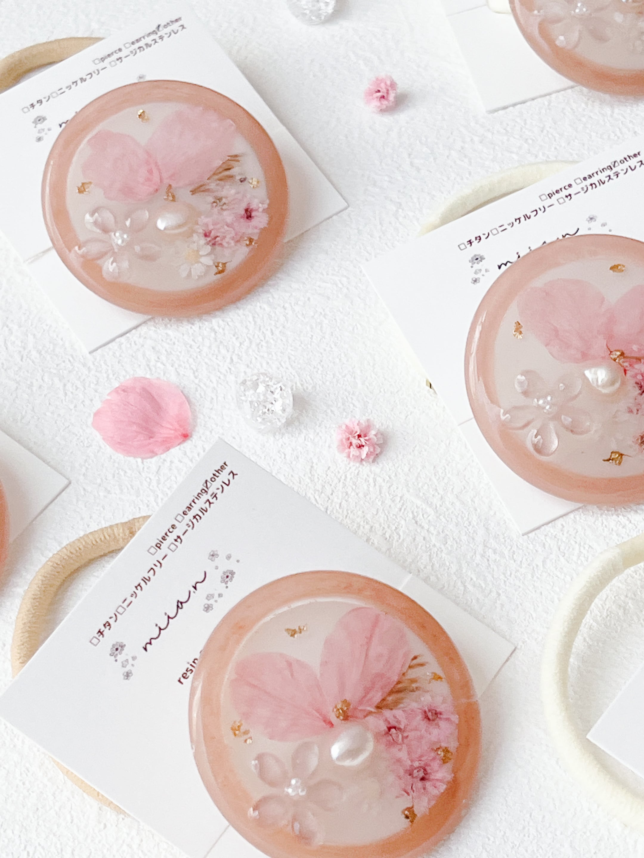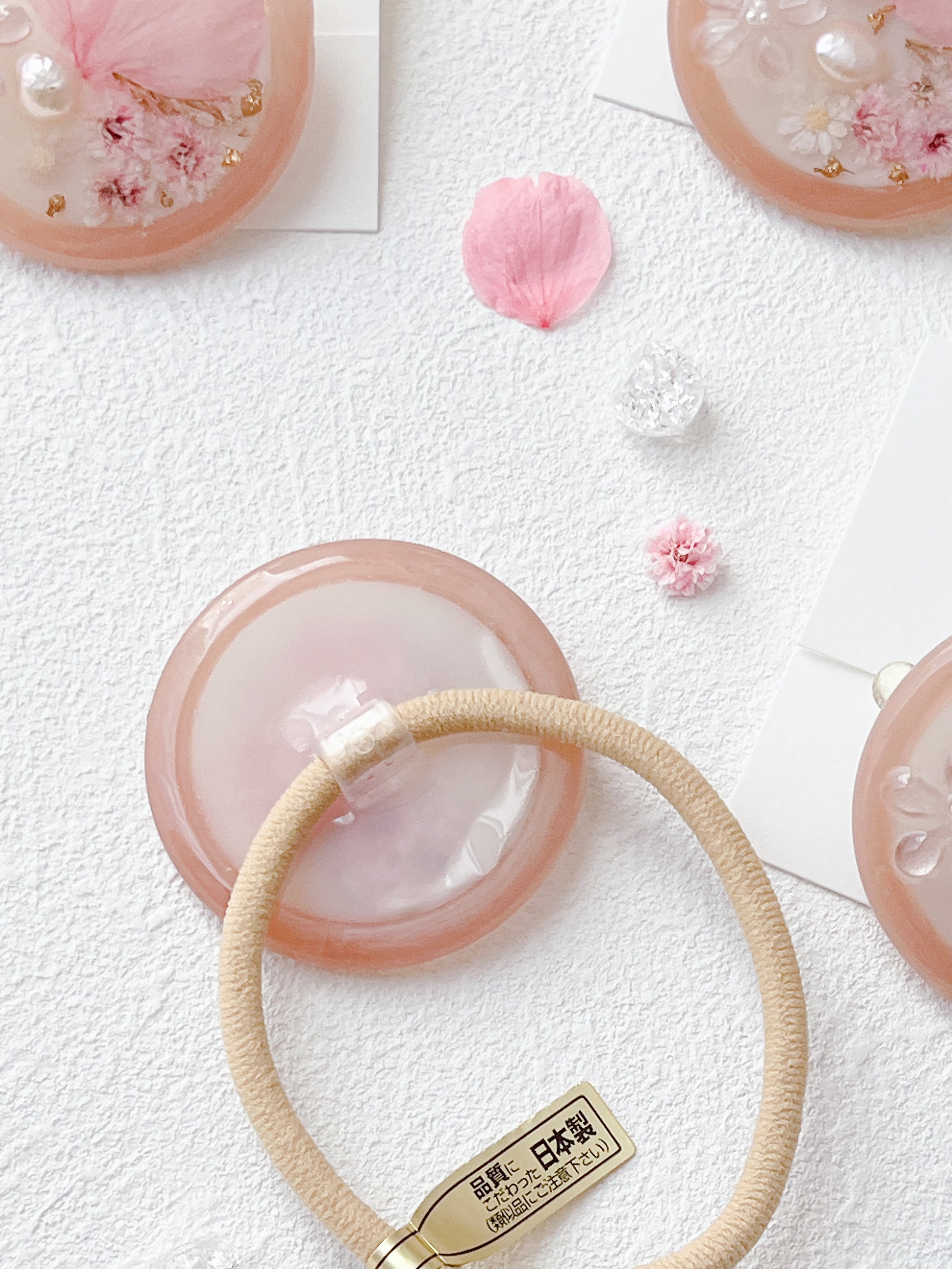 桜のお花だけでなく桜色のかすみ草やほんのり桜色の淡水パールを封入して全体を桜色で統一した桜ラテのようなレジンのヘアゴムです。