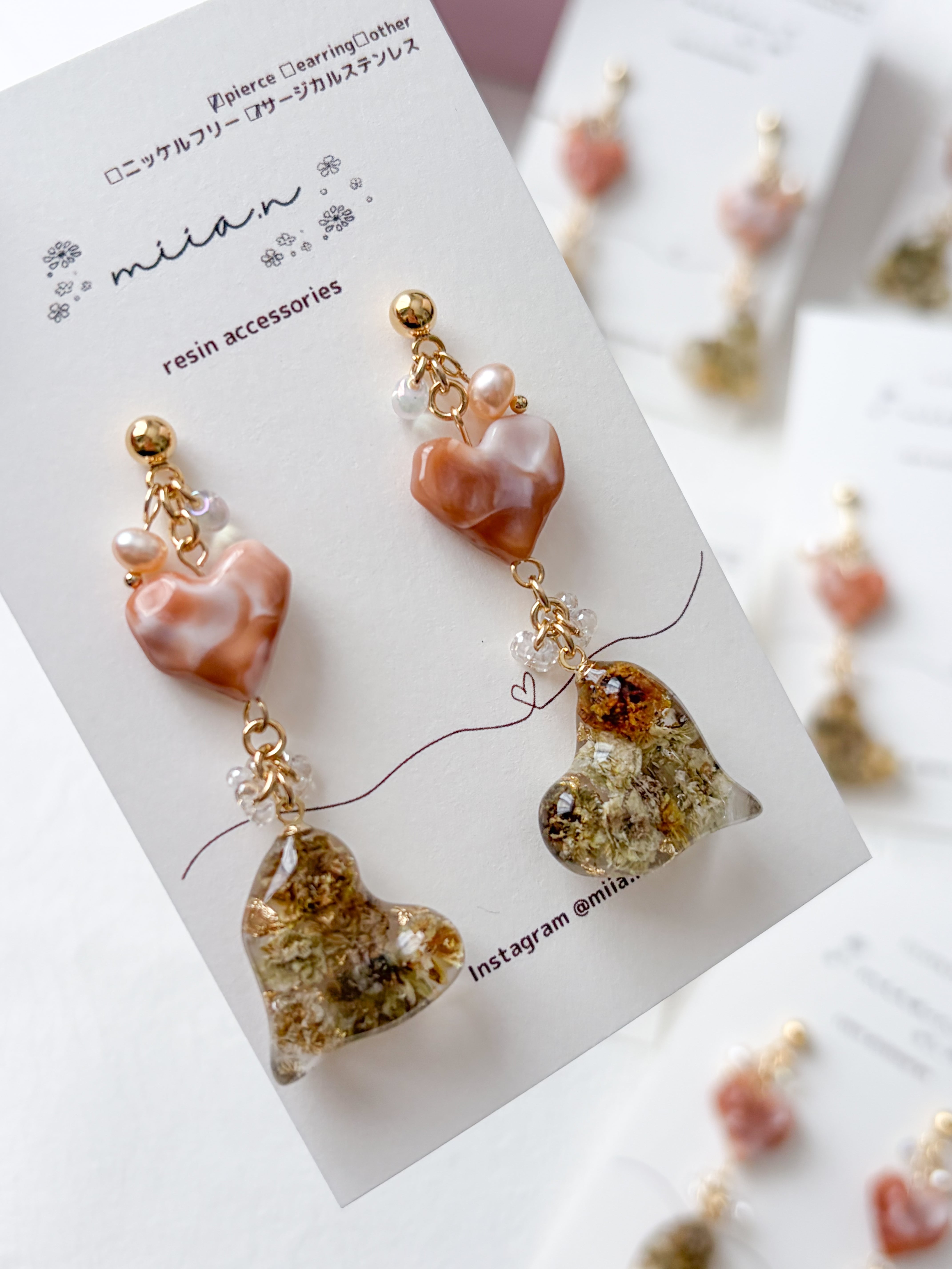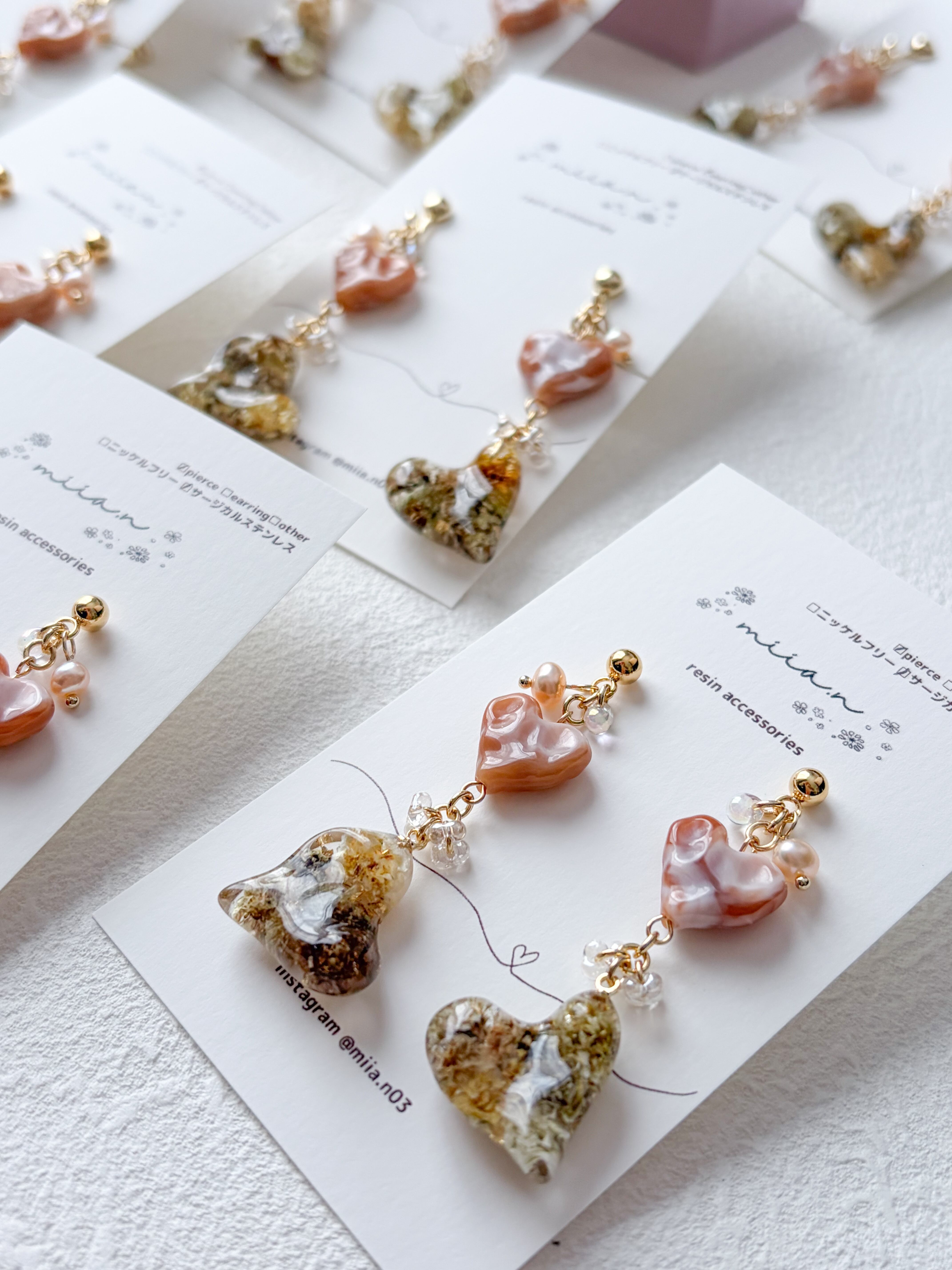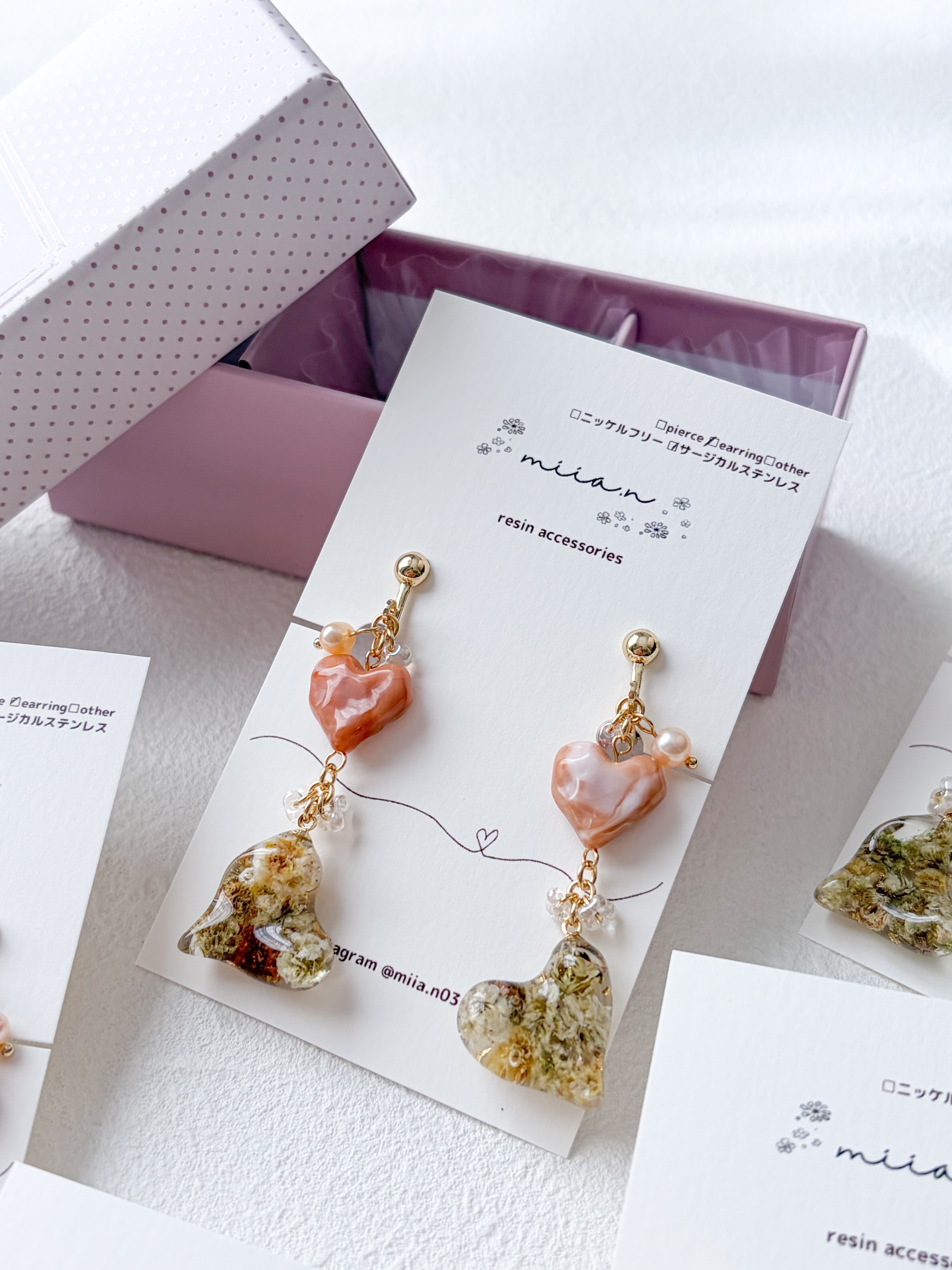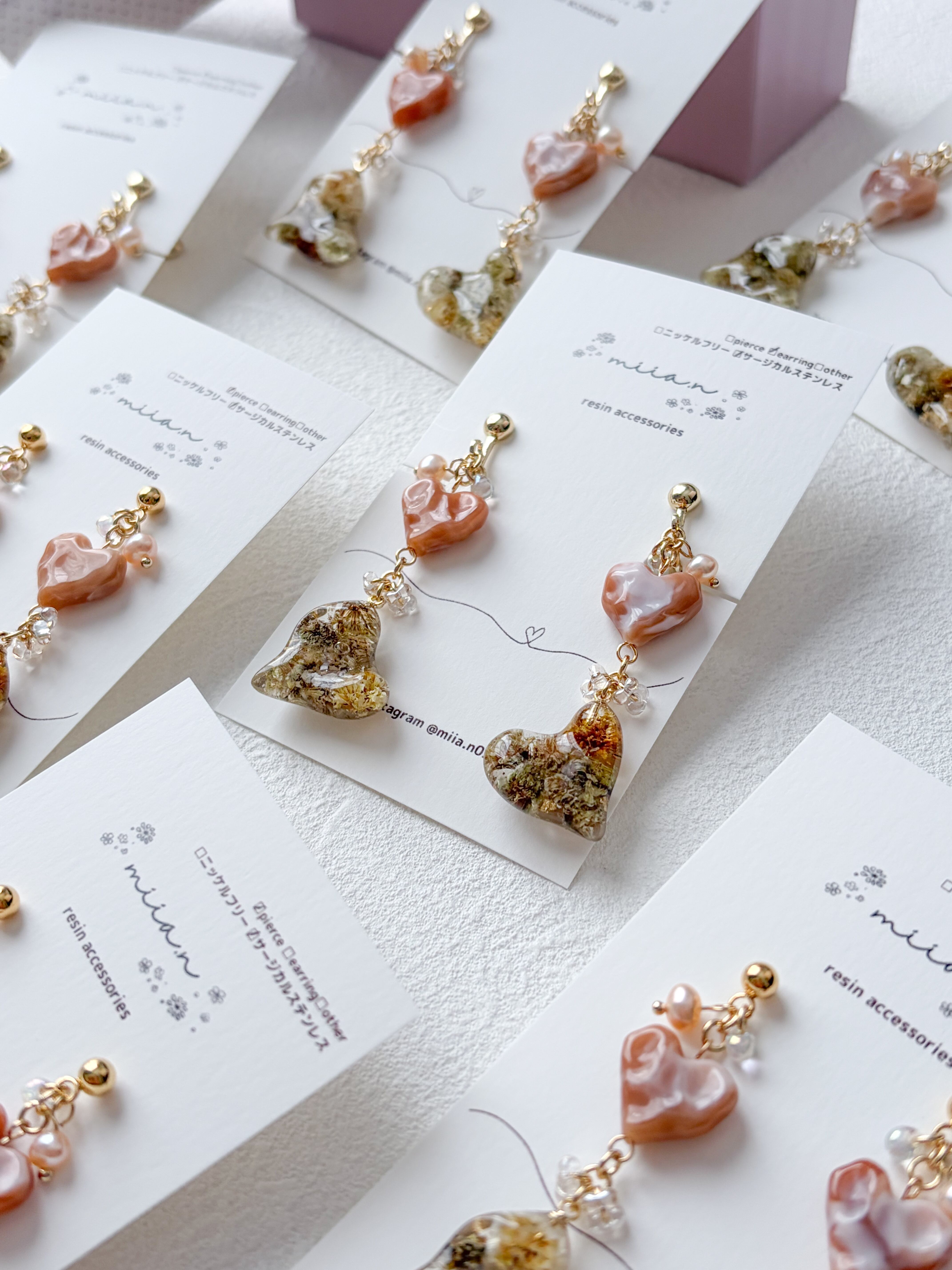 バレンタインシリーズにぴったりのハート×ハートでチョコレートカラーのかすみ草を封じ込めた歪な形のハートレジンとキャラメルカラーの歪なハートビーズを組み合わせたアクセサリーです。