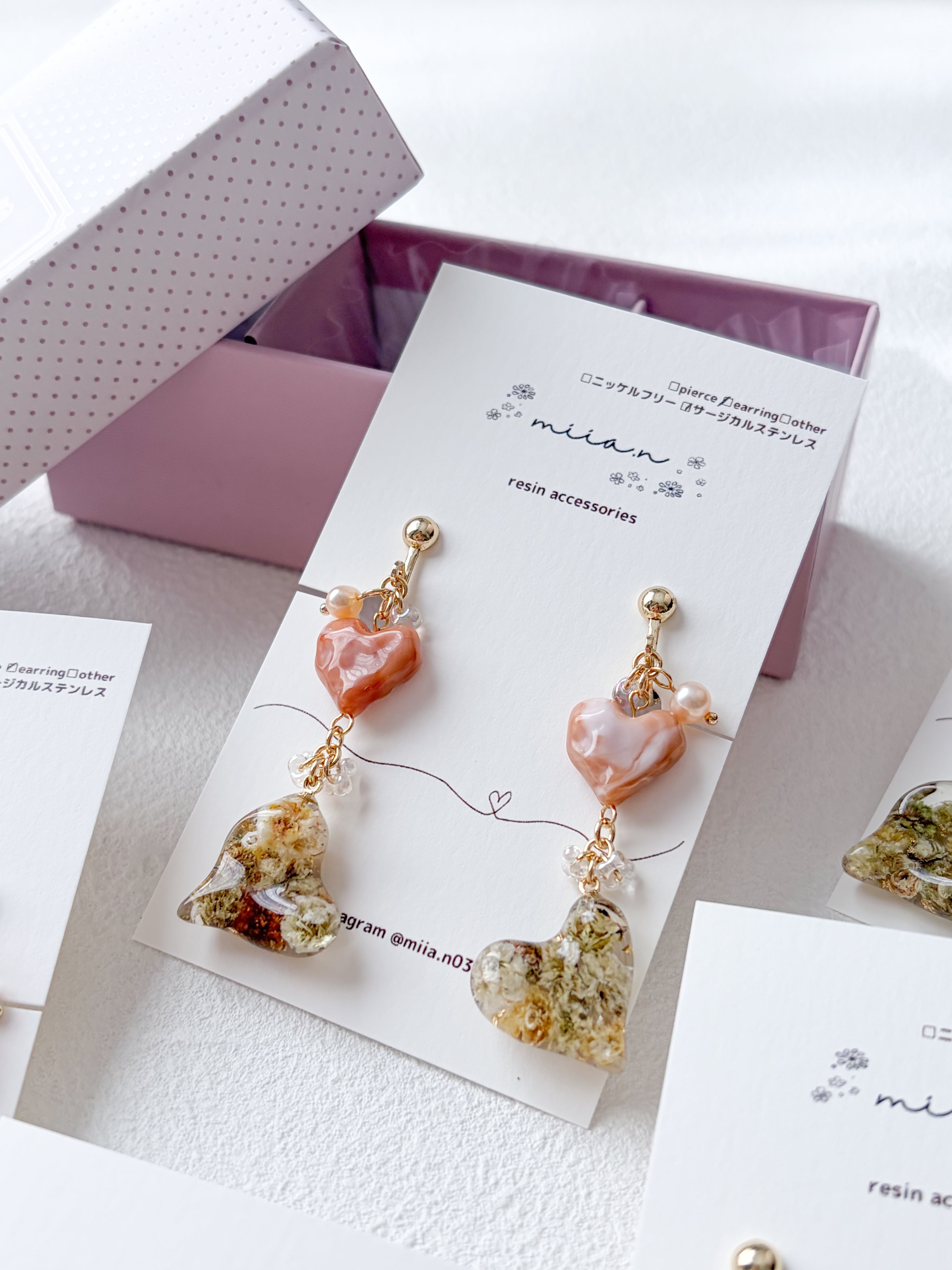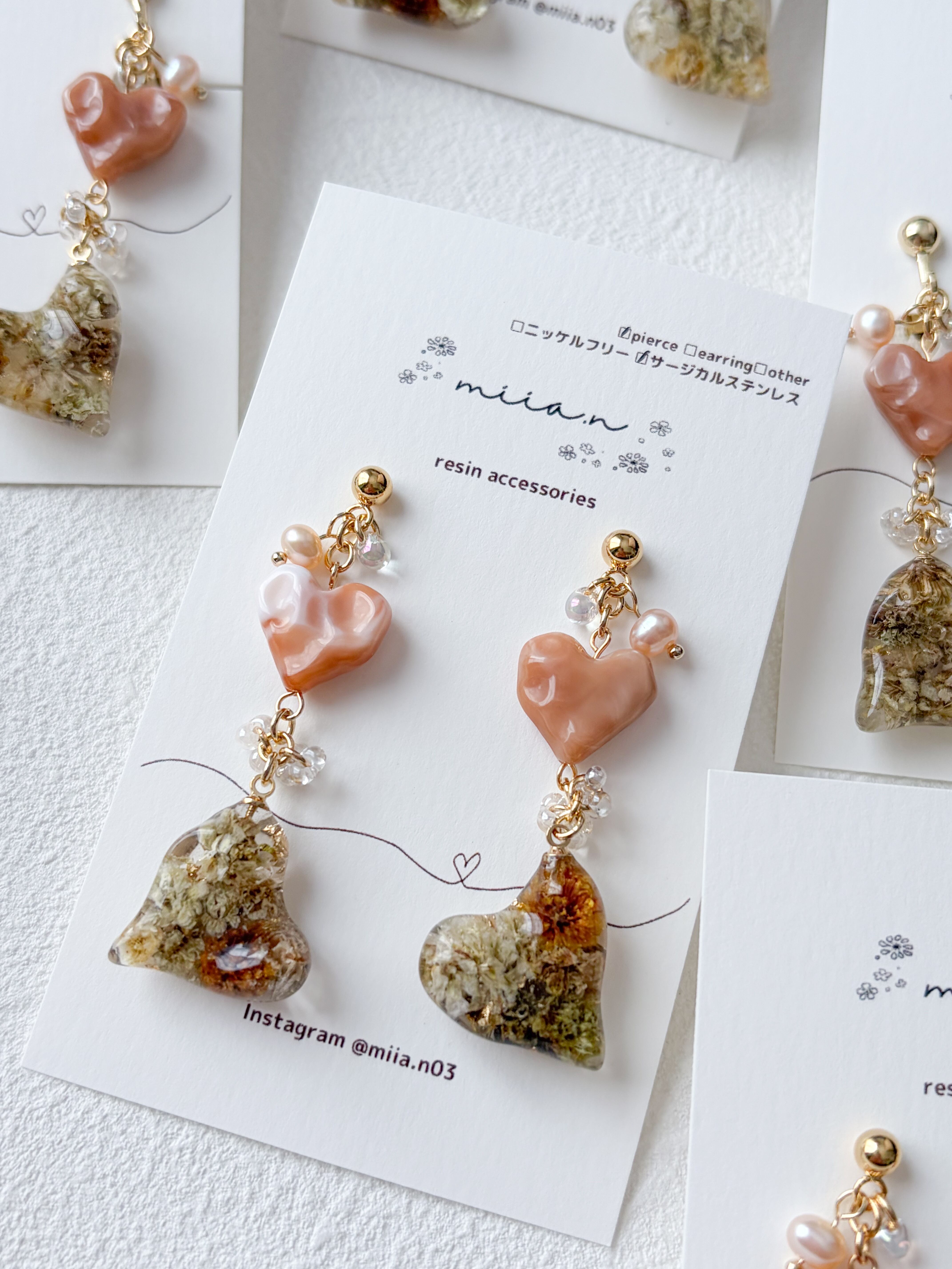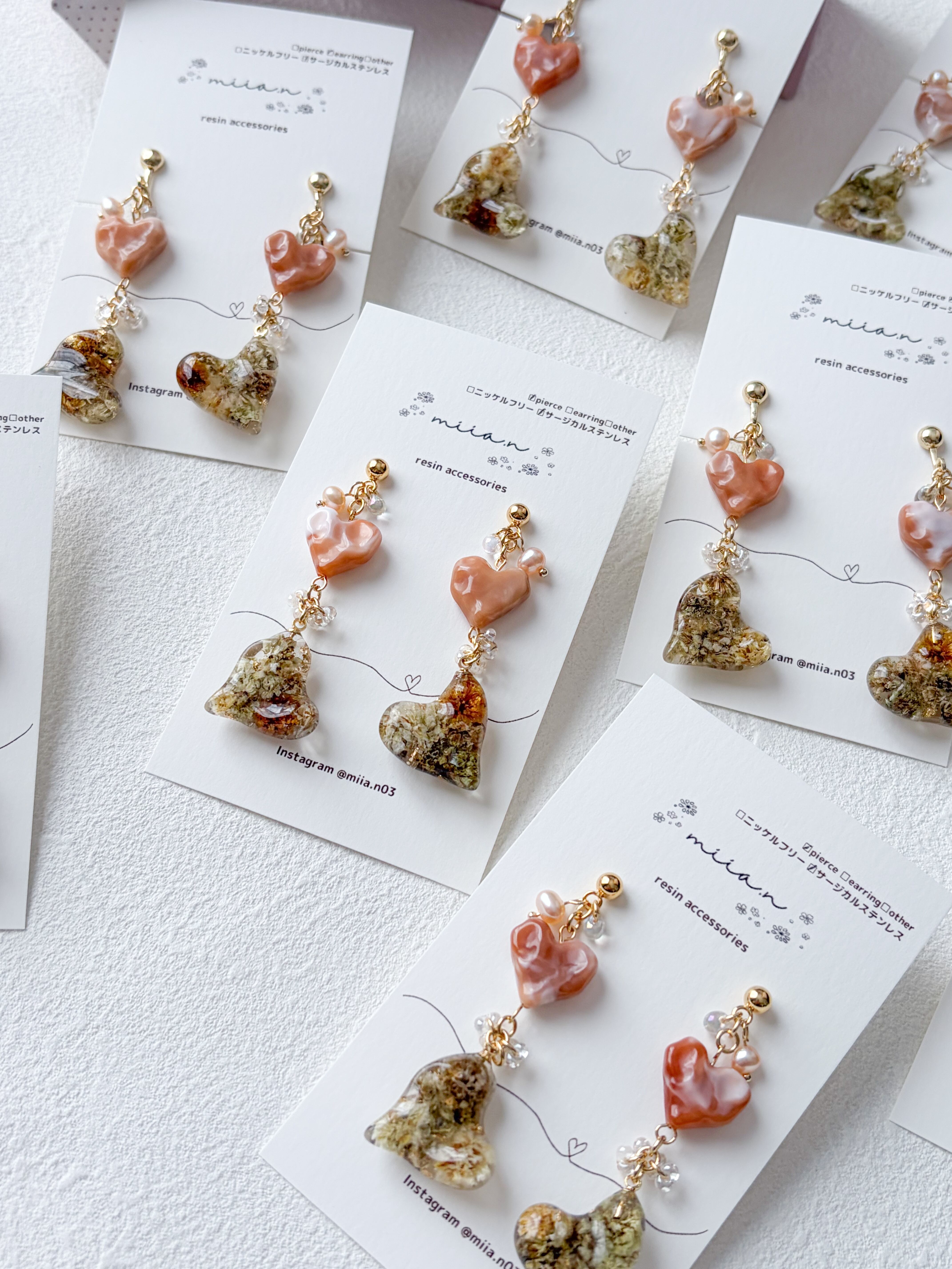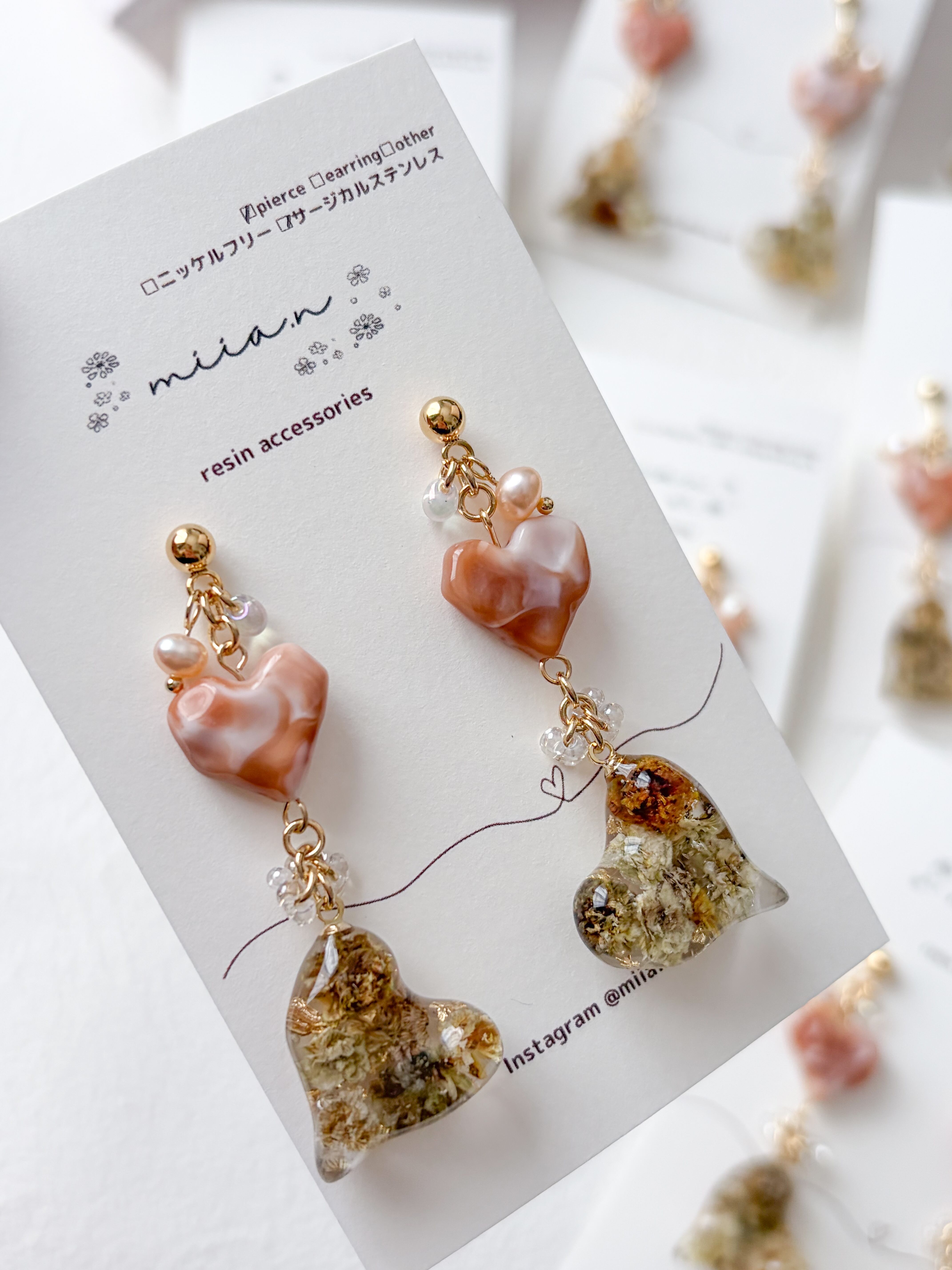 バレンタインシリーズにぴったりのハート×ハートでチョコレートカラーのかすみ草を封じ込めた歪な形のハートレジンとキャラメルカラーの歪なハートビーズを組み合わせたアクセサリーです。