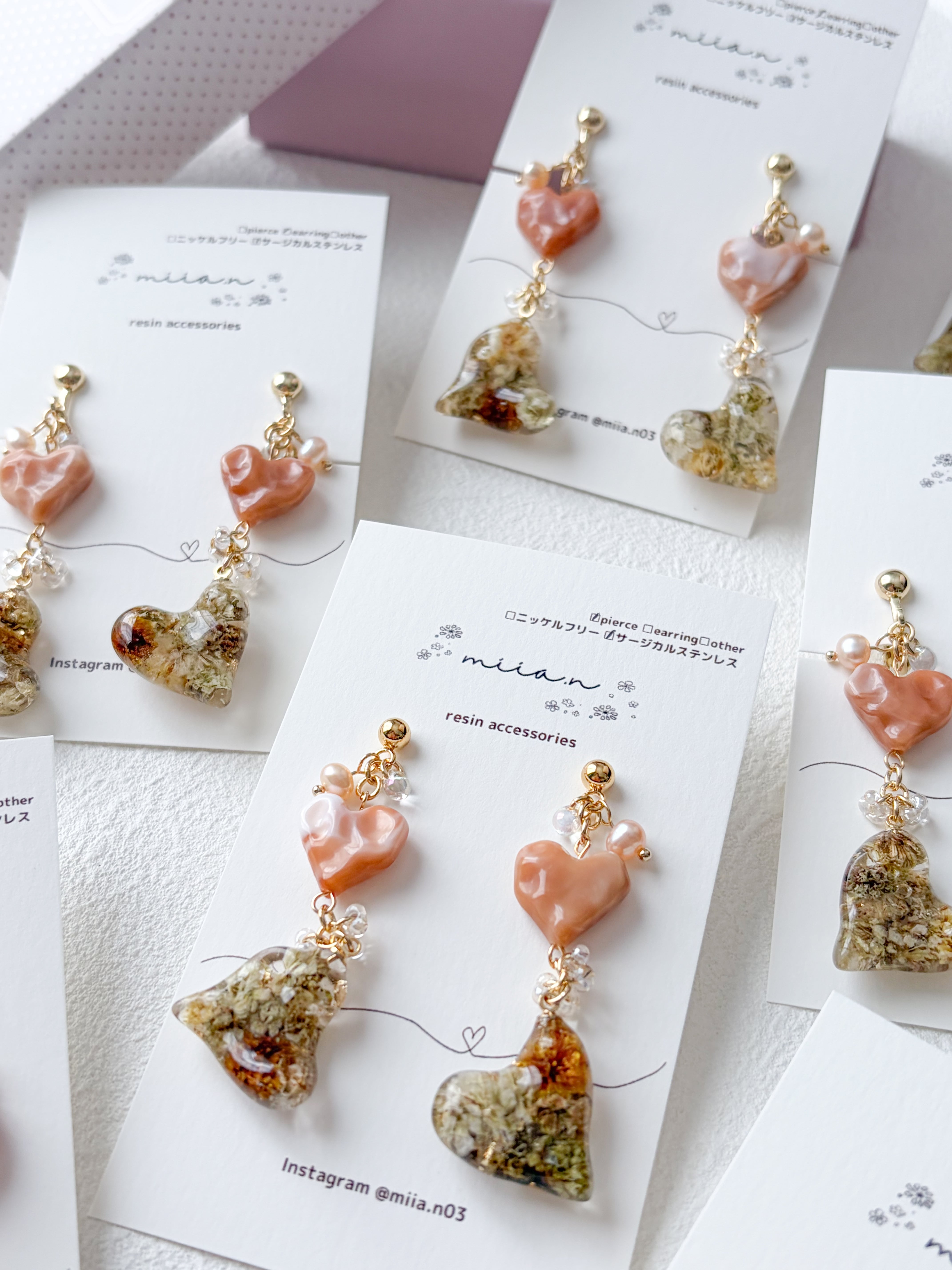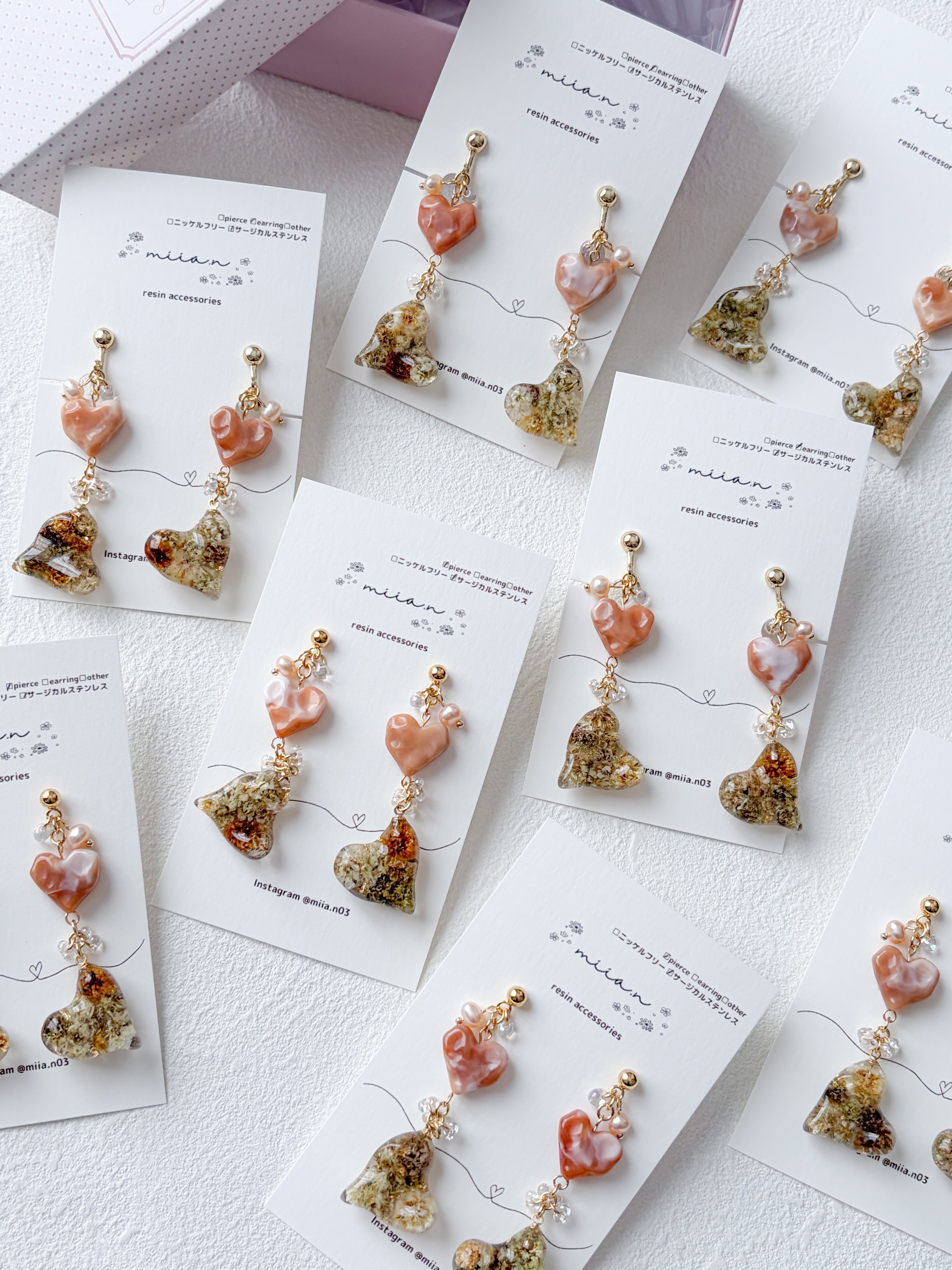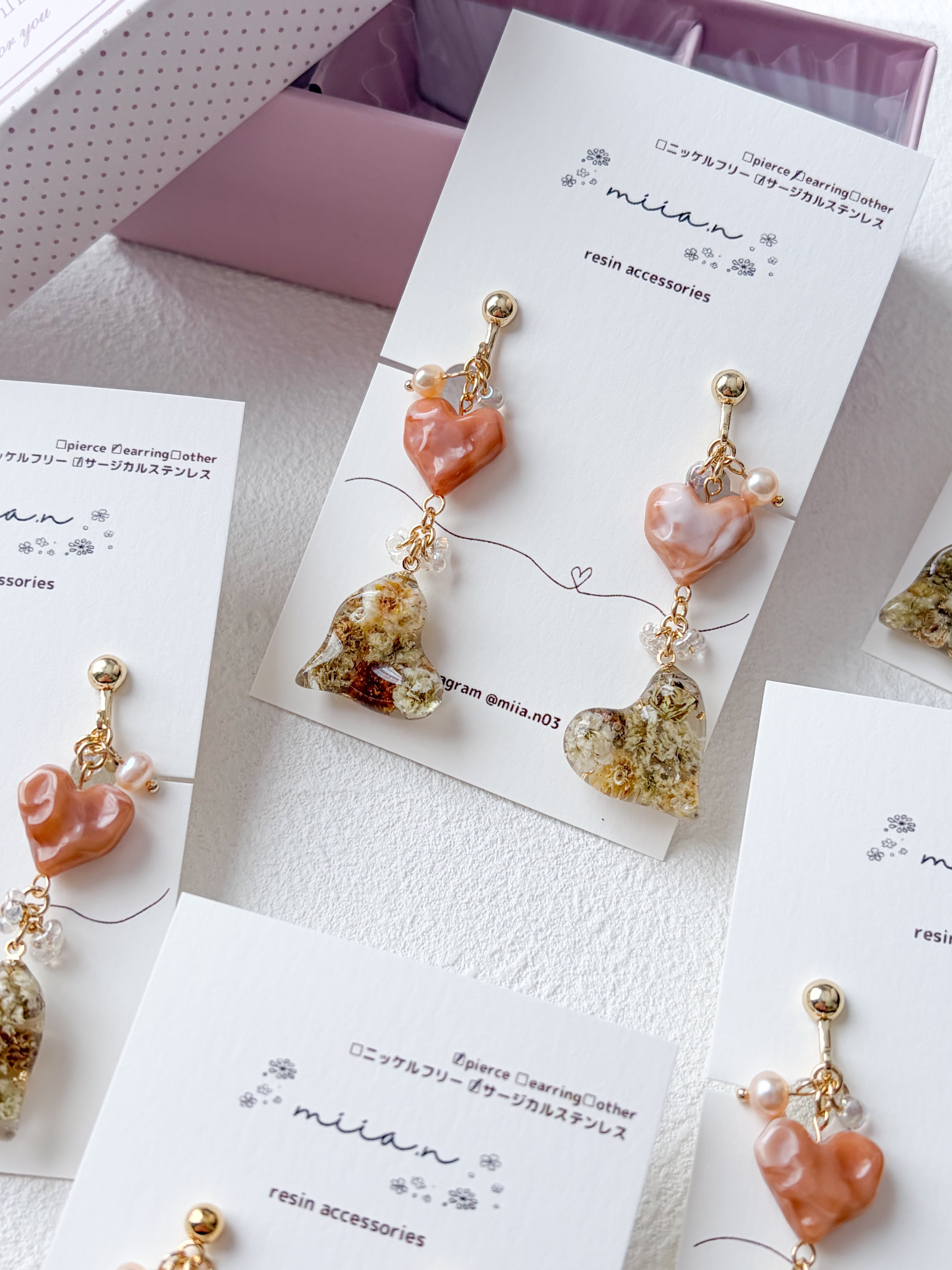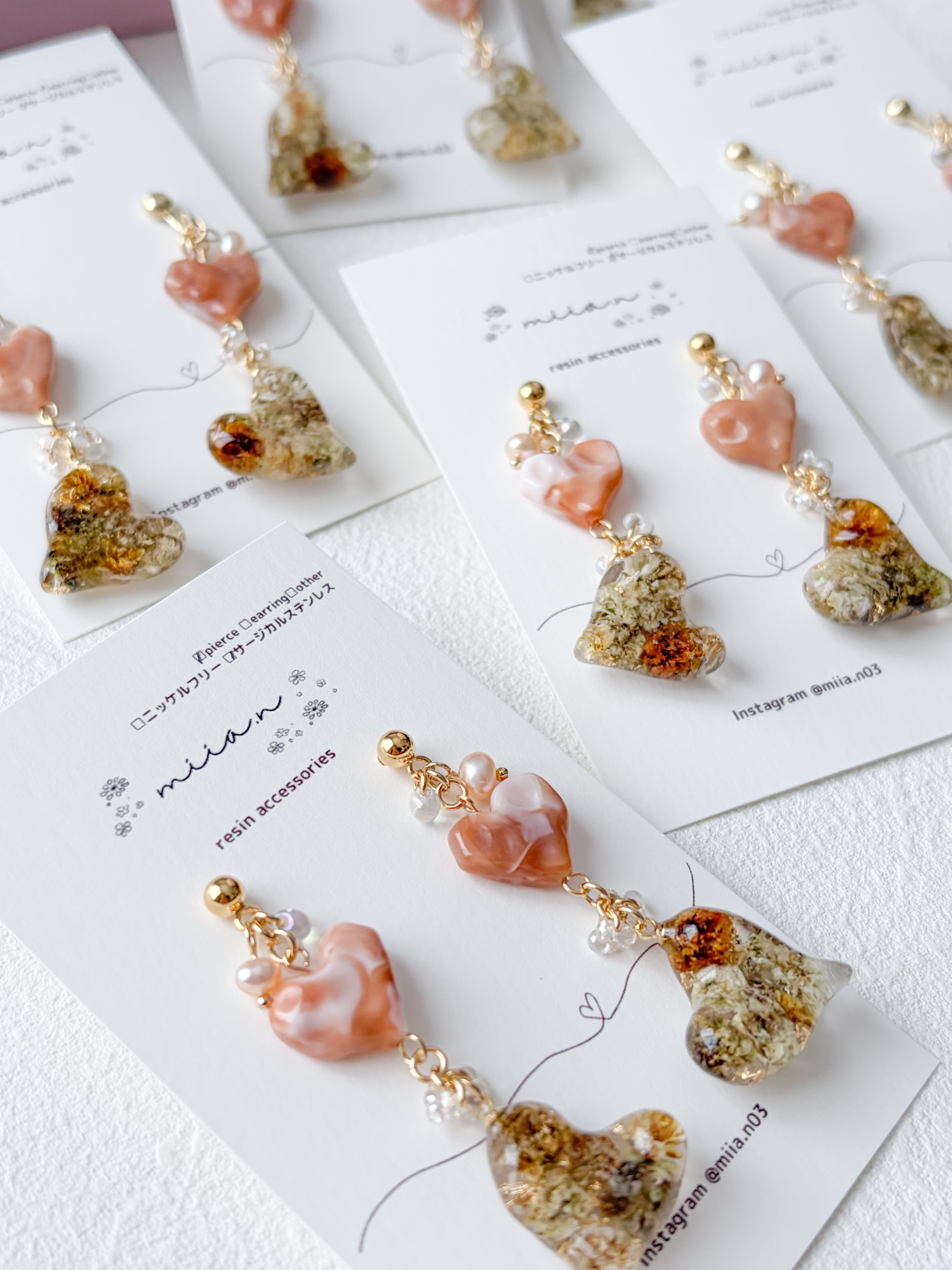 バレンタインシリーズにぴったりのハート×ハートでチョコレートカラーのかすみ草を封じ込めた歪な形のハートレジンとキャラメルカラーの歪なハートビーズを組み合わせたアクセサリーです。