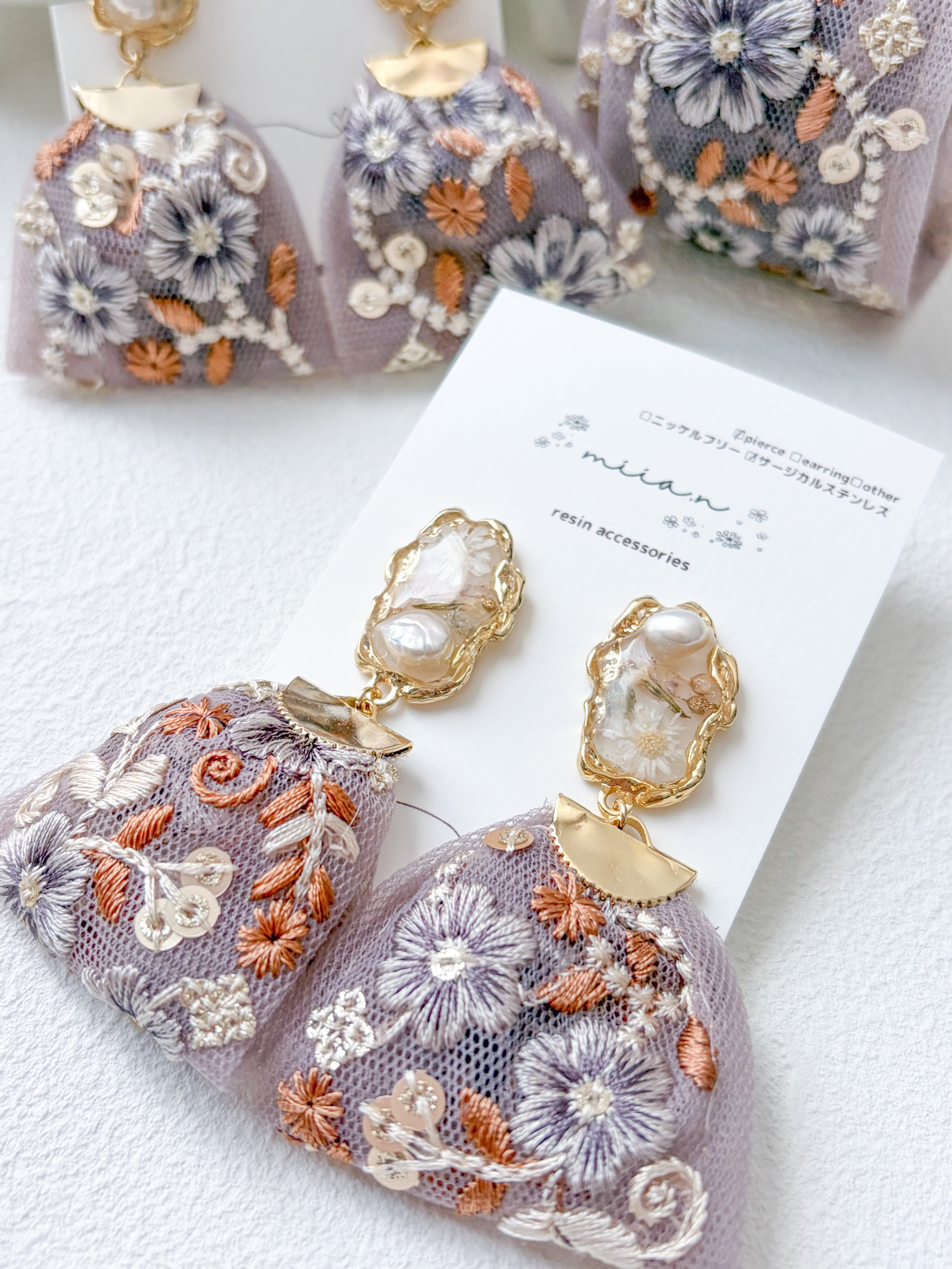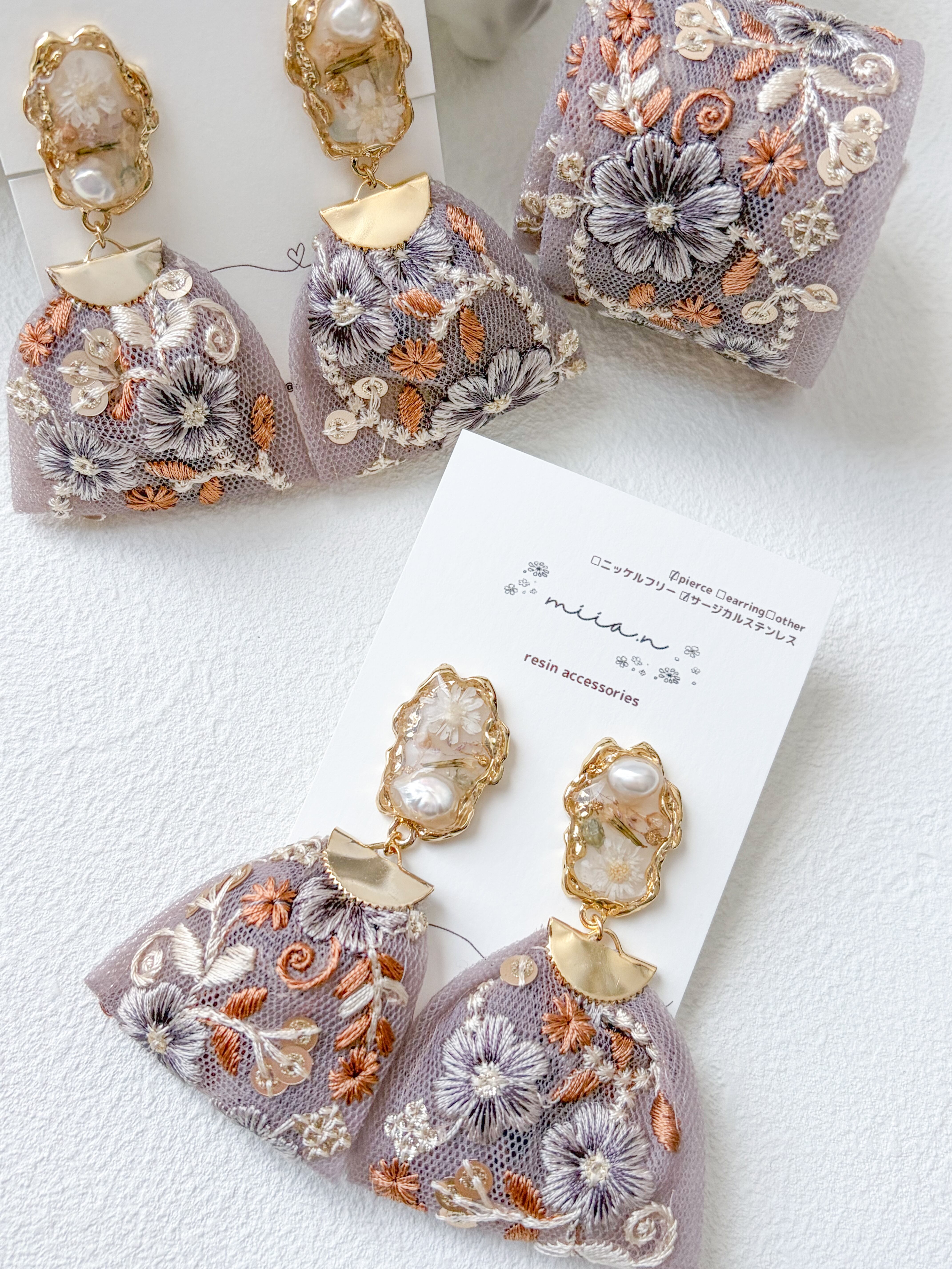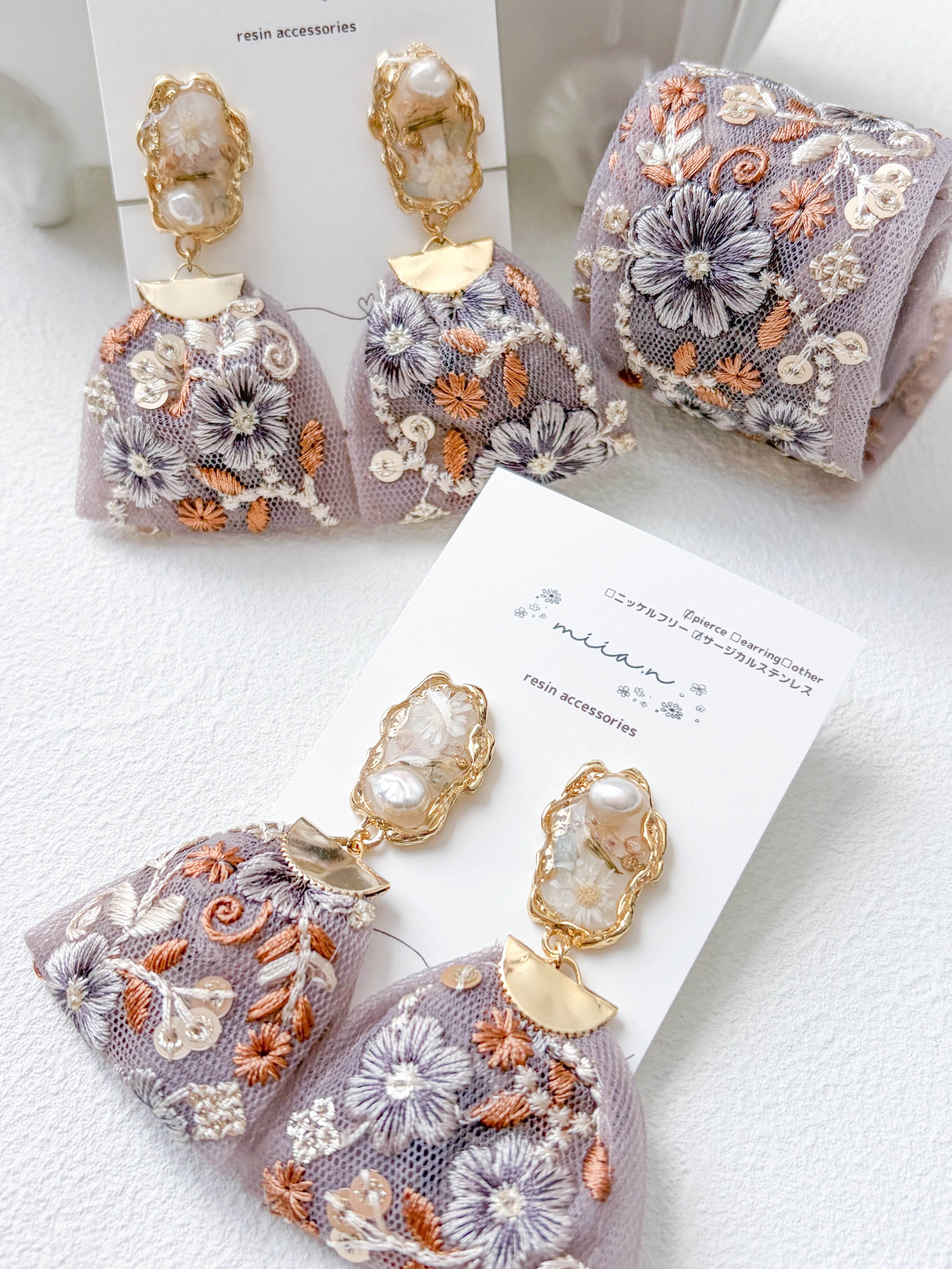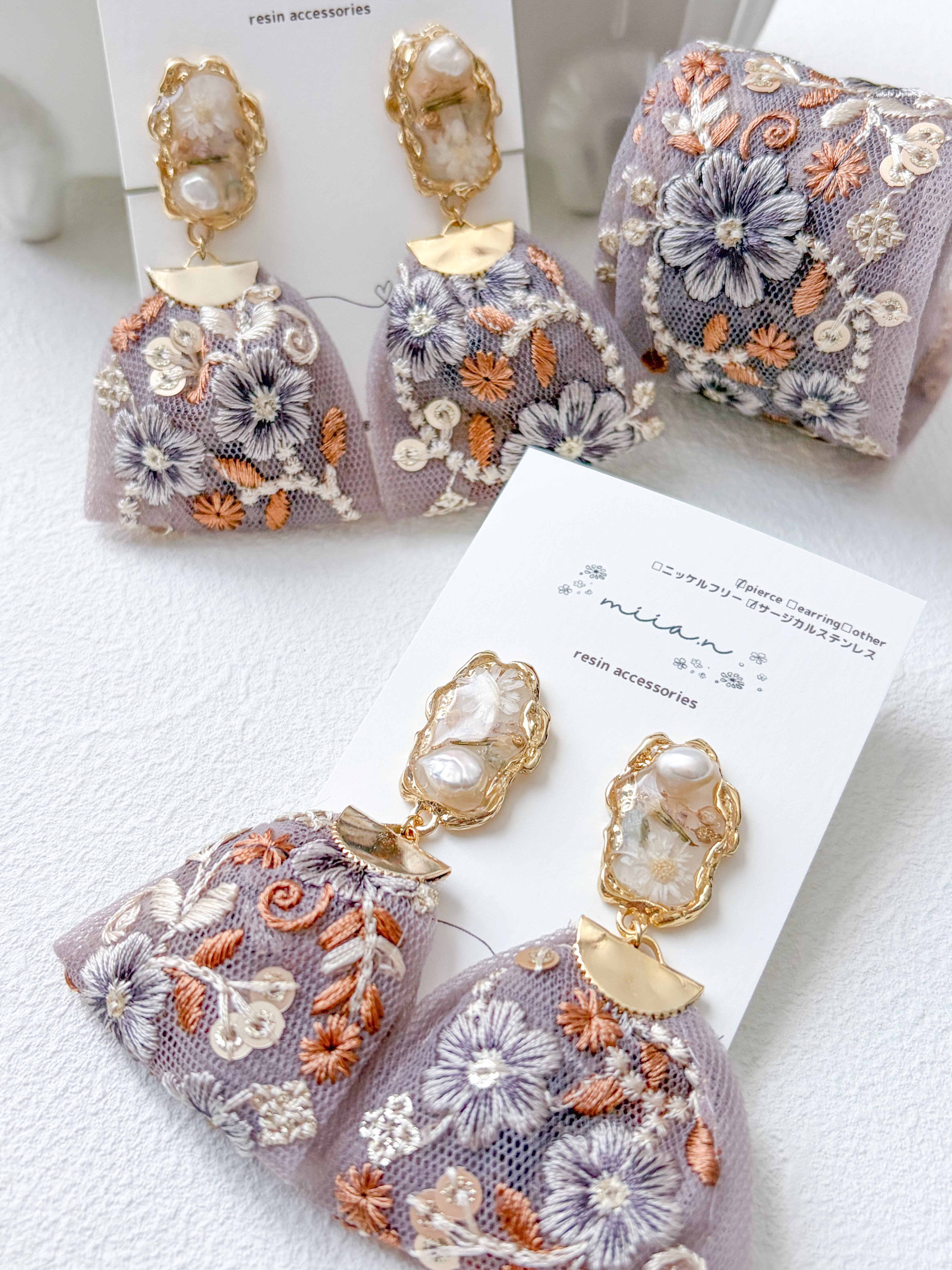 トップのレジン部分はお花と淡水パールをゴールドの淵の中に封入して左右アシンメトリーに。リボンは大きめに見えますがチュール素材なのでとっても軽いのに大ぶりで存在感抜群です。