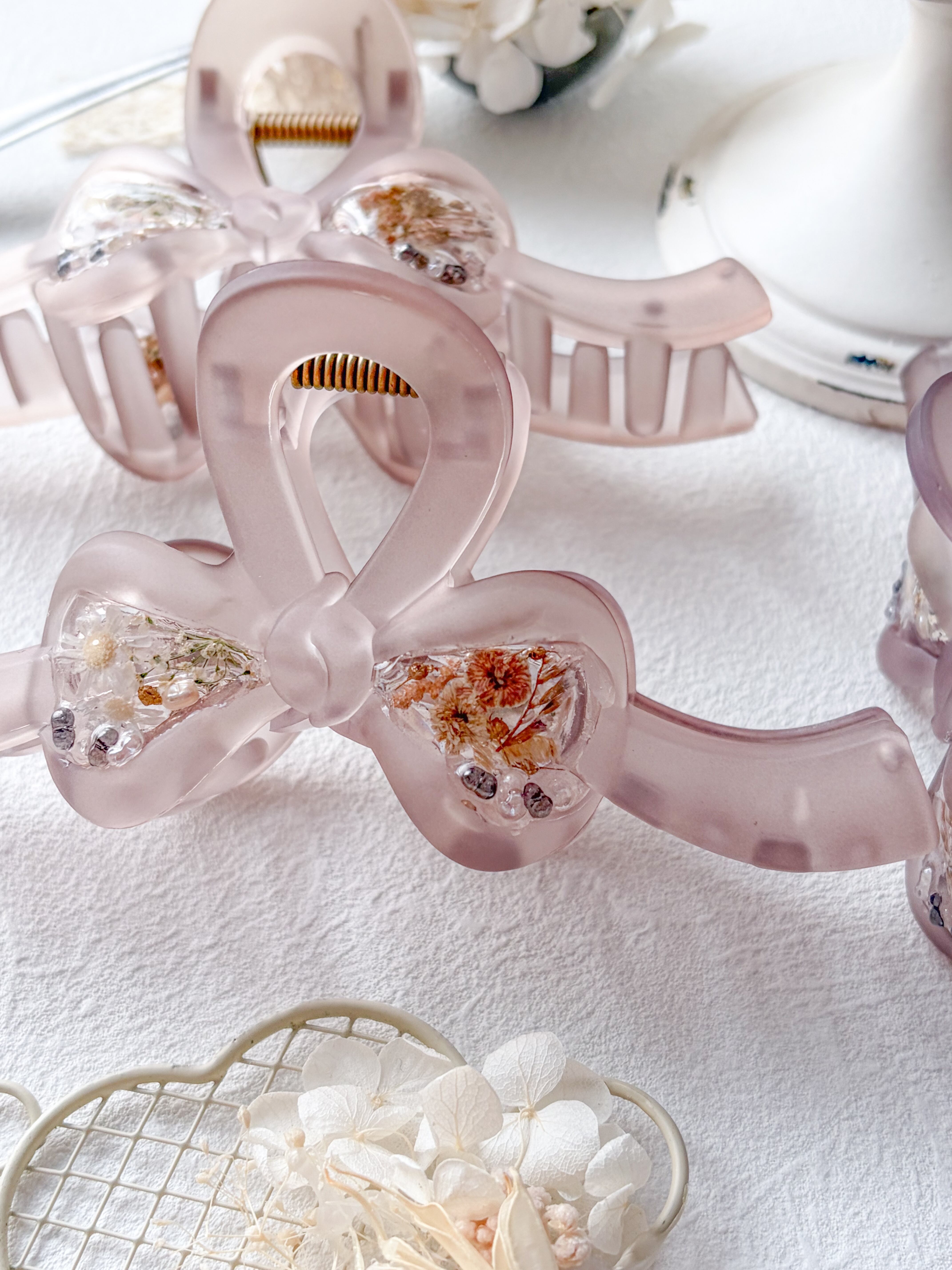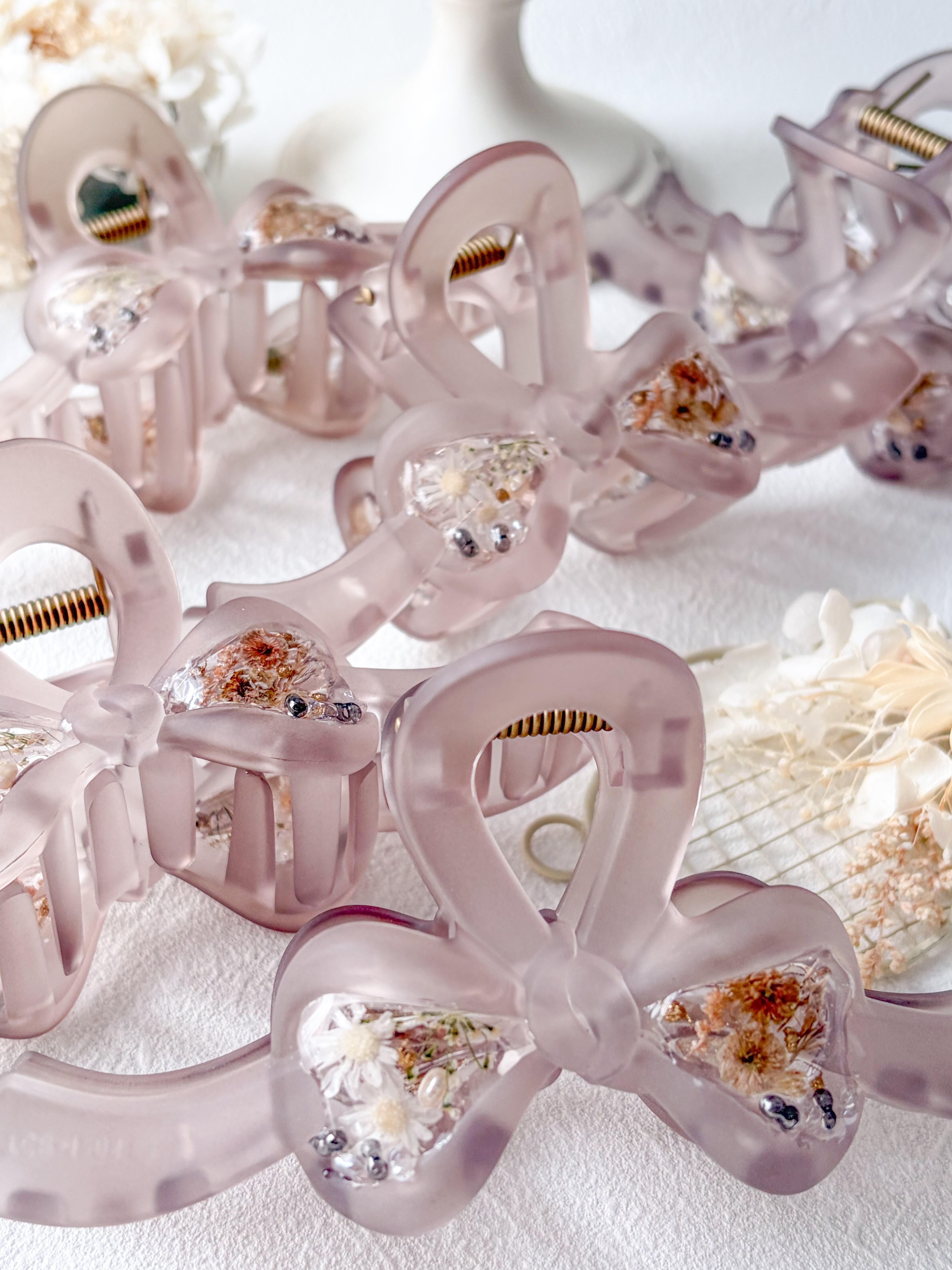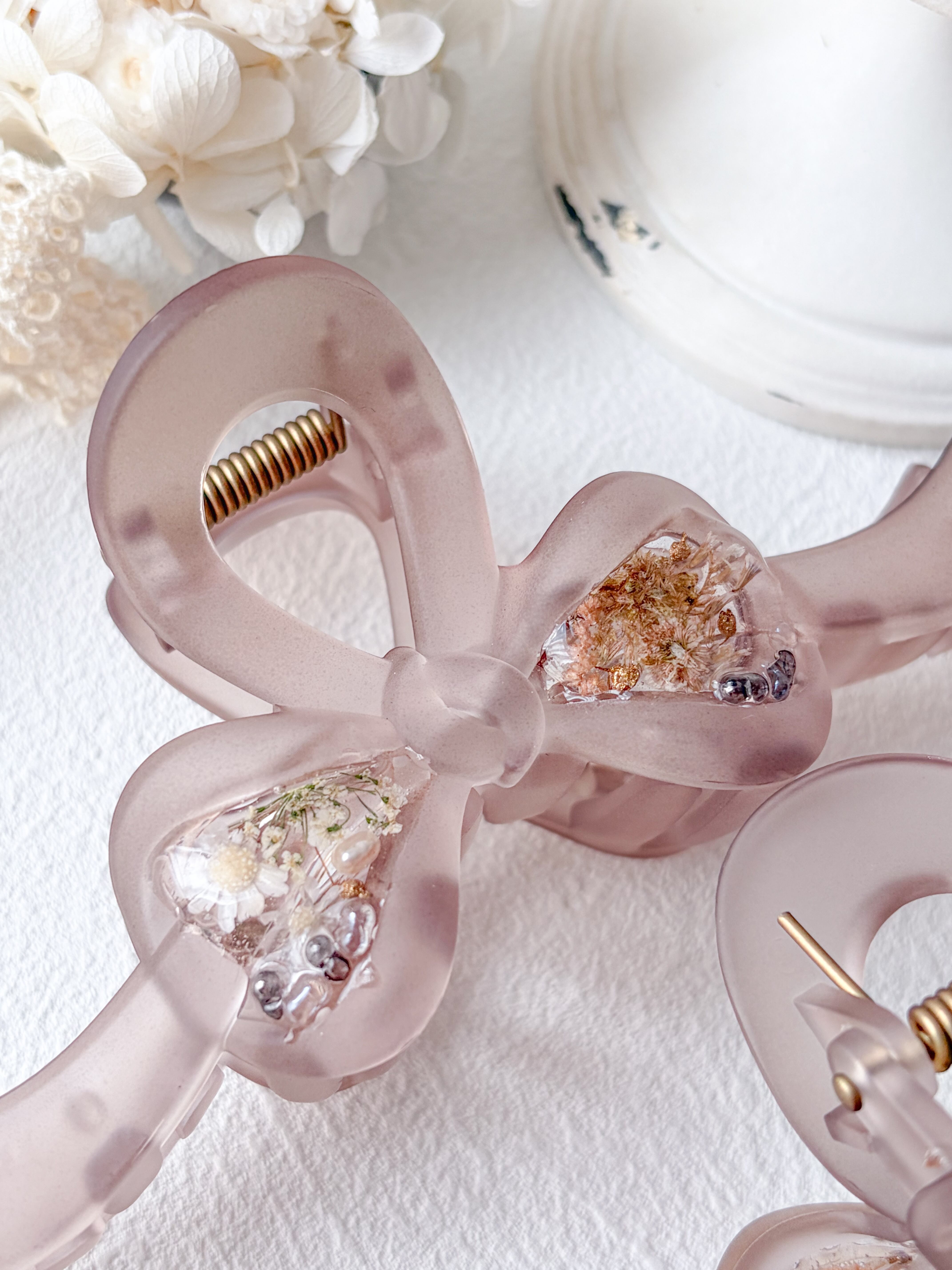 ふわっとした色味できちんとまとめてくれるスフレみたいな大人かわいいリボンバンスクリップ。