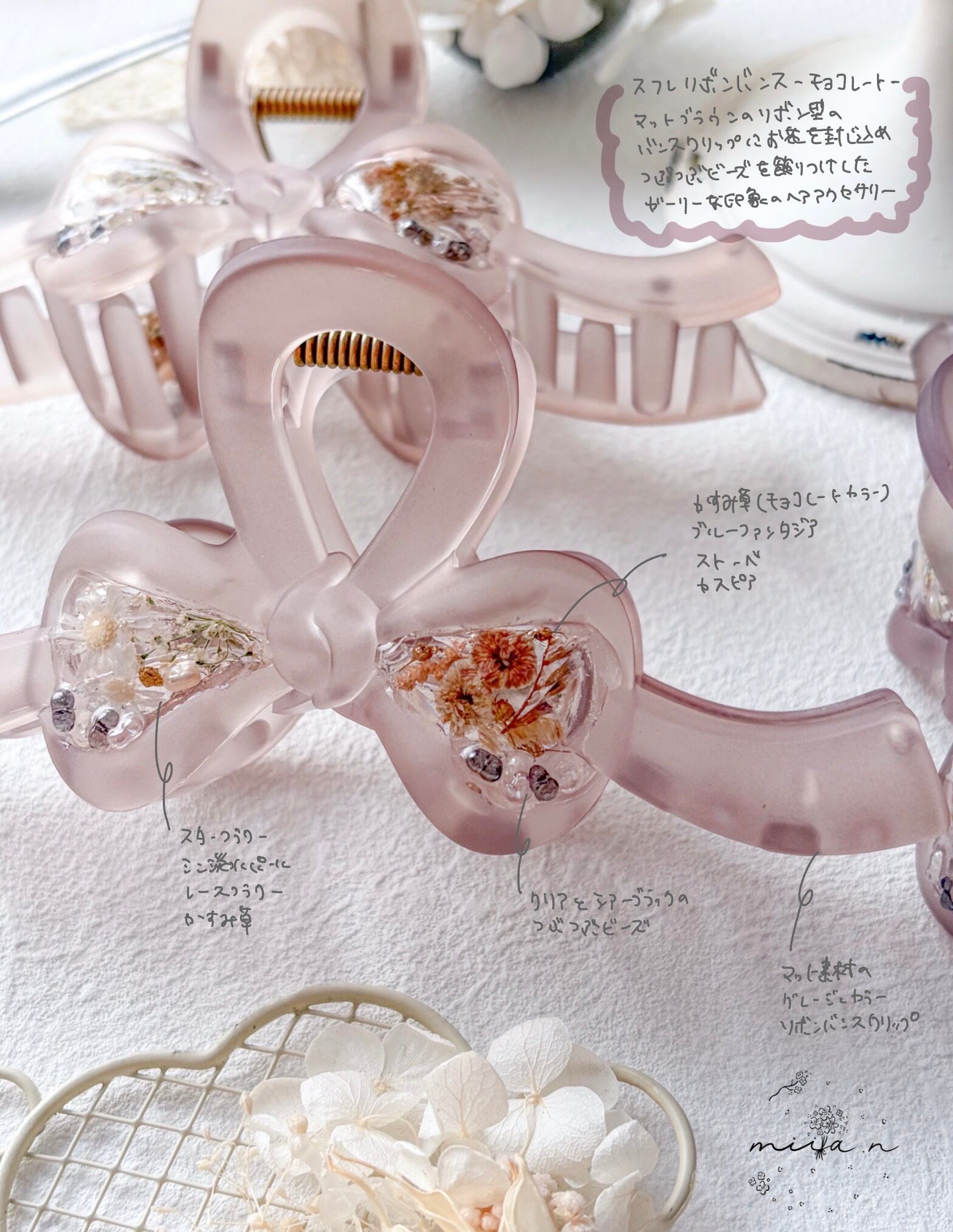 マットな質感で大人っぽいグレージュのようなお色味で中に封入したお花もチョコレートカラーで揃えました。