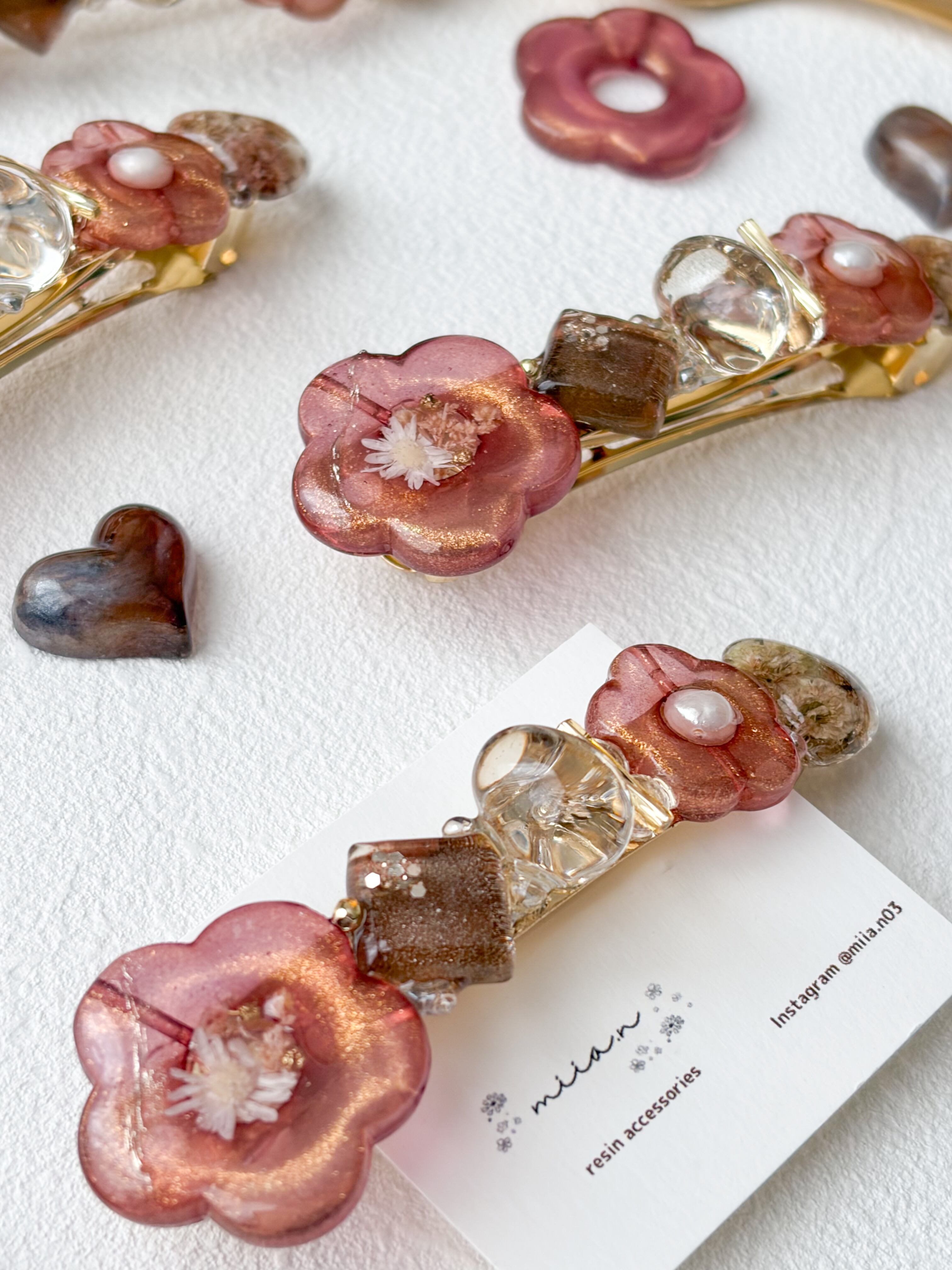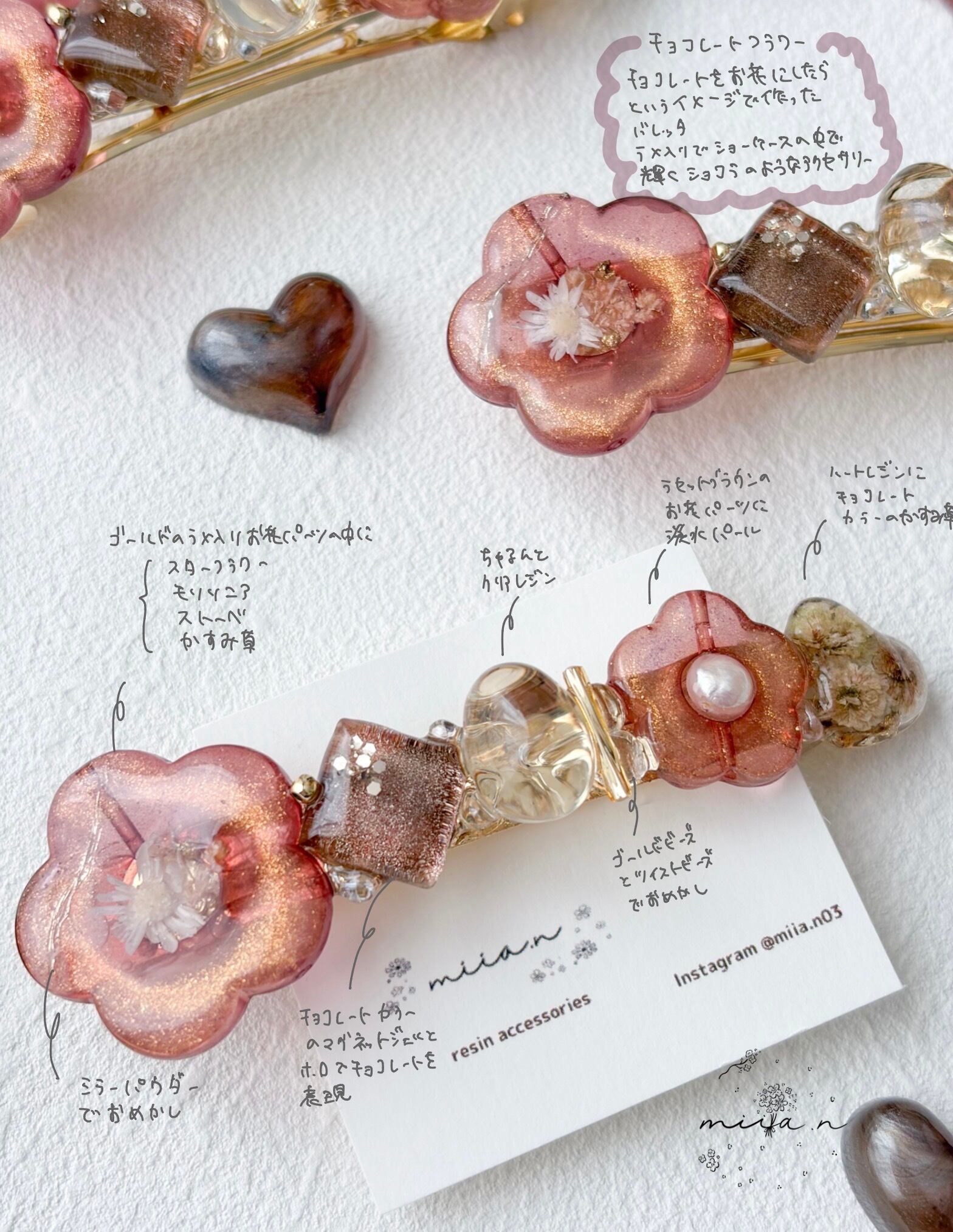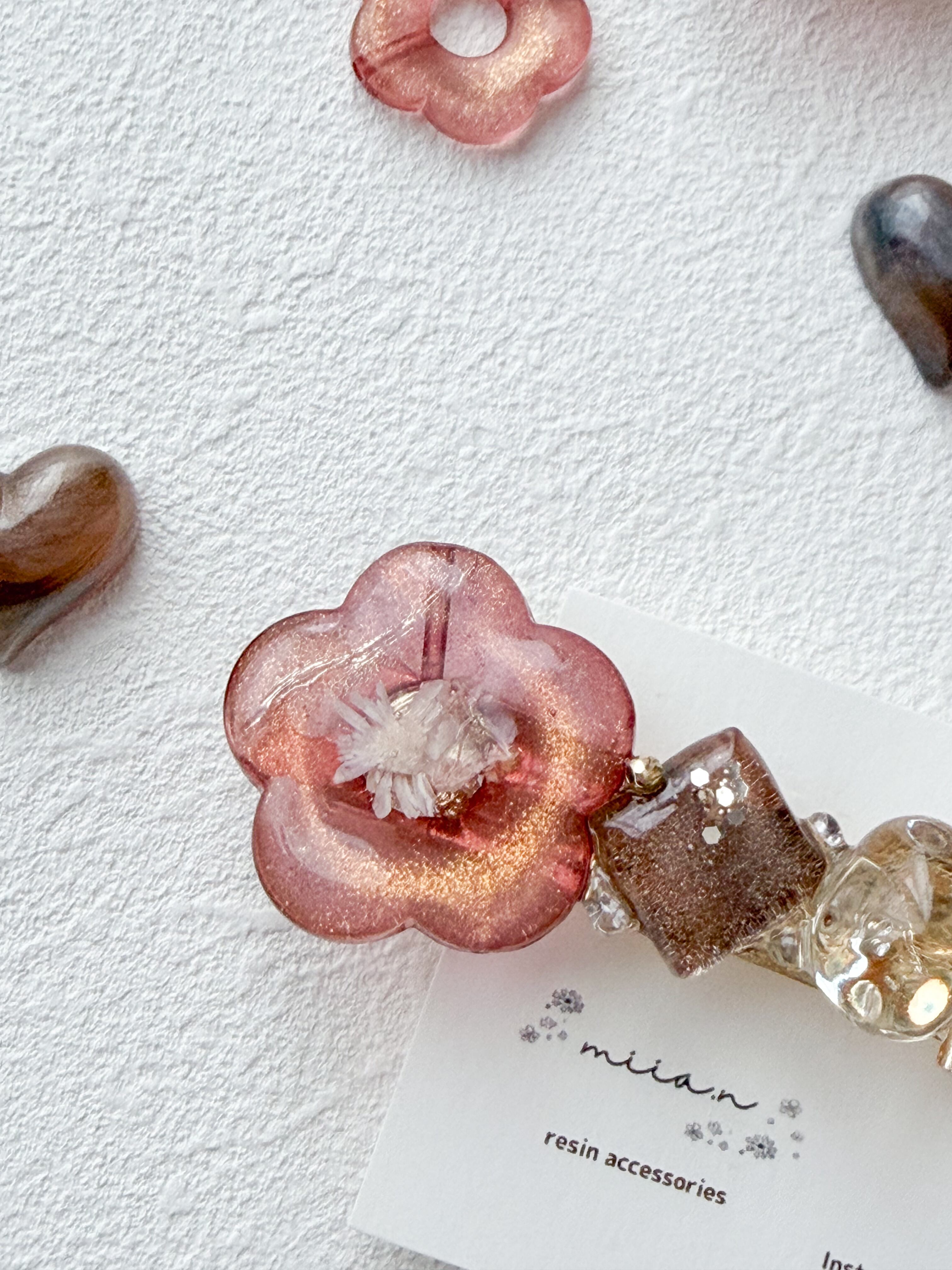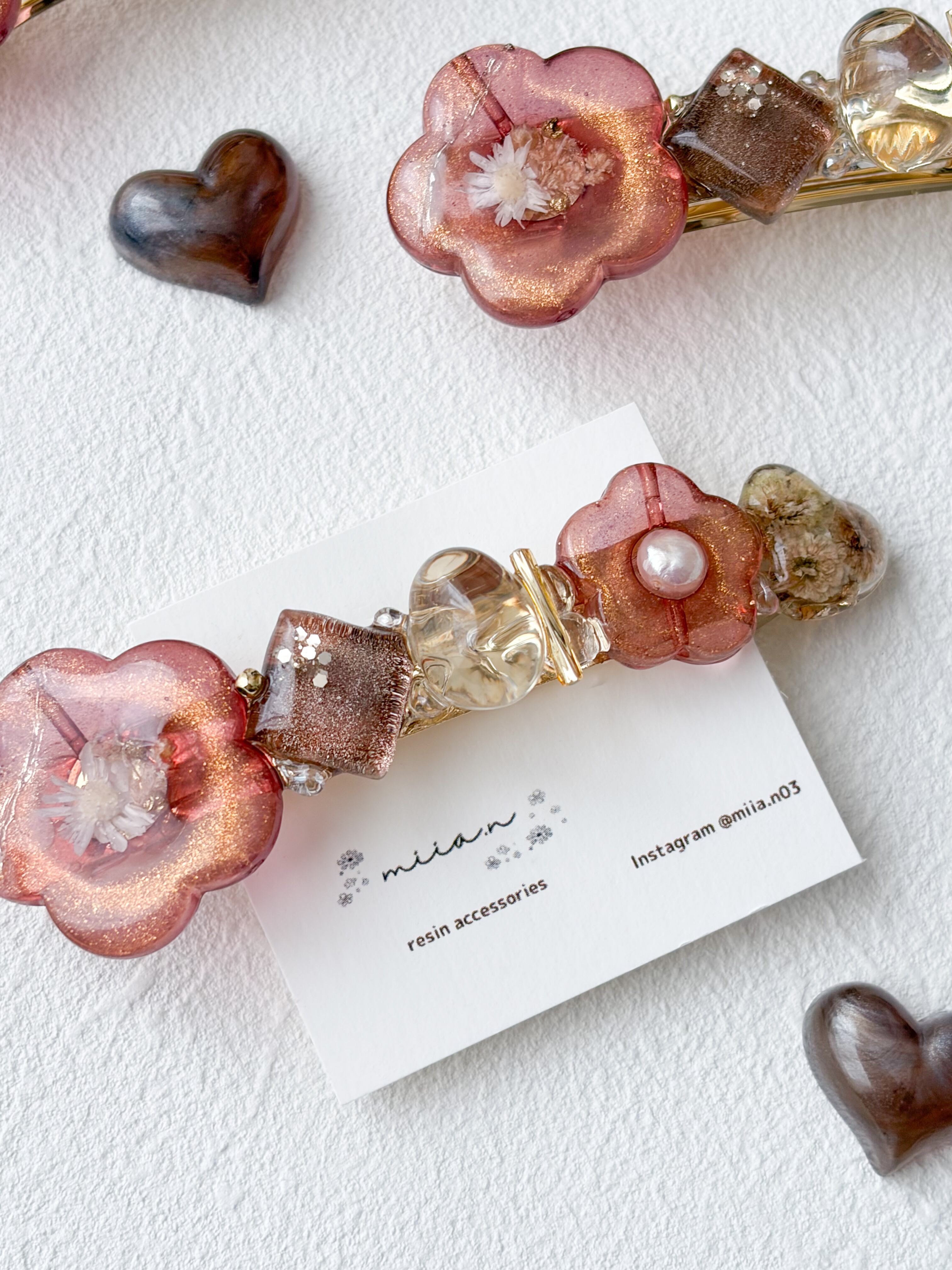 赤みのあるチョコレートカラーのラメ入りのお花パーツにドライフラワーや淡水パールを封じ込めたりチョコレートカラーのかすみ草のハートレジンやショコラを表現したレジンパーツを組み合わせたバレッタです。