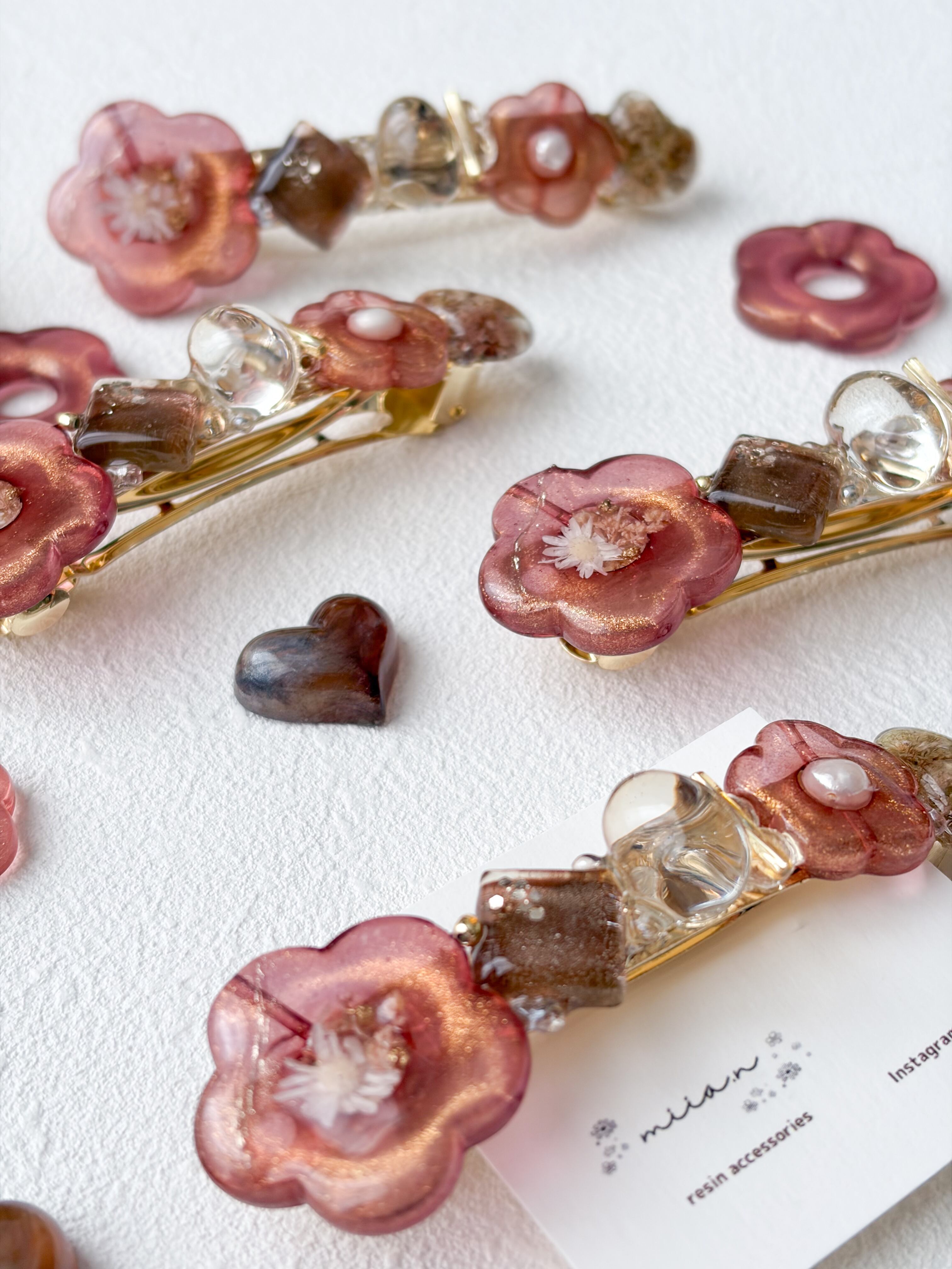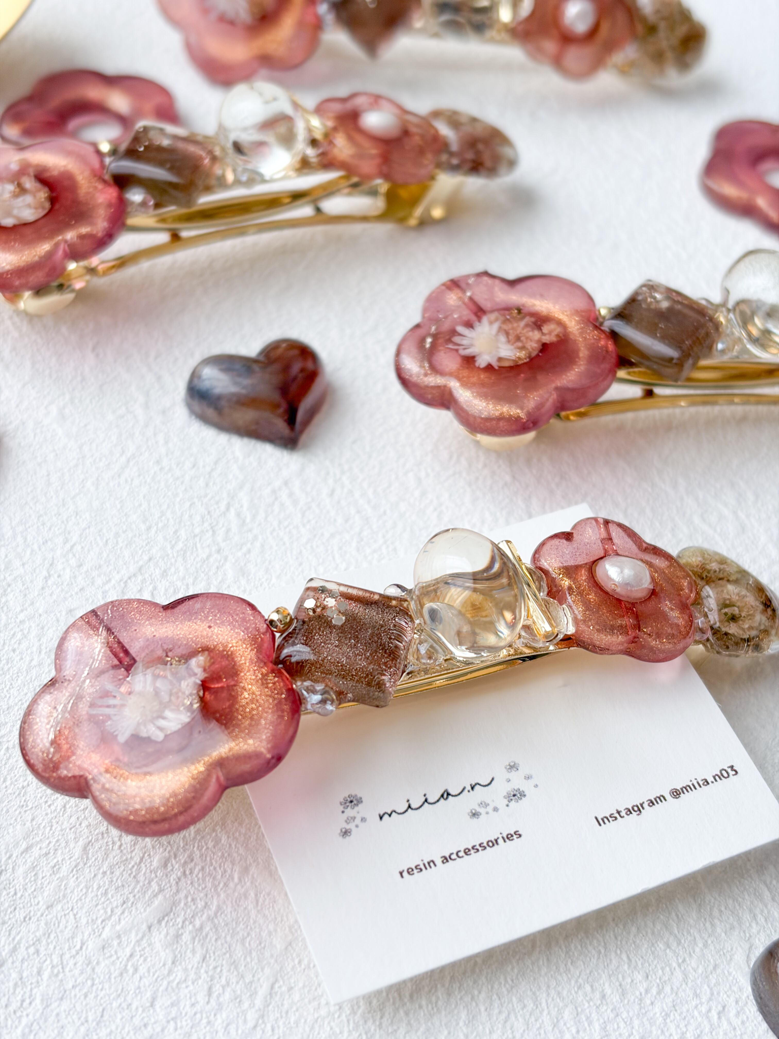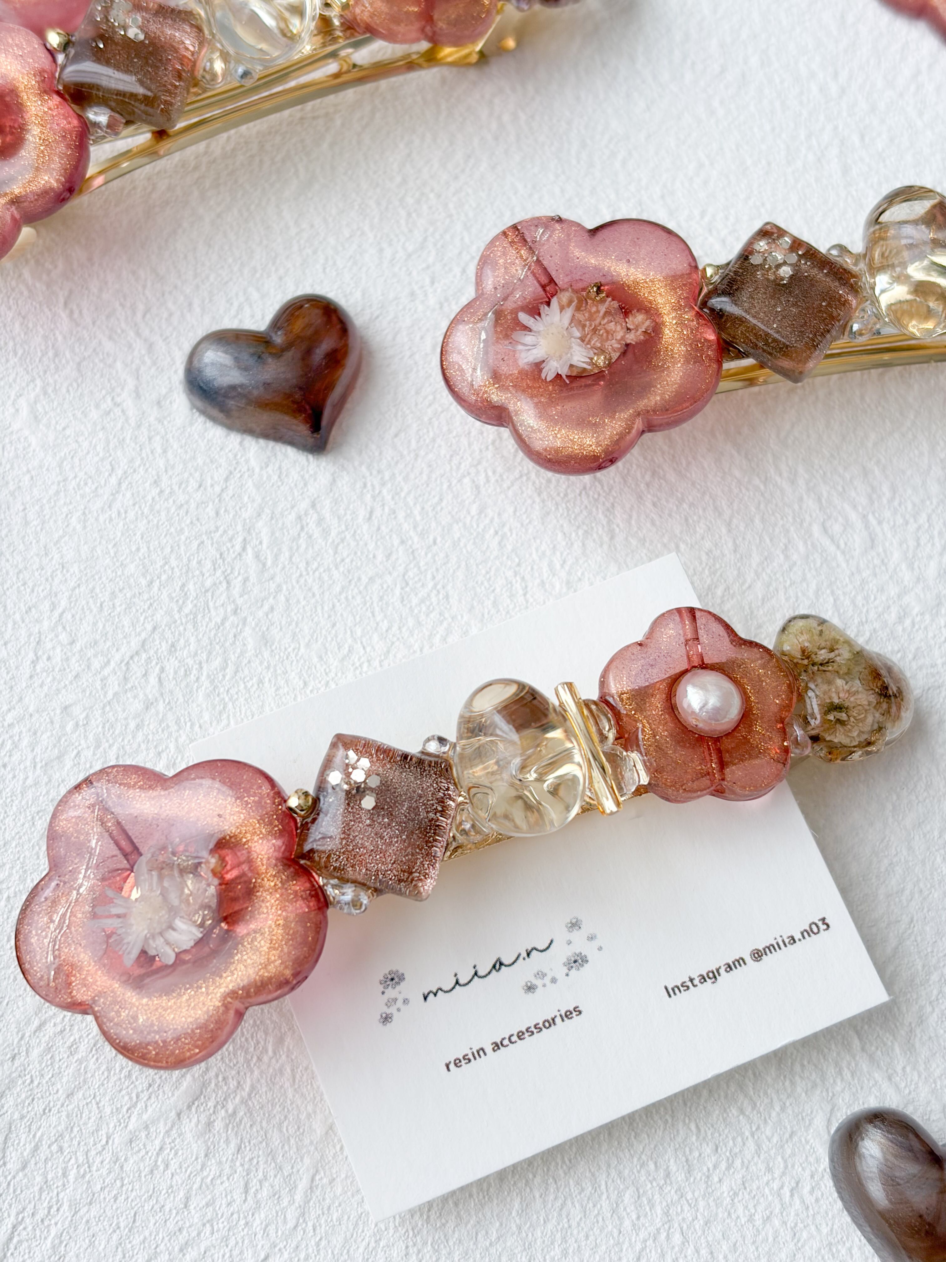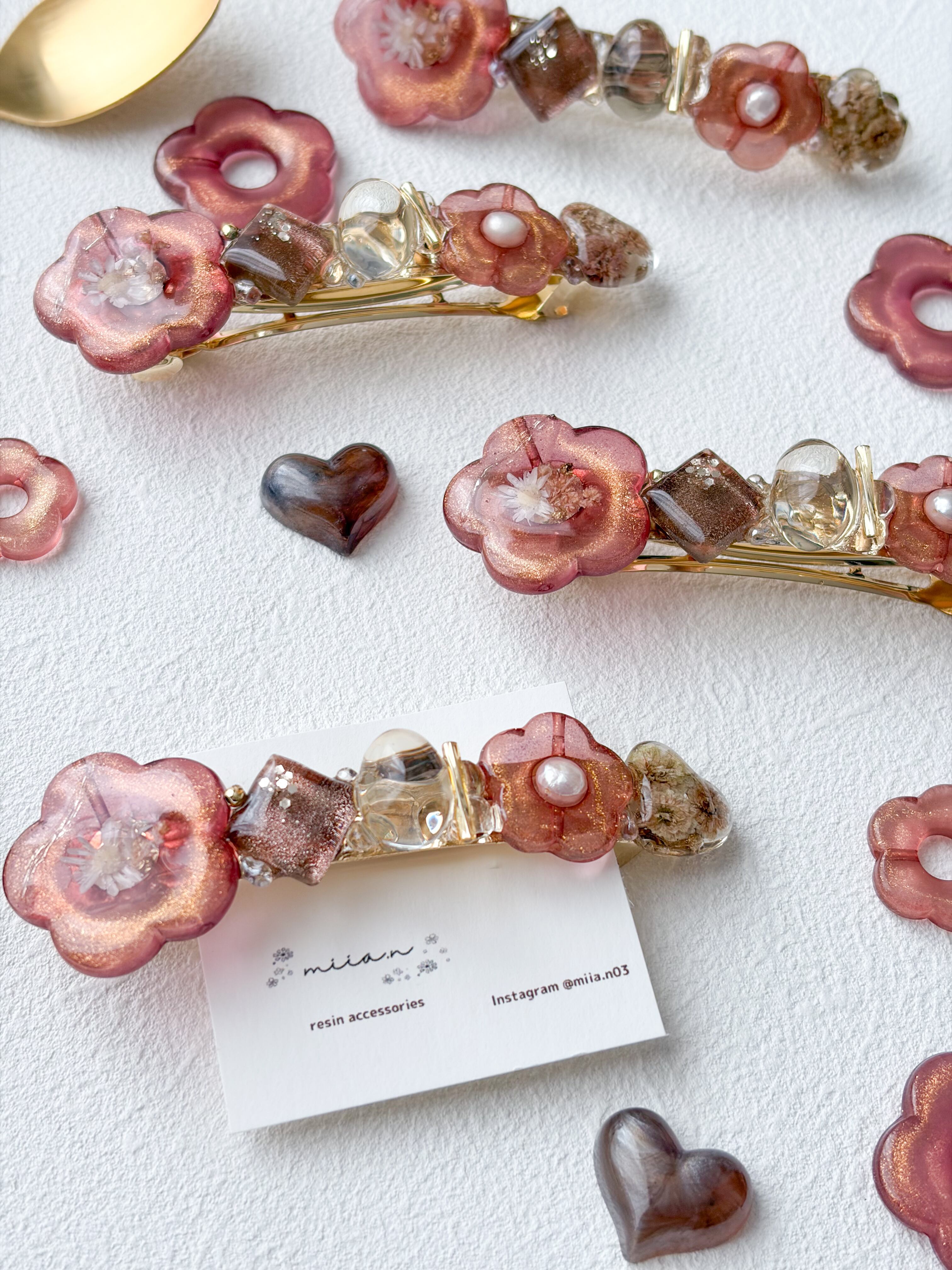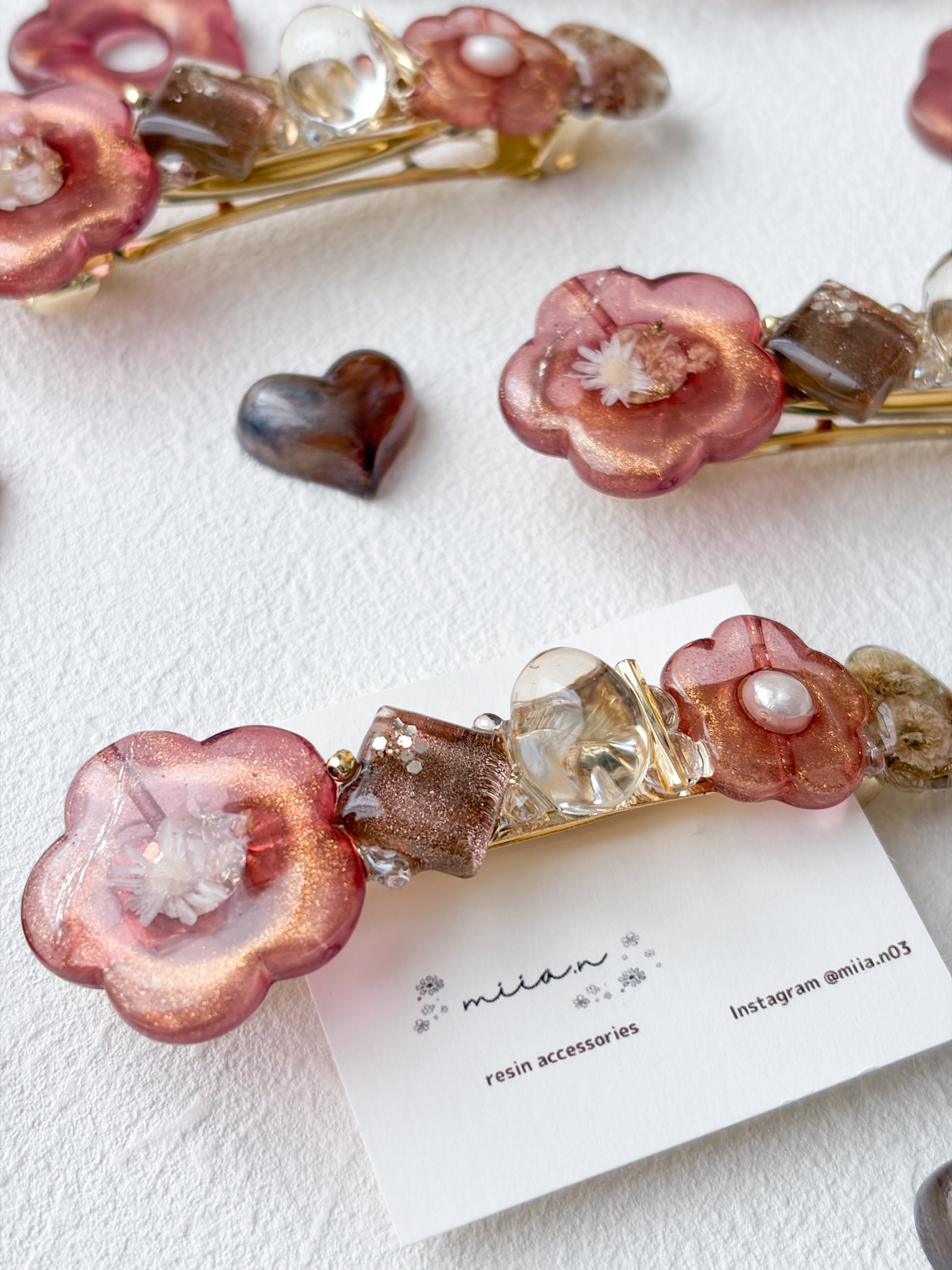 赤みのあるチョコレートカラーのラメ入りのお花パーツにドライフラワーや淡水パールを封じ込めたりチョコレートカラーのかすみ草のハートレジンやショコラを表現したレジンパーツを組み合わせたバレッタです。