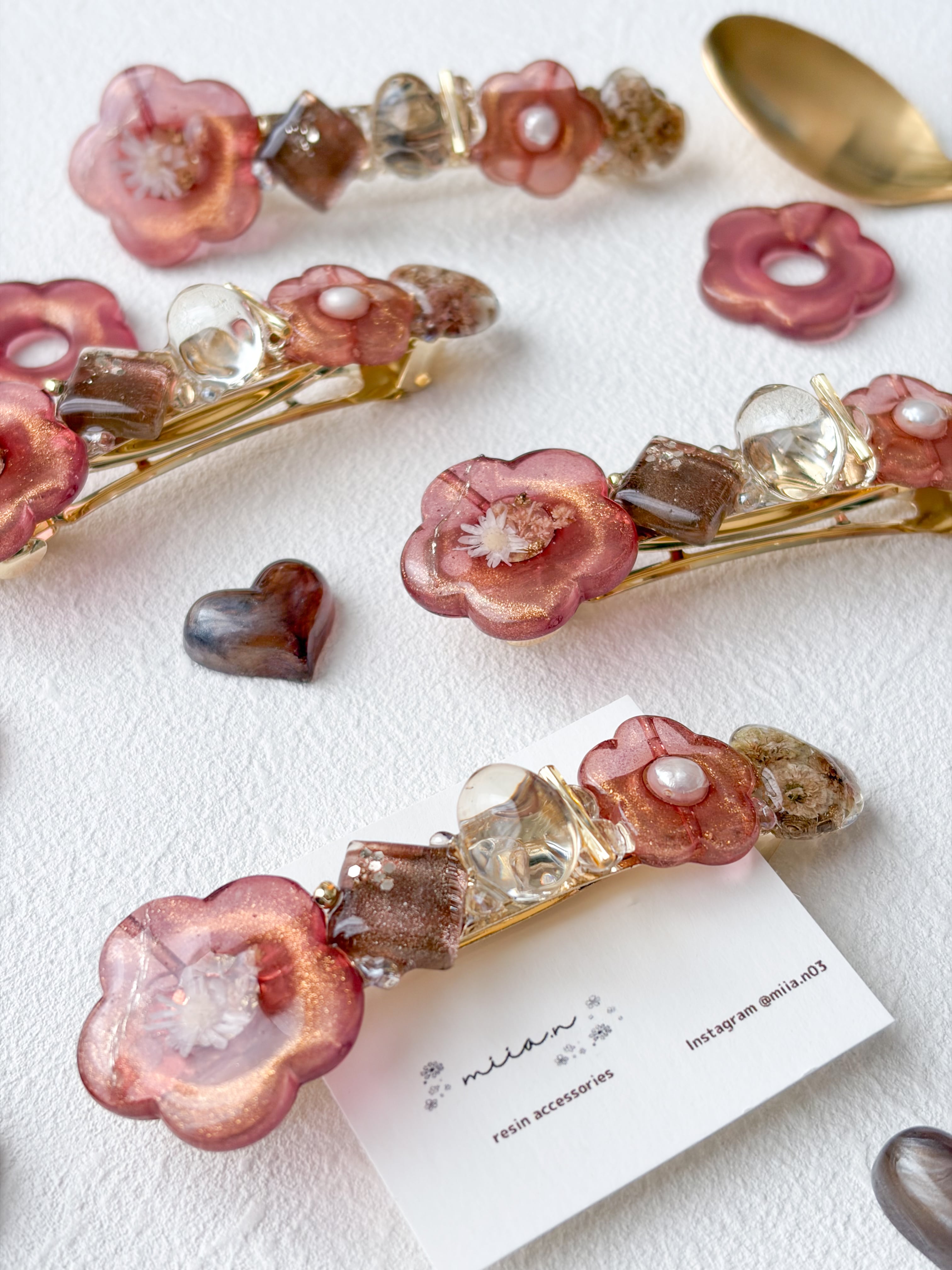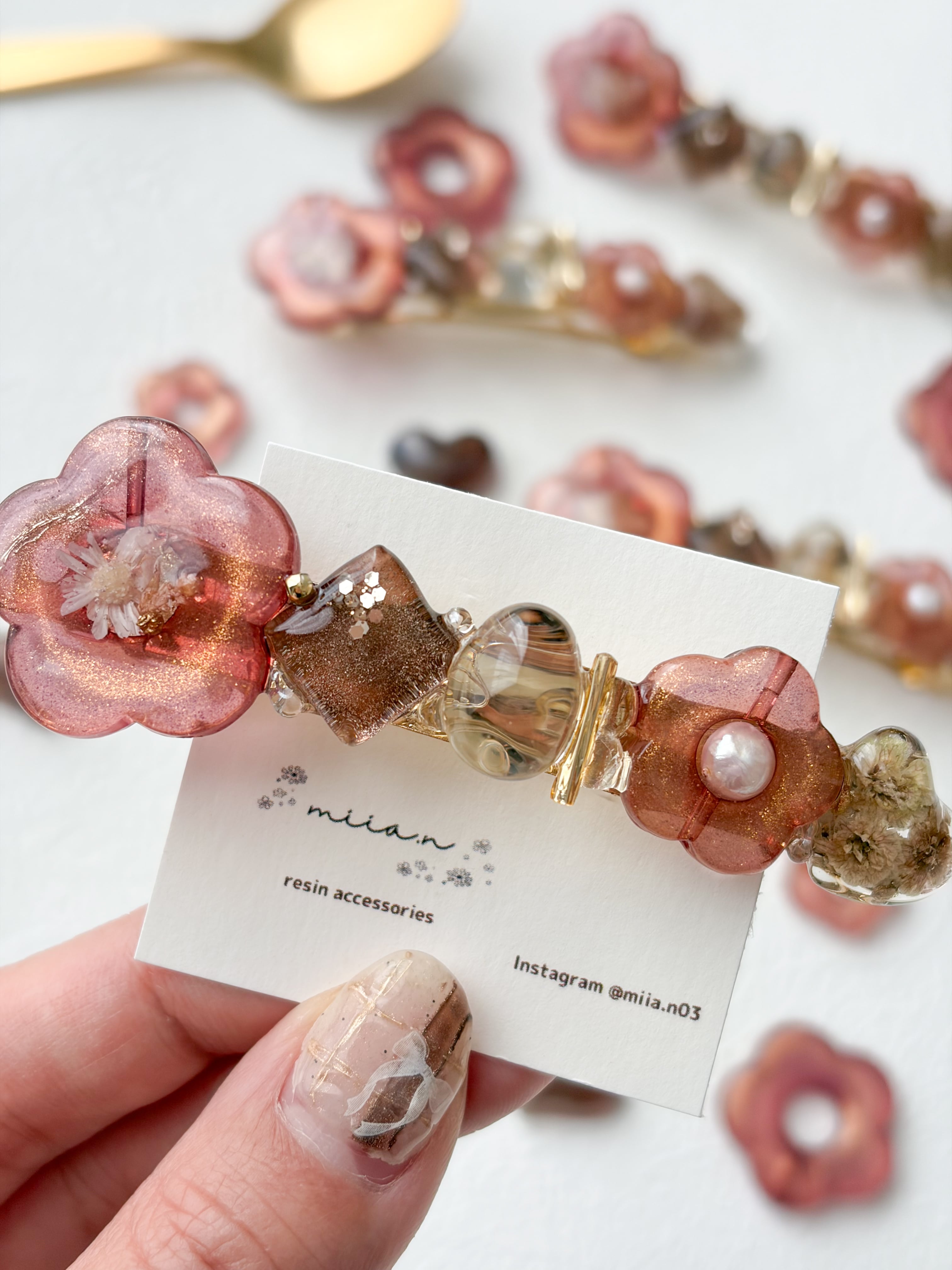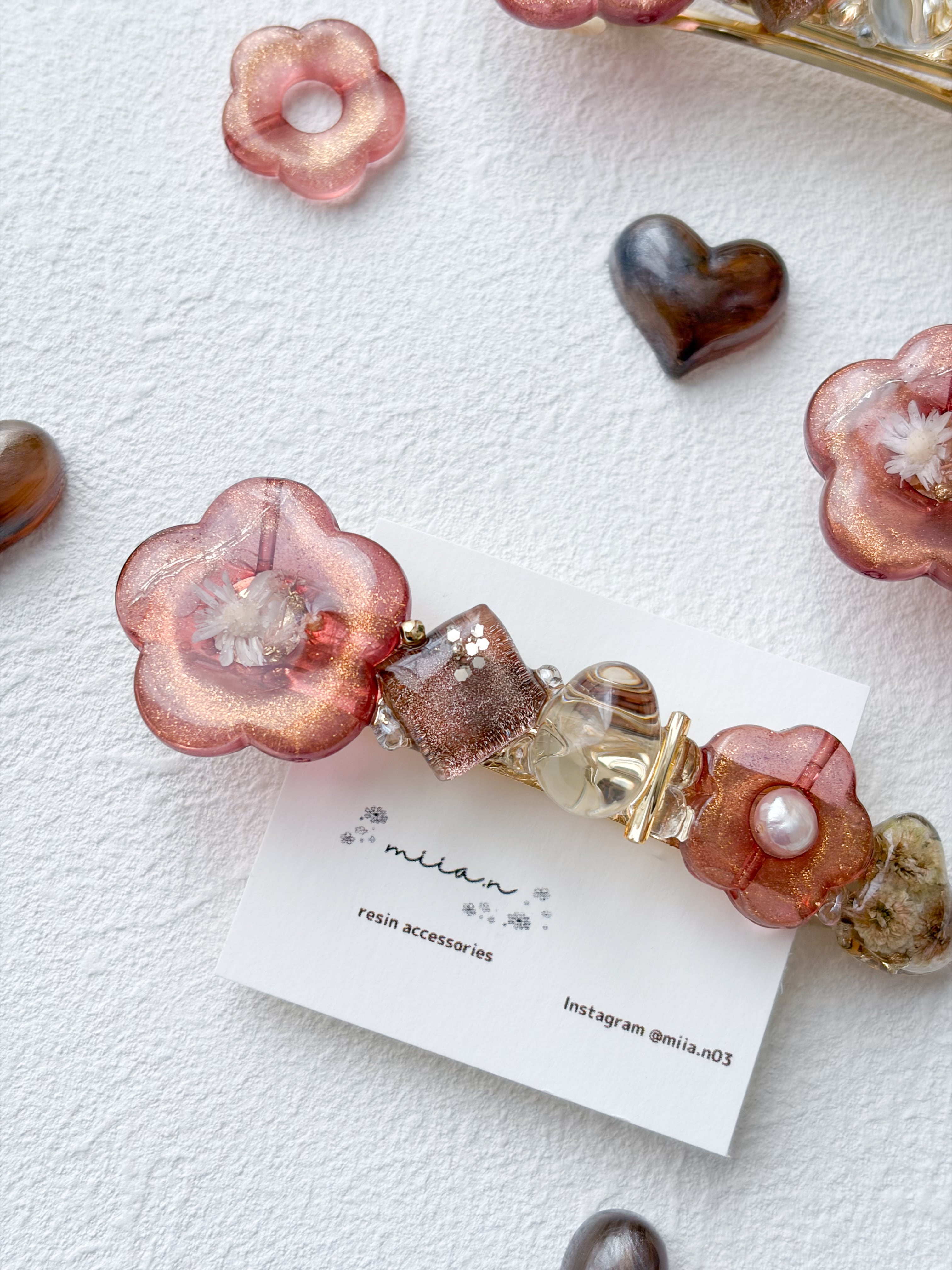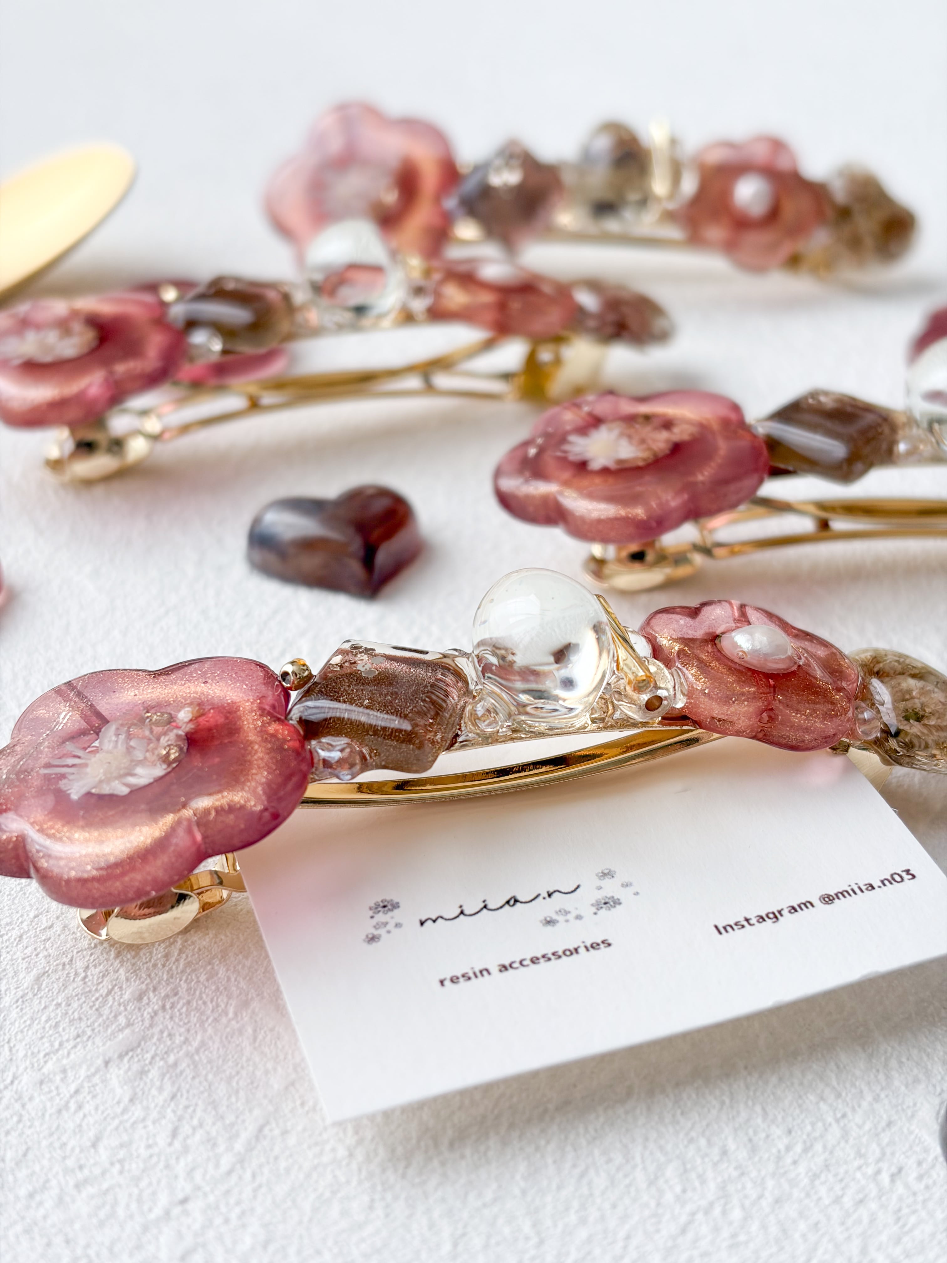 赤みのあるチョコレートカラーのラメ入りのお花パーツにドライフラワーや淡水パールを封じ込めたりチョコレートカラーのかすみ草のハートレジンやショコラを表現したレジンパーツを組み合わせたバレッタです。