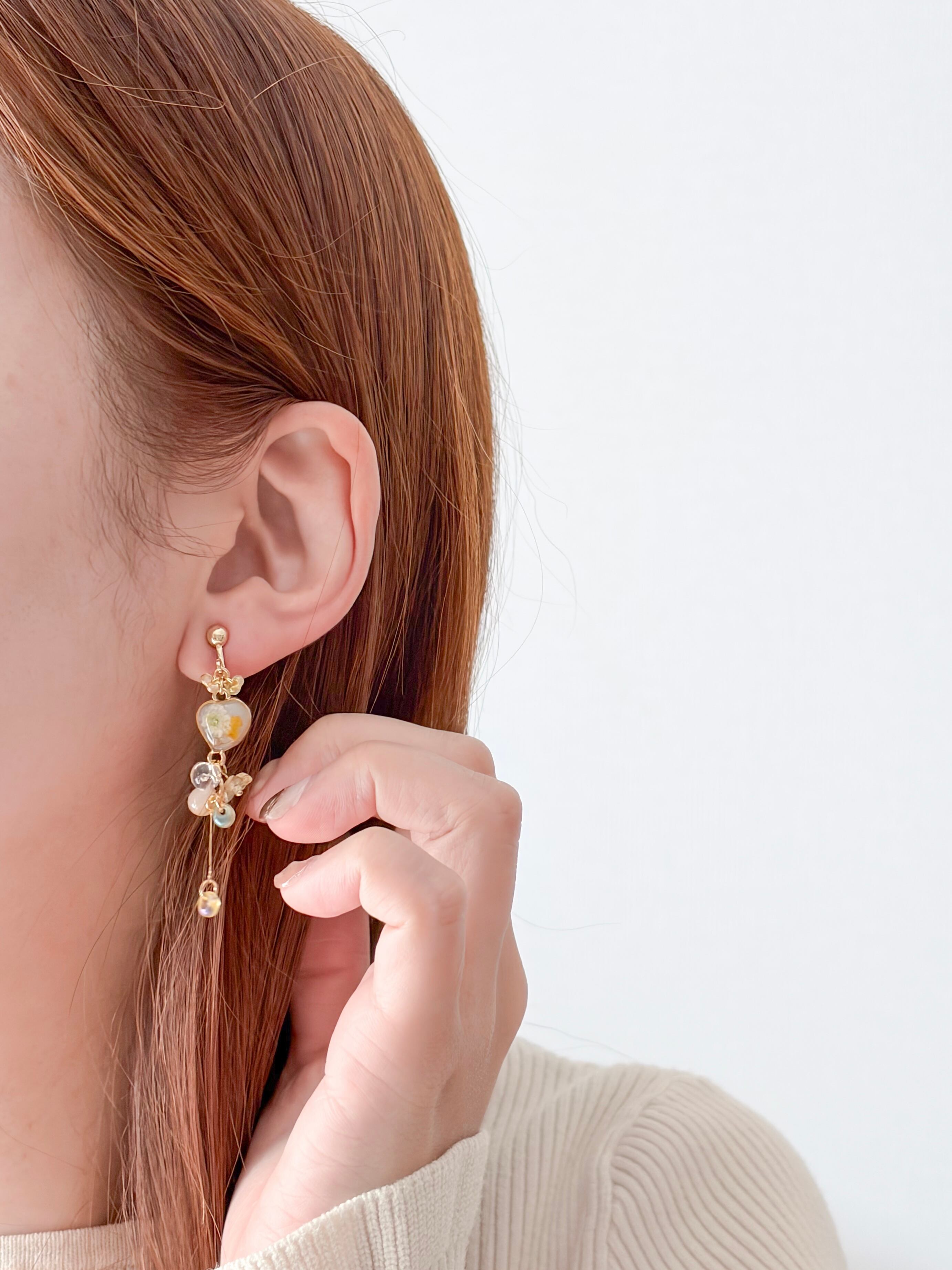 オーロラ加工のビーズも使っているので揺れる度にお顔周りを明るく見せてくれるデザインです。