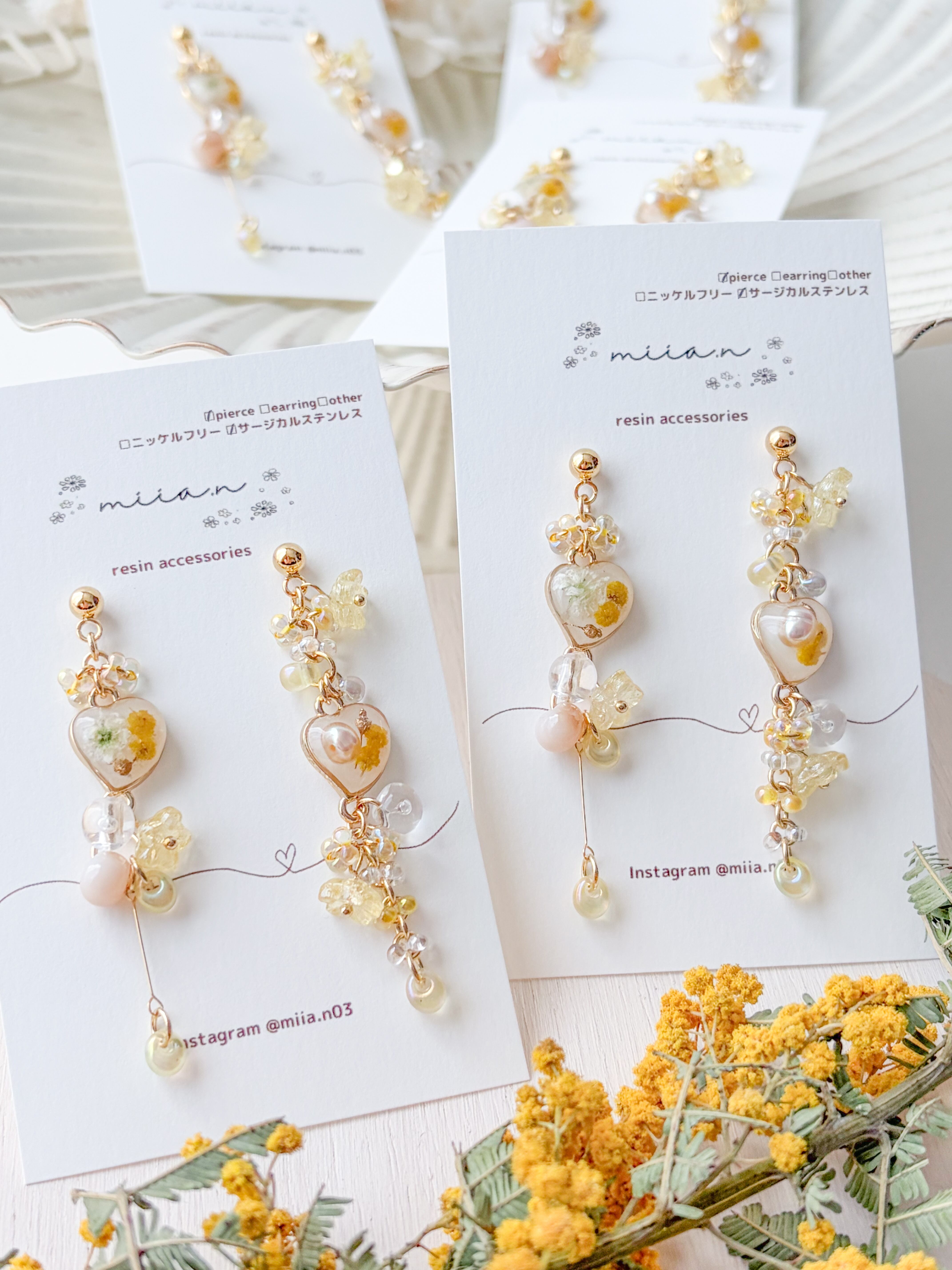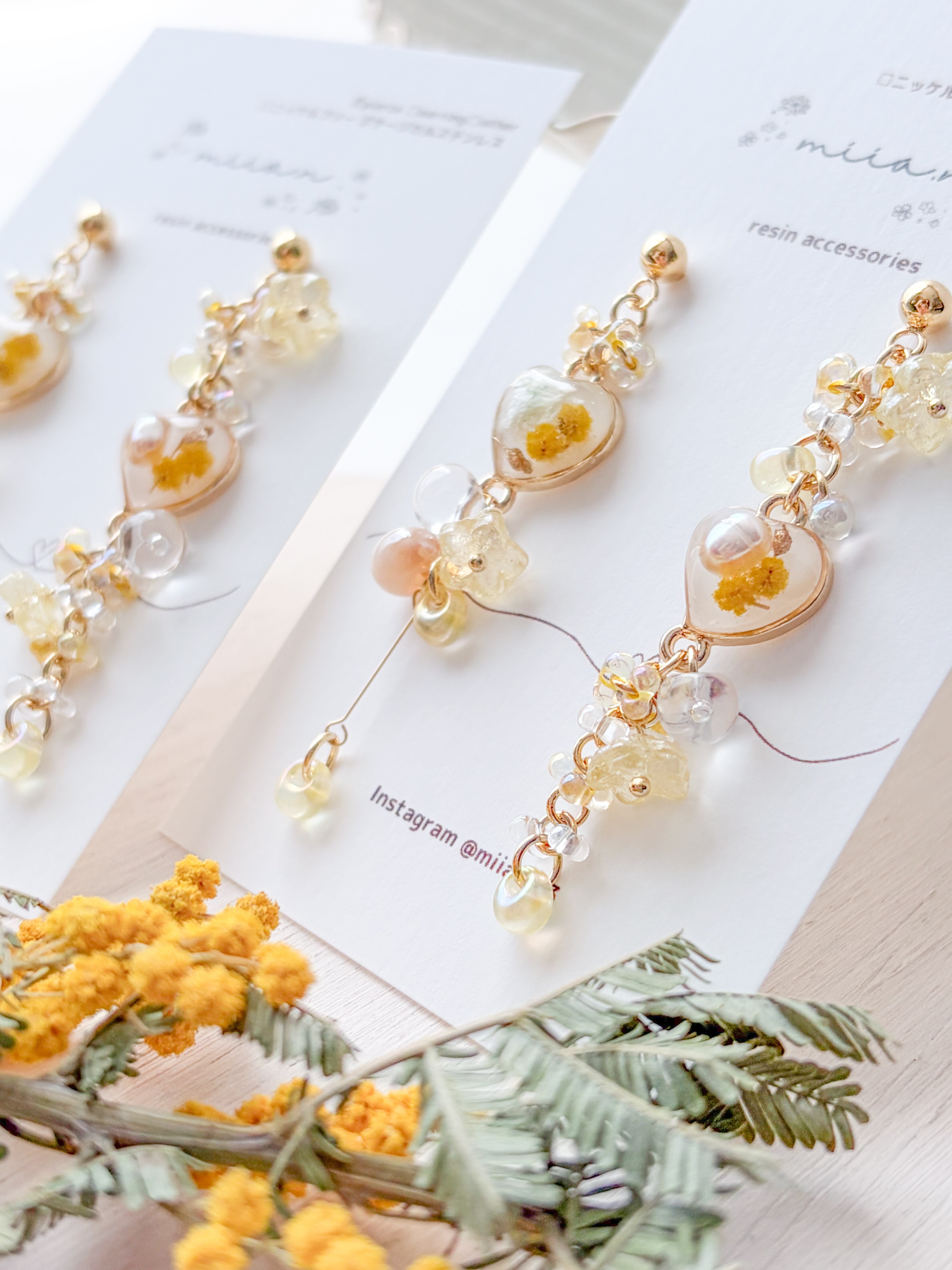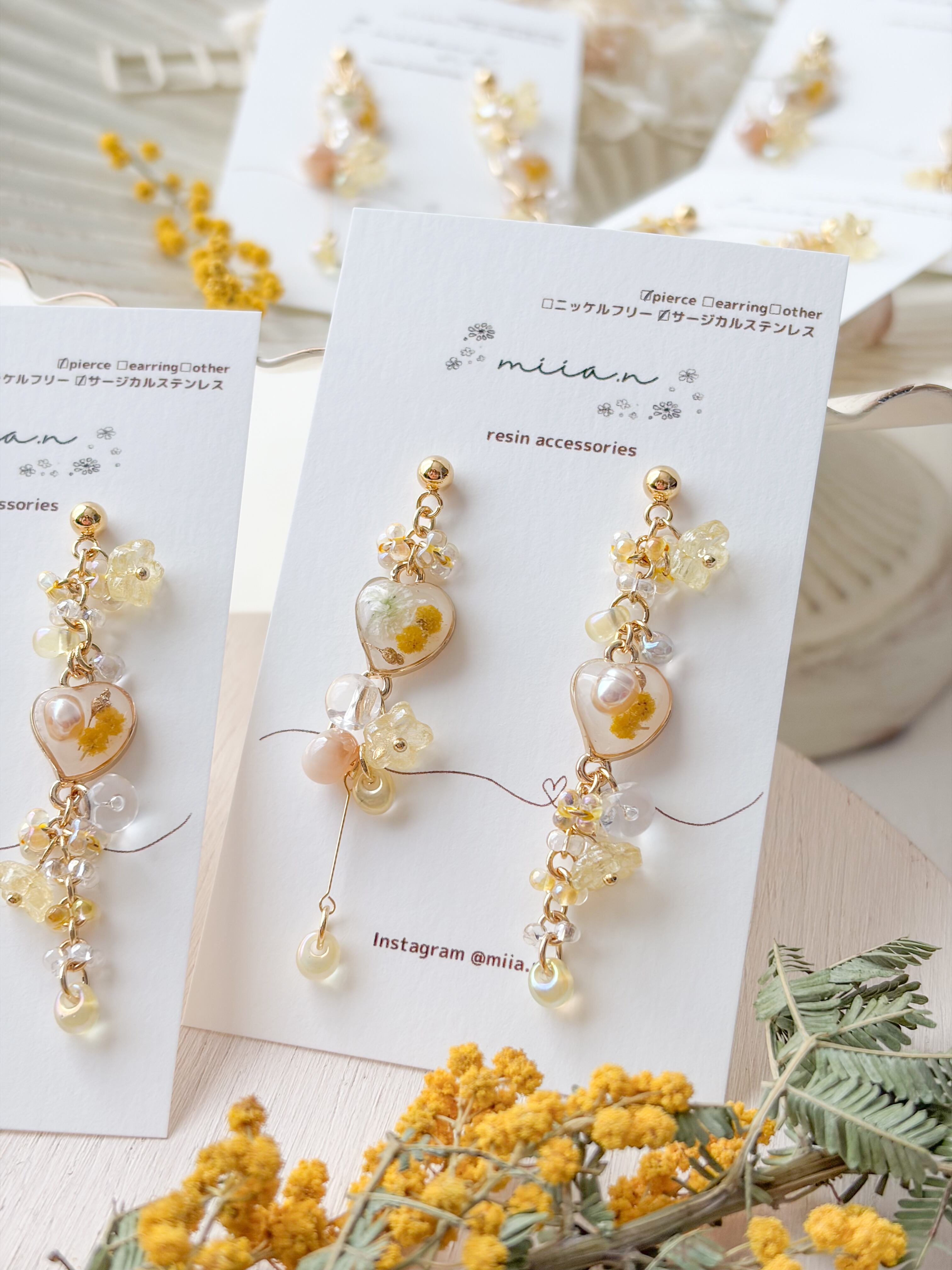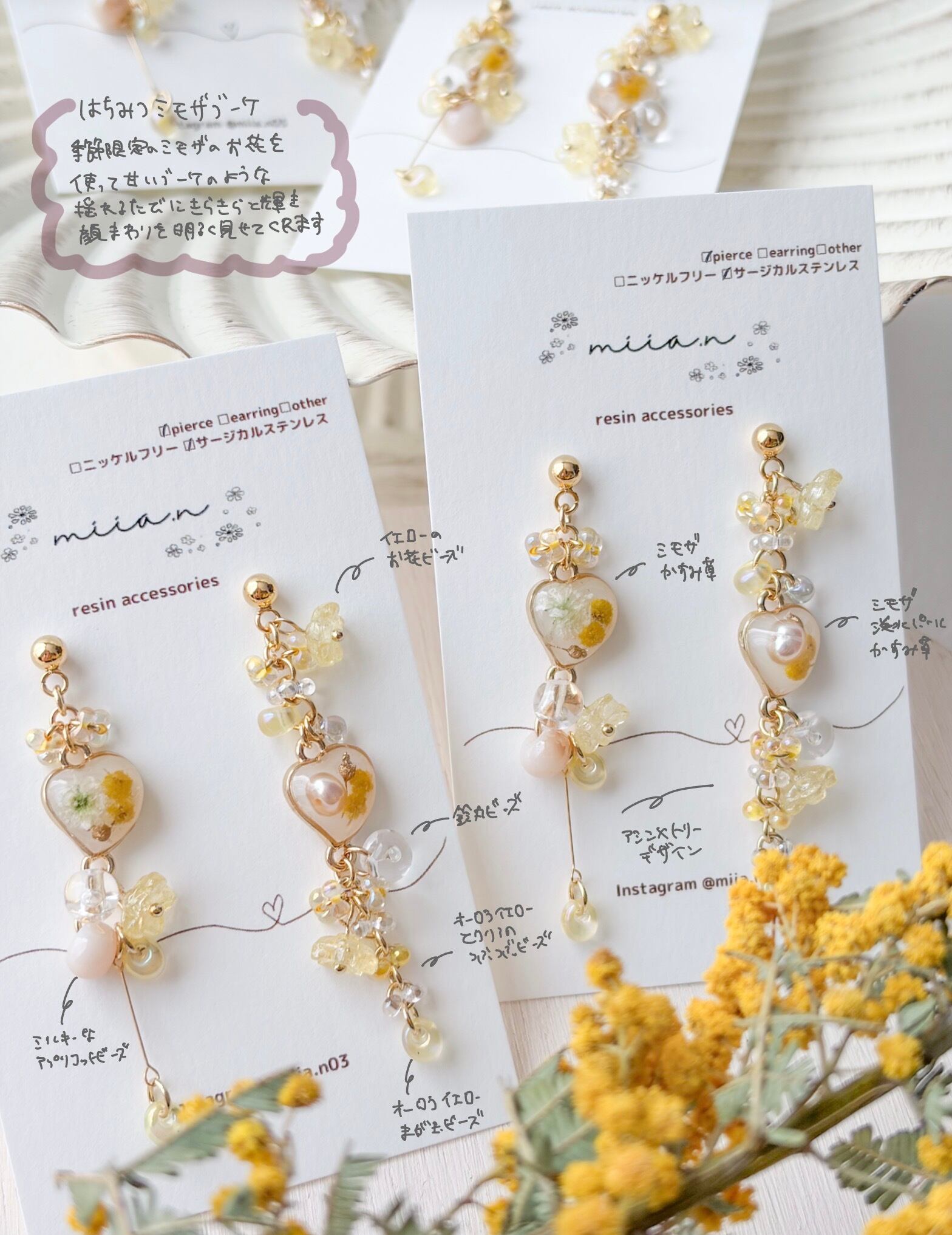 春の訪れを告げるミモザを優しい色合いでまとめた季節限定アクセサリー。