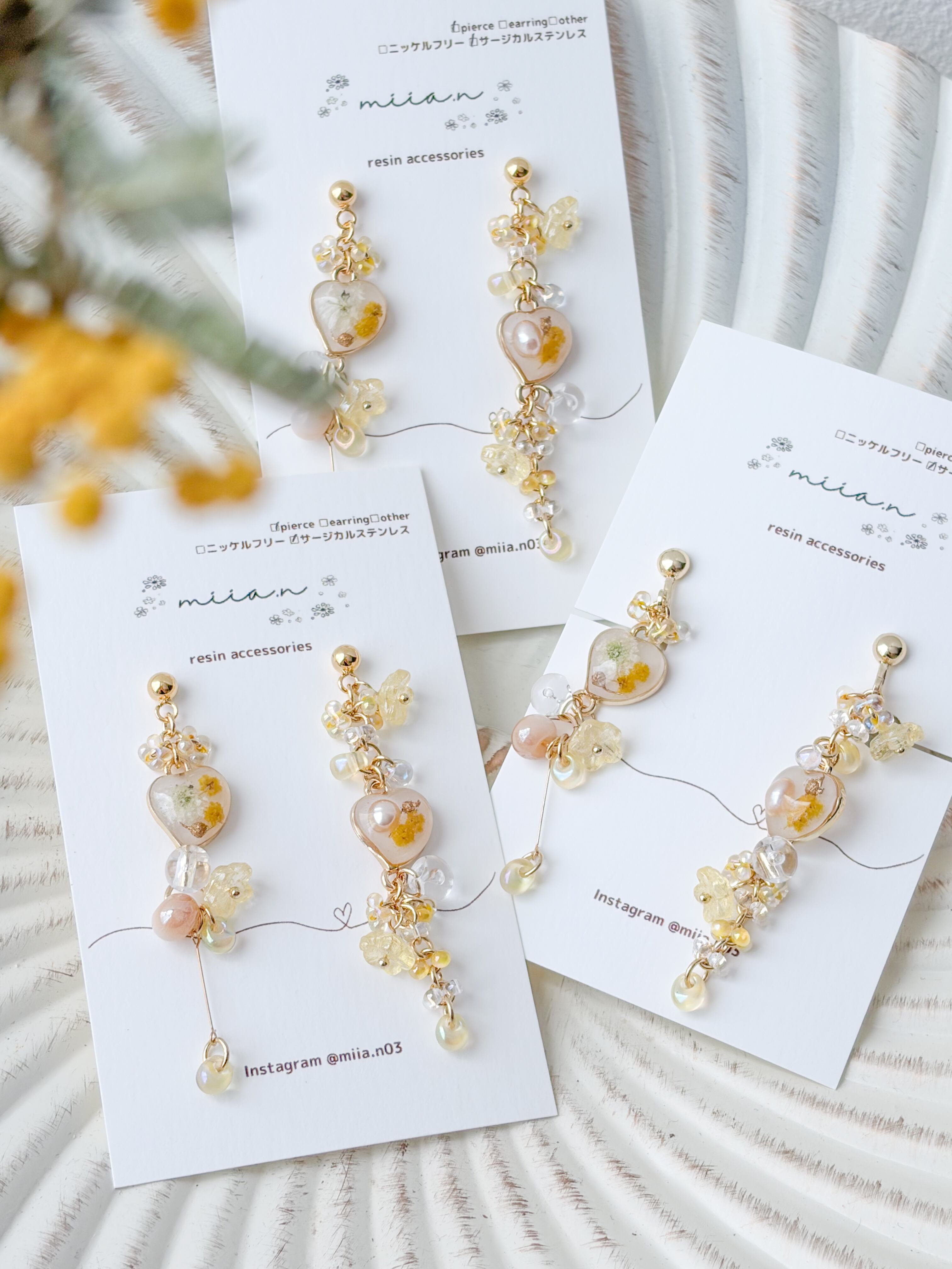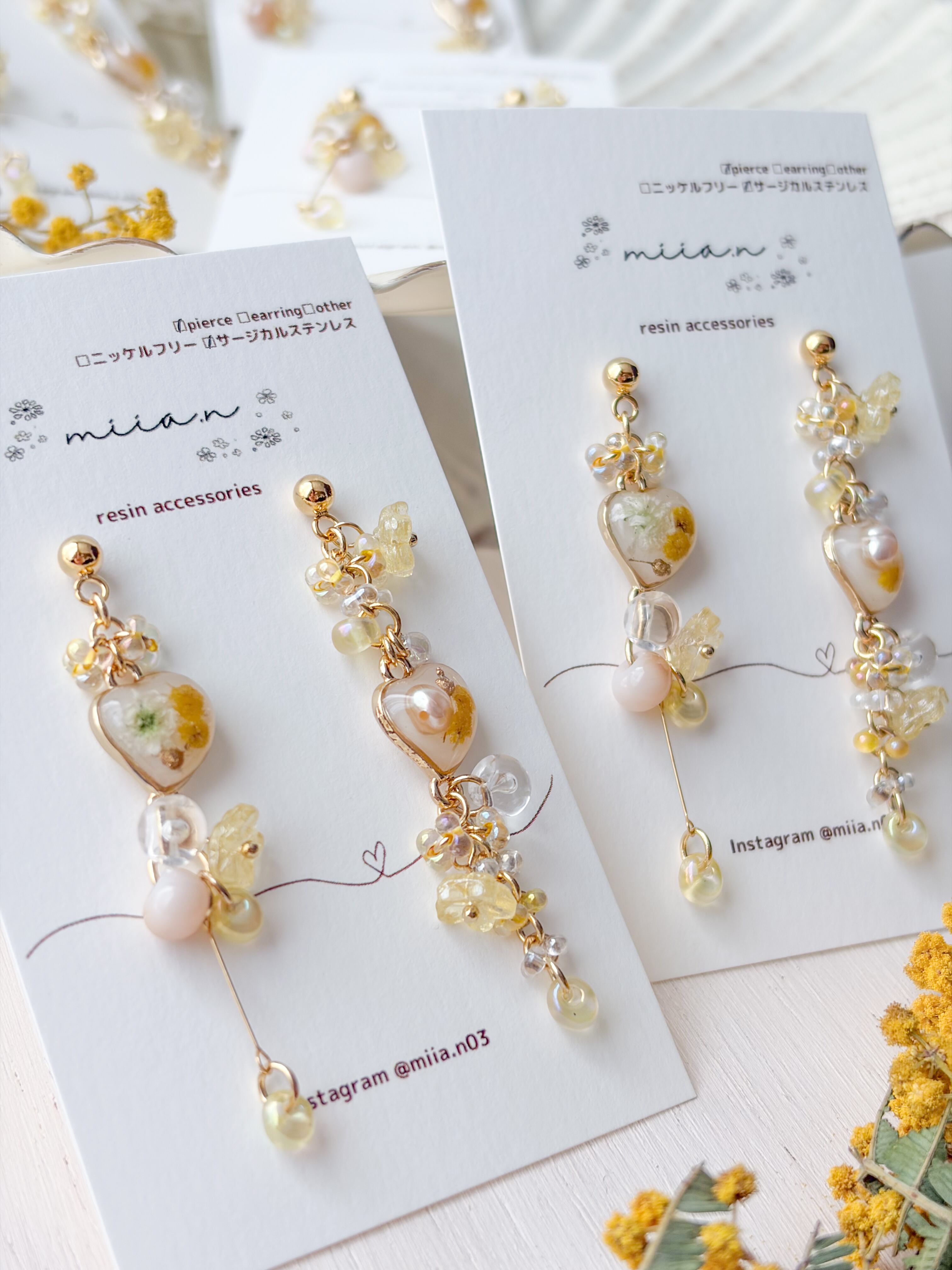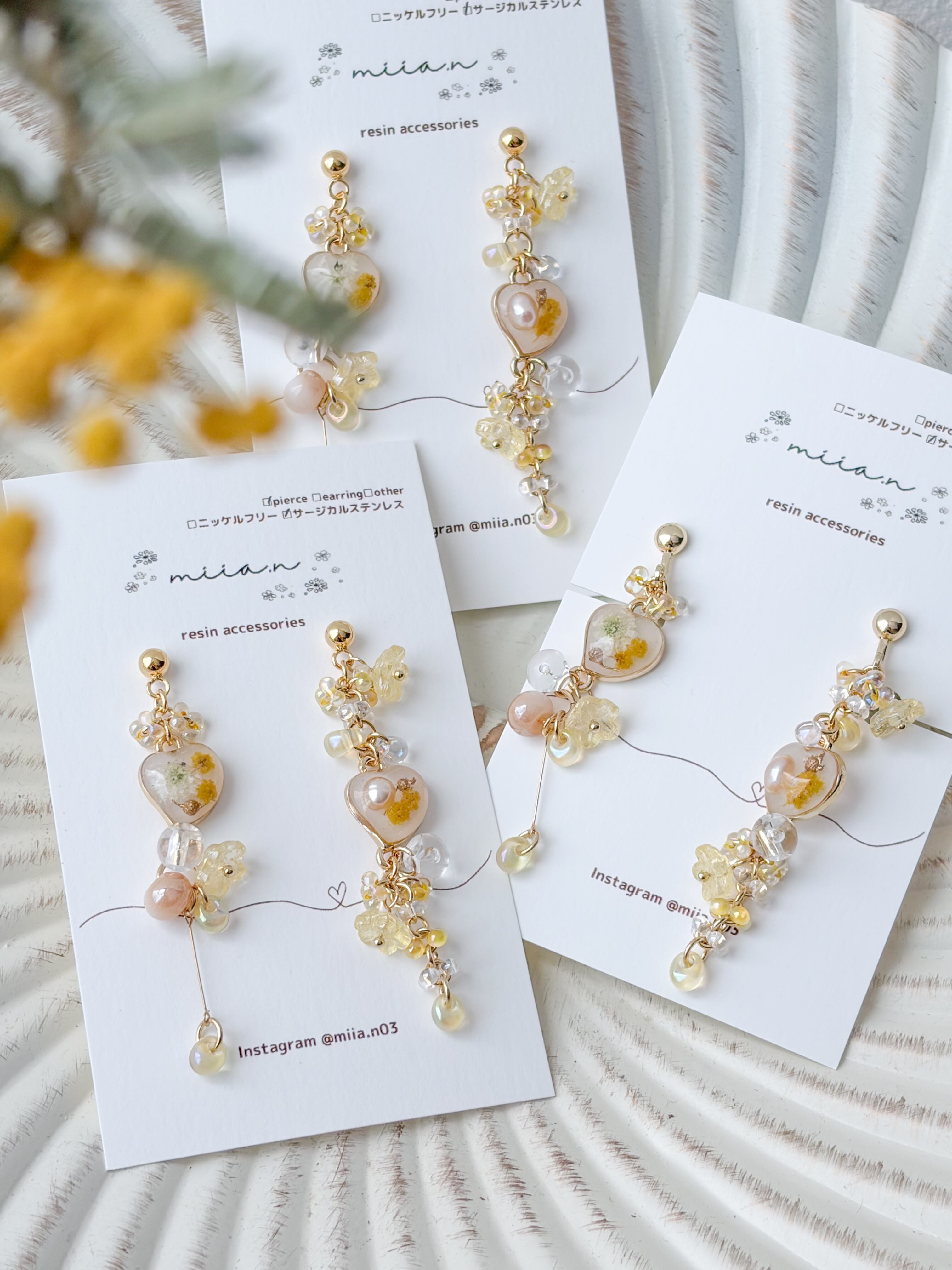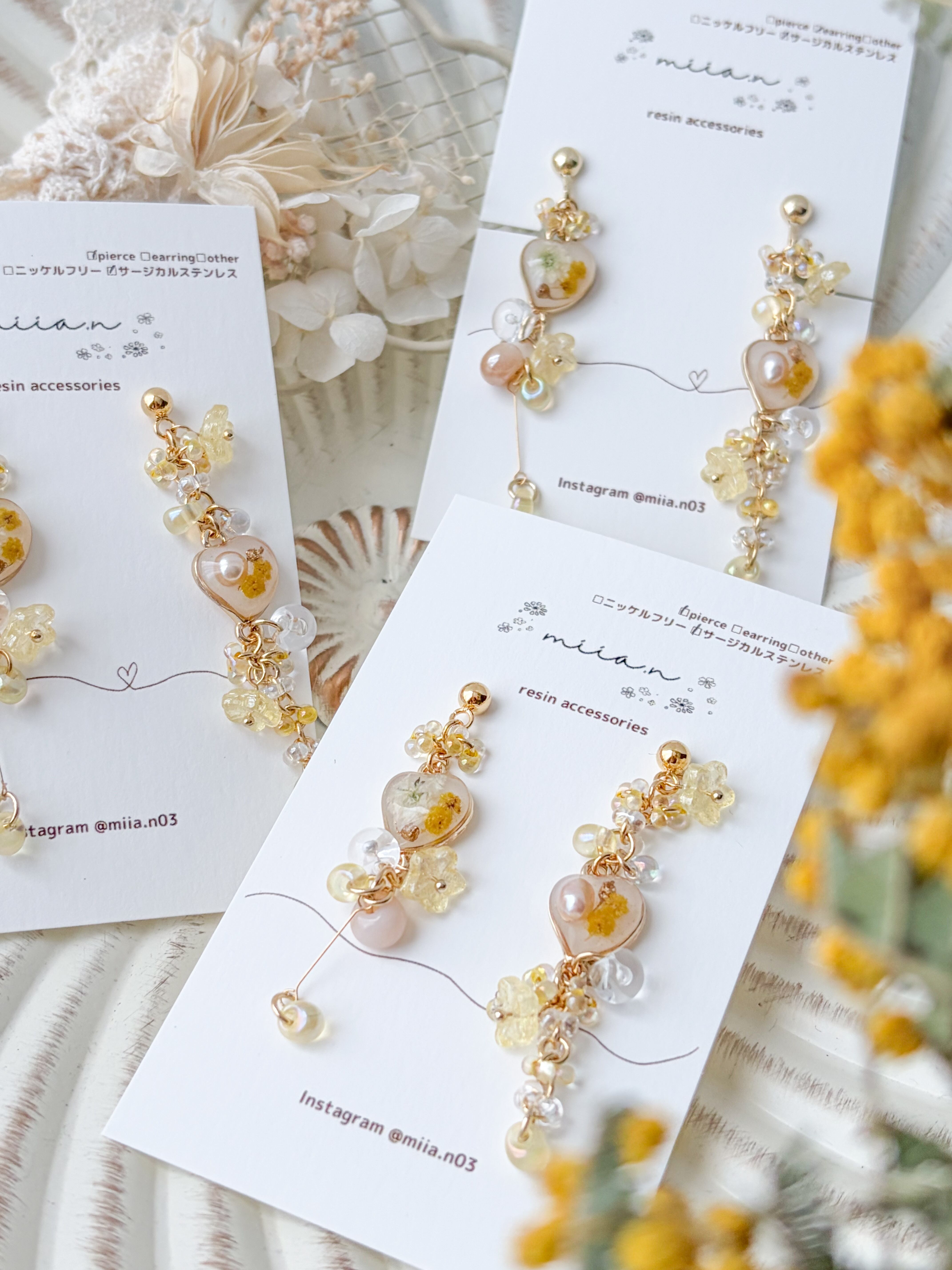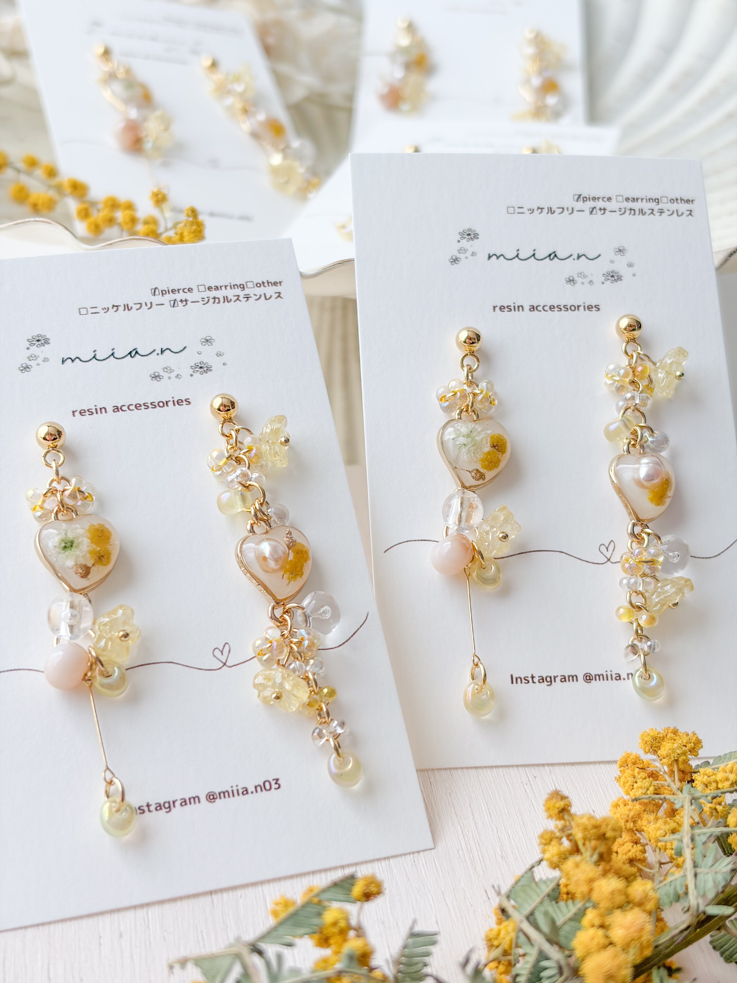 春の訪れを告げるミモザを優しい色合いでまとめた季節限定アクセサリー。