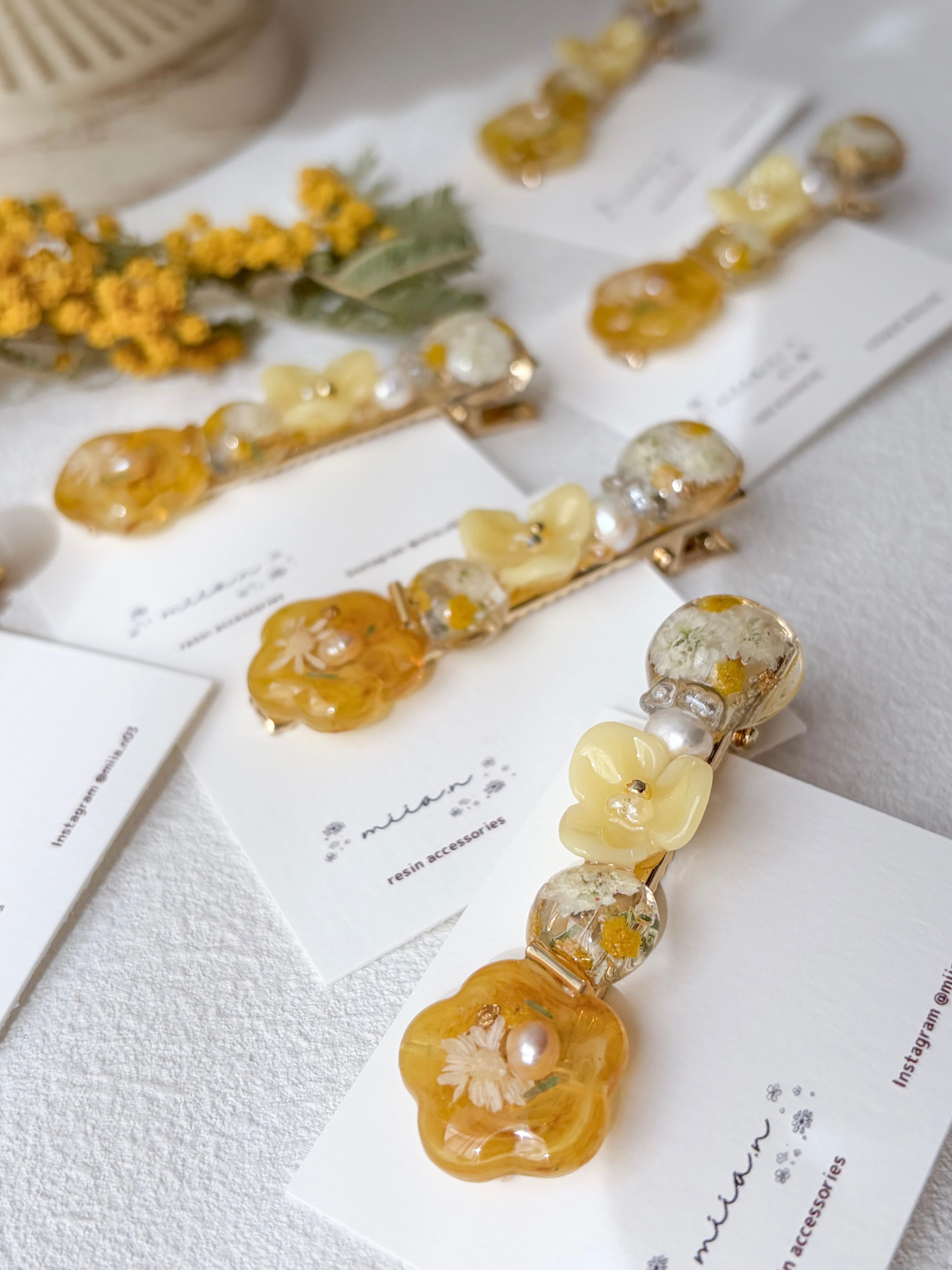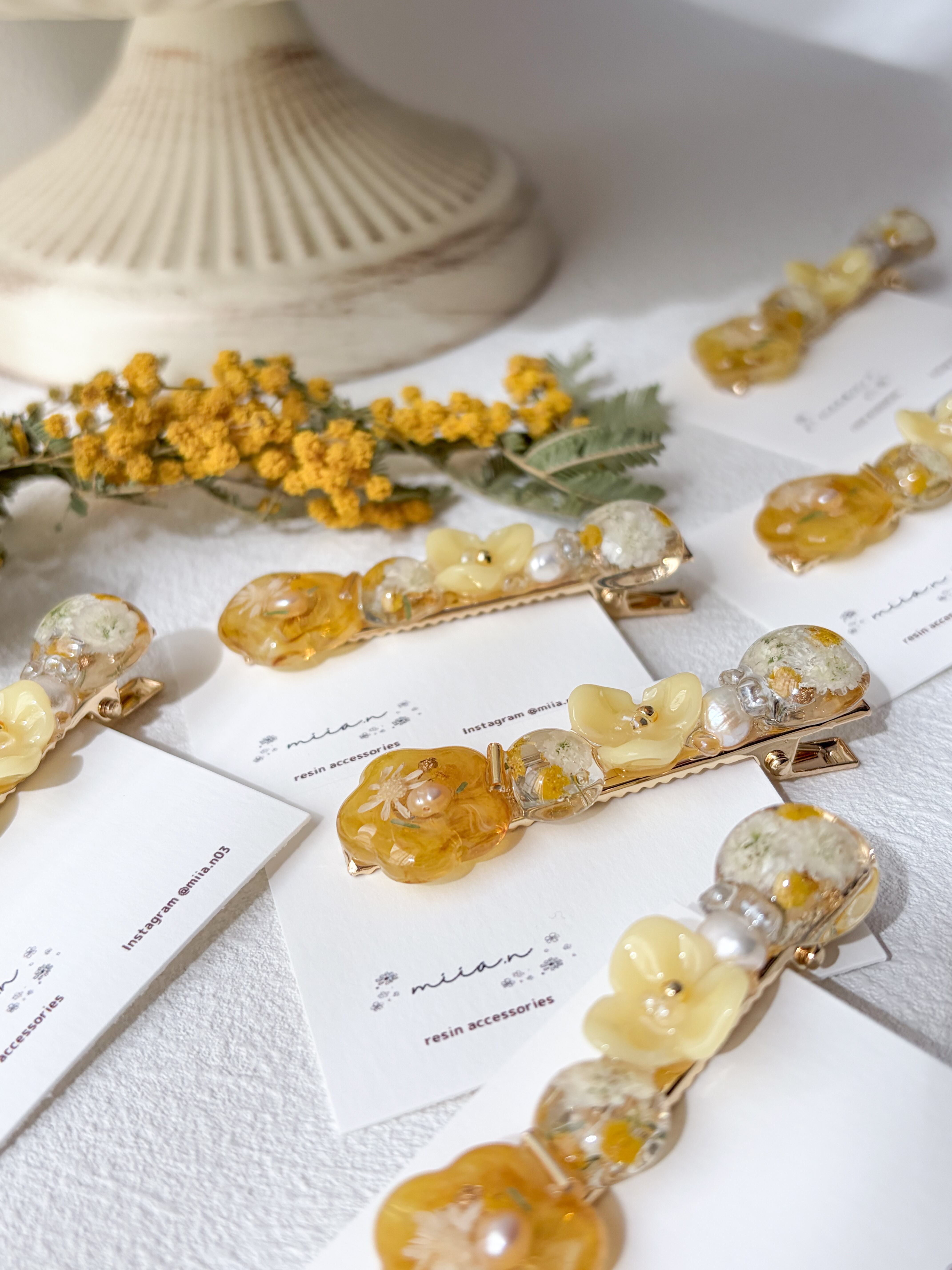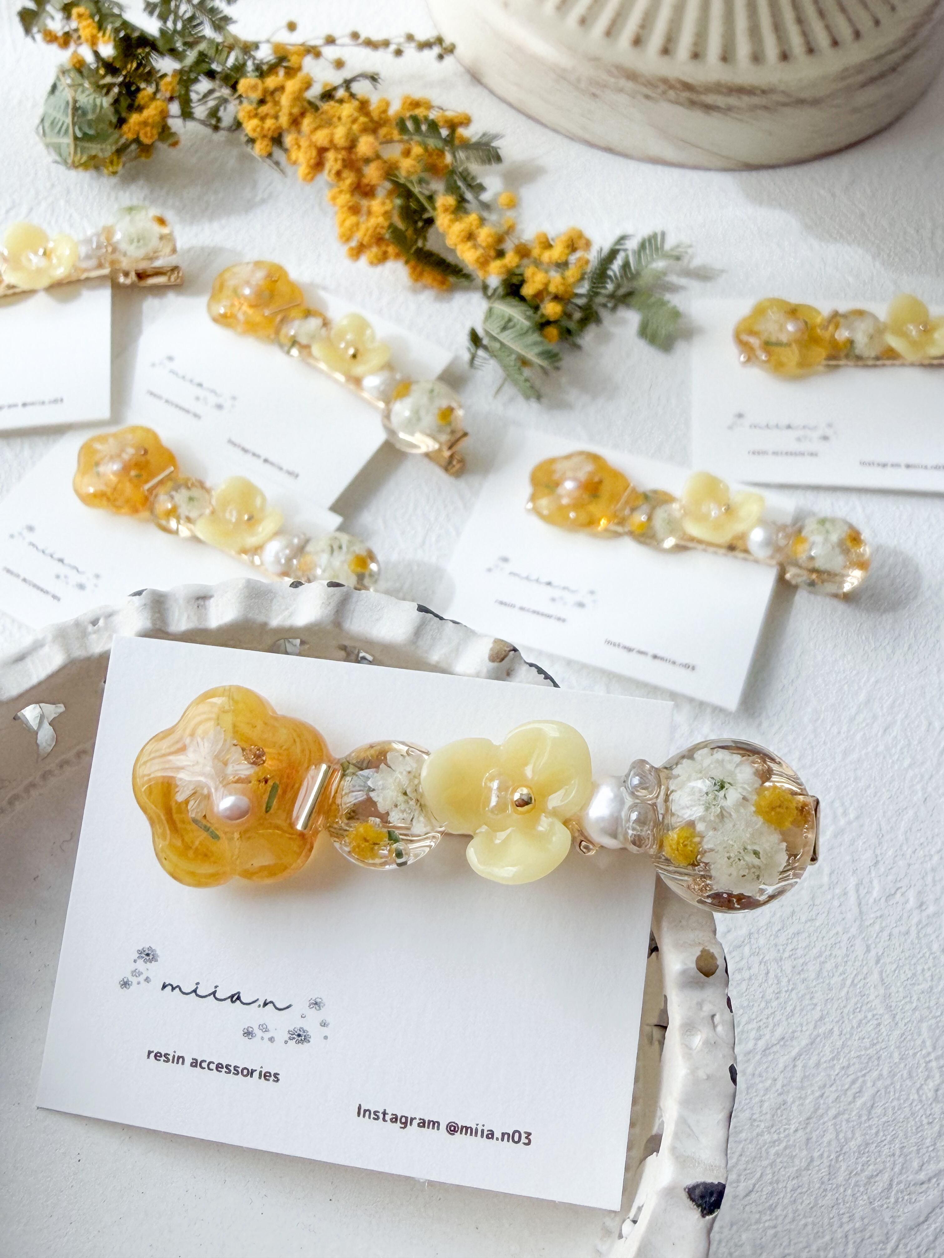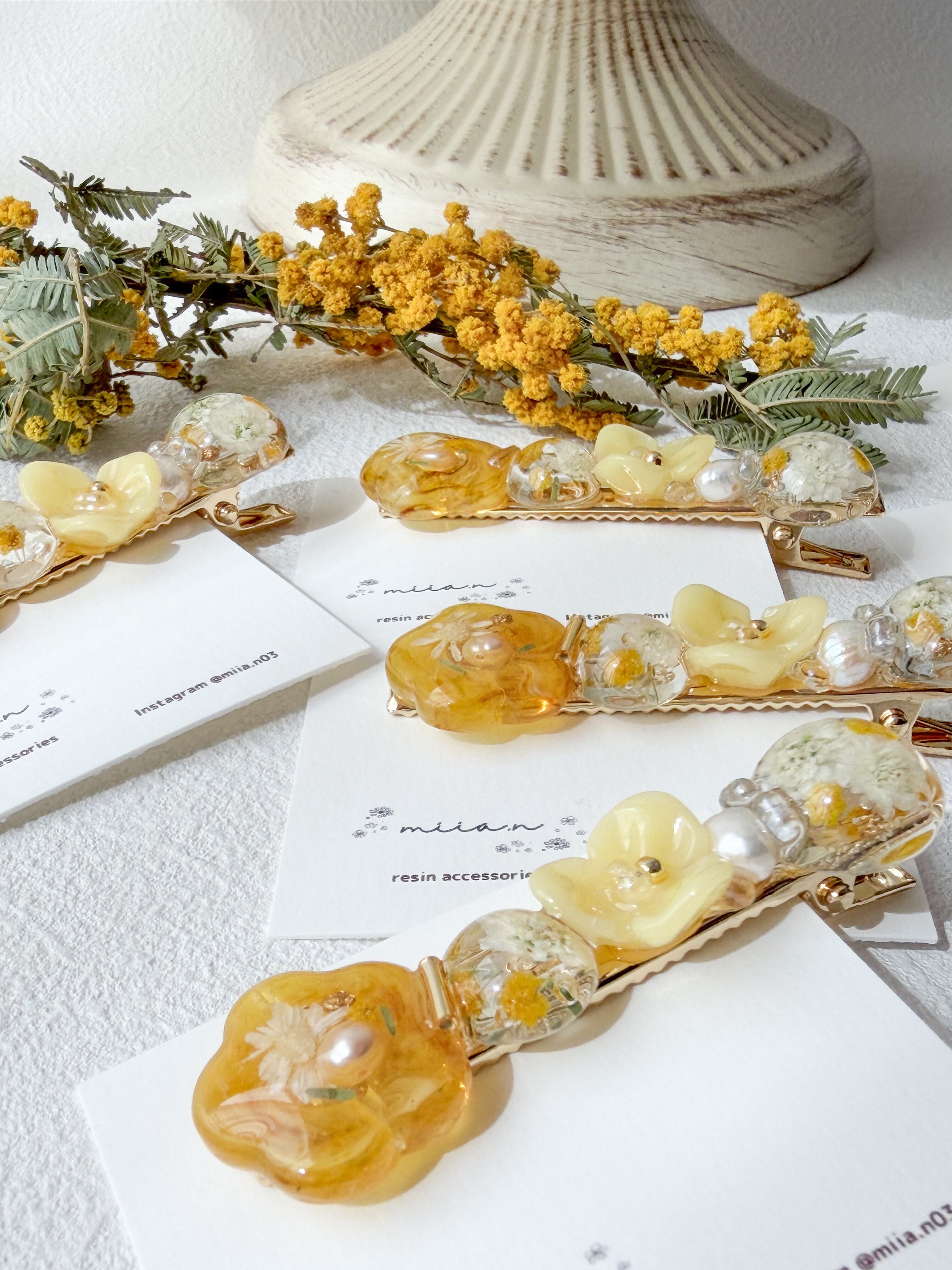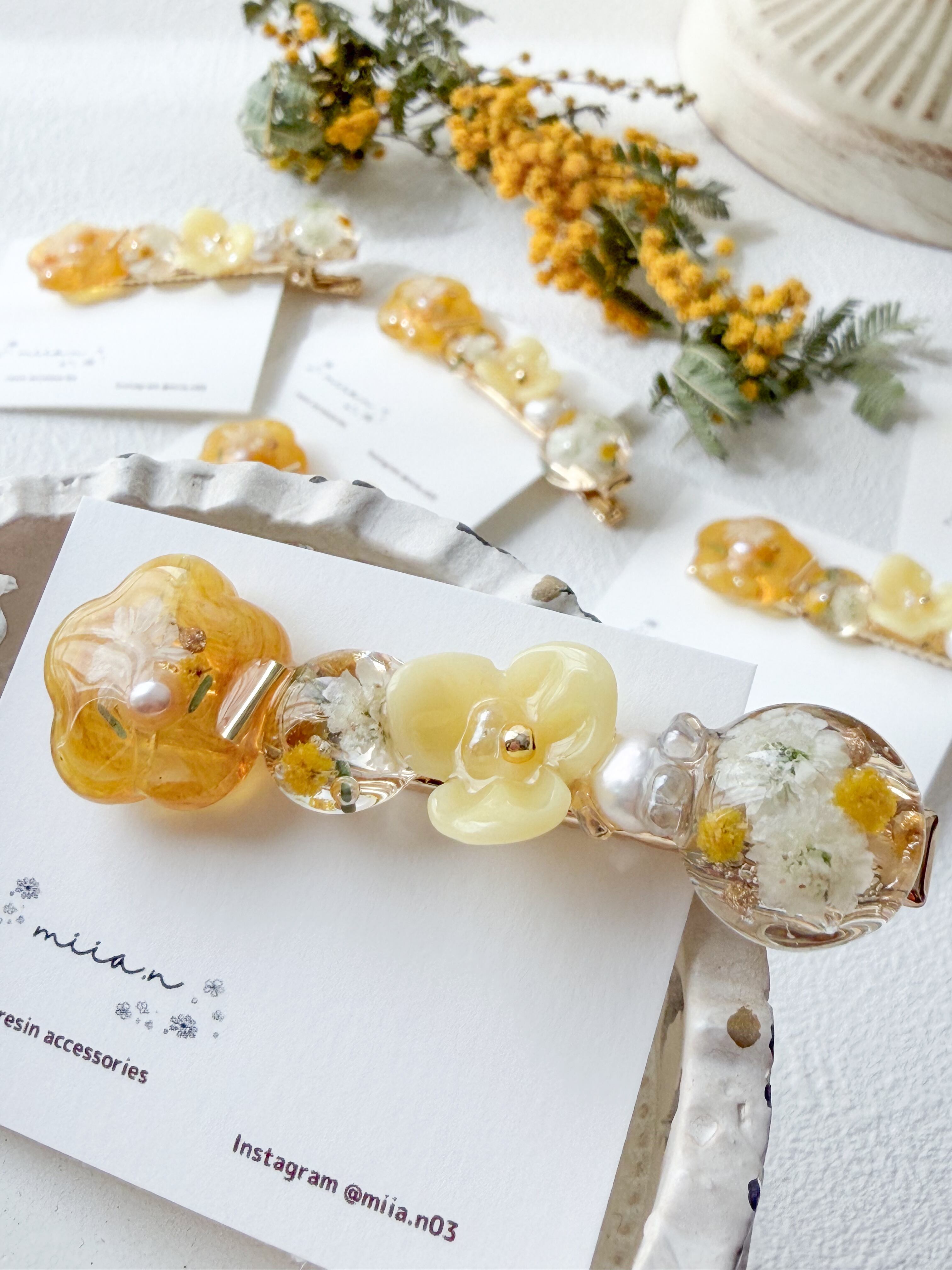 ミモザのお花やミモザカラーのレジンのお花を作って組み合わせて甘くなりすぎず上品な色合いで髪にそっと春を添えてくれます。