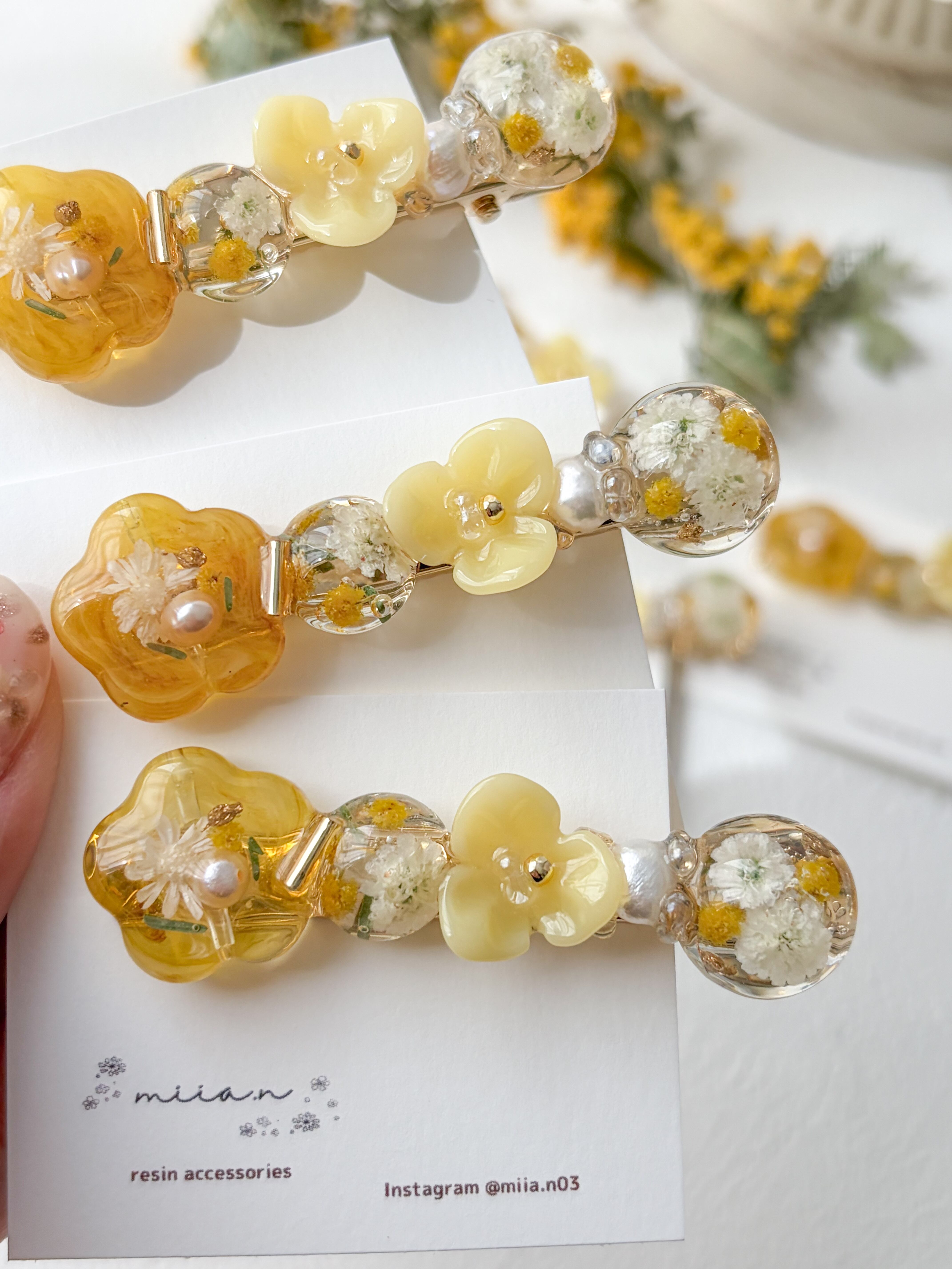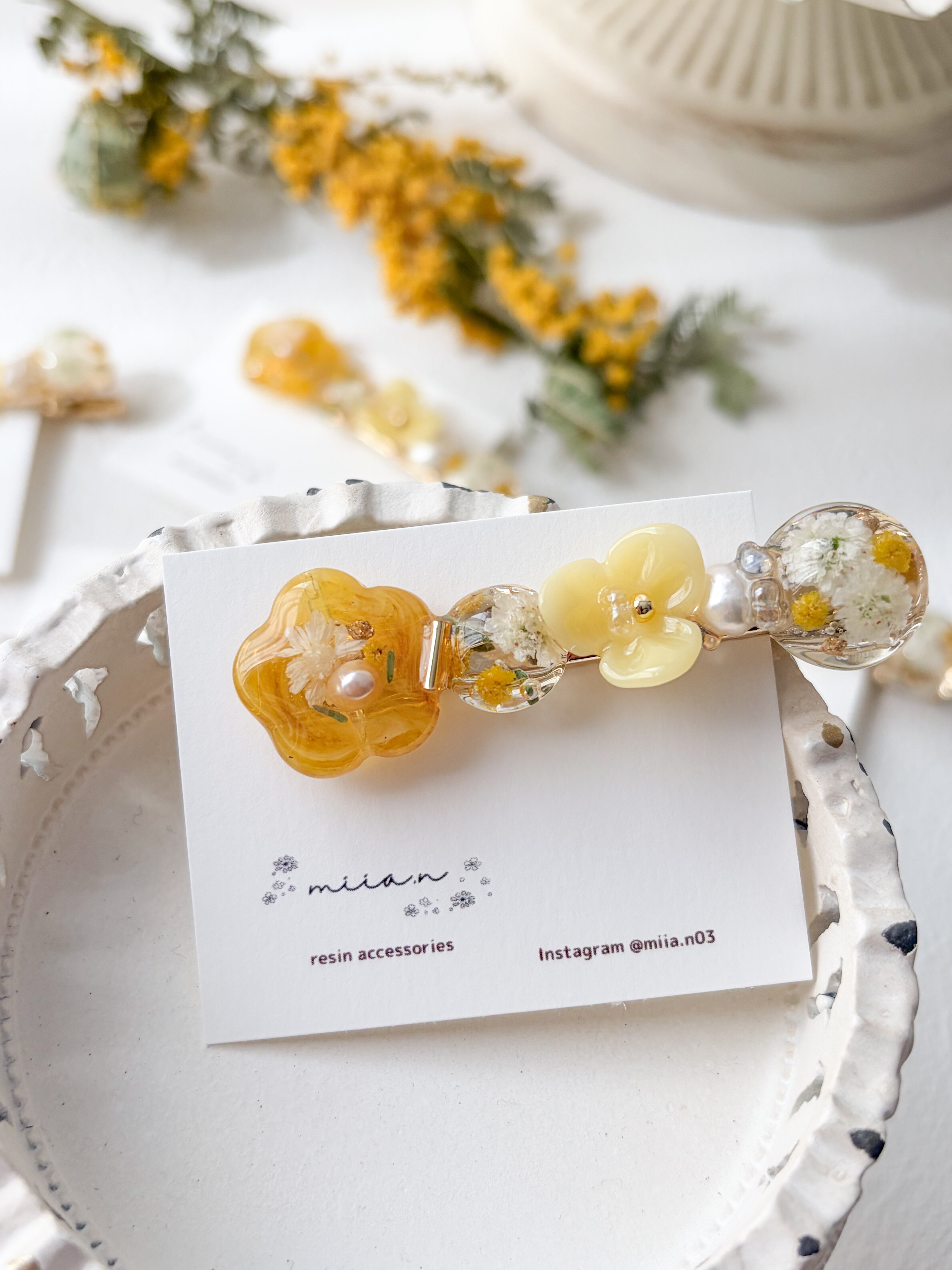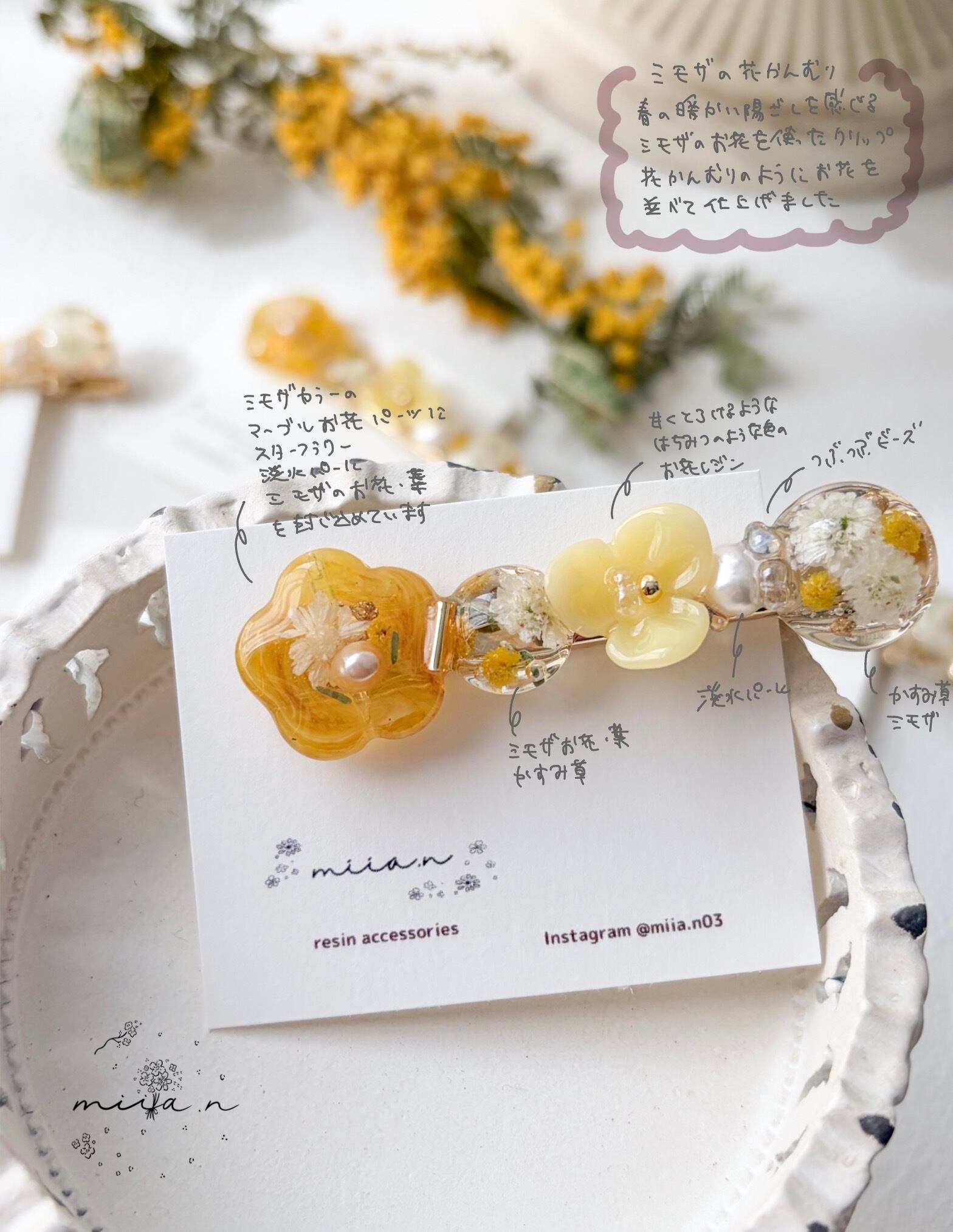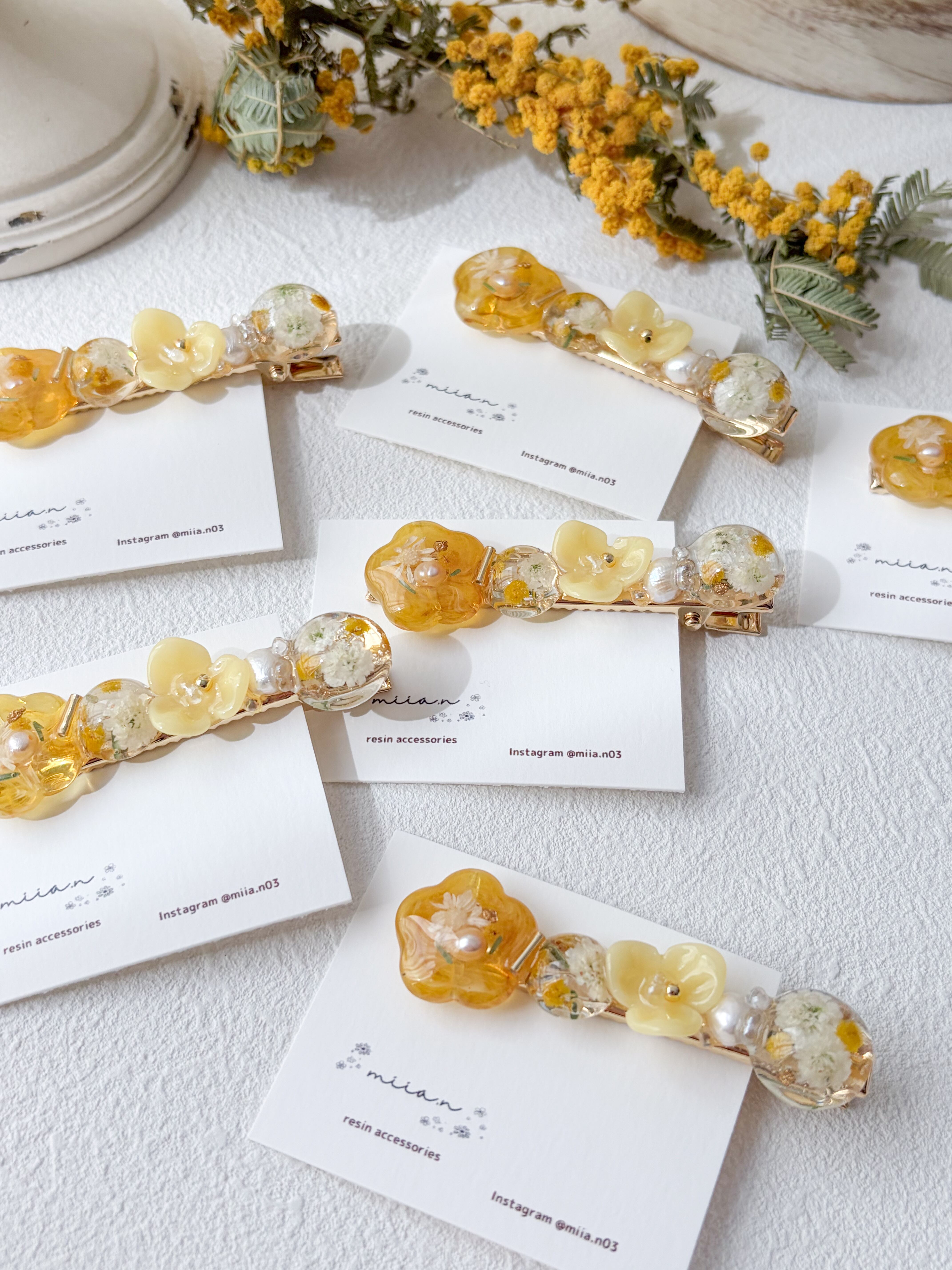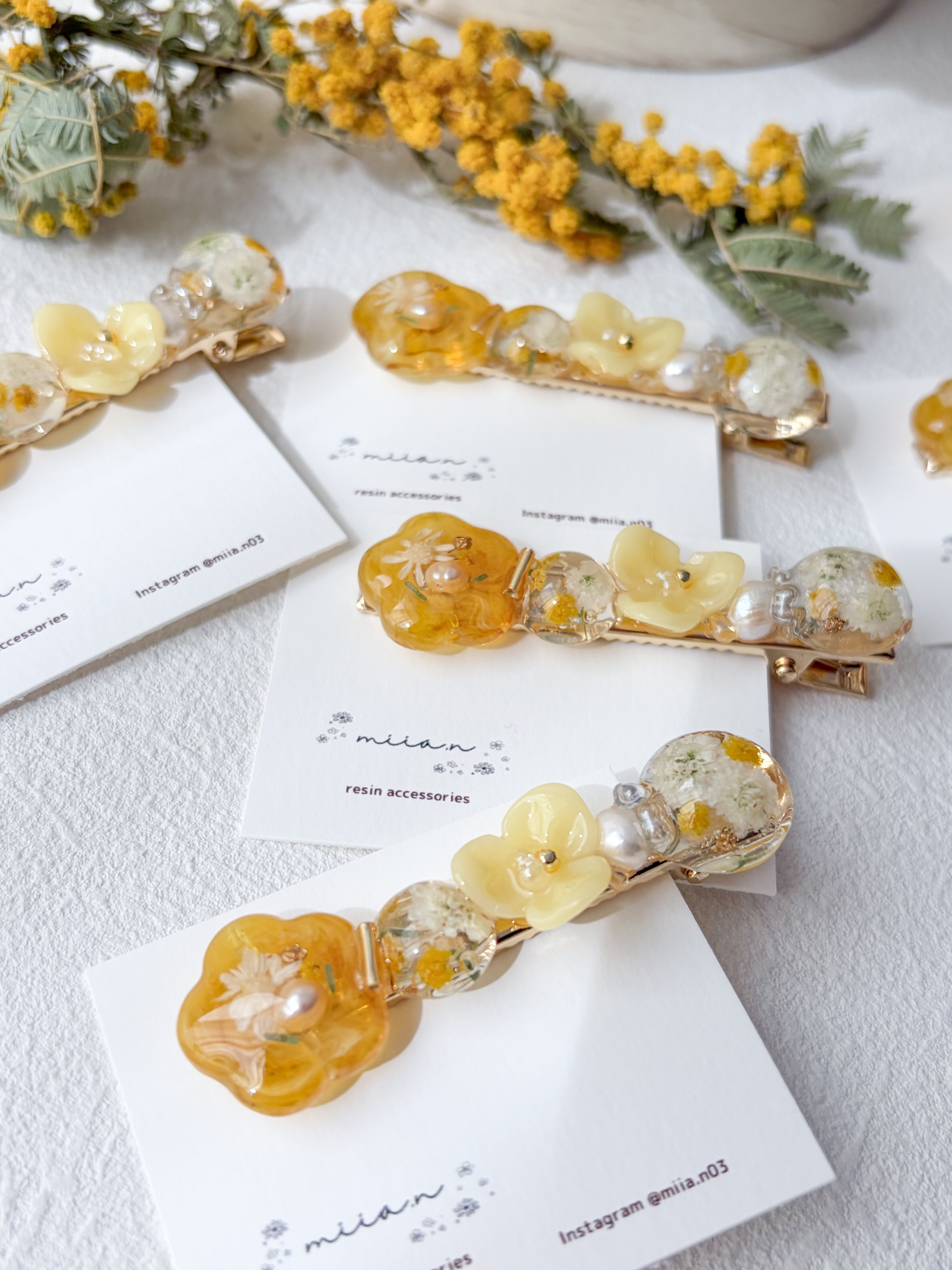 ミモザのお花やミモザカラーのレジンのお花を作って組み合わせて甘くなりすぎず上品な色合いで髪にそっと春を添えてくれます。