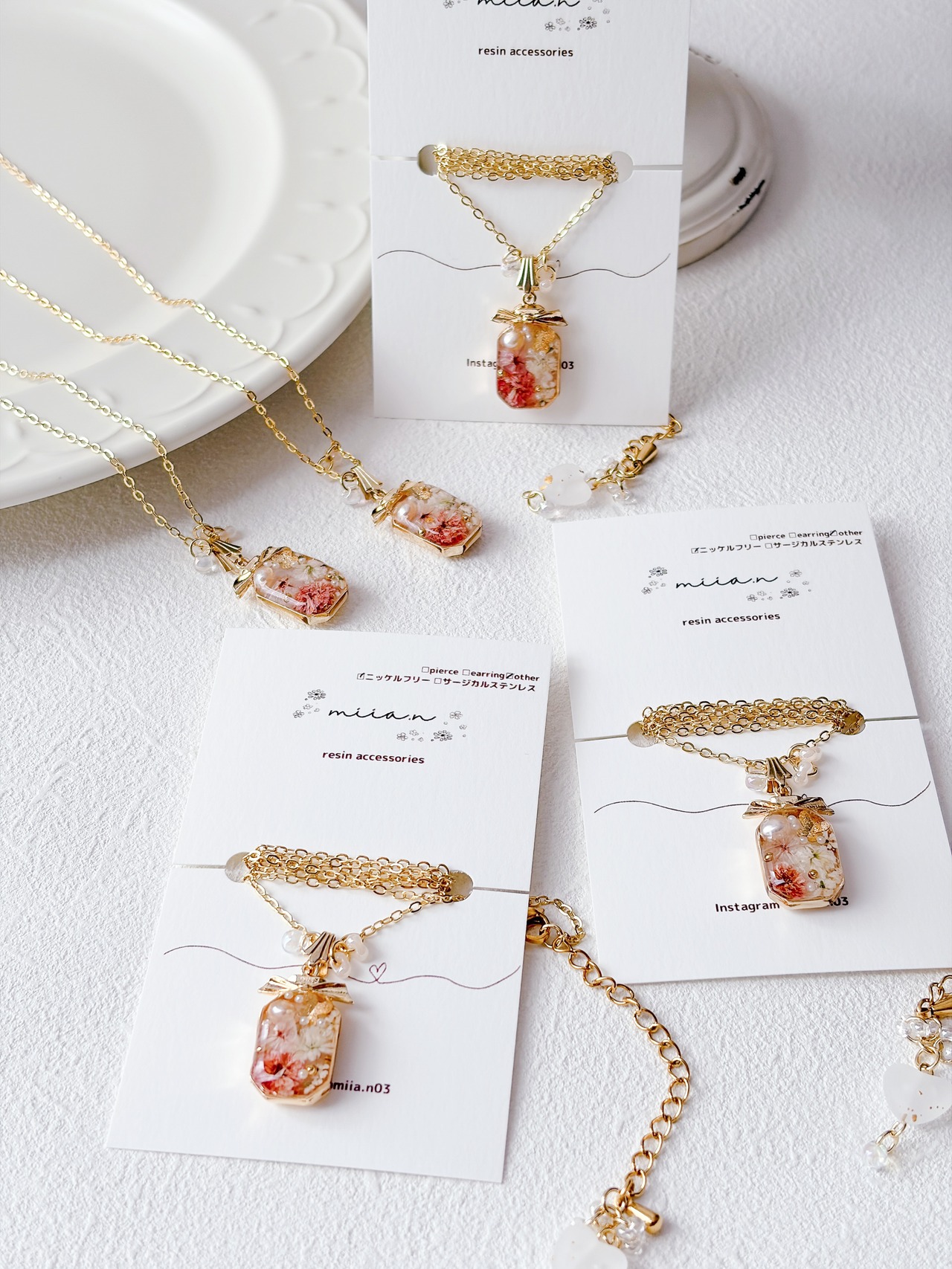 チェーン、丸カンともにアレルギー対応のニッケルフリー素材を使用しています。