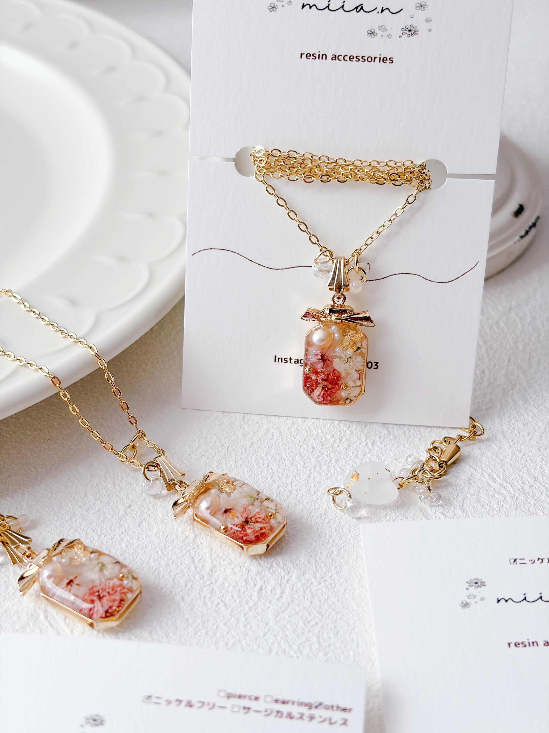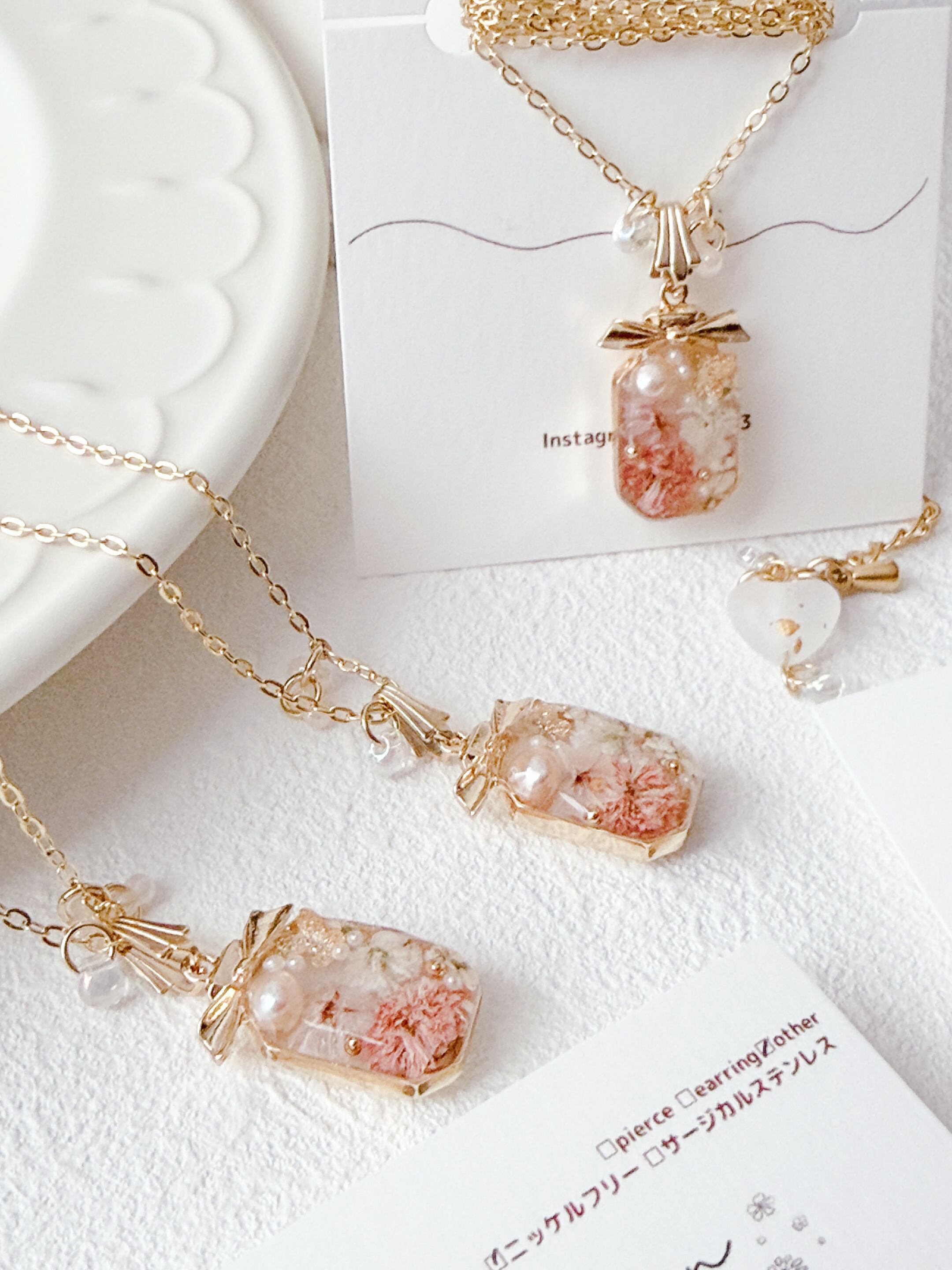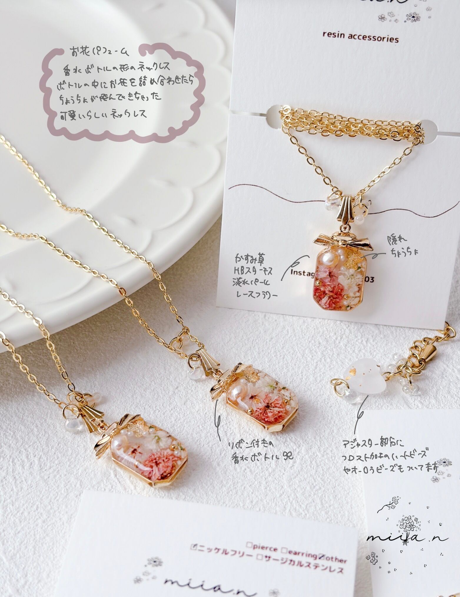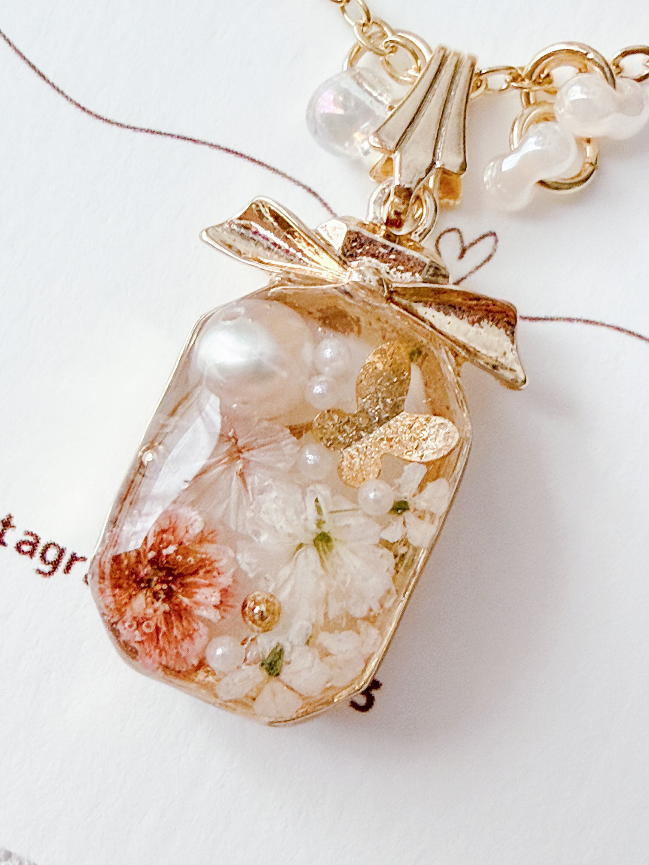 リボン付きの香水ボトルが可愛く、ちょうちょも封入されて春らしいネックレスに仕上がっています。