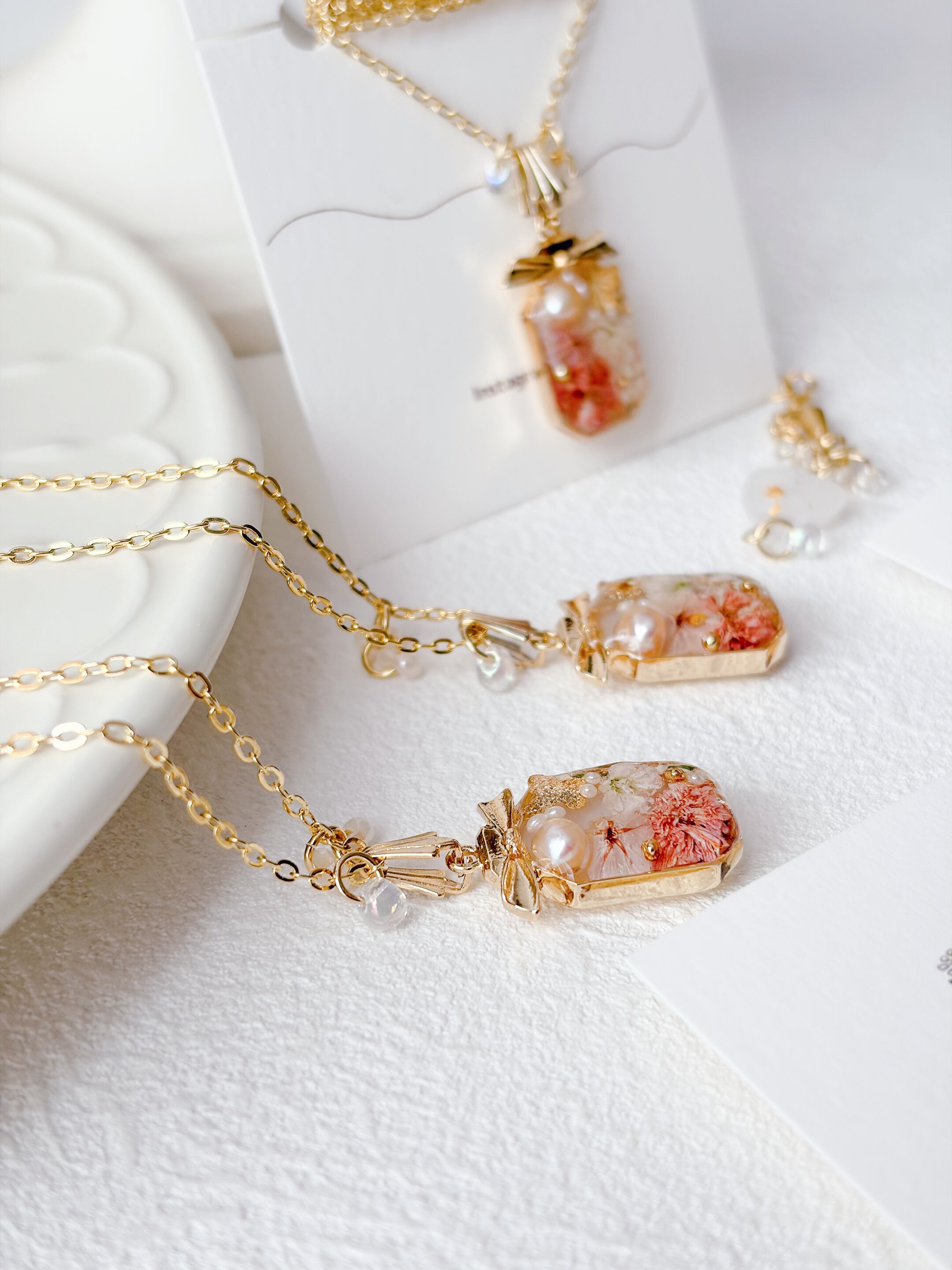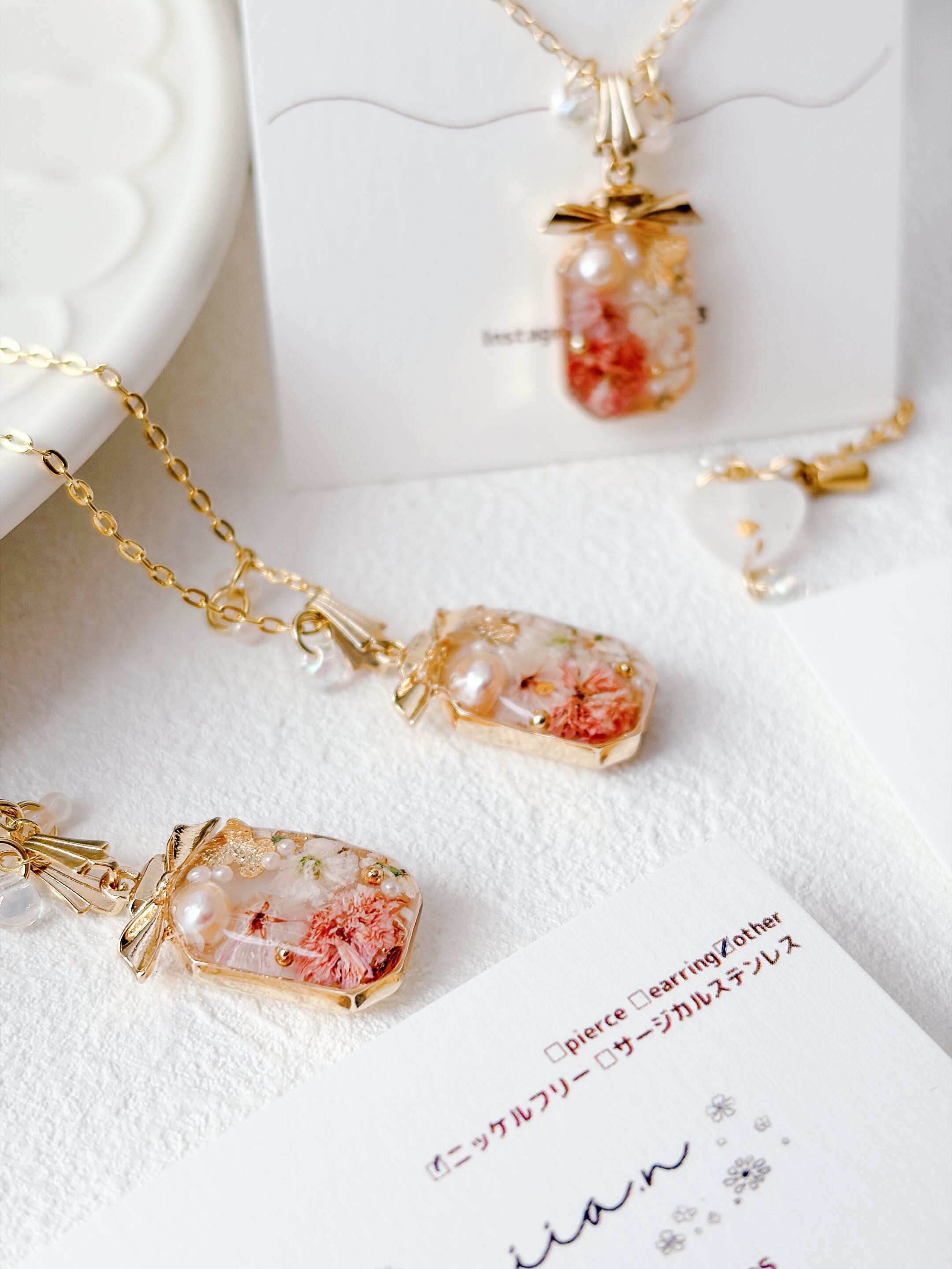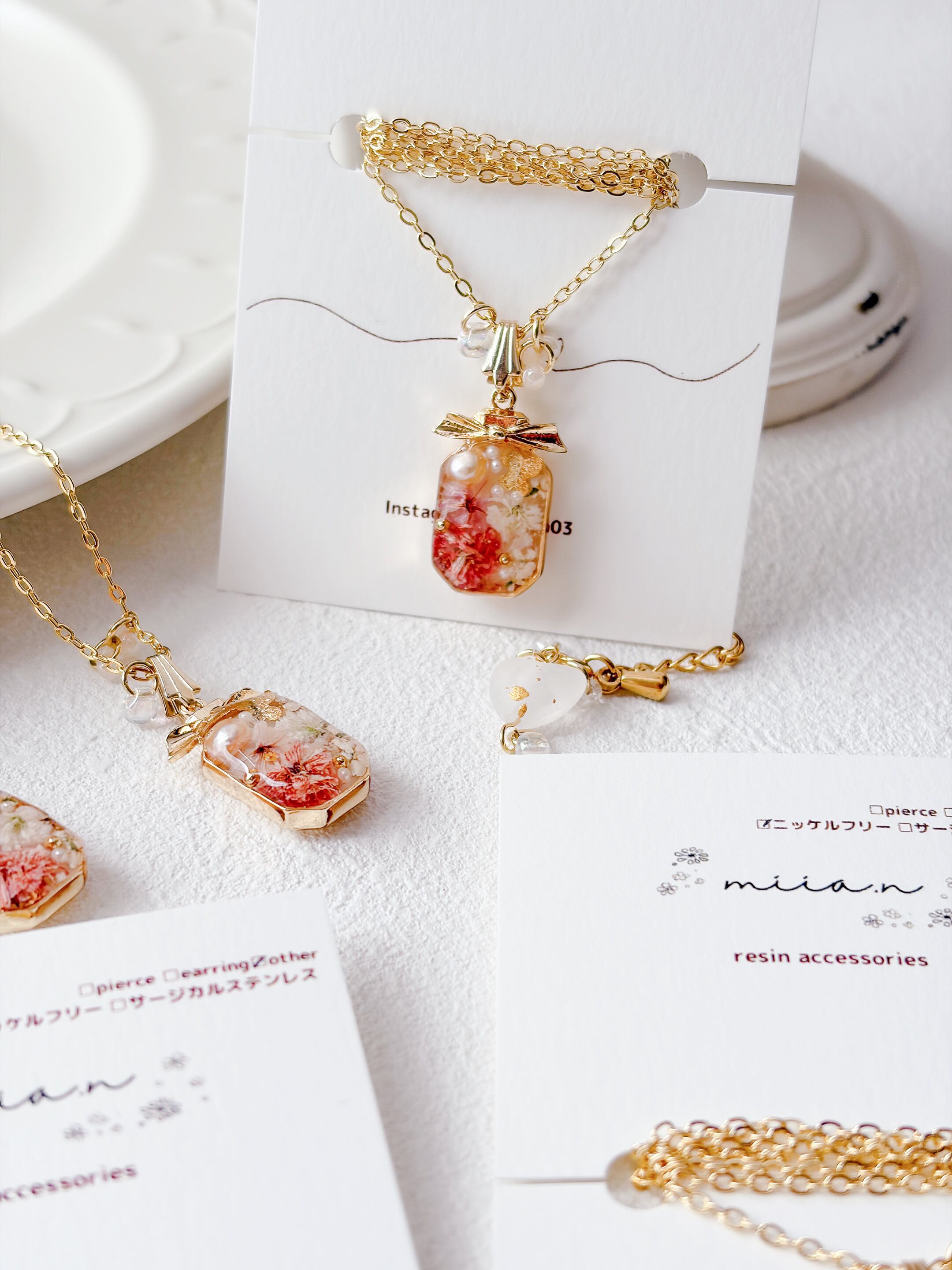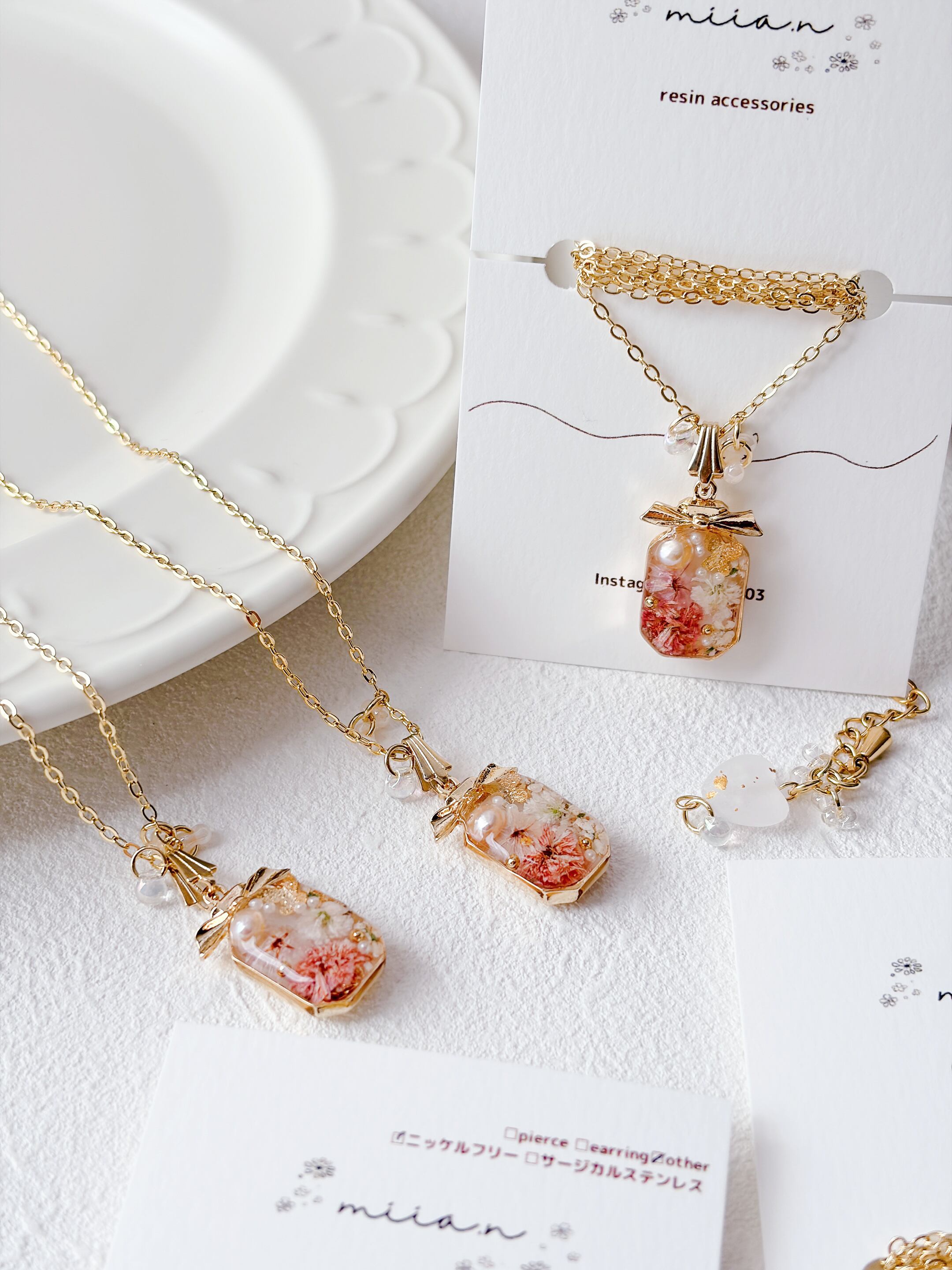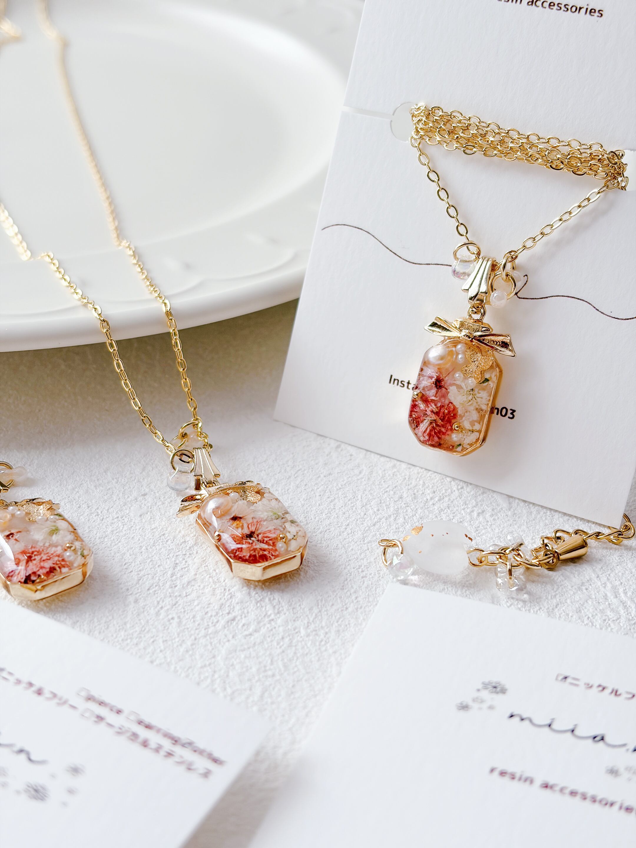 リボン付きの香水ボトルが可愛く、ちょうちょも封入されて春らしいネックレスに仕上がっています。