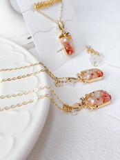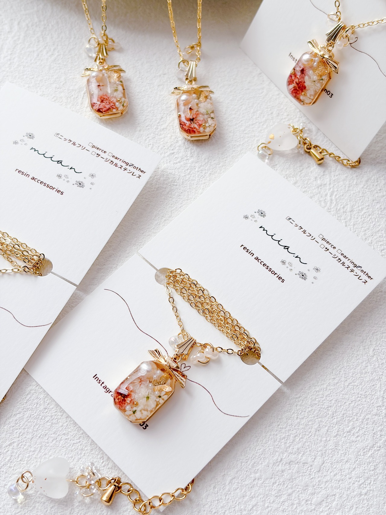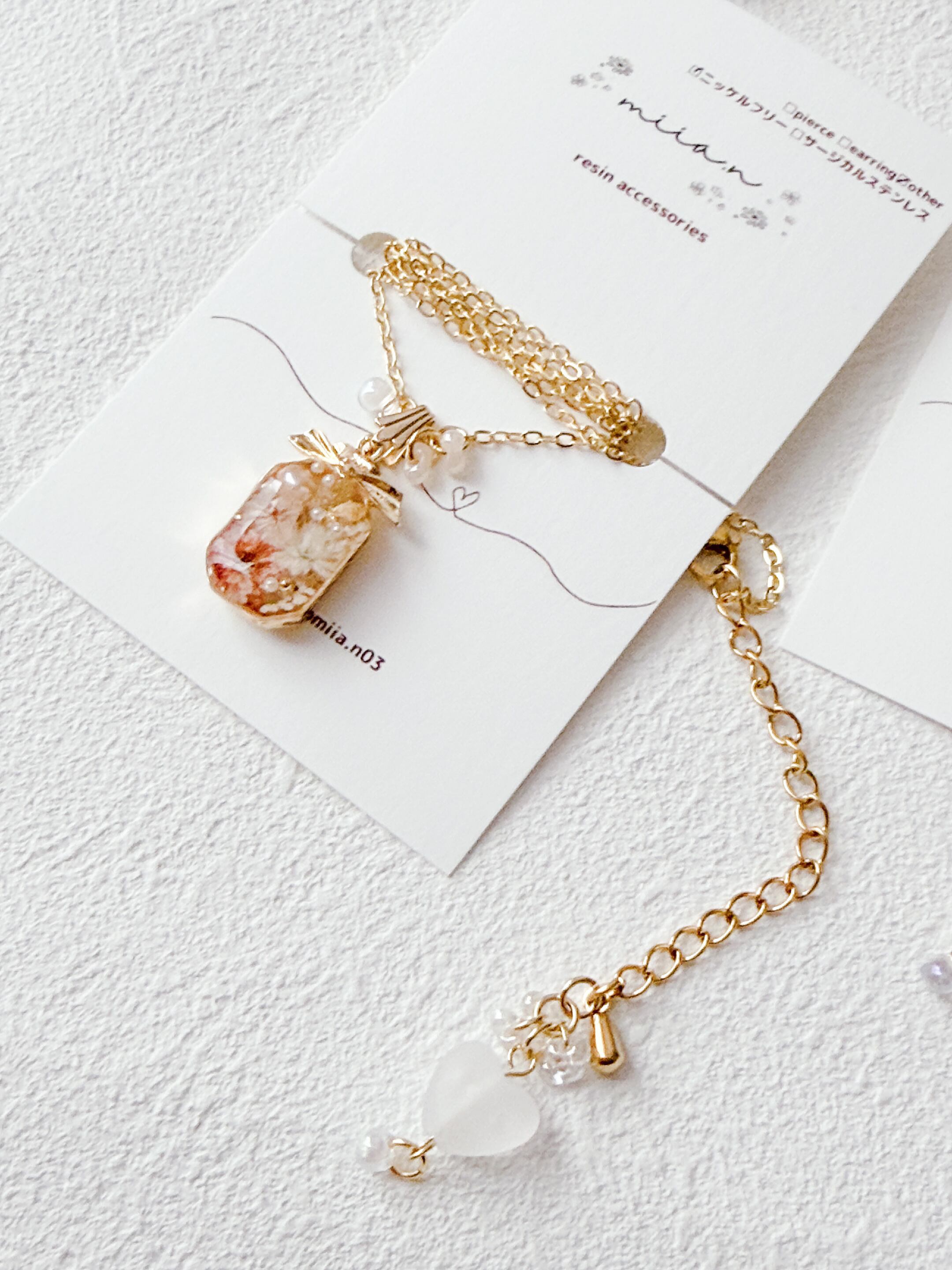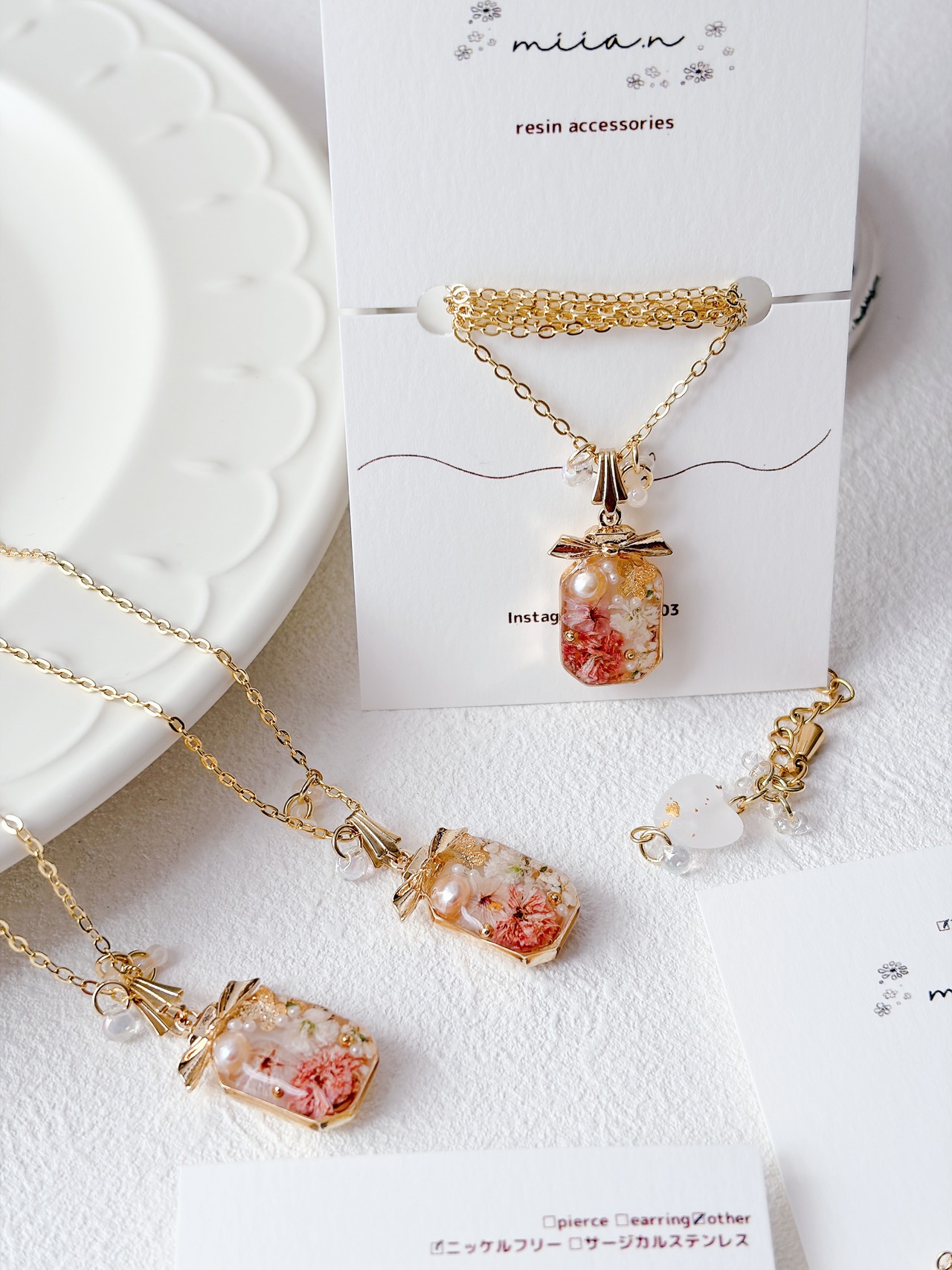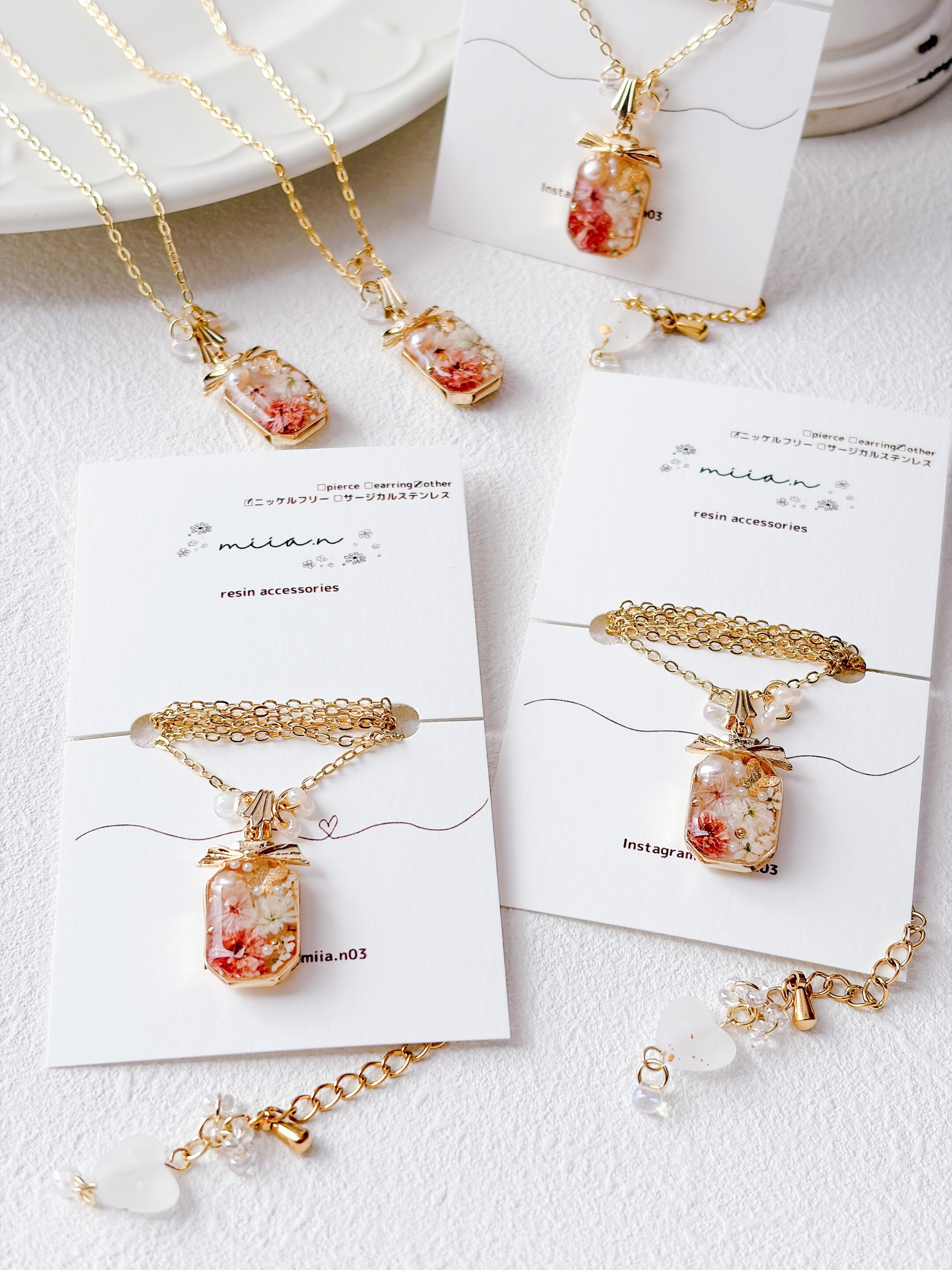 リボン付きの香水ボトルが可愛く、ちょうちょも封入されて春らしいネックレスに仕上がっています。