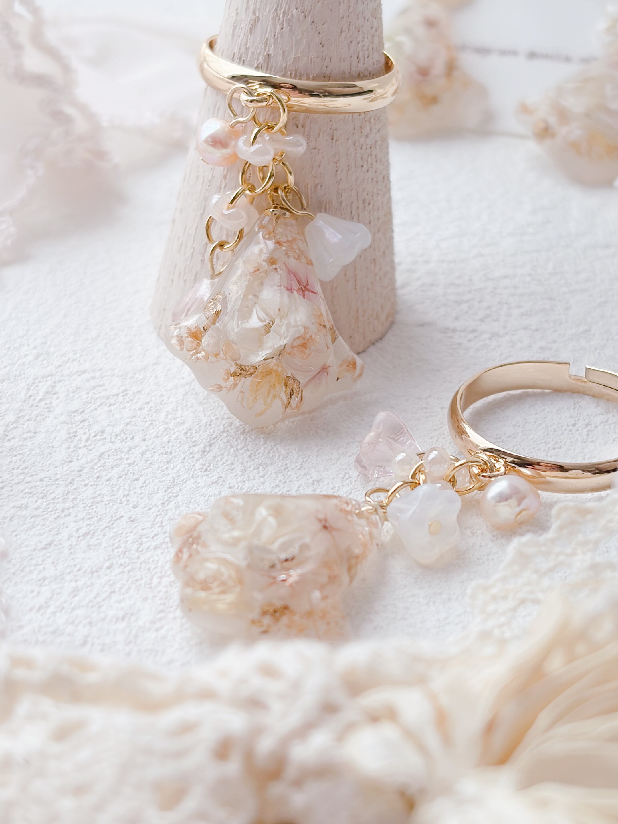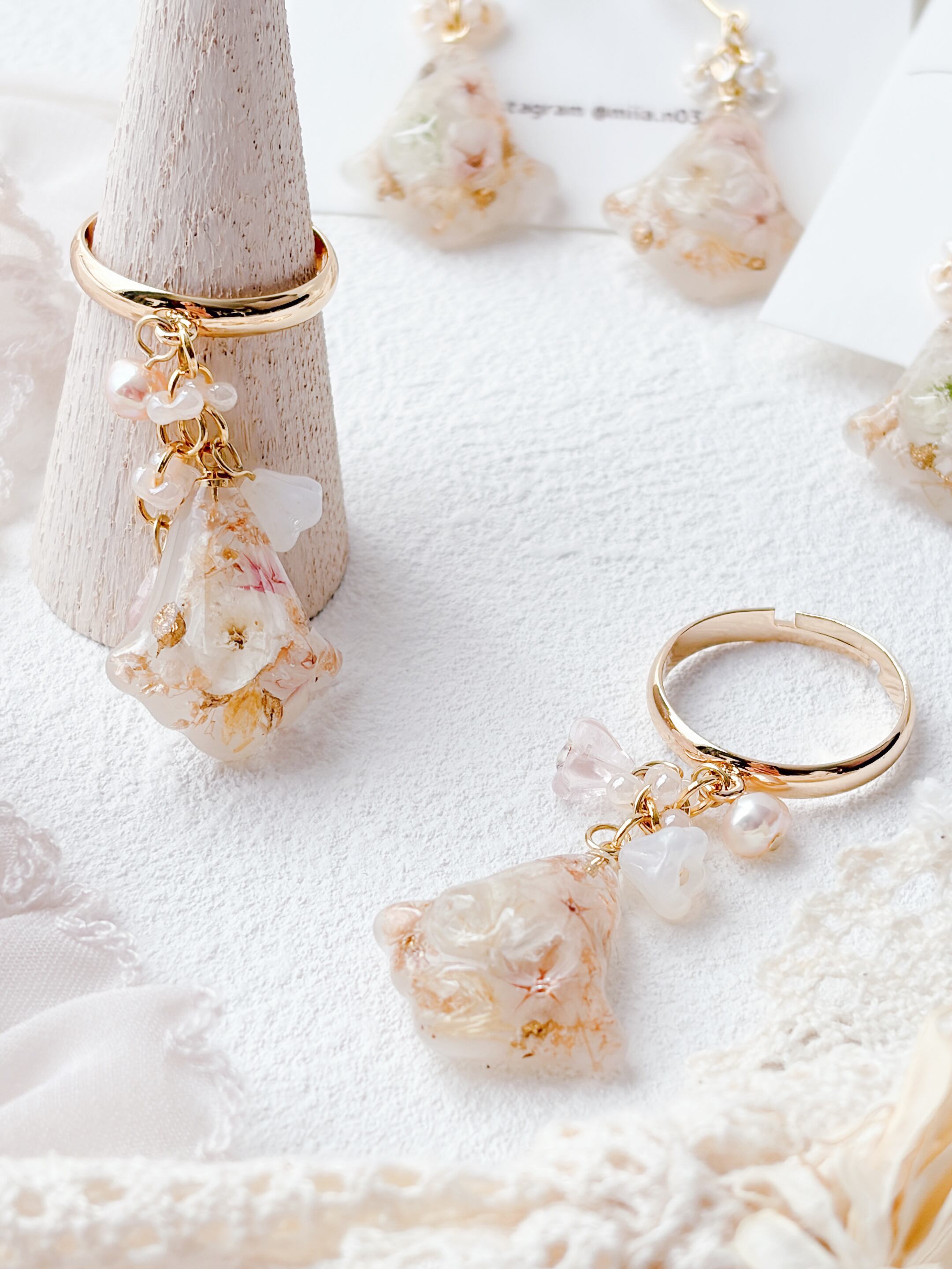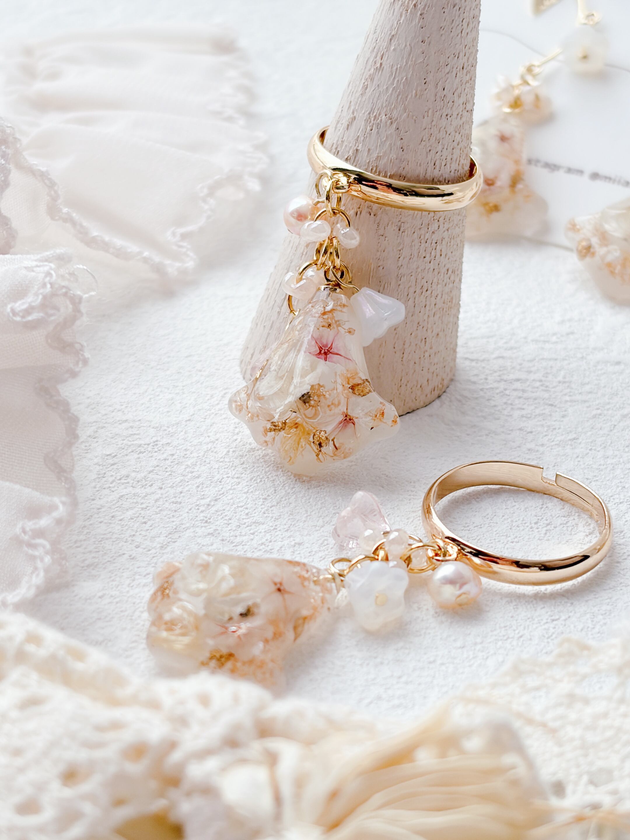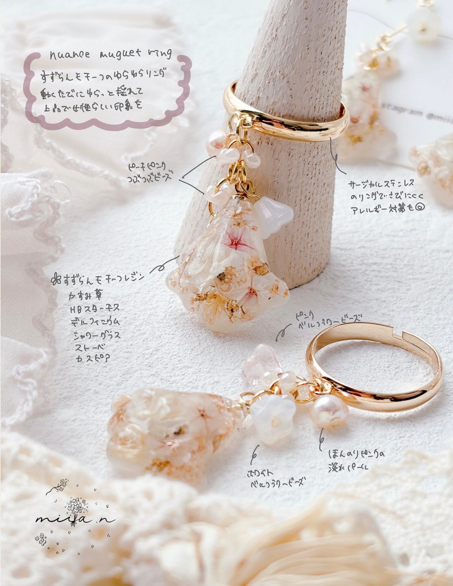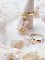 ニュアンスカラーのお花ビーズもたくさんあしらって優しく揺れるすずらんモチーフのリングで、淡いお花とゴールドの組み合わせで上品で女性らしい印象に仕上げています。