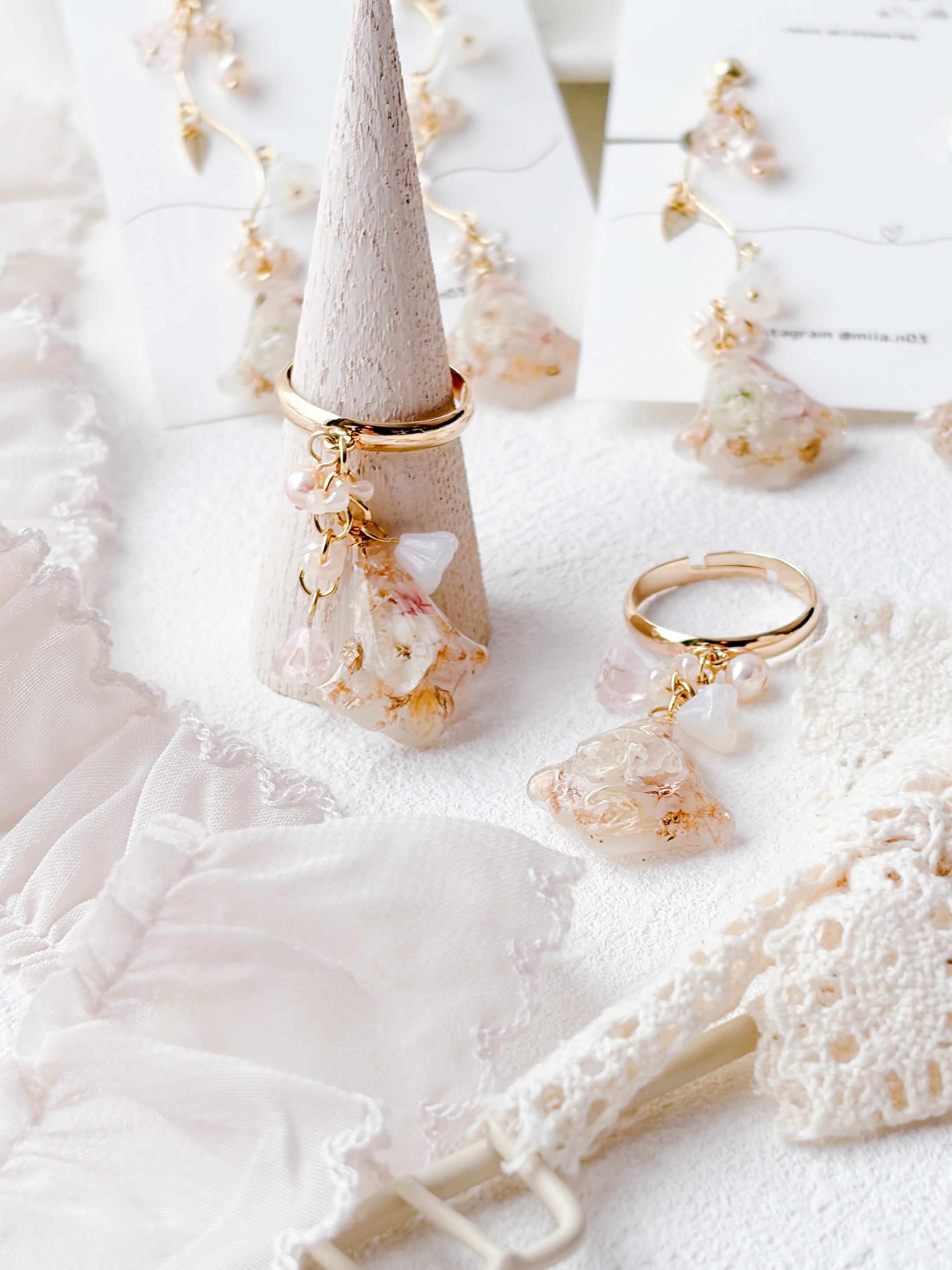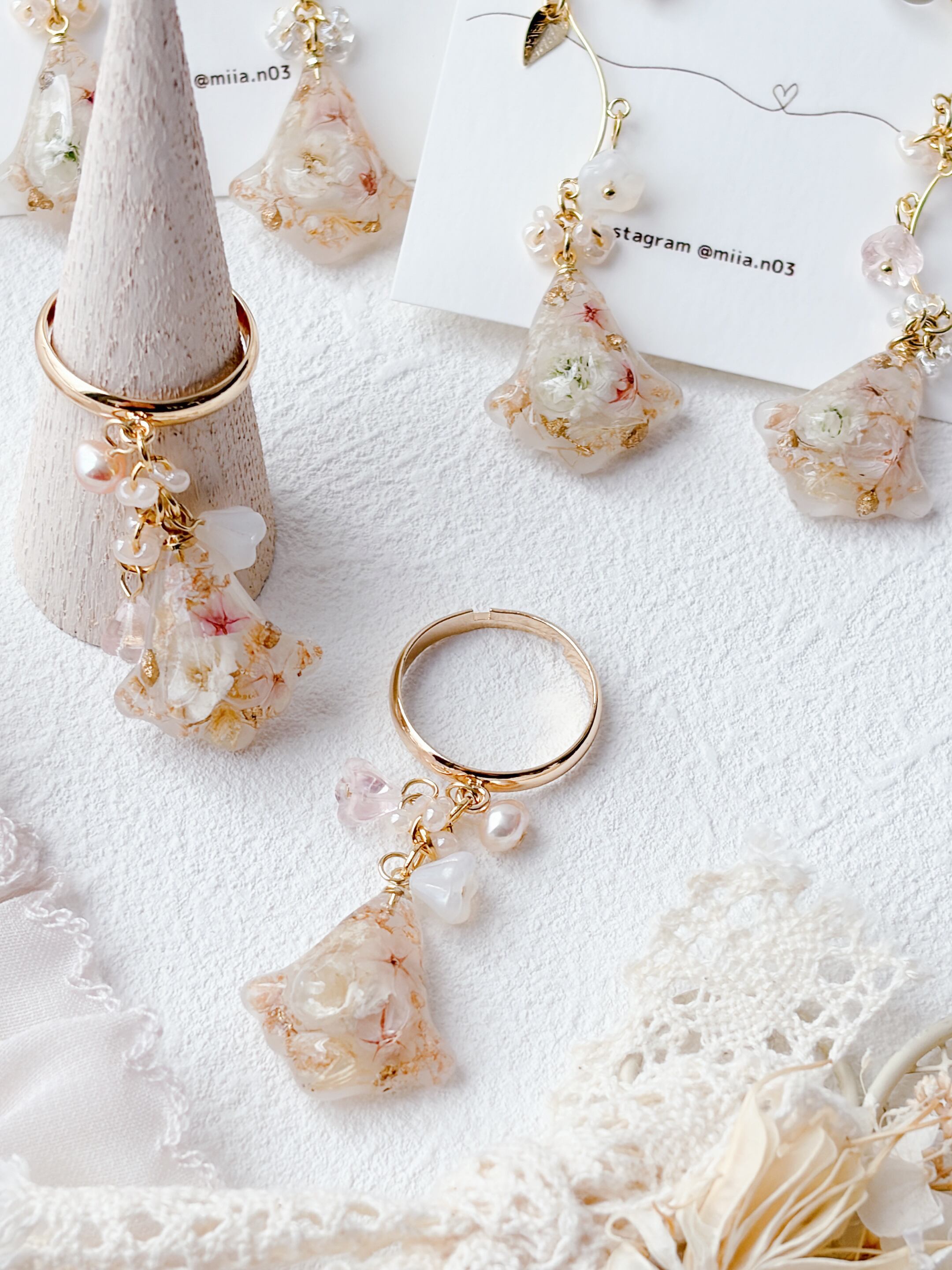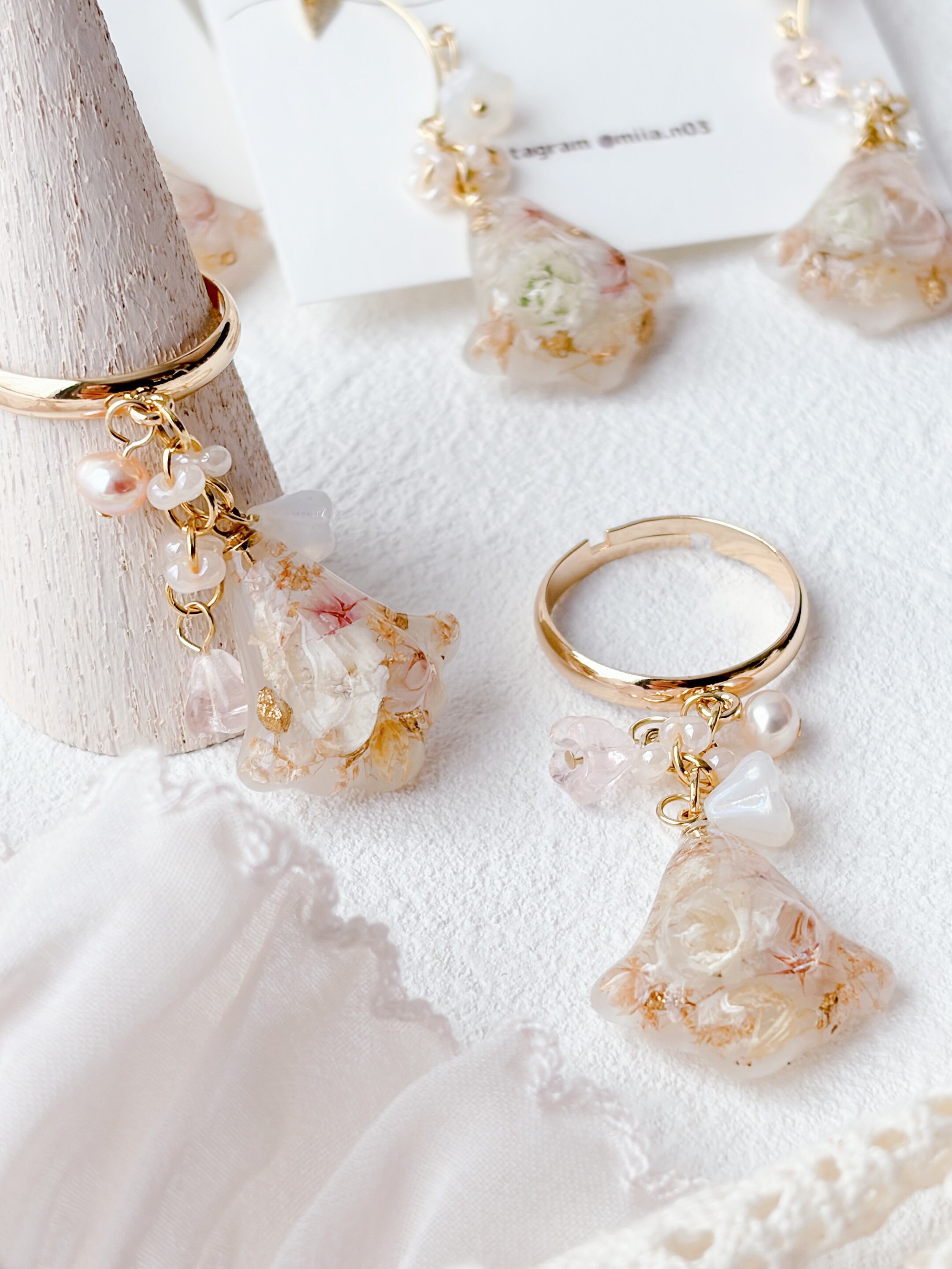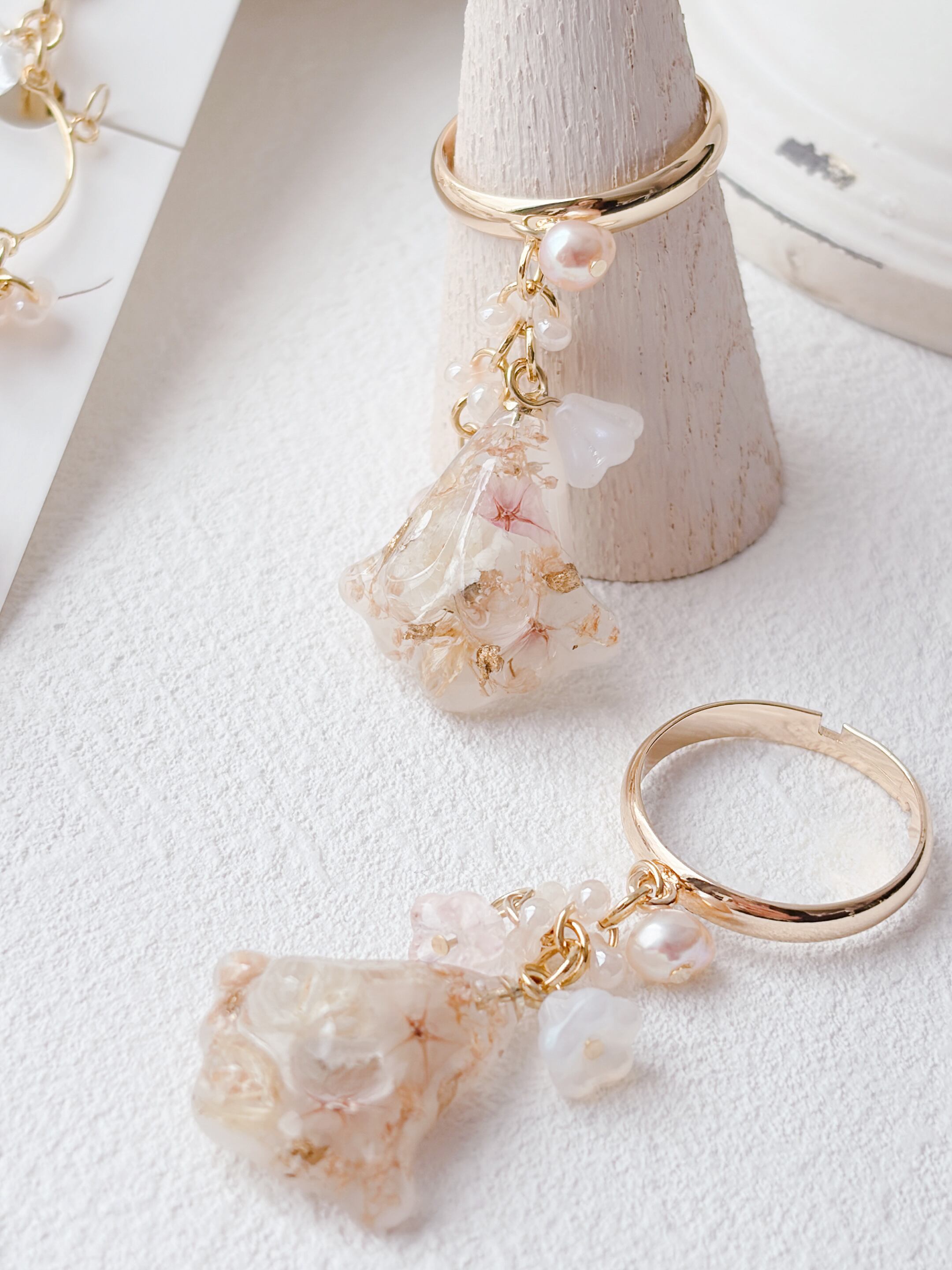 ニュアンスカラーのお花ビーズもたくさんあしらって優しく揺れるすずらんモチーフのリングで、淡いお花とゴールドの組み合わせで上品で女性らしい印象に仕上げています。