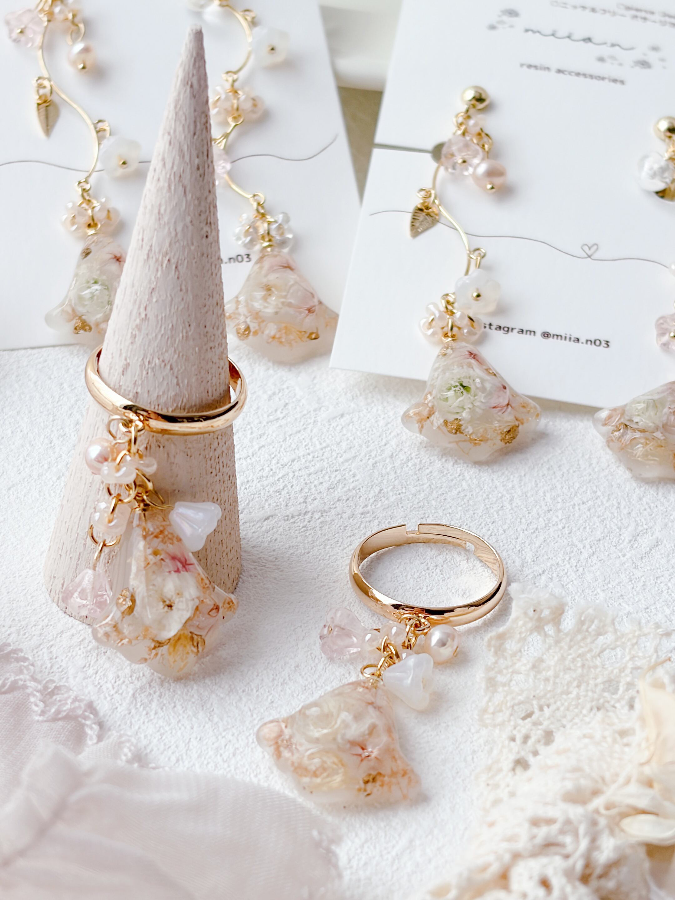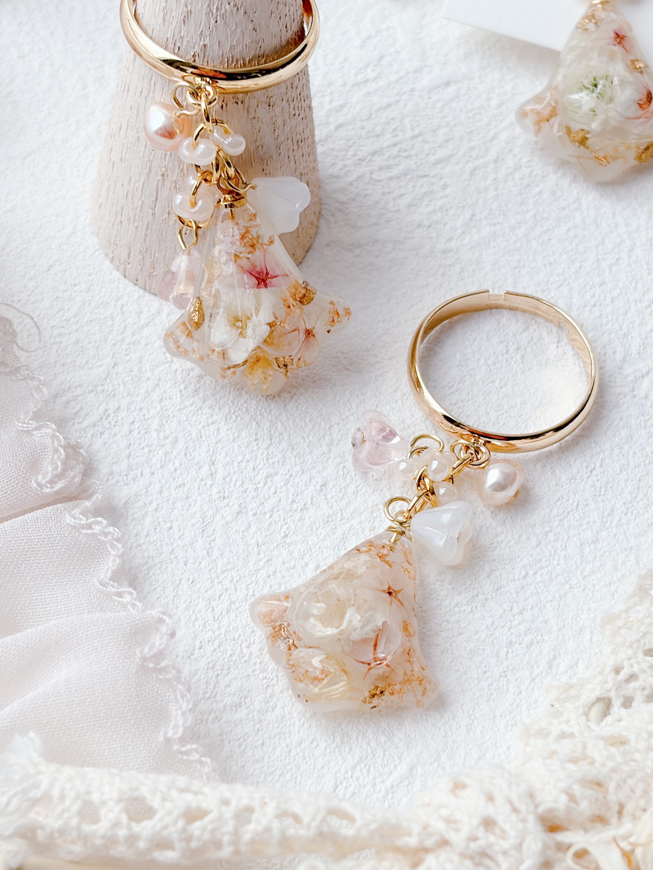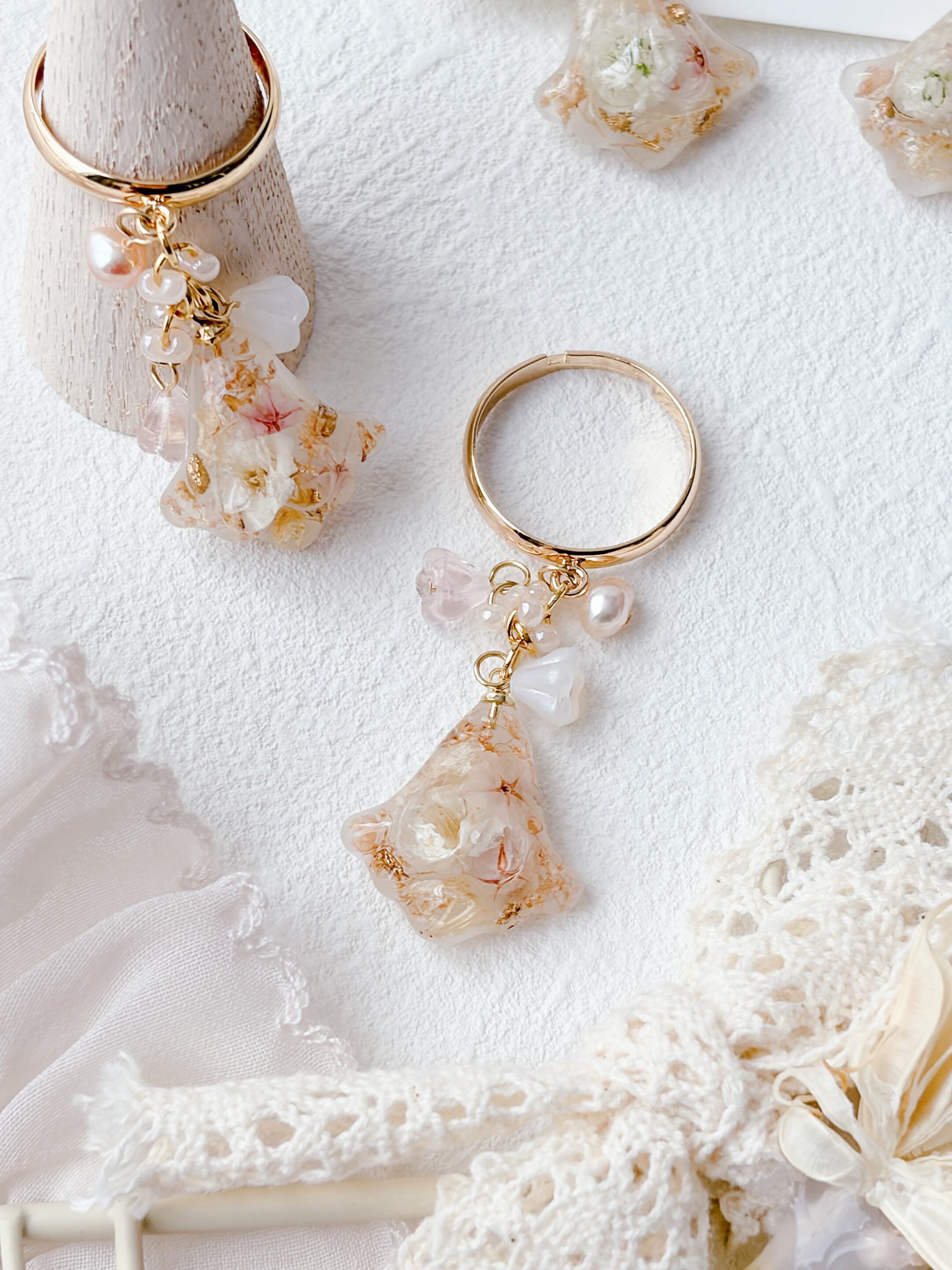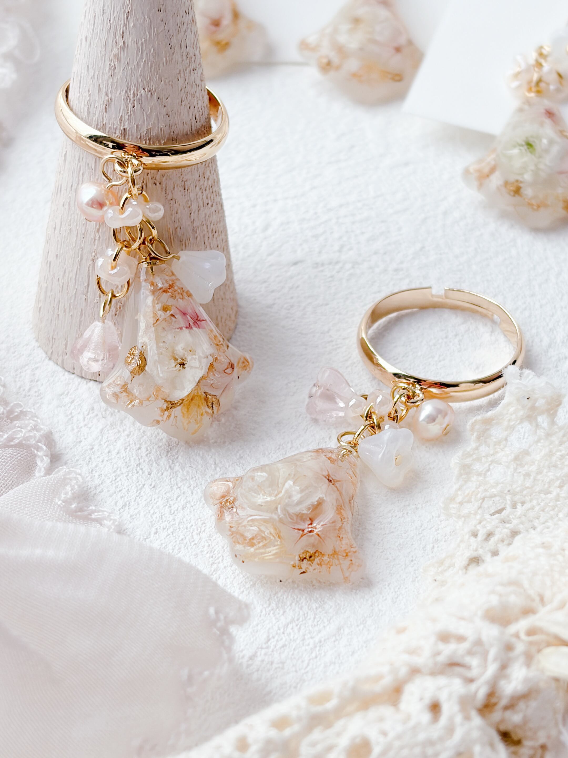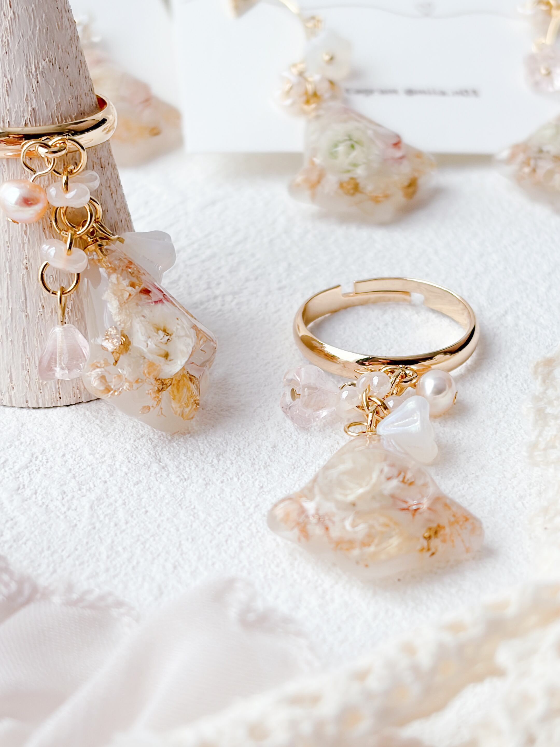 ニュアンスカラーのお花ビーズもたくさんあしらって優しく揺れるすずらんモチーフのリングで、淡いお花とゴールドの組み合わせで上品で女性らしい印象に仕上げています。