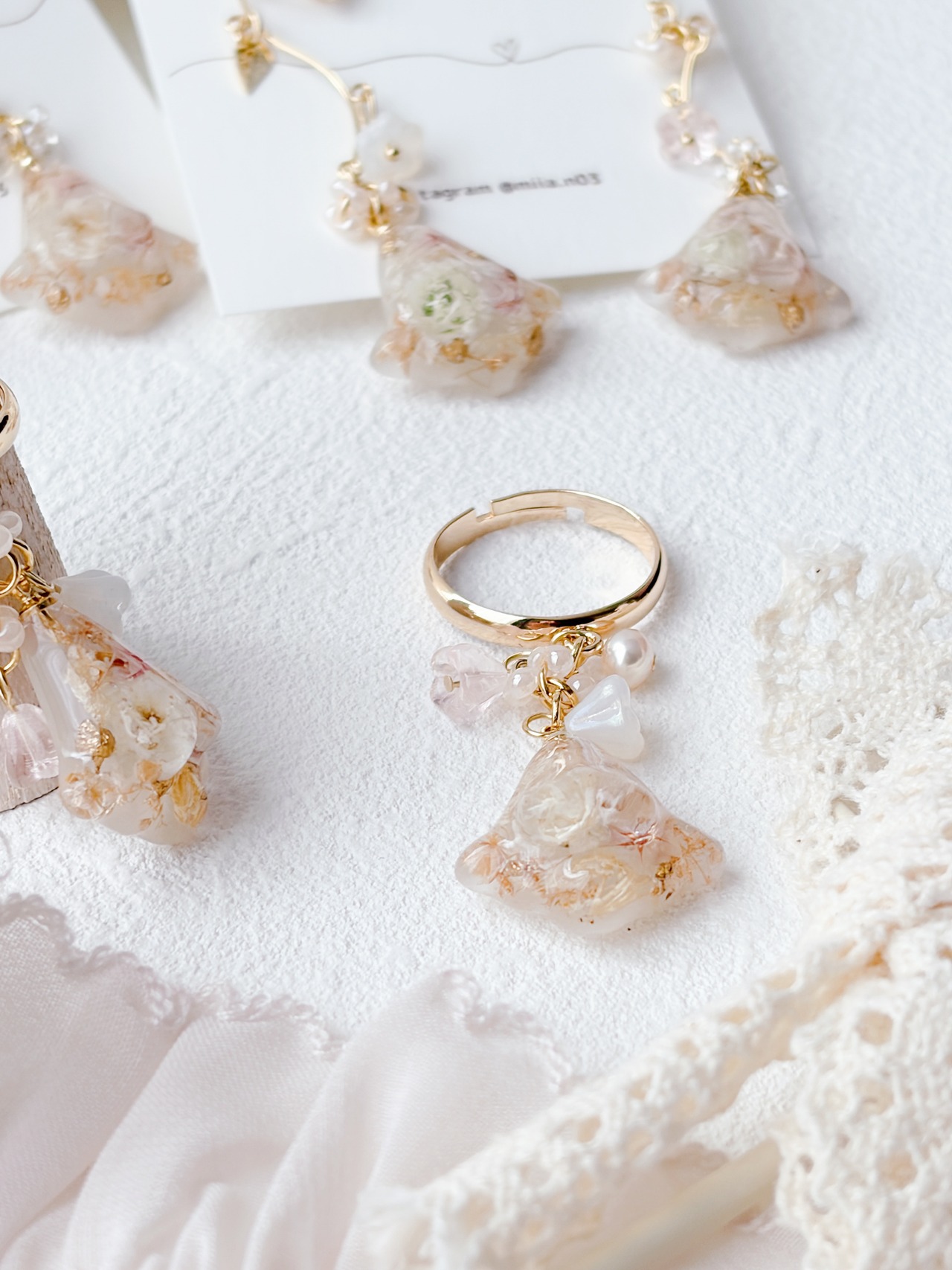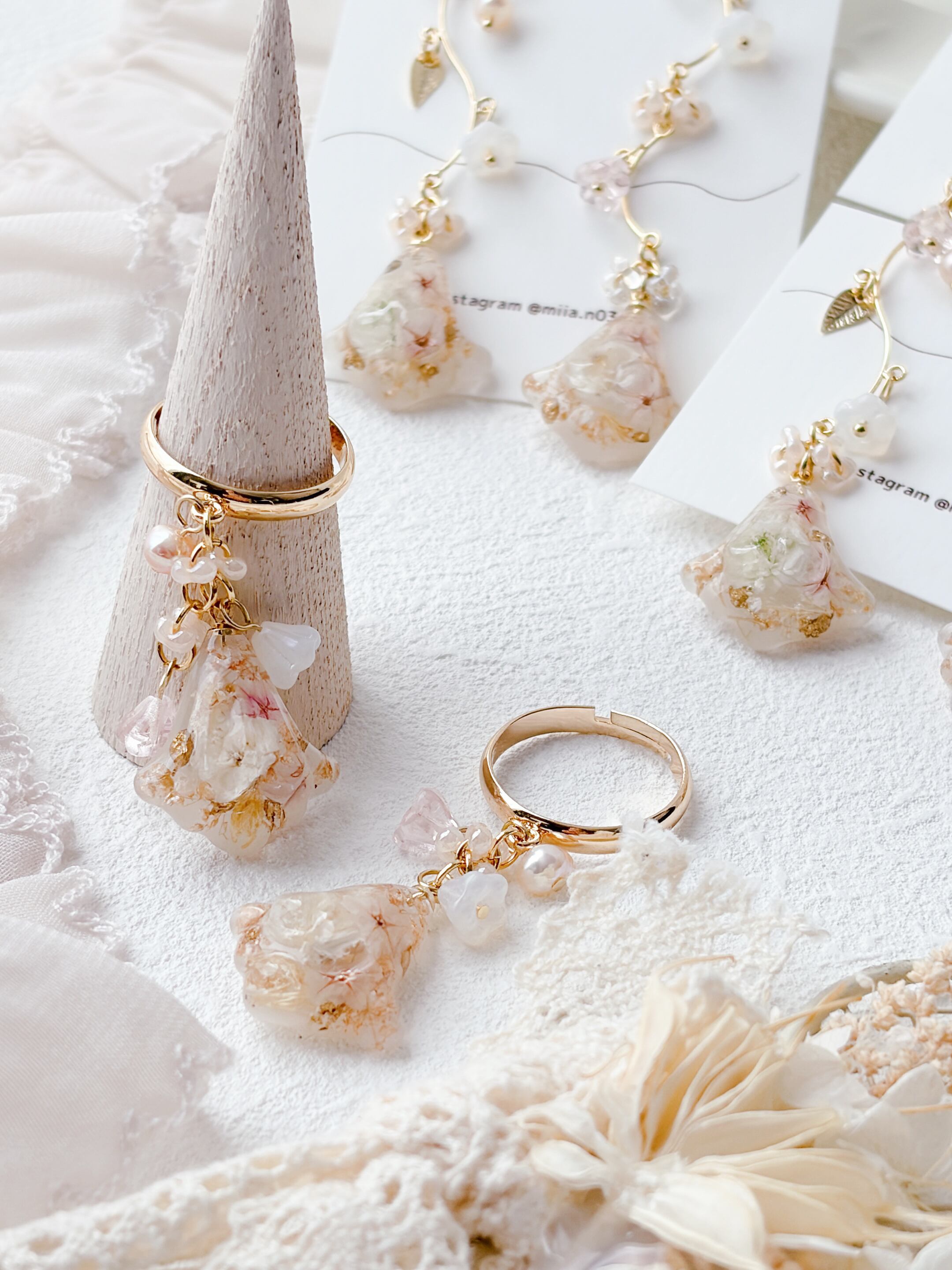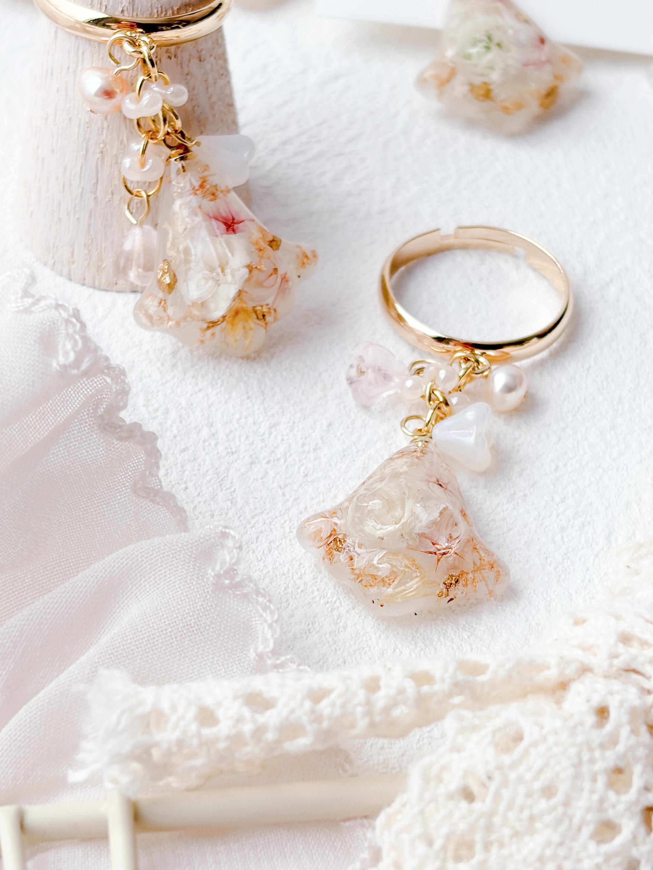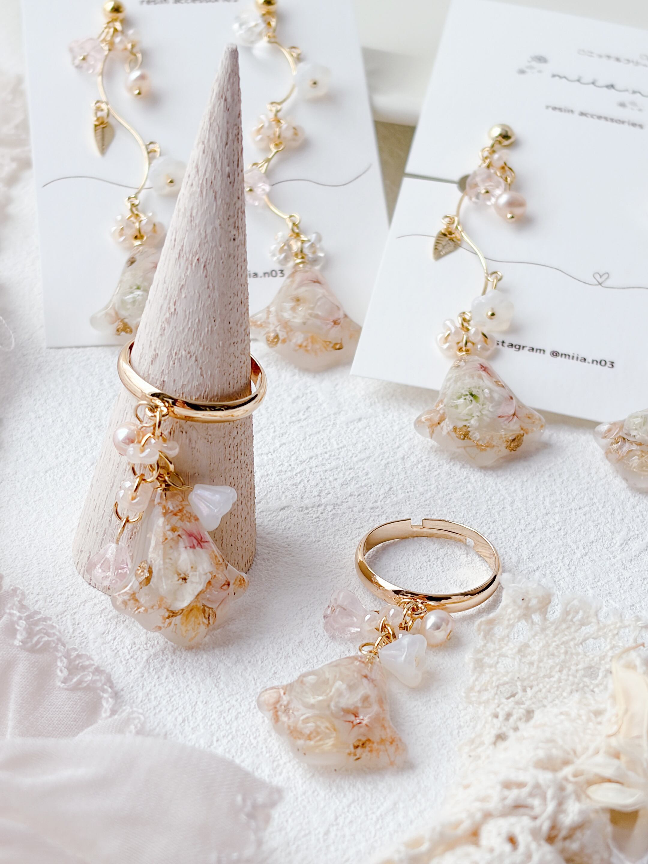 ニュアンスカラーのお花ビーズもたくさんあしらって優しく揺れるすずらんモチーフのリングで、淡いお花とゴールドの組み合わせで上品で女性らしい印象に仕上げています。