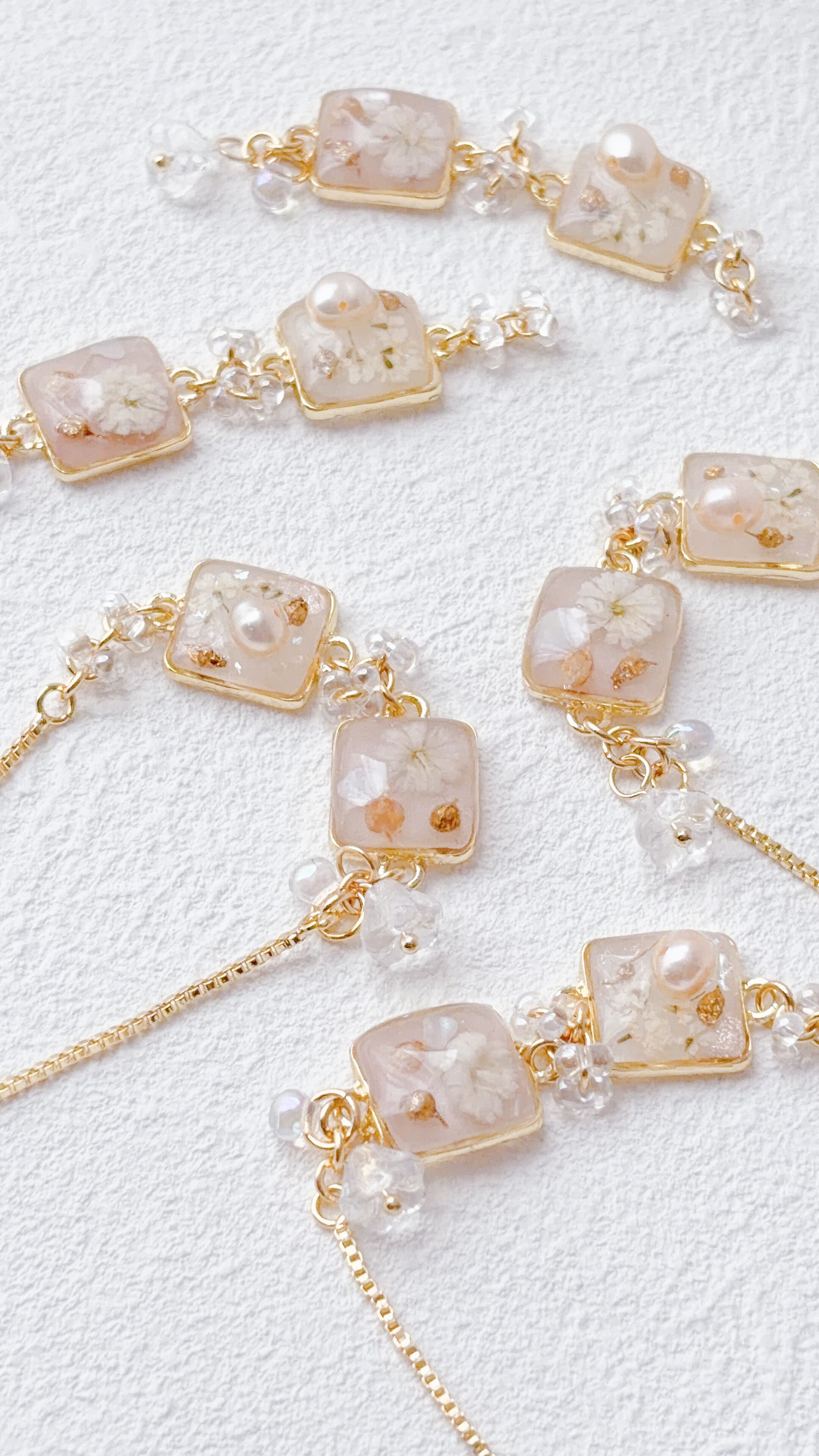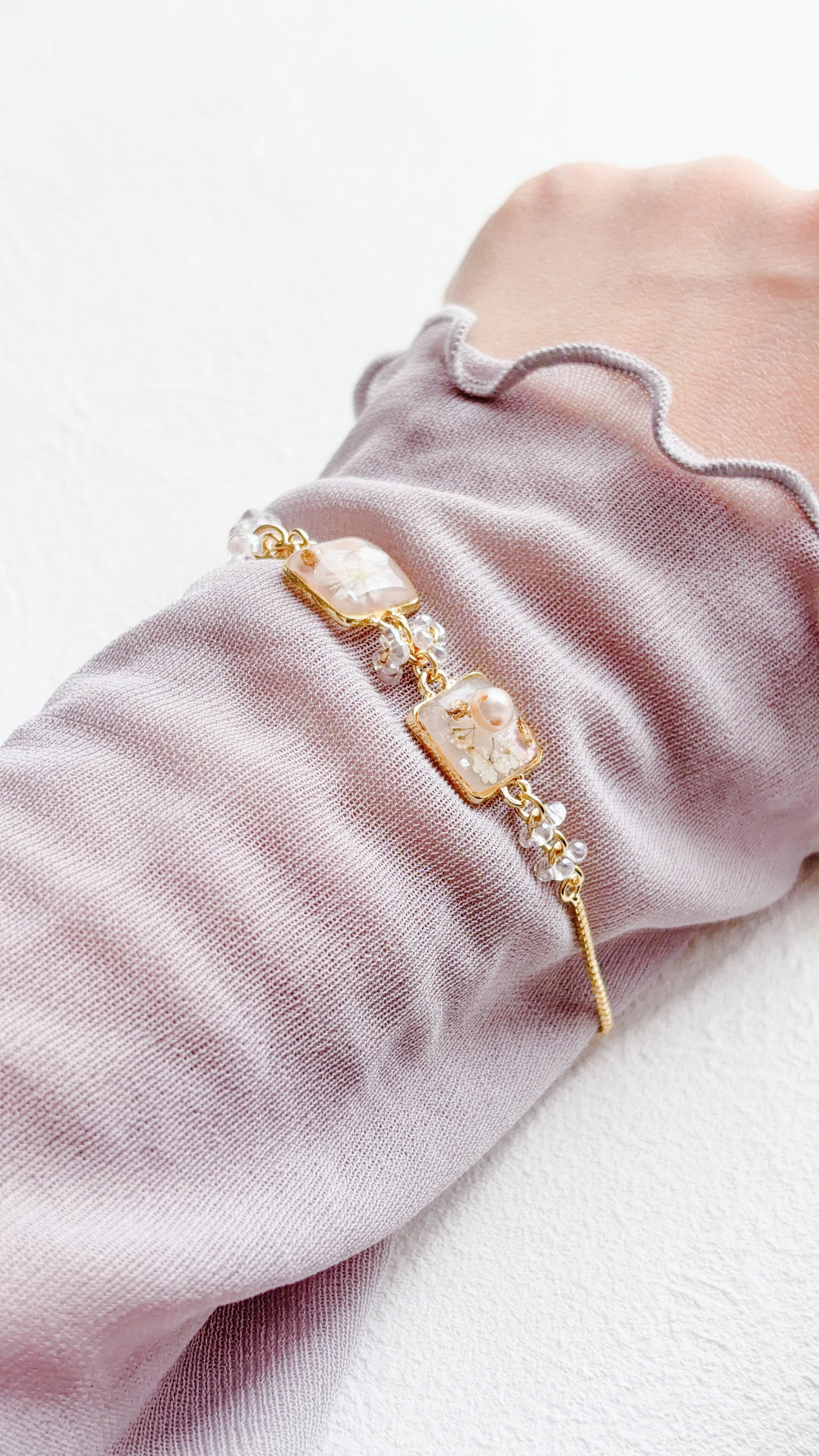 ニュアンスアートとお花を掛け合わせた淡い雰囲気のブレスレットになっています。
